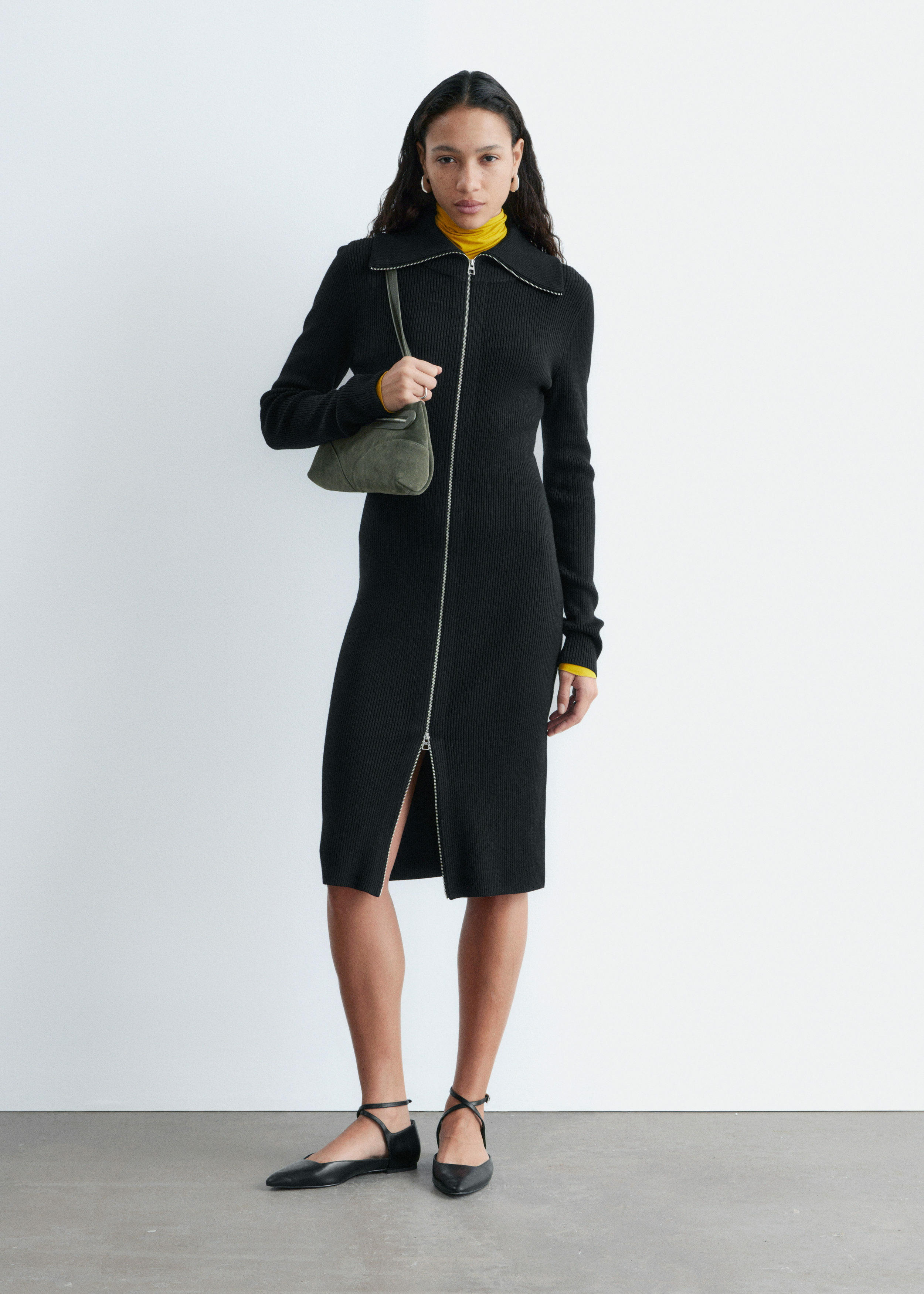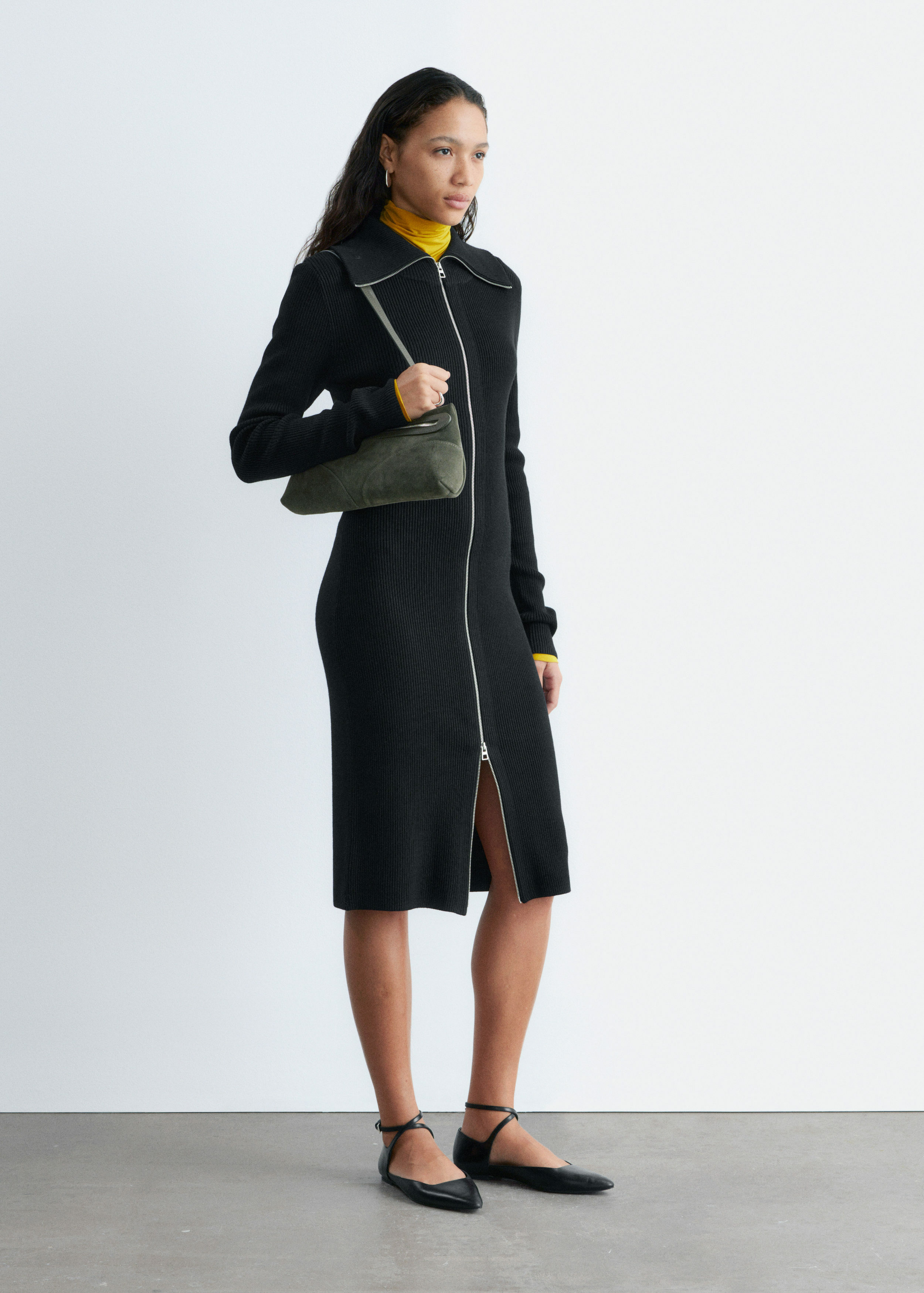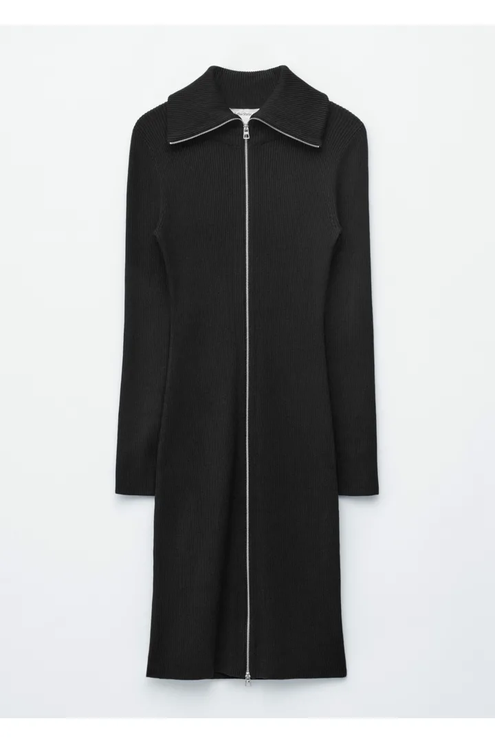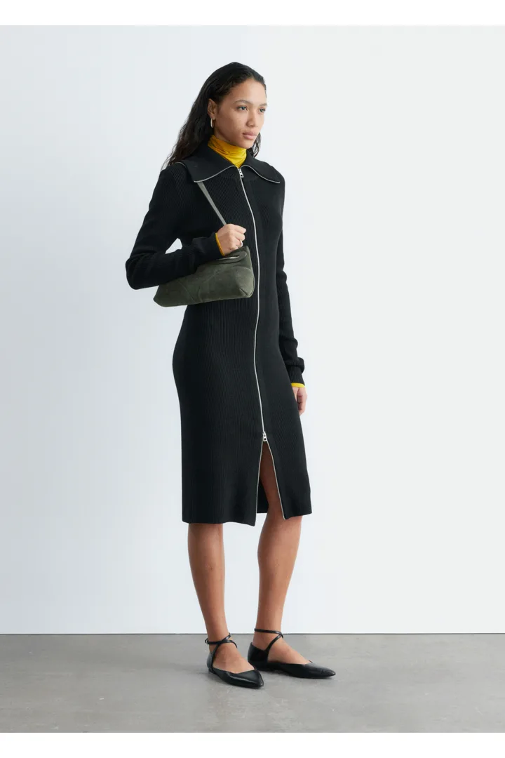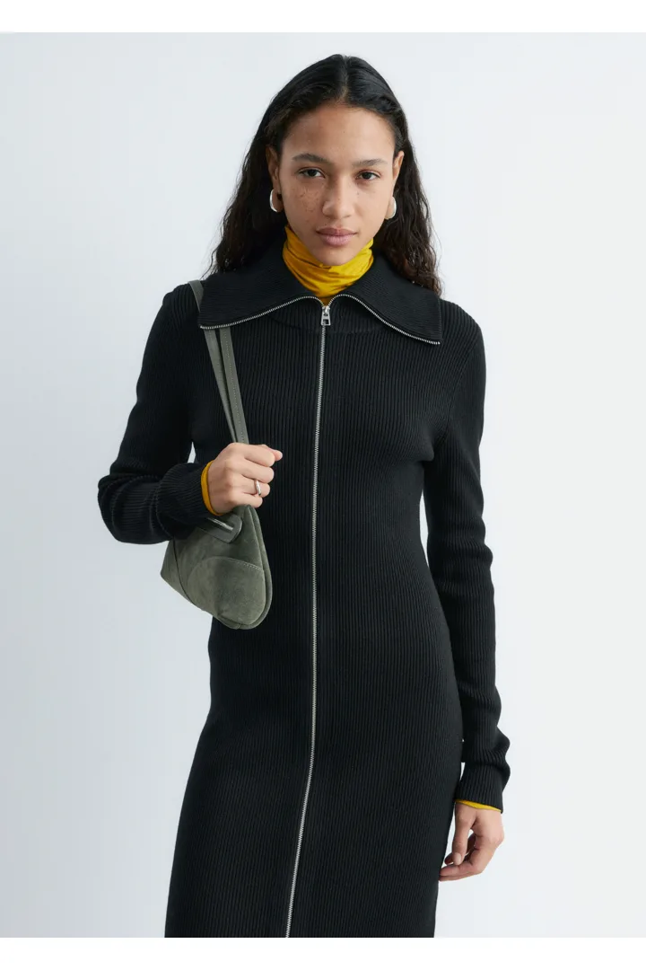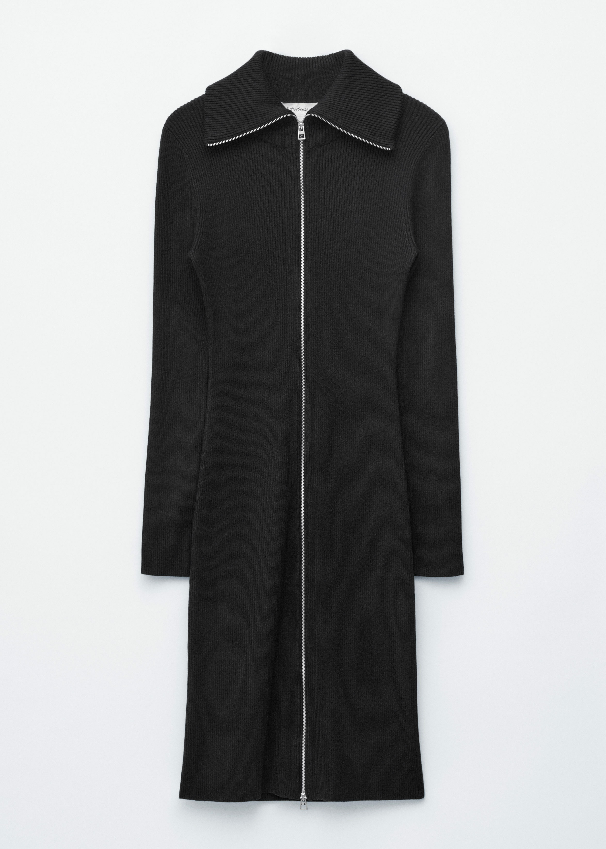 립 소재로 탄생한 롱 슬리브 미디 드레스예요. 슬림 핏 실루엣이 특징인 아이템이랍니다. 앞면의 투웨이 지퍼를 이용해 터틀넥 또는 카라로 접어 연출할 수 있답니다.