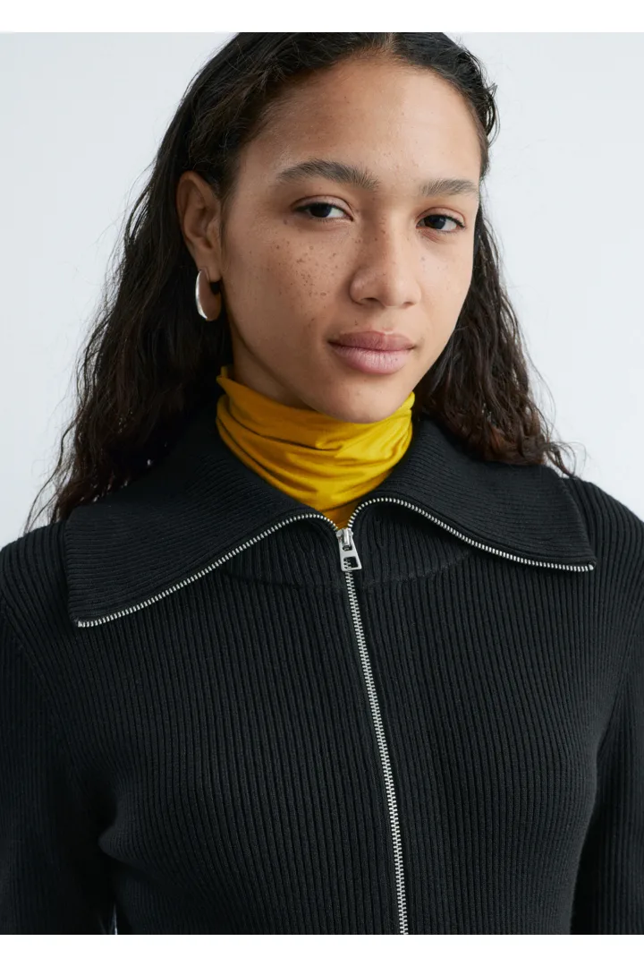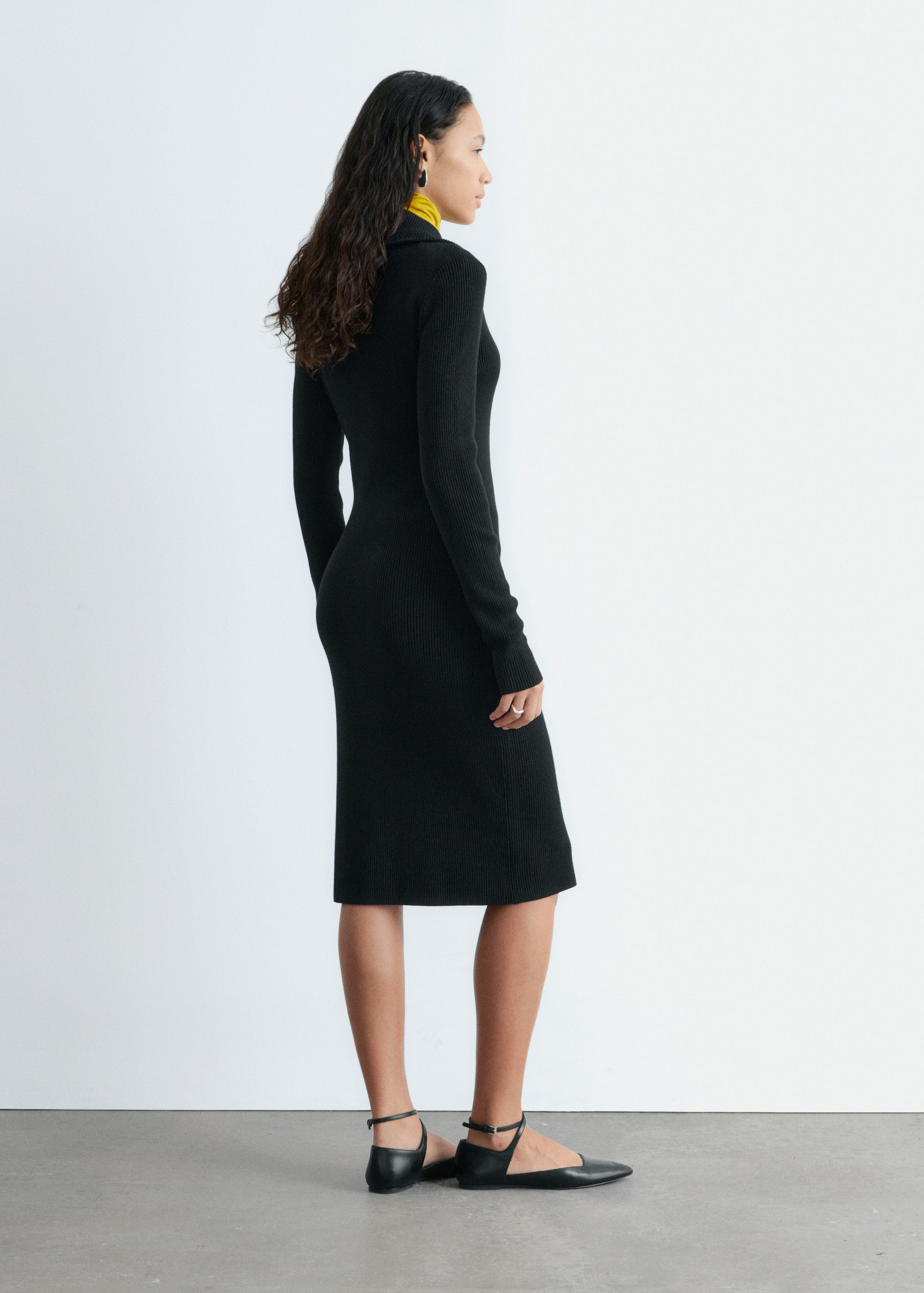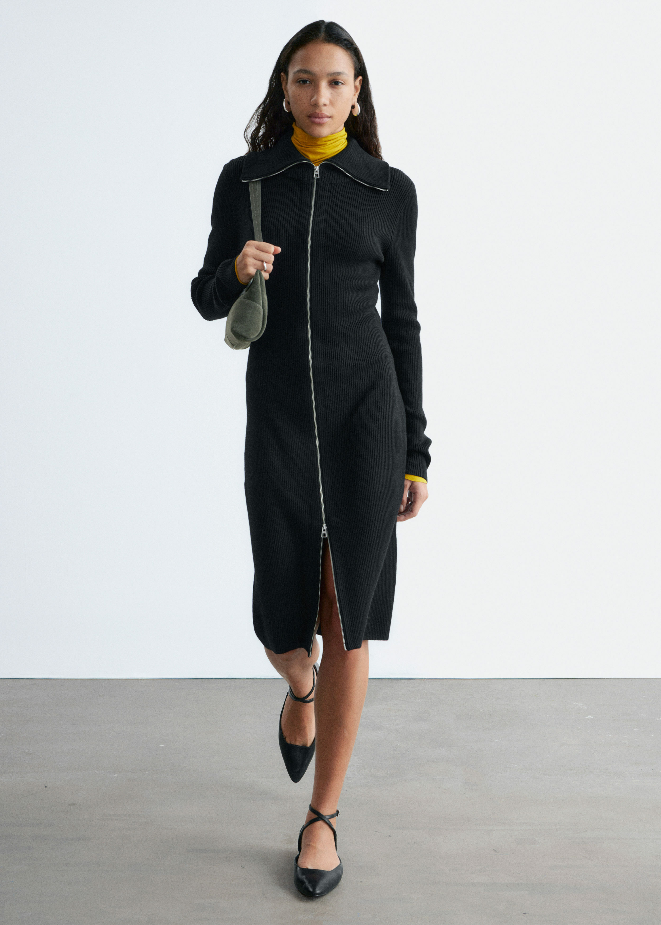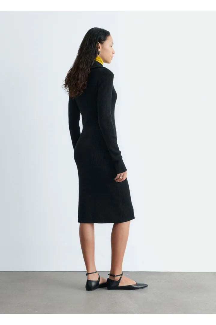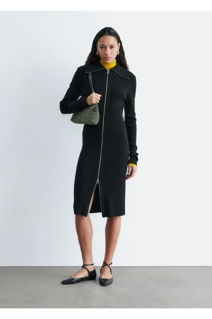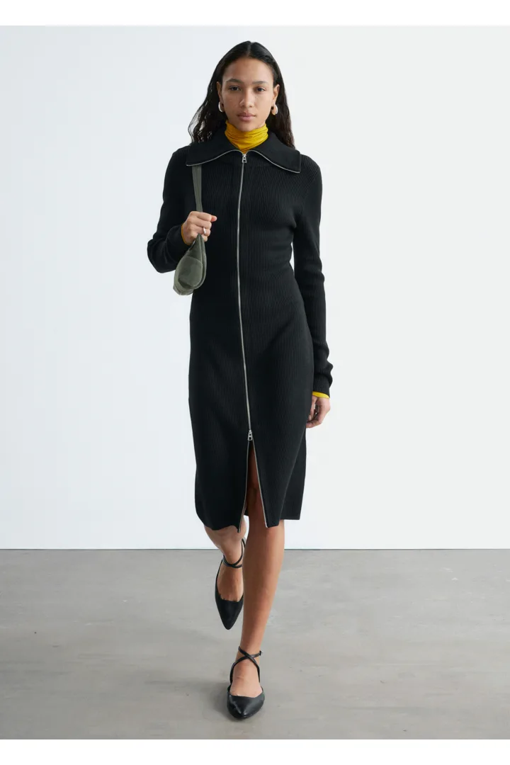 립 소재로 탄생한 롱 슬리브 미디 드레스예요. 슬림 핏 실루엣이 특징인 아이템이랍니다. 앞면의 투웨이 지퍼를 이용해 터틀넥 또는 카라로 접어 연출할 수 있답니다.