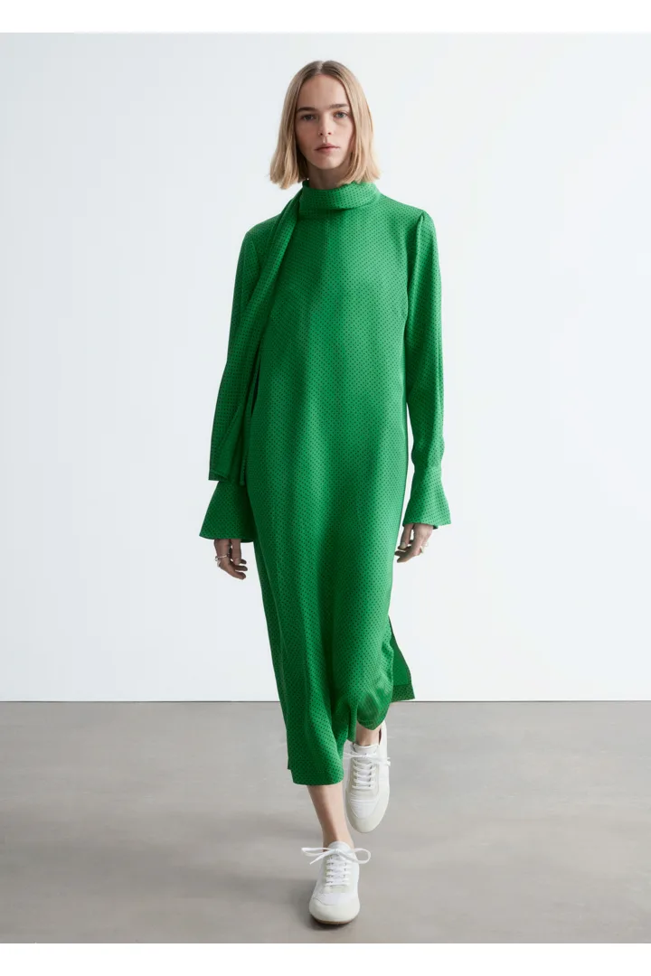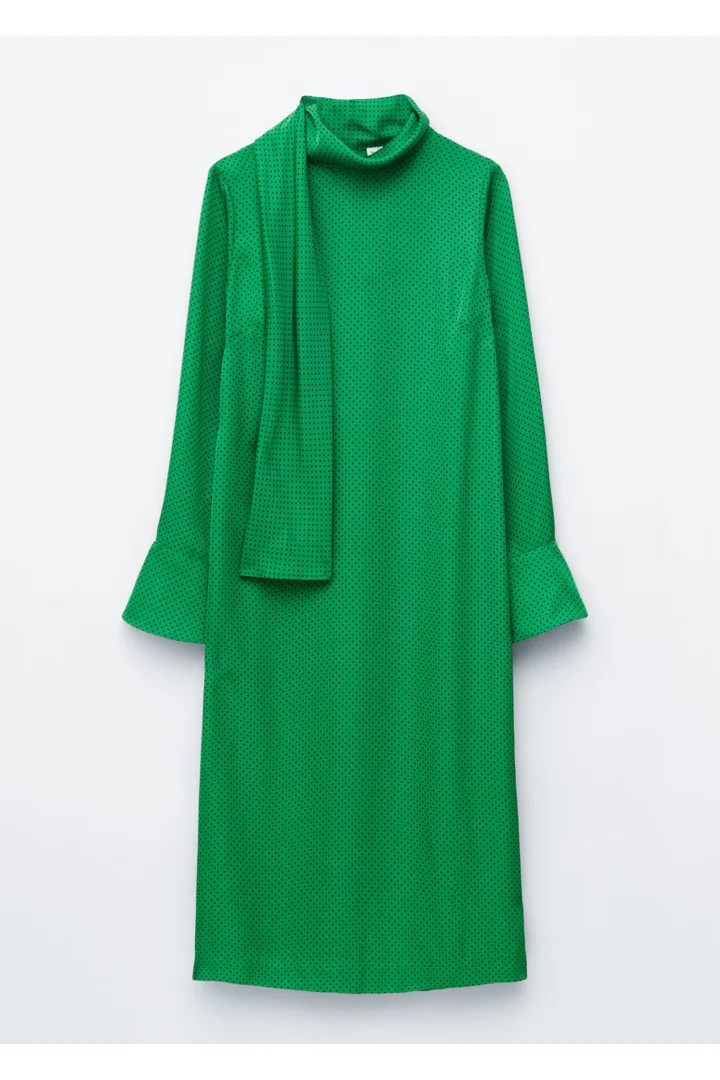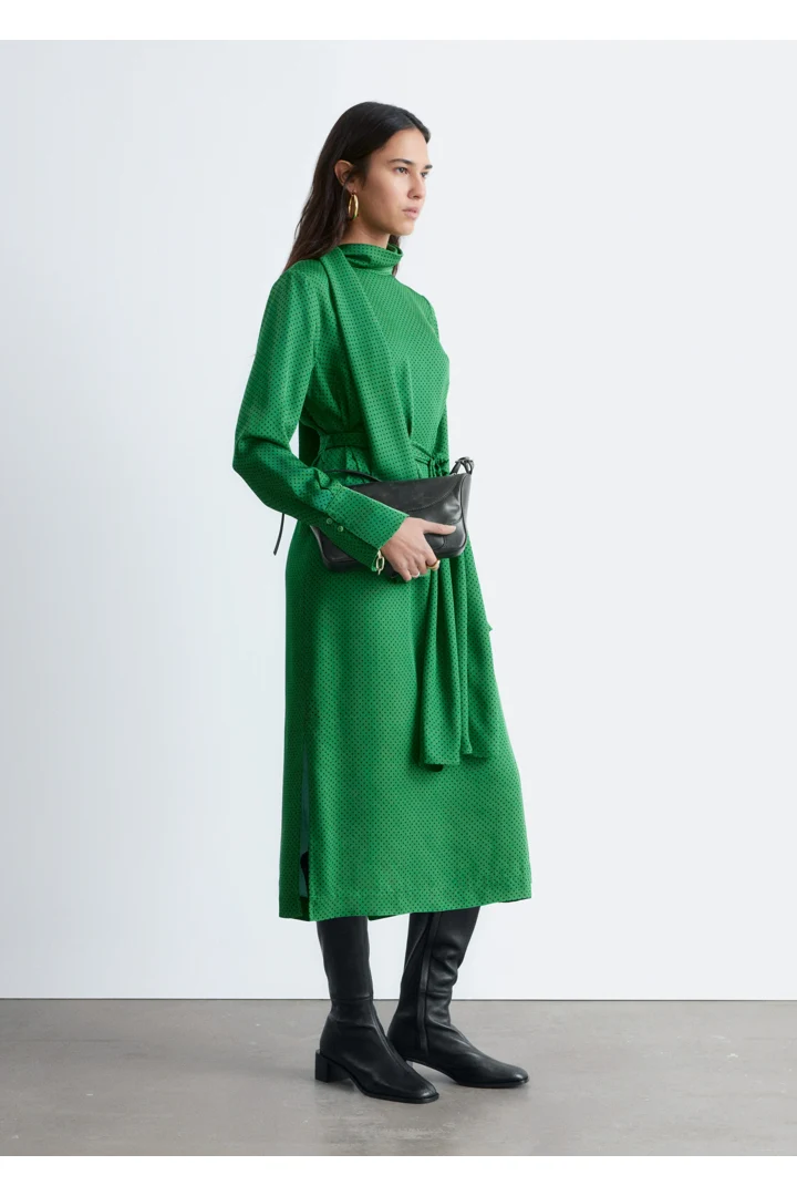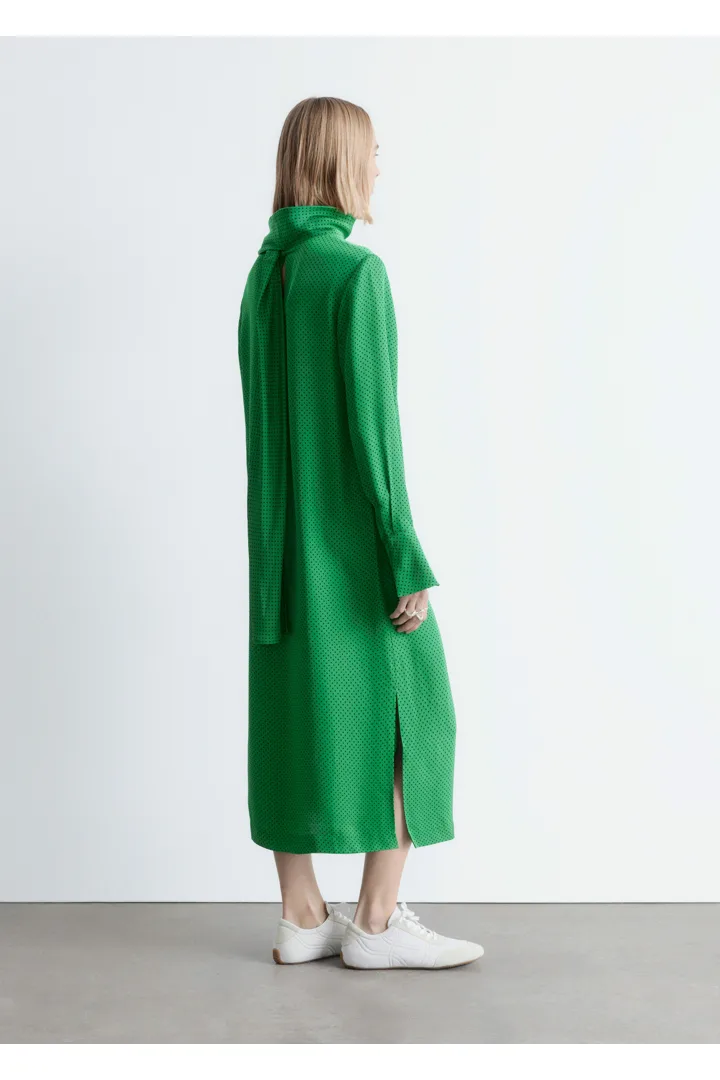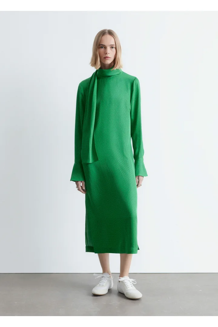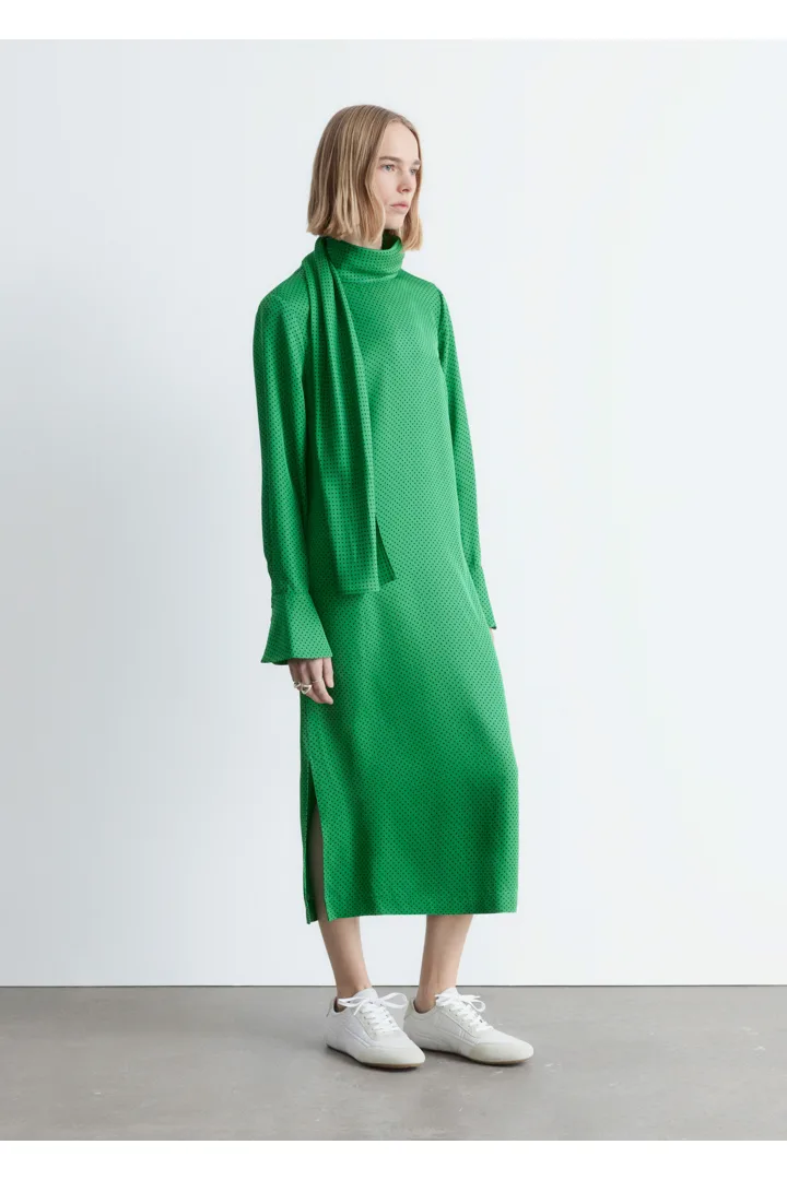 유려하게 흐르는 소재로 탄생한 미디 드레스예요. 종아리 중앙까지 오는 스트레이트 실루엣이 특징이랍니다. 드레이프 스카프 네크라인, 부드럽게 퍼지는 쉐입의 슬리브, 측면 헴라인의 은은한 슬릿, 버튼 커프스, 그리고 네크라인의 키홀 단추가 자리해 있어요.