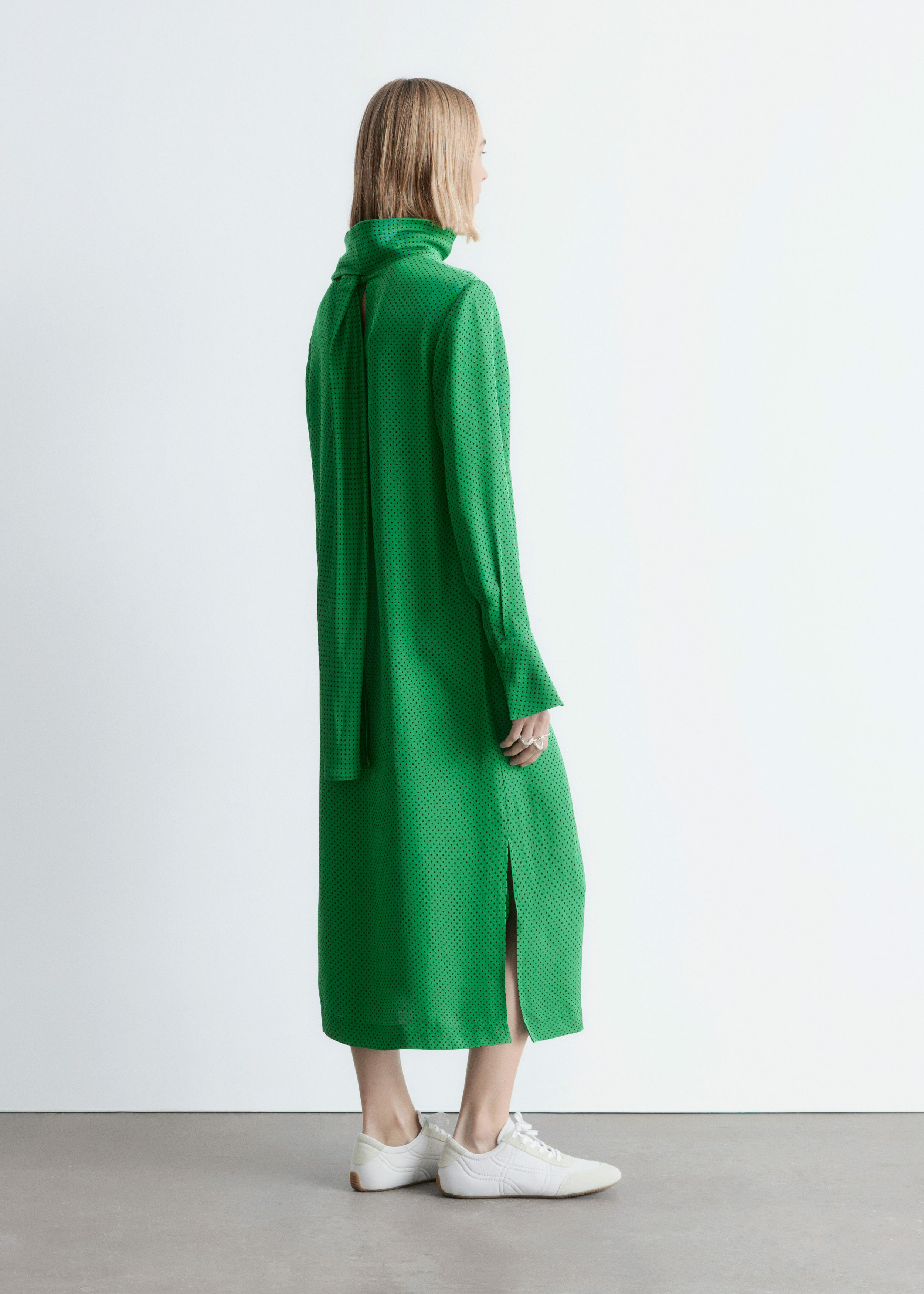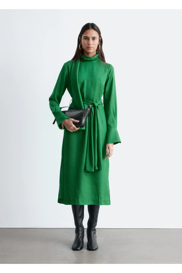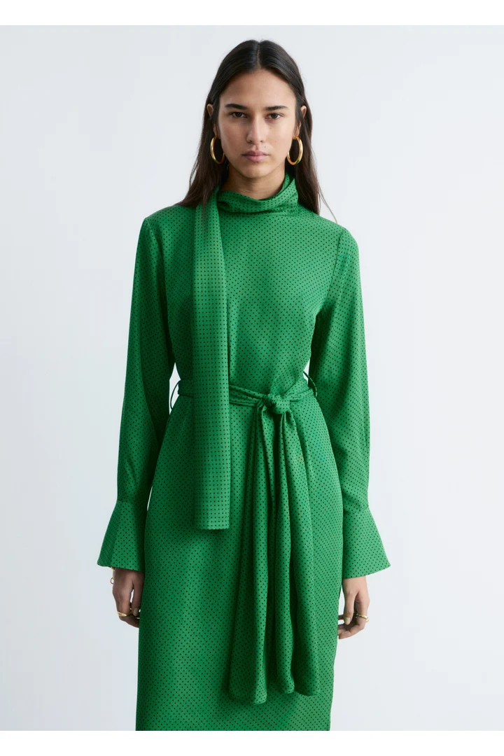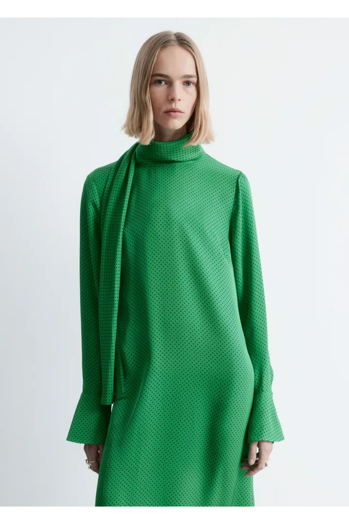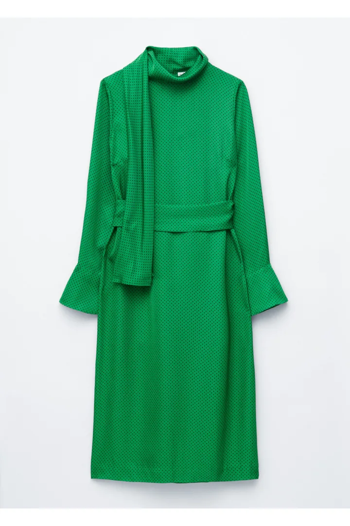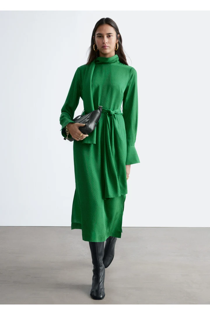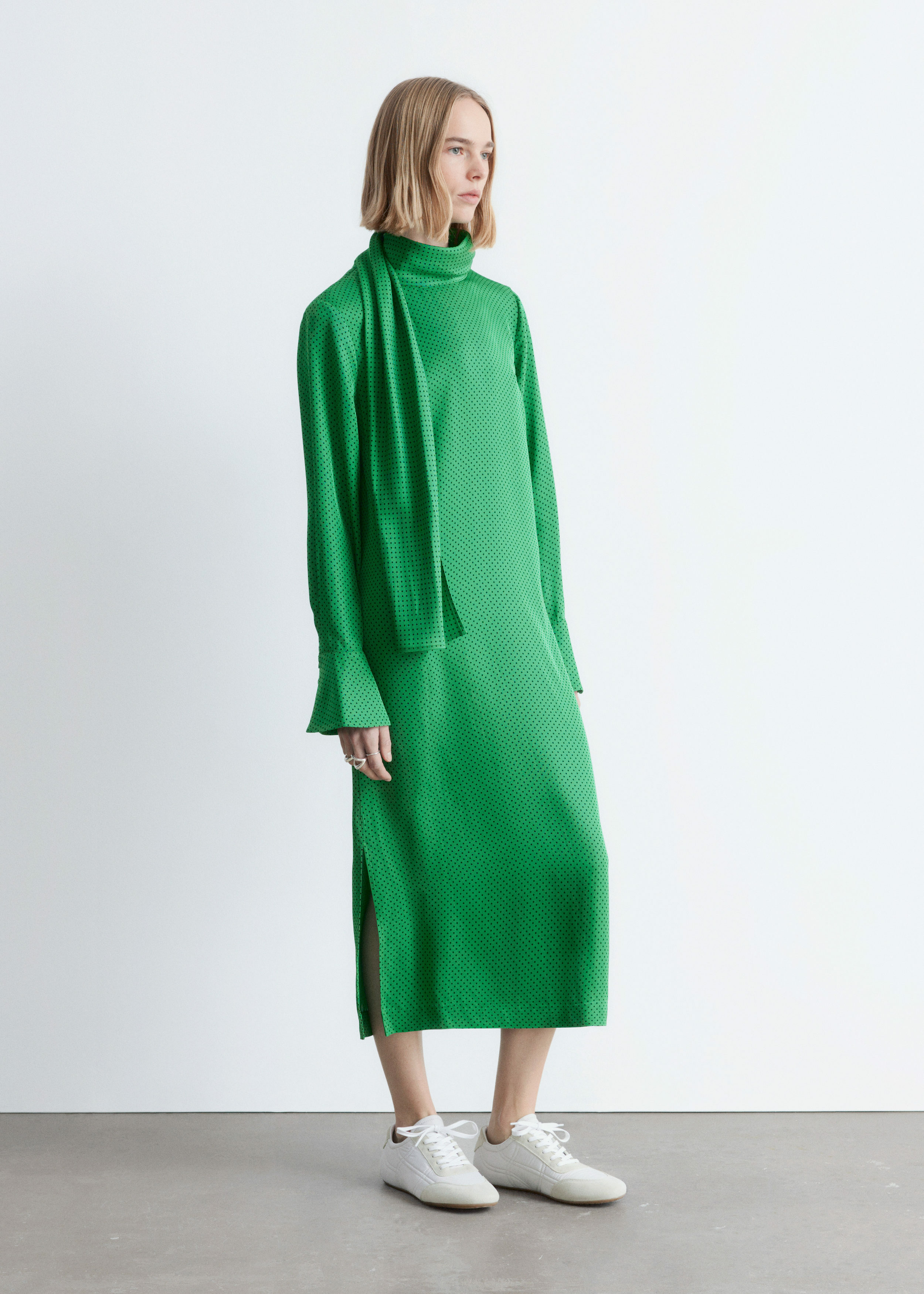 유려하게 흐르는 소재로 탄생한 미디 드레스예요. 종아리 중앙까지 오는 스트레이트 실루엣이 특징이랍니다. 드레이프 스카프 네크라인, 부드럽게 퍼지는 쉐입의 슬리브, 측면 헴라인의 은은한 슬릿, 버튼 커프스, 그리고 네크라인의 키홀 단추가 자리해 있어요.