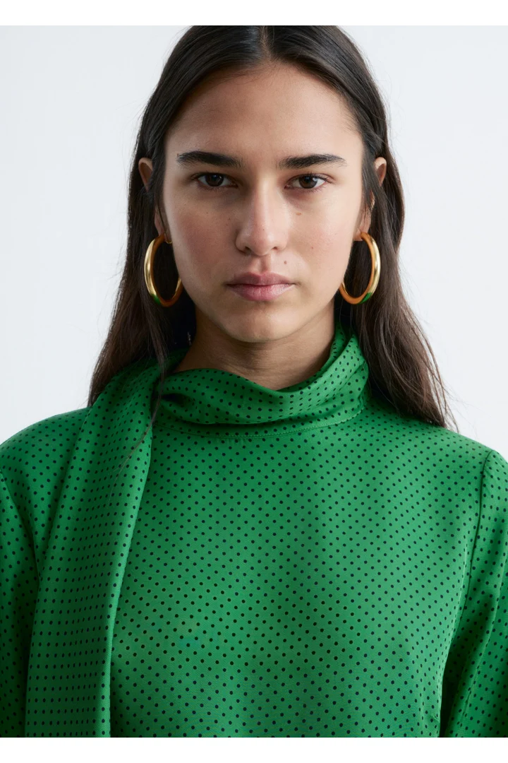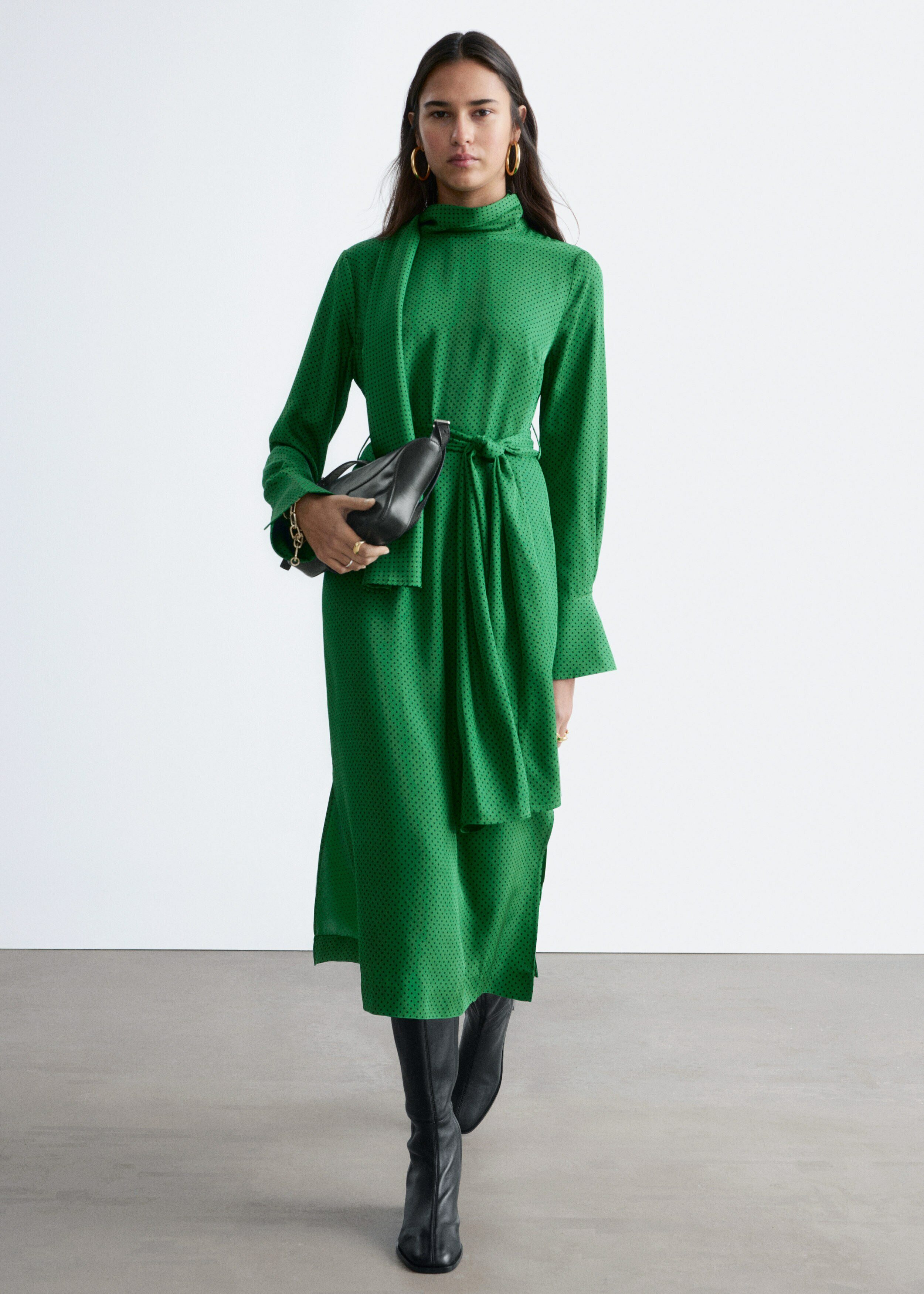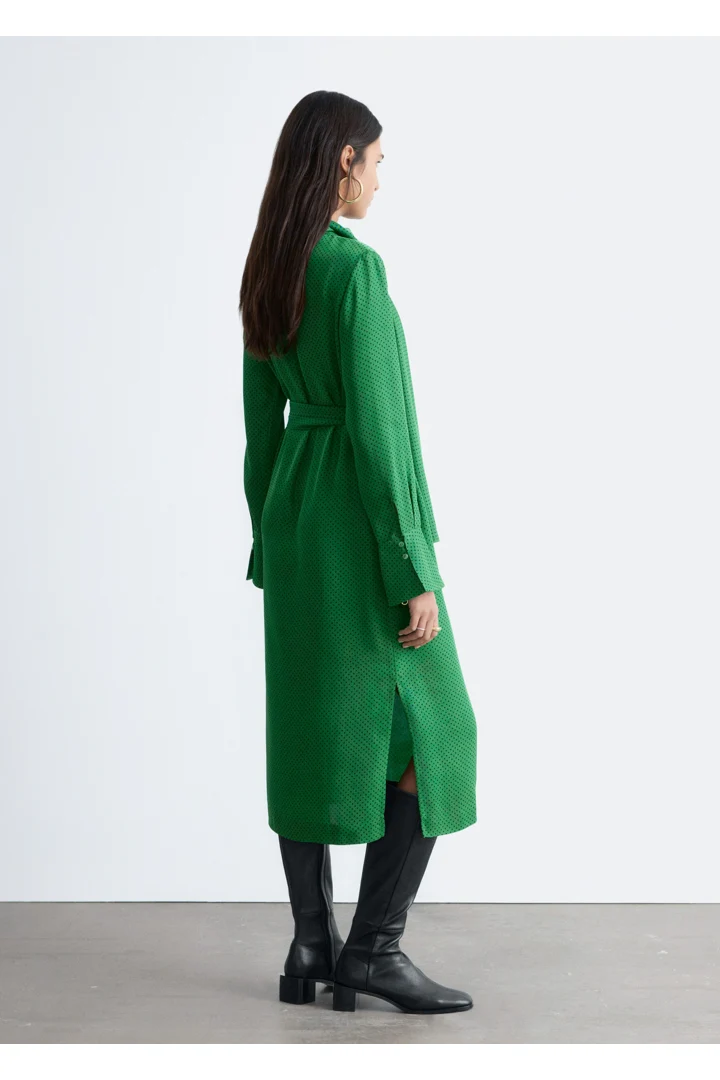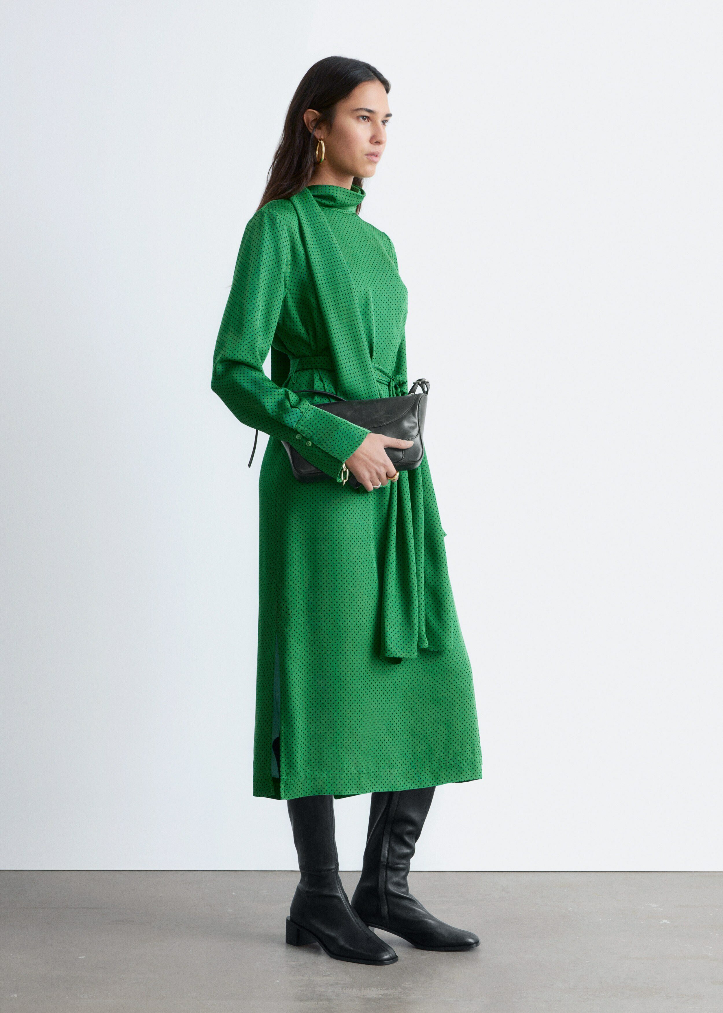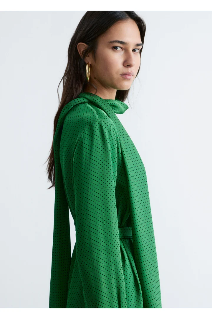 유려하게 흐르는 소재로 탄생한 미디 드레스예요. 종아리 중앙까지 오는 스트레이트 실루엣이 특징이랍니다. 드레이프 스카프 네크라인, 부드럽게 퍼지는 쉐입의 슬리브, 측면 헴라인의 은은한 슬릿, 버튼 커프스, 그리고 네크라인의 키홀 단추가 자리해 있어요.