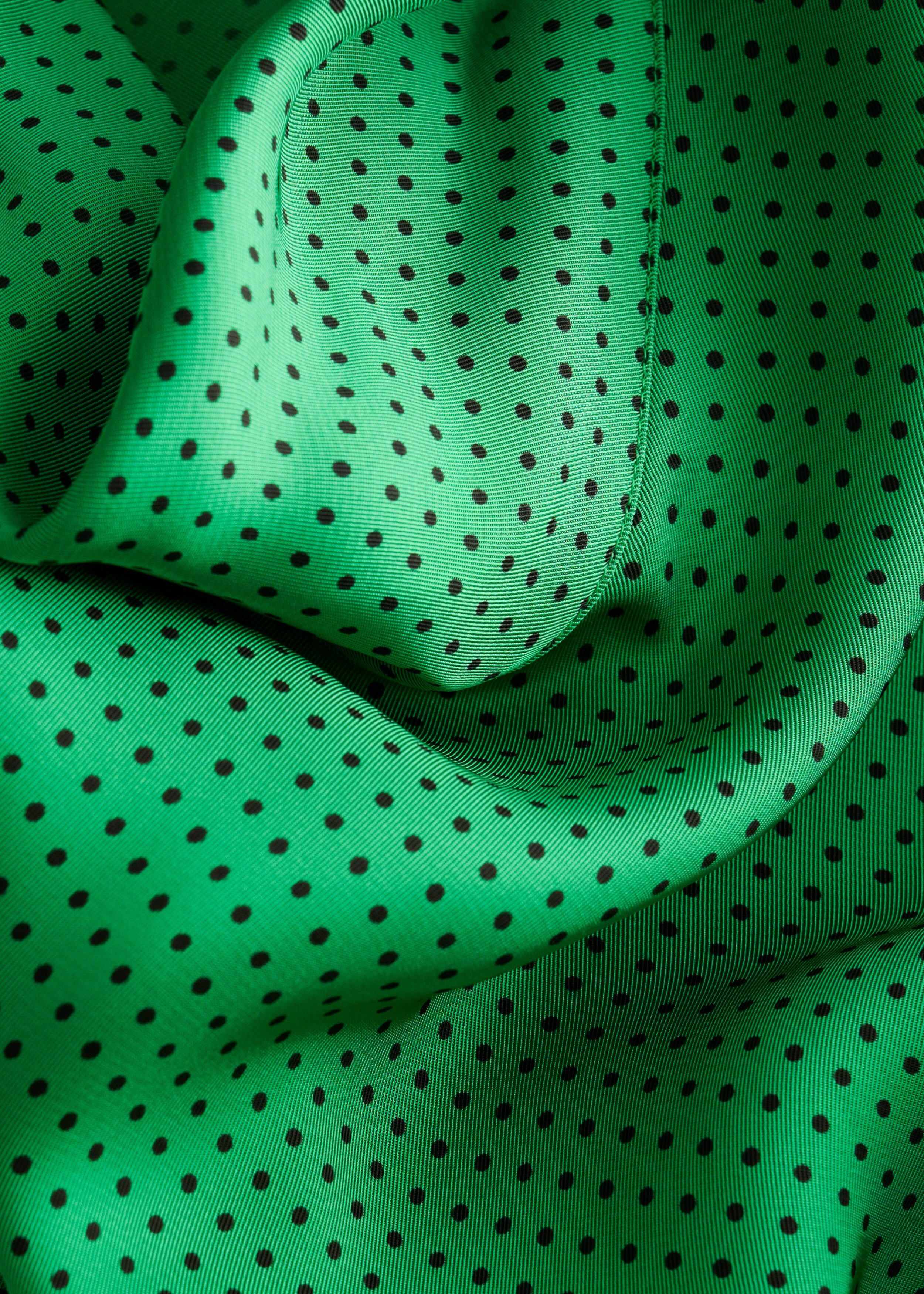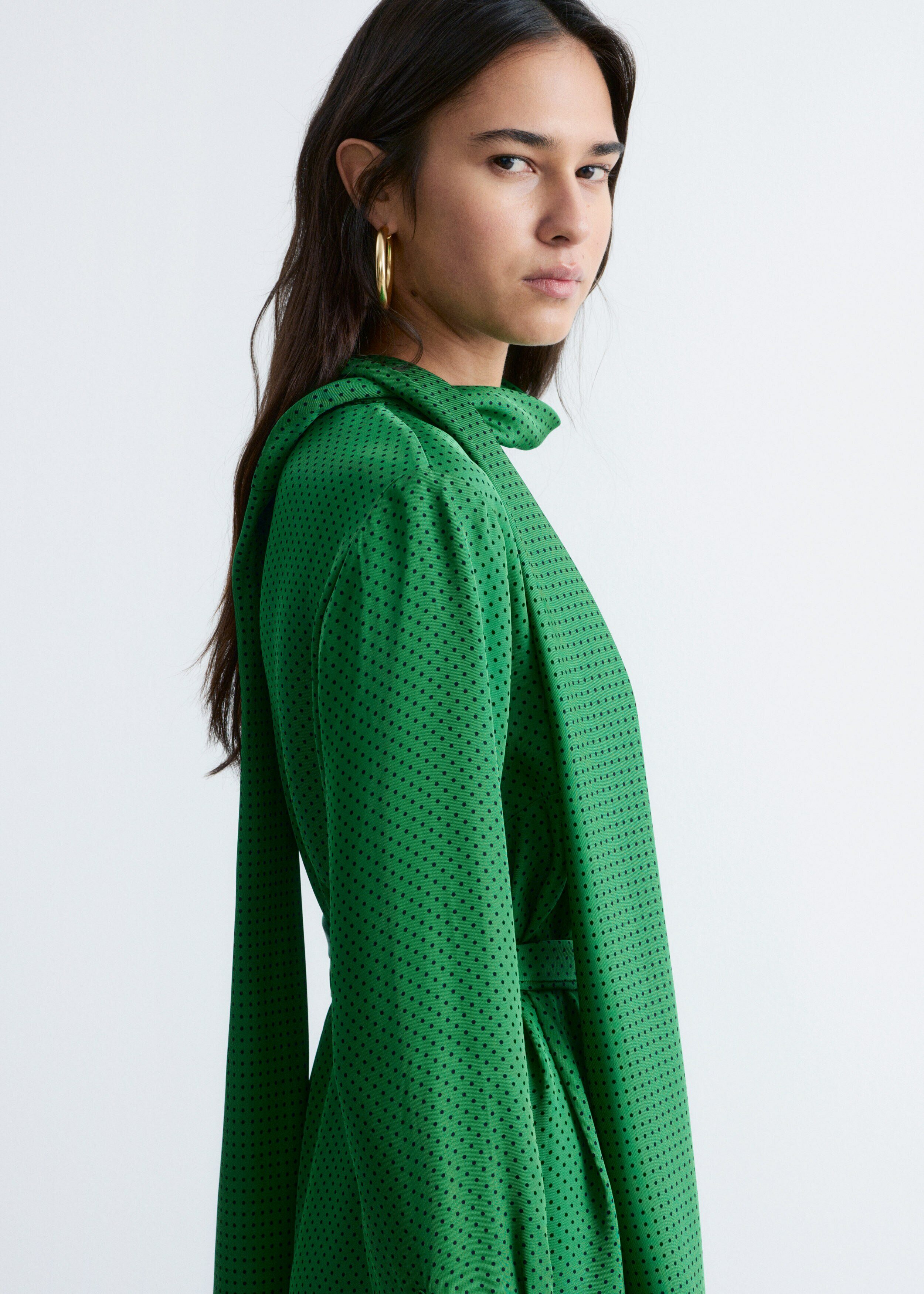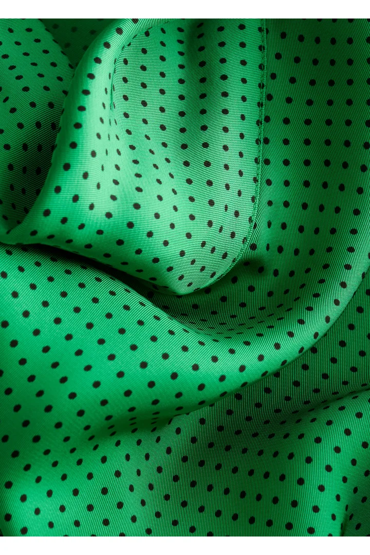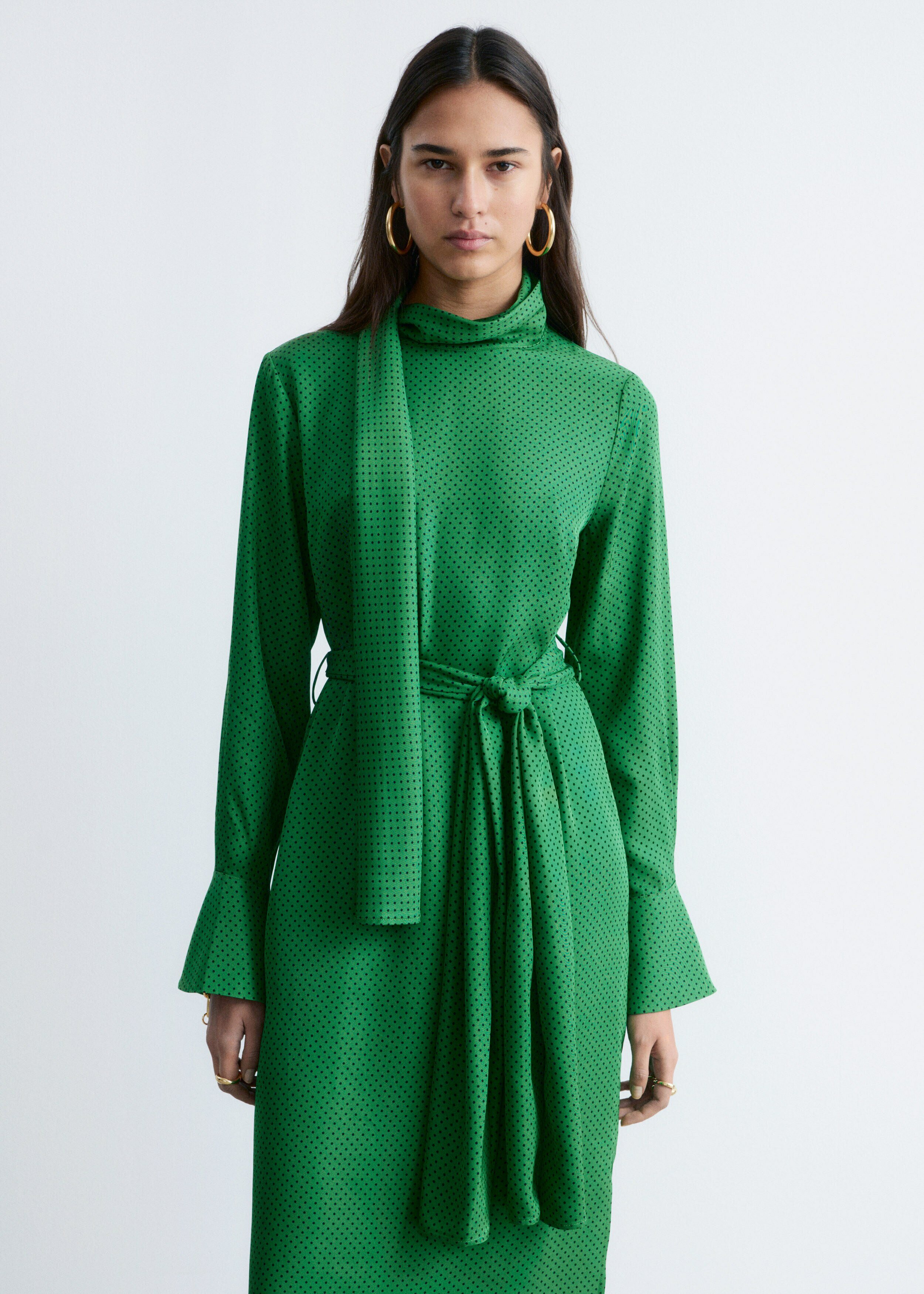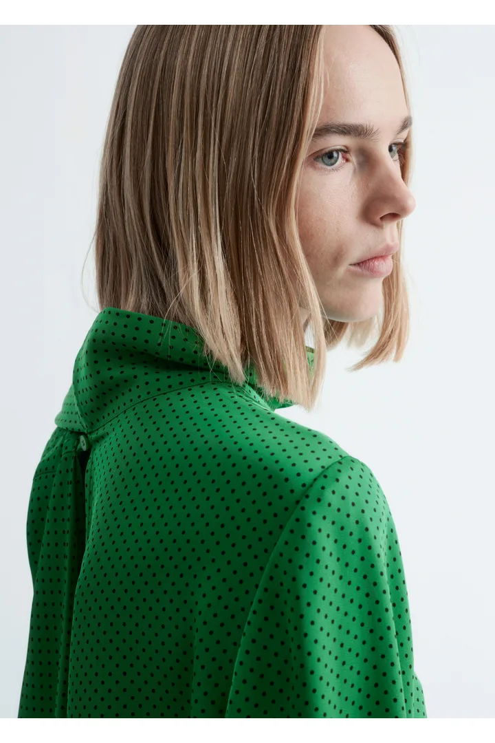 유려하게 흐르는 소재로 탄생한 미디 드레스예요. 종아리 중앙까지 오는 스트레이트 실루엣이 특징이랍니다. 드레이프 스카프 네크라인, 부드럽게 퍼지는 쉐입의 슬리브, 측면 헴라인의 은은한 슬릿, 버튼 커프스, 그리고 네크라인의 키홀 단추가 자리해 있어요.