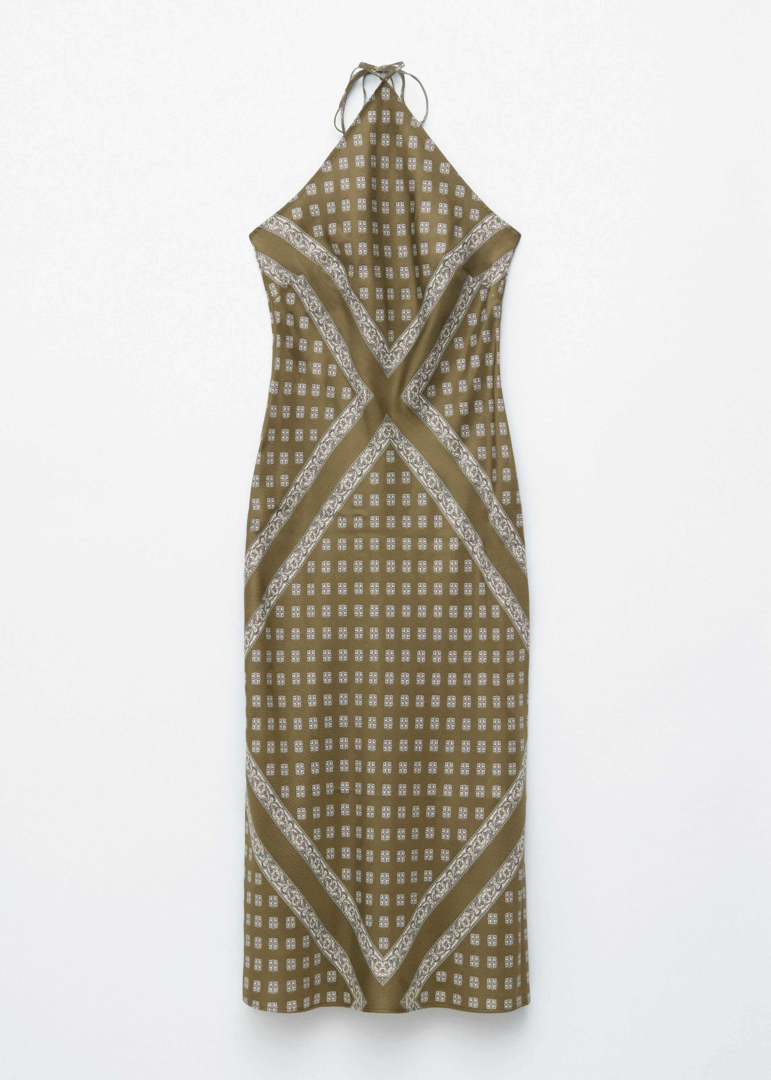 멀베리 실크 소재의 홀터넥 드레스예요. 무릎 바로 위까지 오는 핏 되는 실루엣, 오픈된 뒷면의 스트레이트 룩, 네크라인의 섬세한 타이 클로저, 그리고 정교한 장식 패턴이 특징이랍니다.