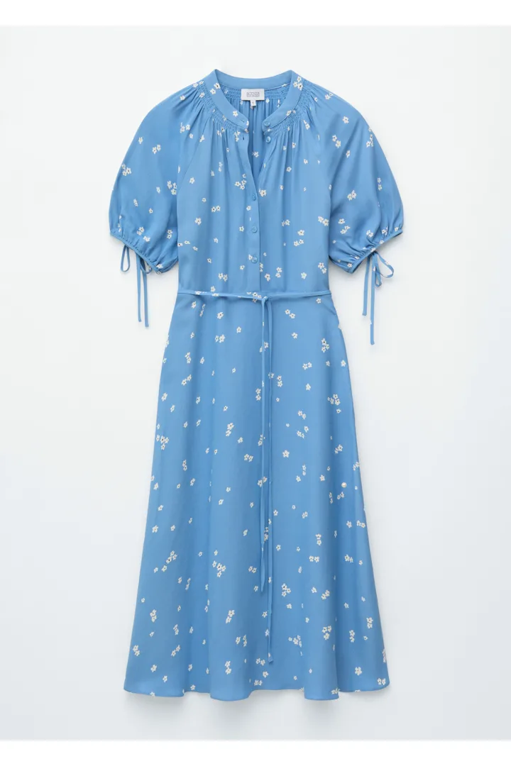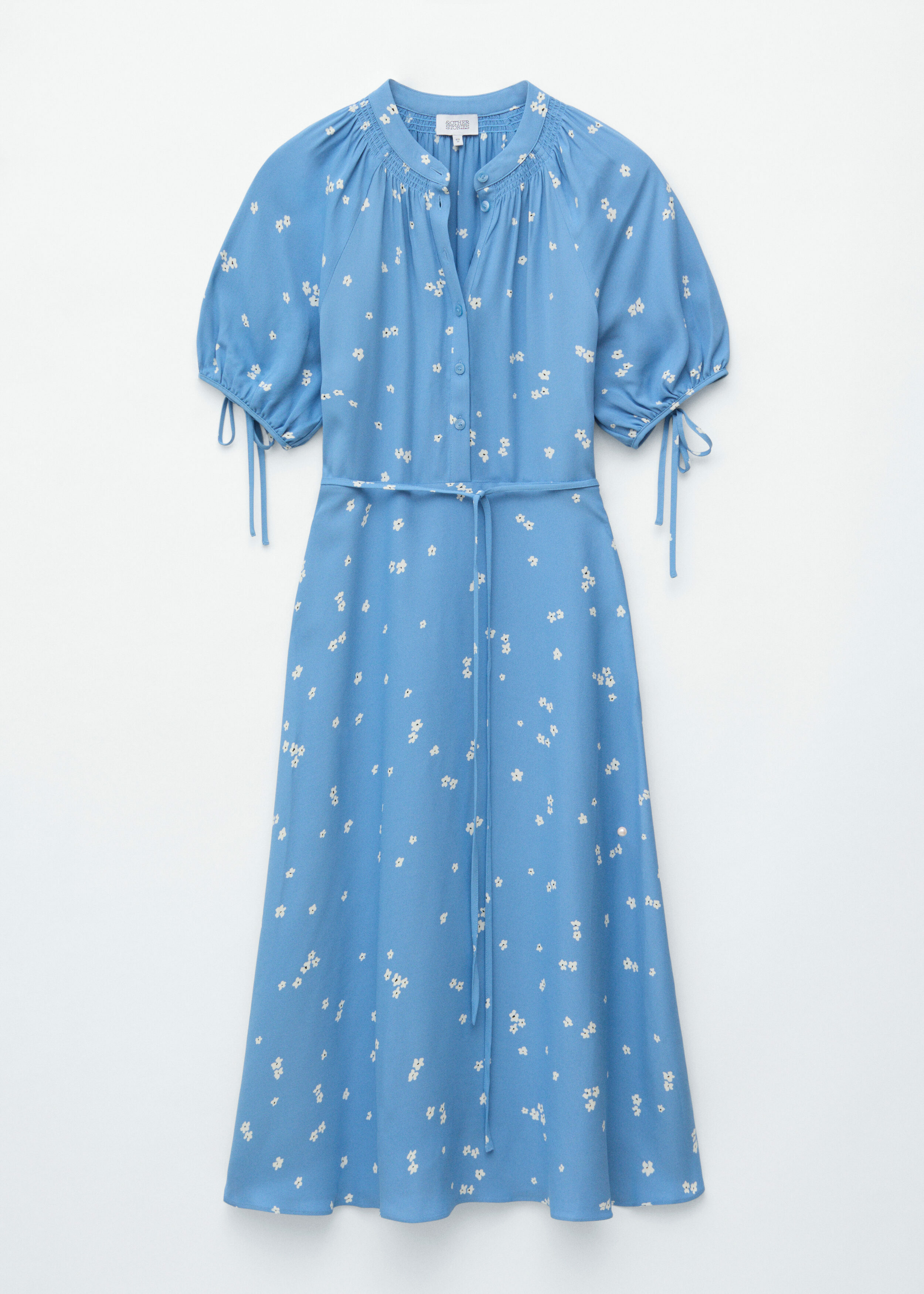 부드러운 새틴 소재로 탄생한 미디 드레스예요. 가볍고 유려한 실루엣, 섬세한 셔링이 잡힌 라운드 퍼프 슬리브, 커프스의 섬세한 끈 디테일이 특징이랍니다. 허리의 슬림한 타이 여밈으로 은은한 쉐입을 연출하며, 하프 버튼 플래킷으로 깔끔하고 절제된 무드가 느껴져요. 미디 기장으로 탄생하여 여름철에 편안하게 연출하기 좋답니다.