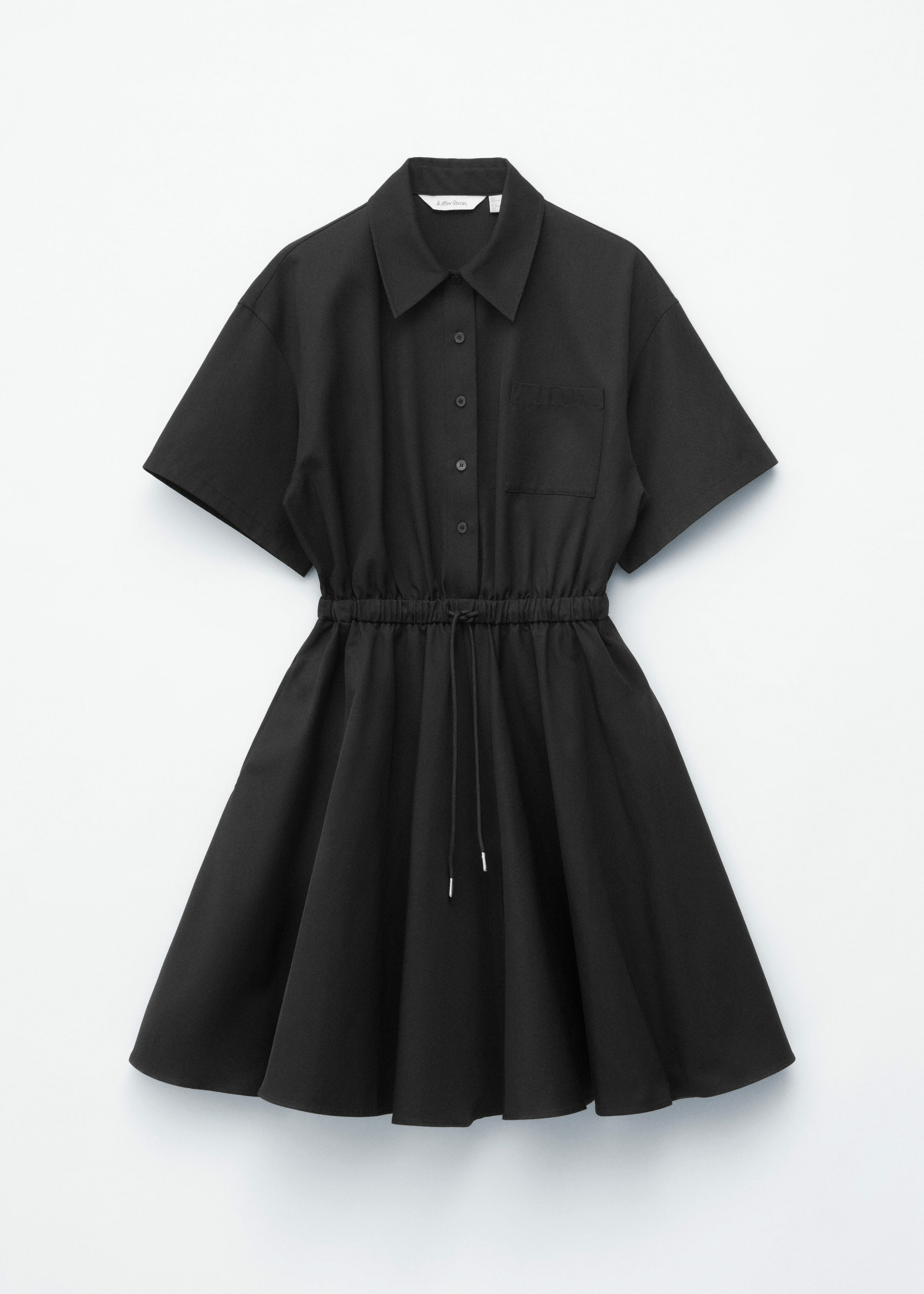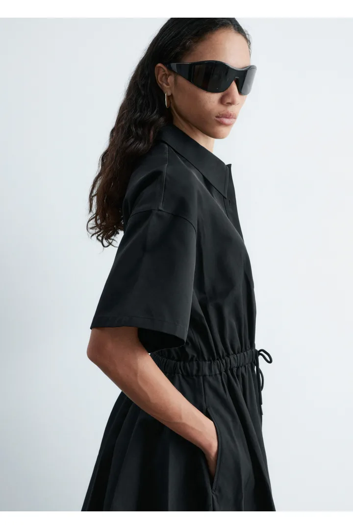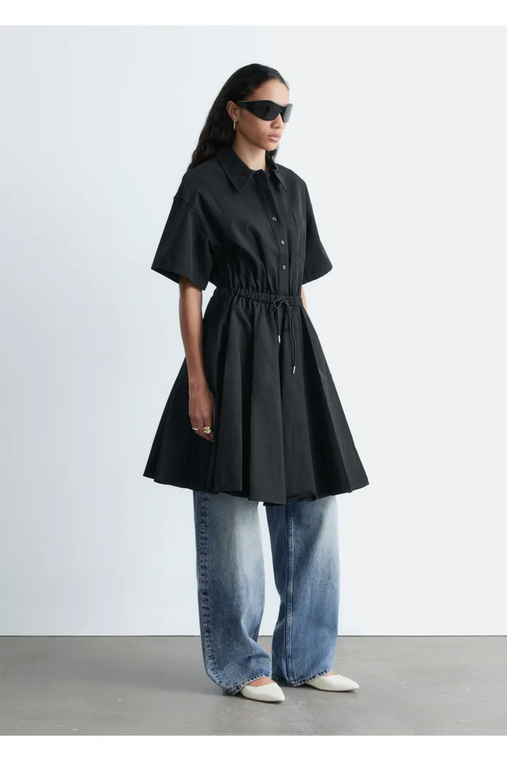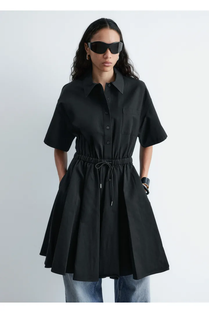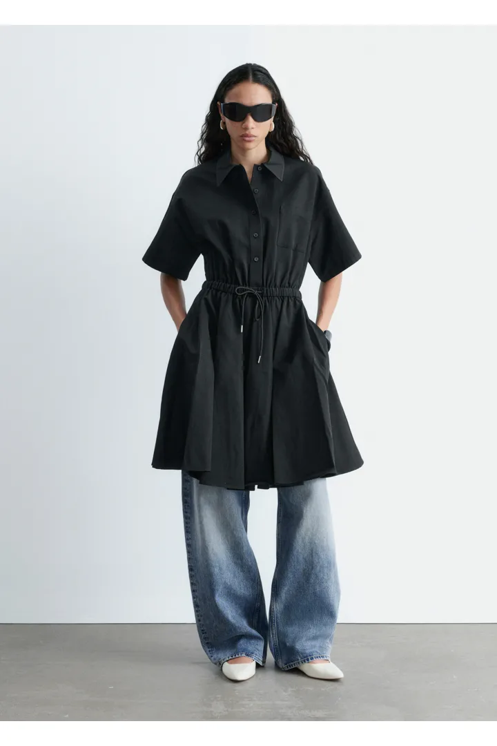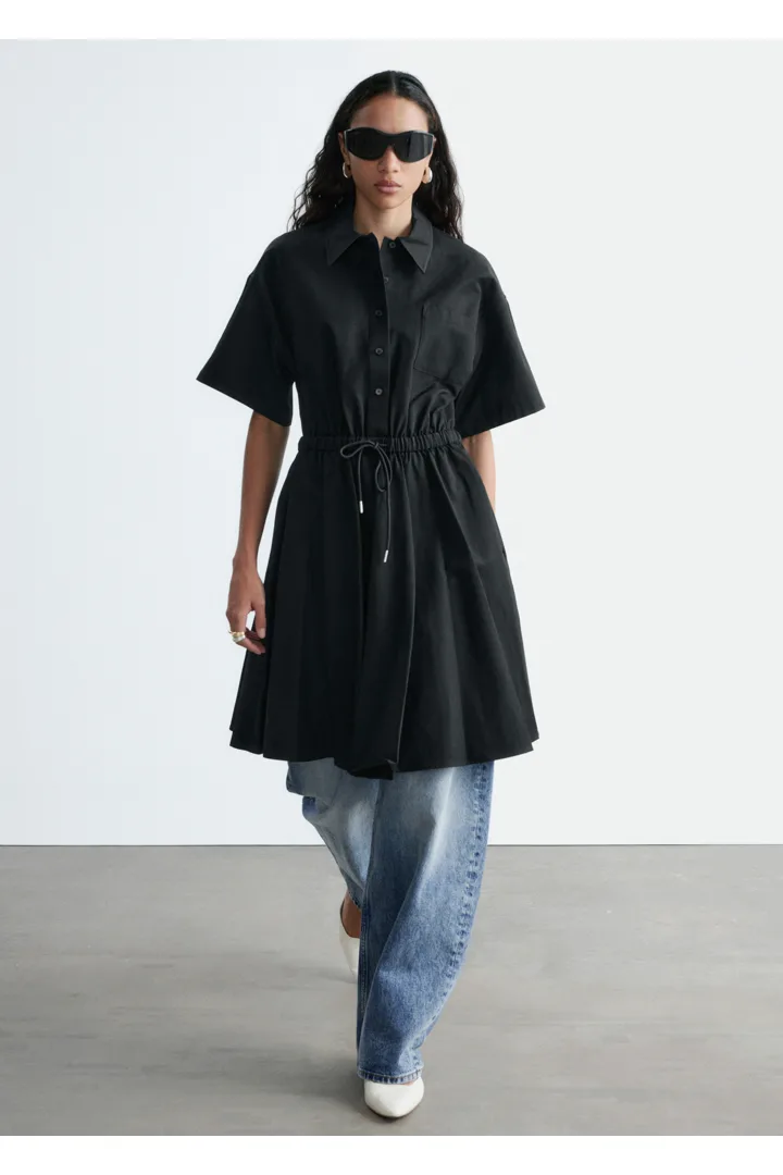 프레피 룩과 모던함이 조화를 이루는 셔츠 드레스예요. 산뜻한 코튼 트윌 소재로 탄생했으며 쇼트 슬리브와 클래식 카라, 가슴 포켓, 토널 단추가 자리해 있어요. 플레어 셔츠가 볼륨감을 더하며, 허리의 드로코드로 포인트를 줄 수 있답니다.