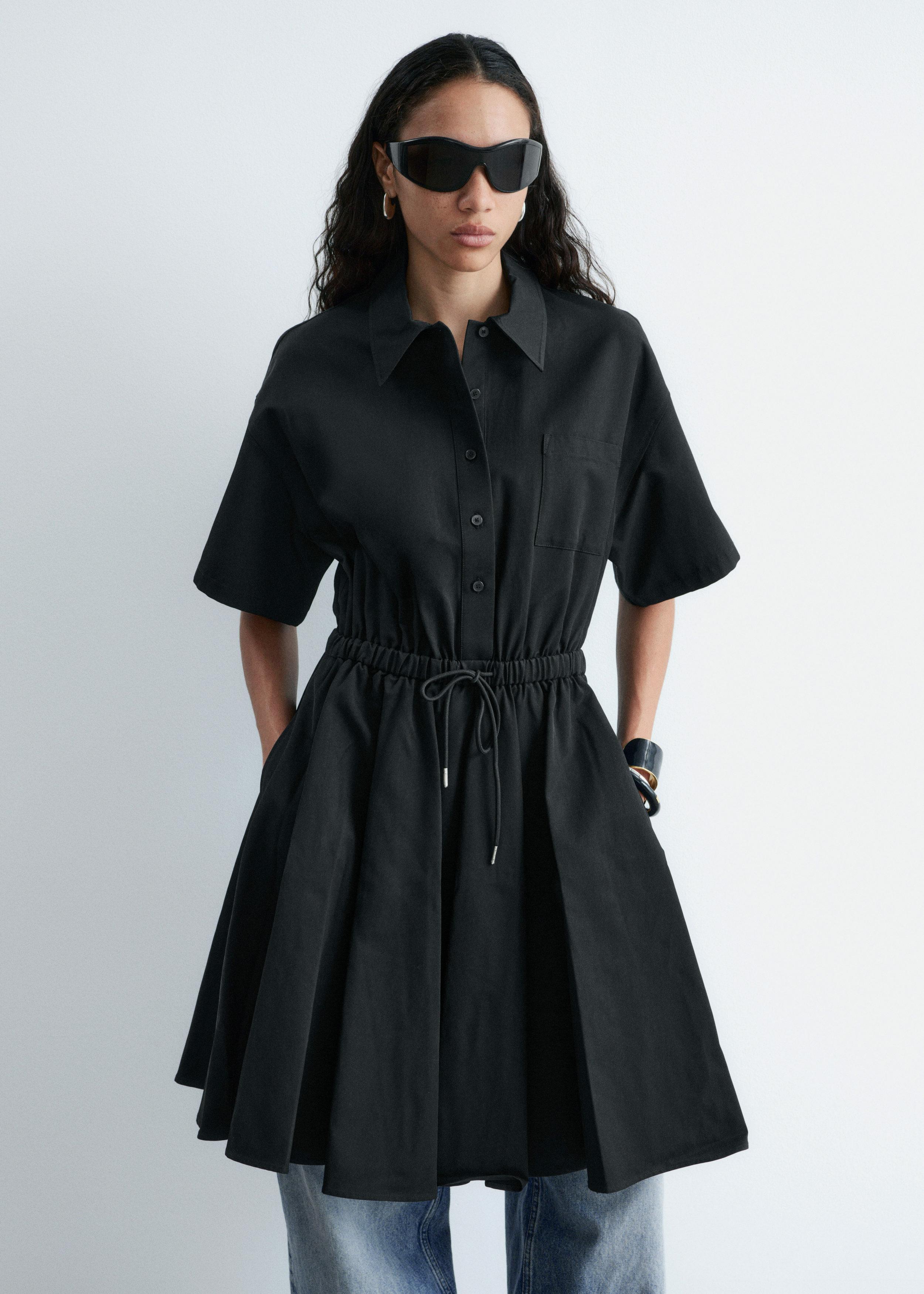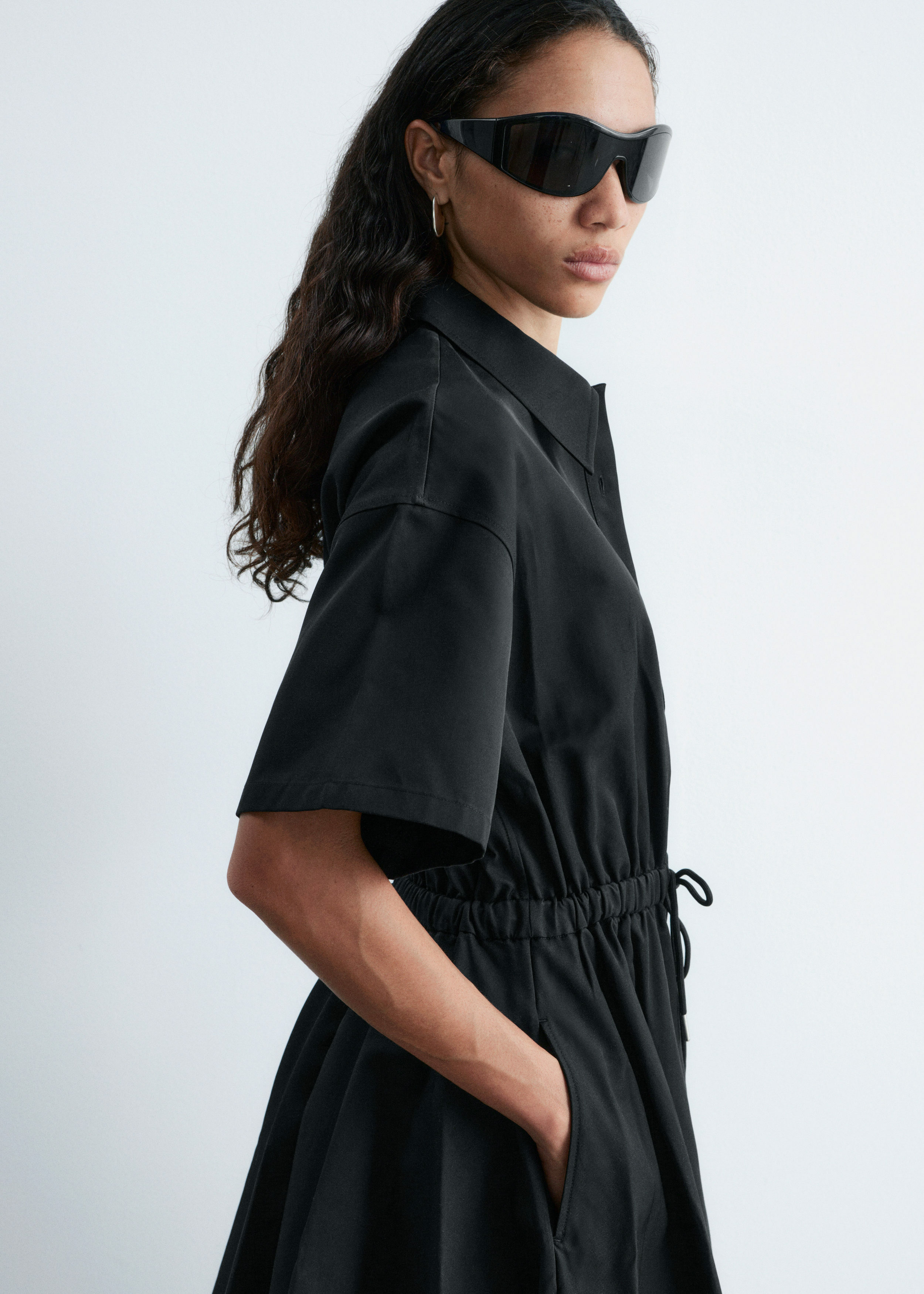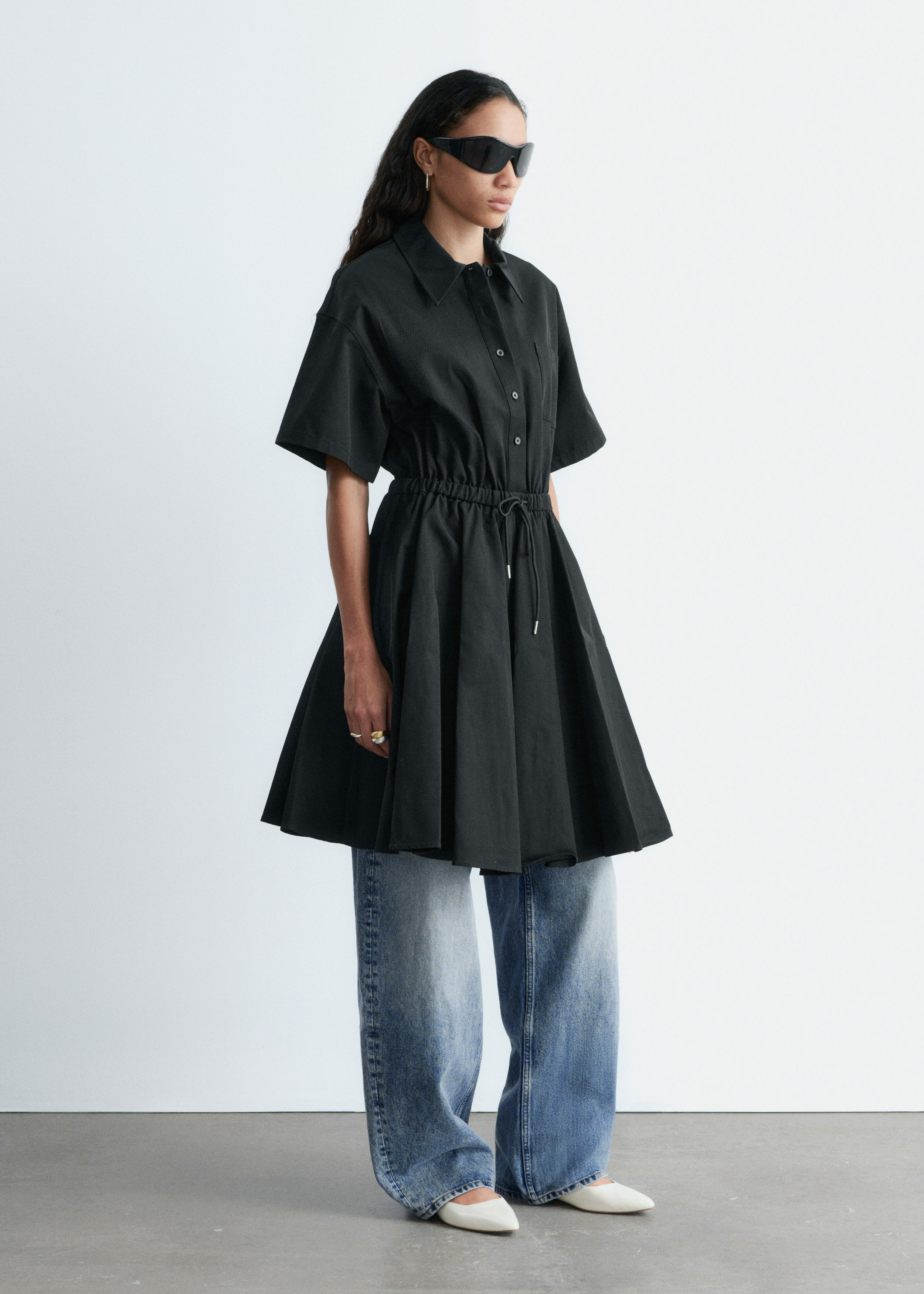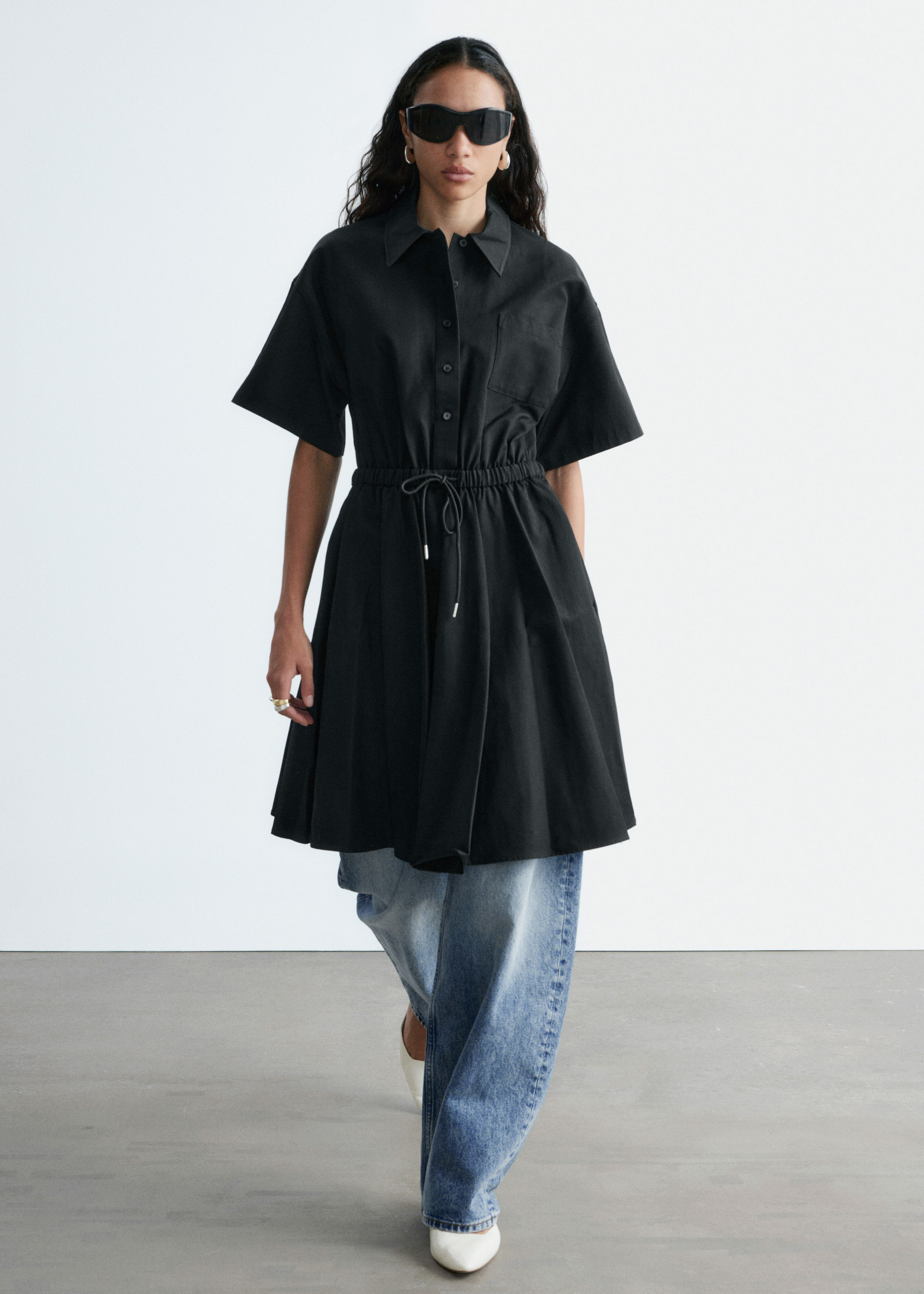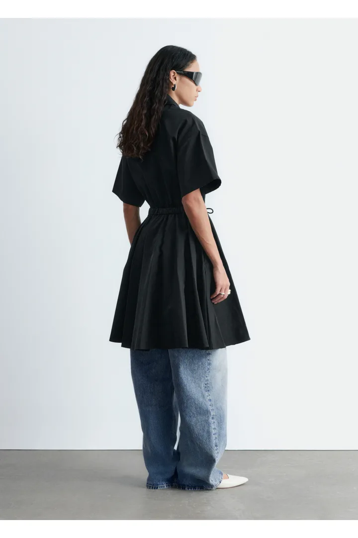 프레피 룩과 모던함이 조화를 이루는 셔츠 드레스예요. 산뜻한 코튼 트윌 소재로 탄생했으며 쇼트 슬리브와 클래식 카라, 가슴 포켓, 토널 단추가 자리해 있어요. 플레어 셔츠가 볼륨감을 더하며, 허리의 드로코드로 포인트를 줄 수 있답니다.