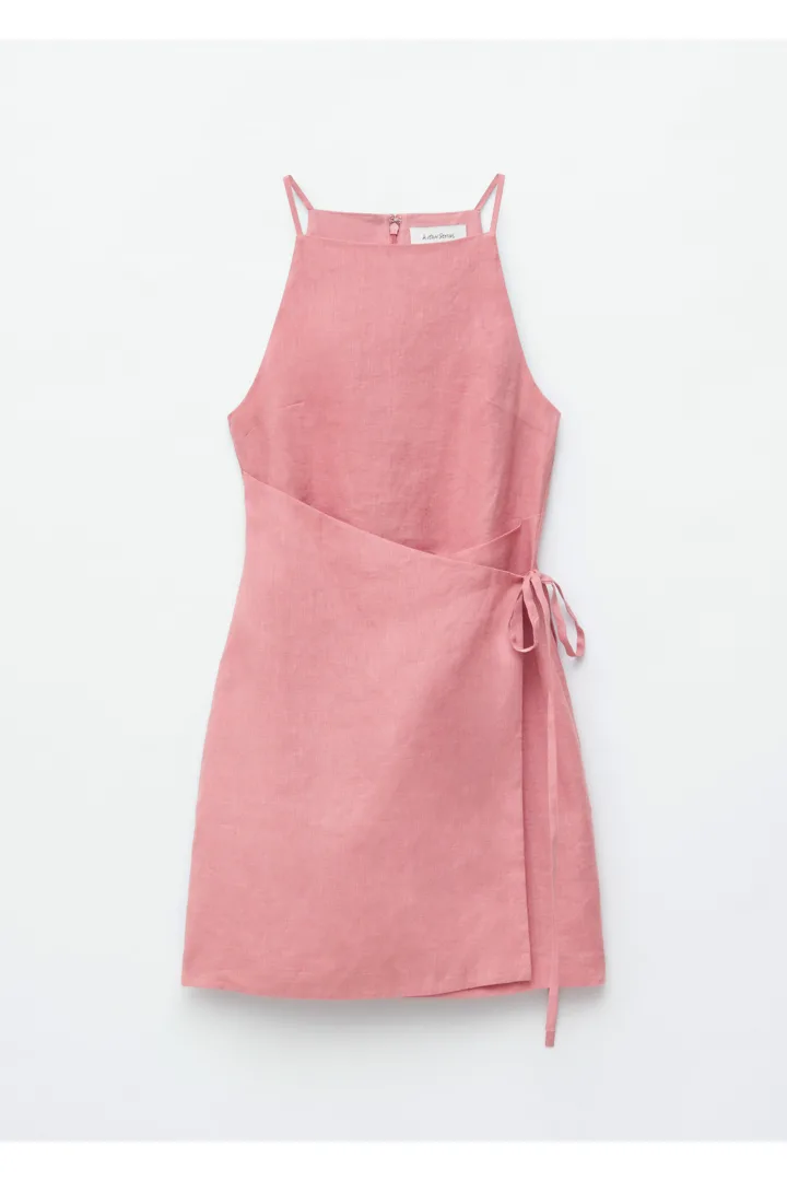 무더운 여름날을 위해 탄생한 미니 드레스예요. 가볍고 통기성 좋은 리넨 소재, 핏 되는 실루엣, 하이 넥, 얇은 숄더 스트랩, 허리에서 슬림한 타이 밴드로 여미는 랩오버 디자인이 특징이에요. 스트랩 샌들, 그리고 스트로 비치 백과 연출하면 더없이 멋스럽답니다.