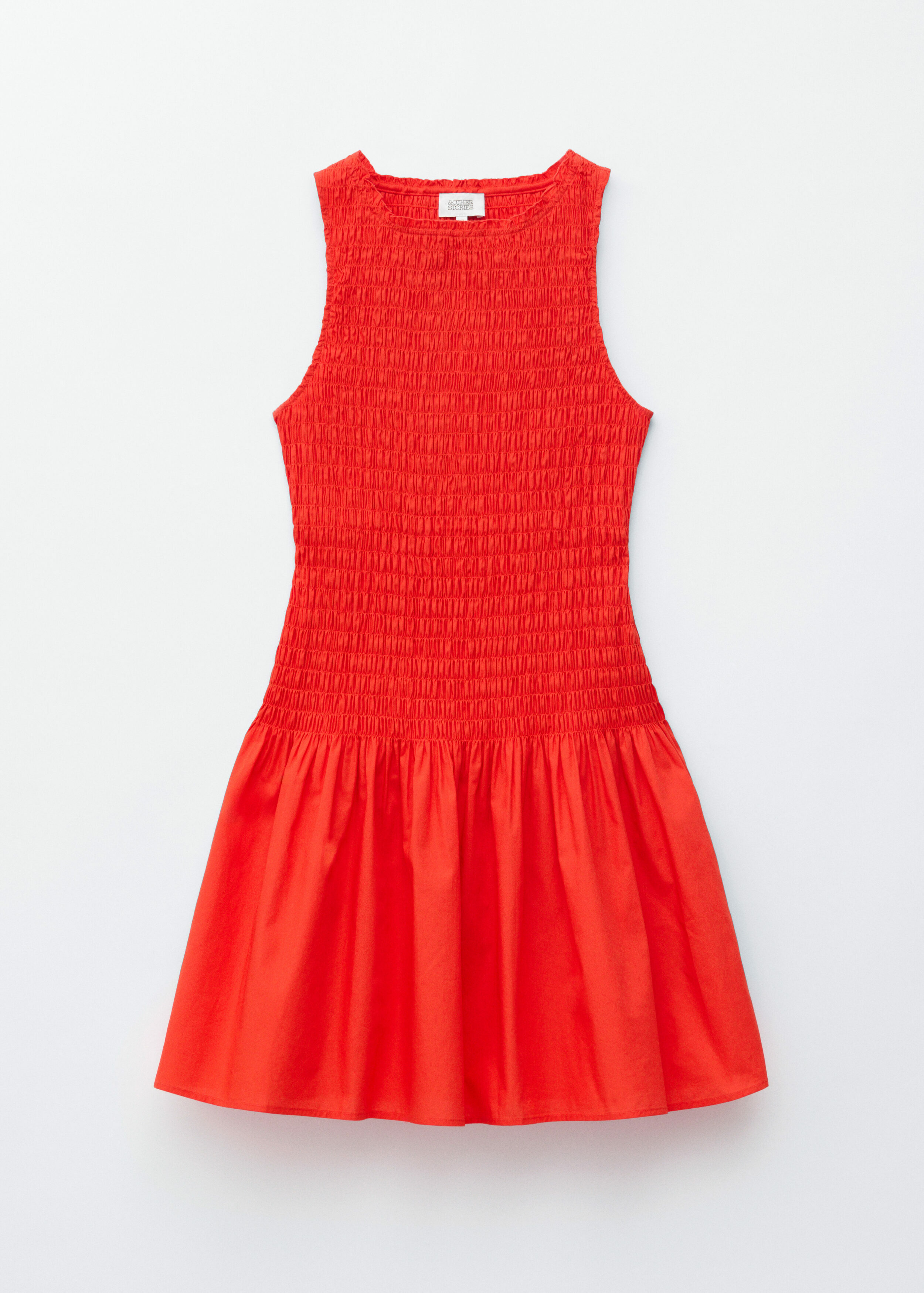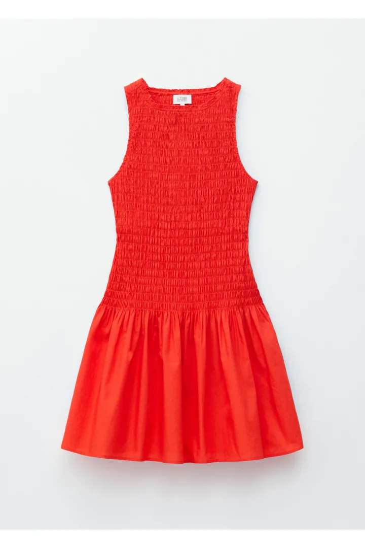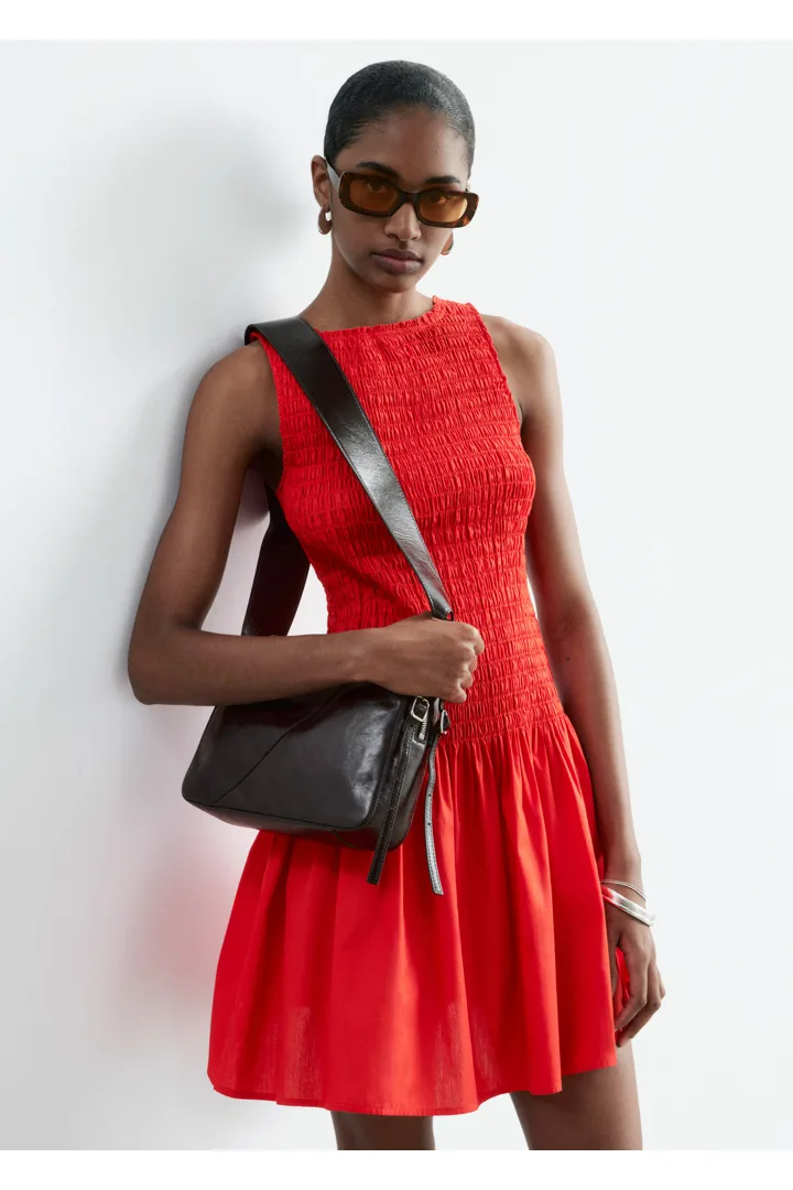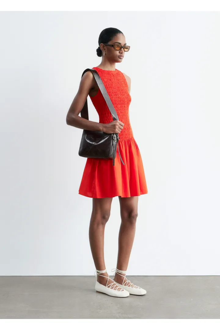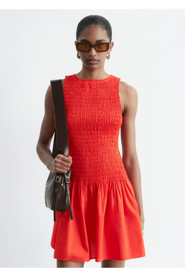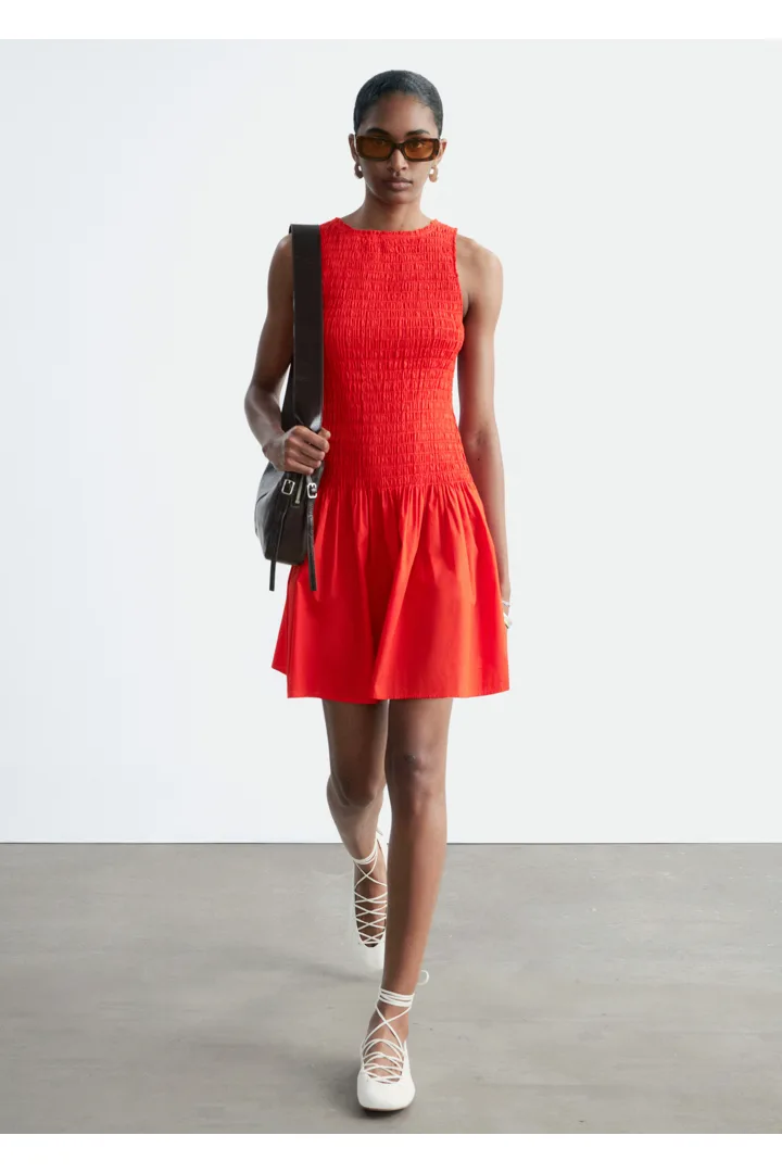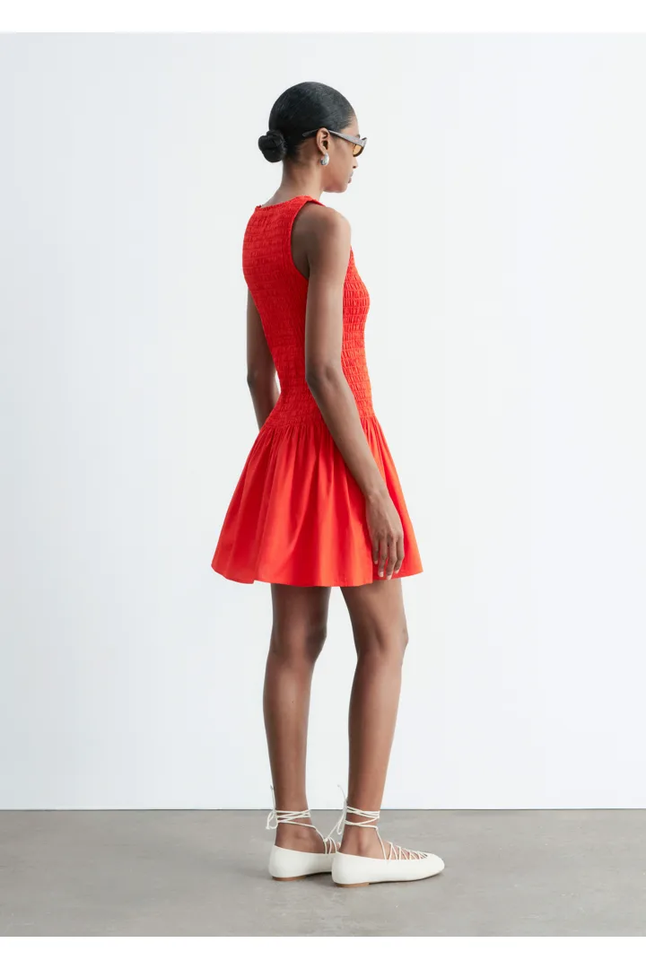 여름에 내추럴하게 어울리는 미니 드레스예요. 산뜻한 코튼 포플린 소재로 탄생했으며, 스모크 디테일이 돋보이는 보디스는 무릎 위 기장의 스커트로 자연스럽게 이어진답니다. 슬리브리스 실루엣으로 더운 날씨에 편안하게 착용할 수 있어요.