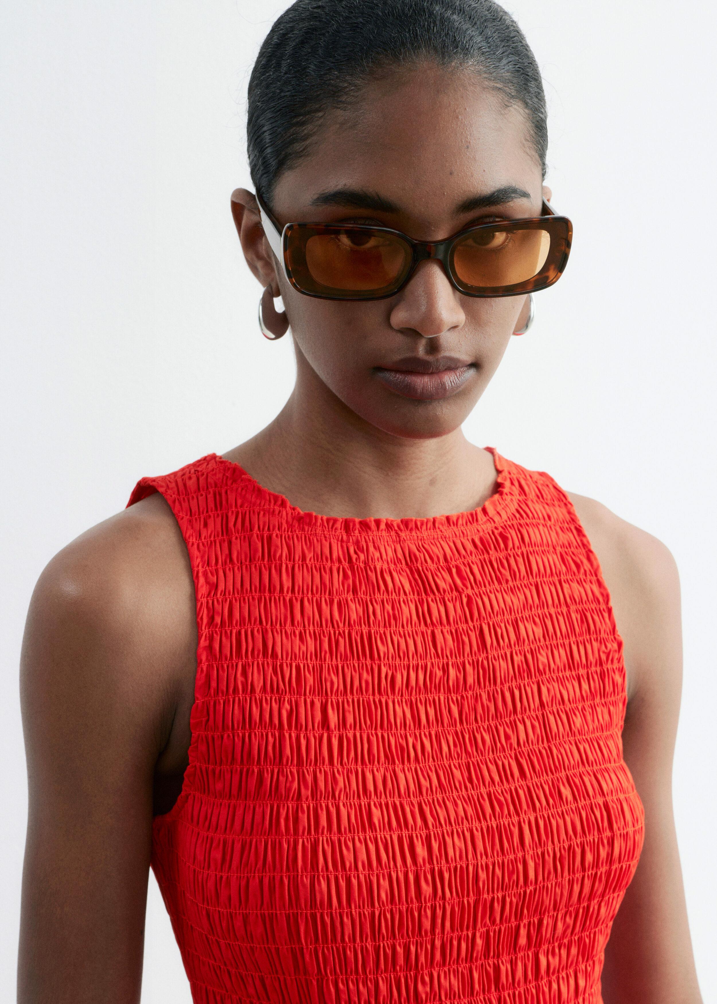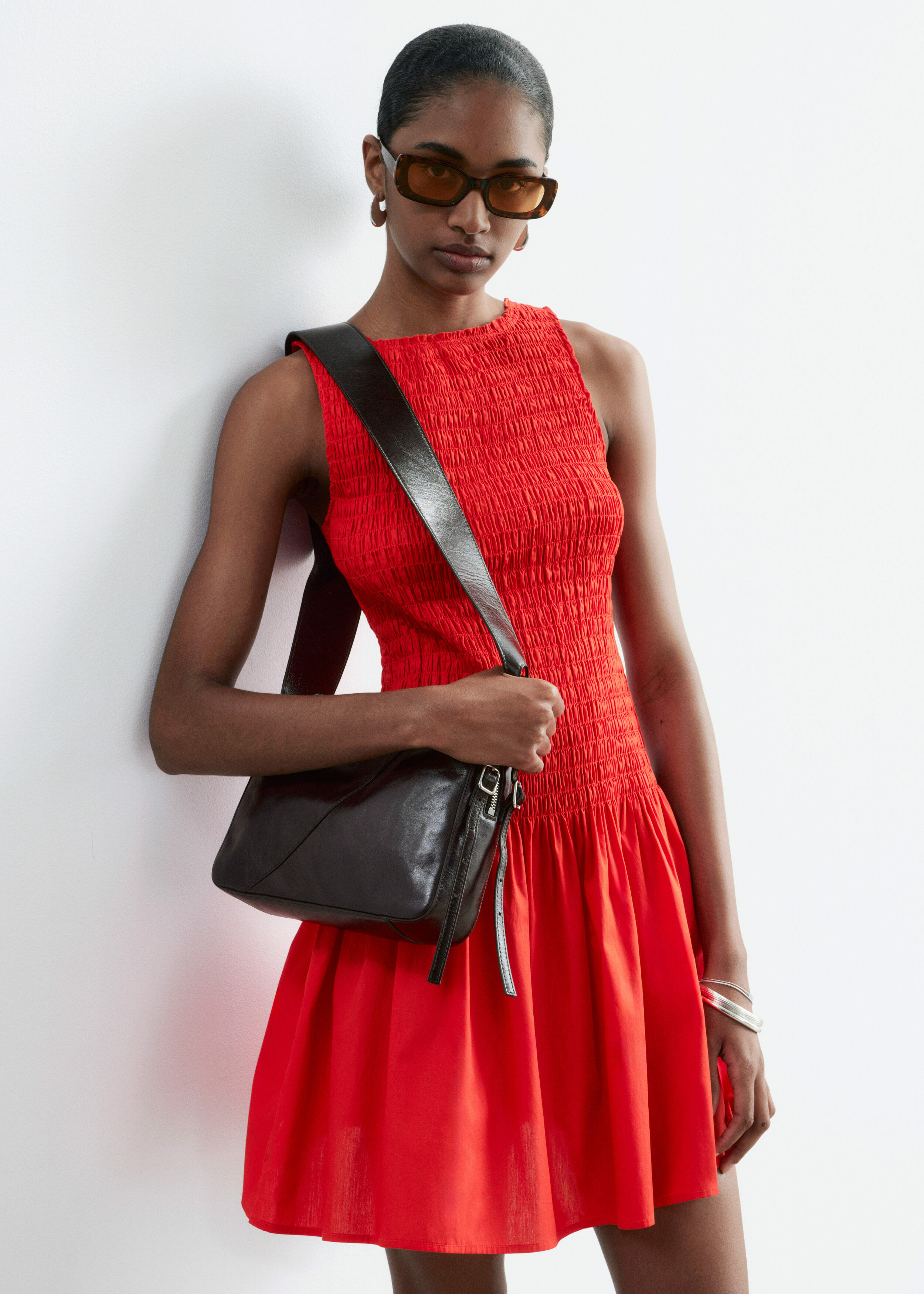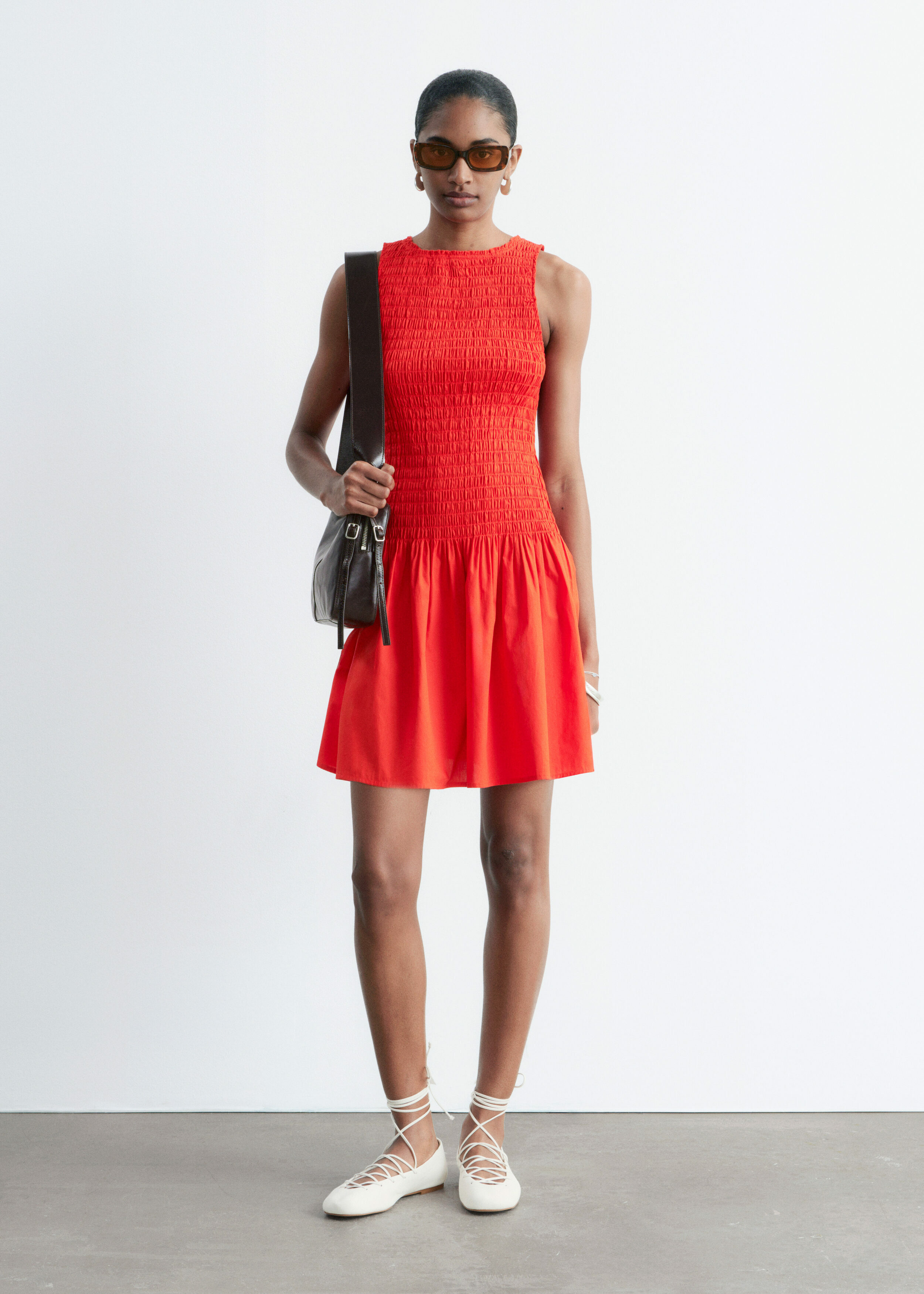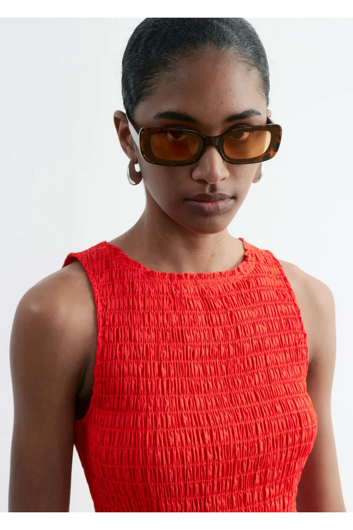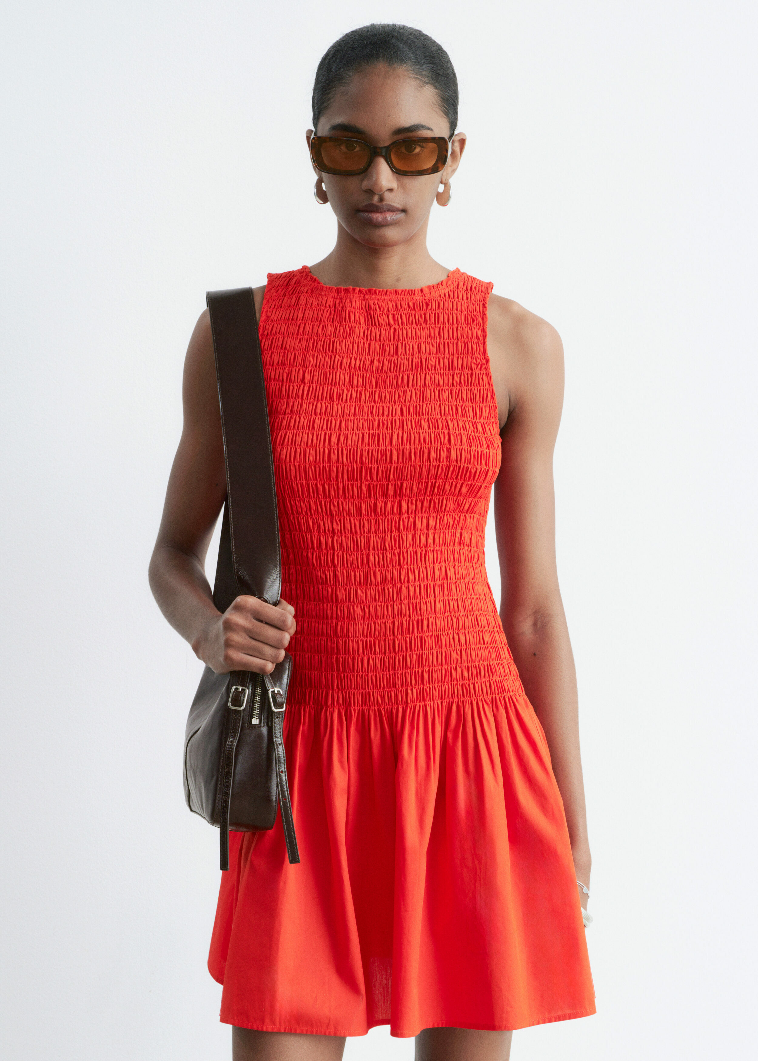여름에 내추럴하게 어울리는 미니 드레스예요. 산뜻한 코튼 포플린 소재로 탄생했으며, 스모크 디테일이 돋보이는 보디스는 무릎 위 기장의 스커트로 자연스럽게 이어진답니다. 슬리브리스 실루엣으로 더운 날씨에 편안하게 착용할 수 있어요.