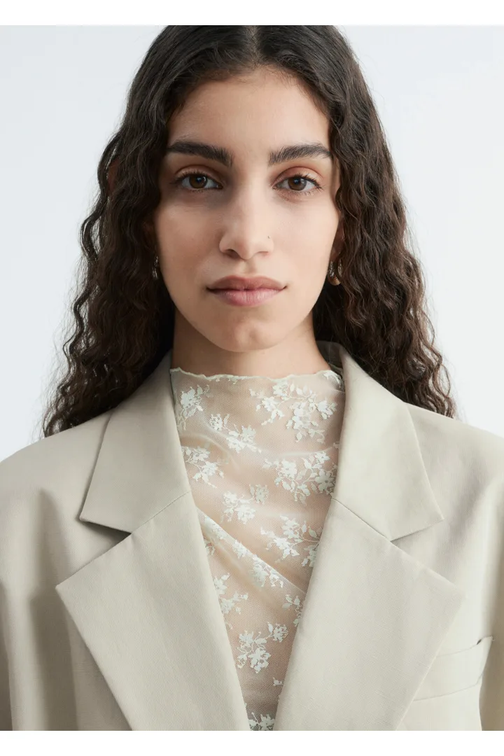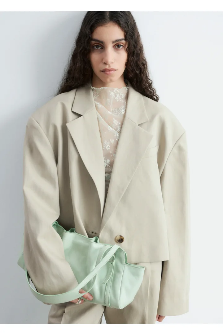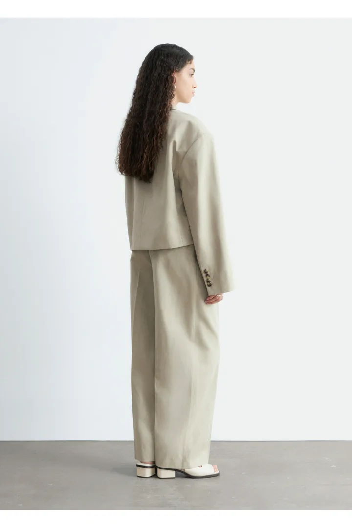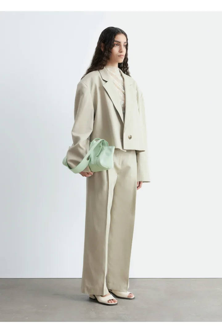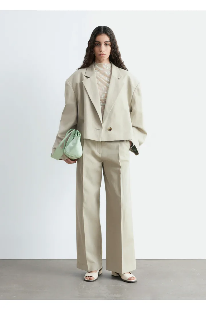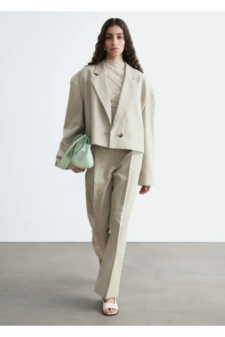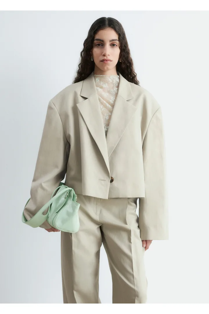 울 & 리넨 혼방 소재로 탄생한 크롭 블레이저예요. 오버사이즈 실루엣, 드롭 숄더, 앞면의 싱글 단추가 특징이랍니다. 간결한 무드가 돋보이는 제품으로, 가슴 포켓과 버튼 커프스가 자리해 있어요.