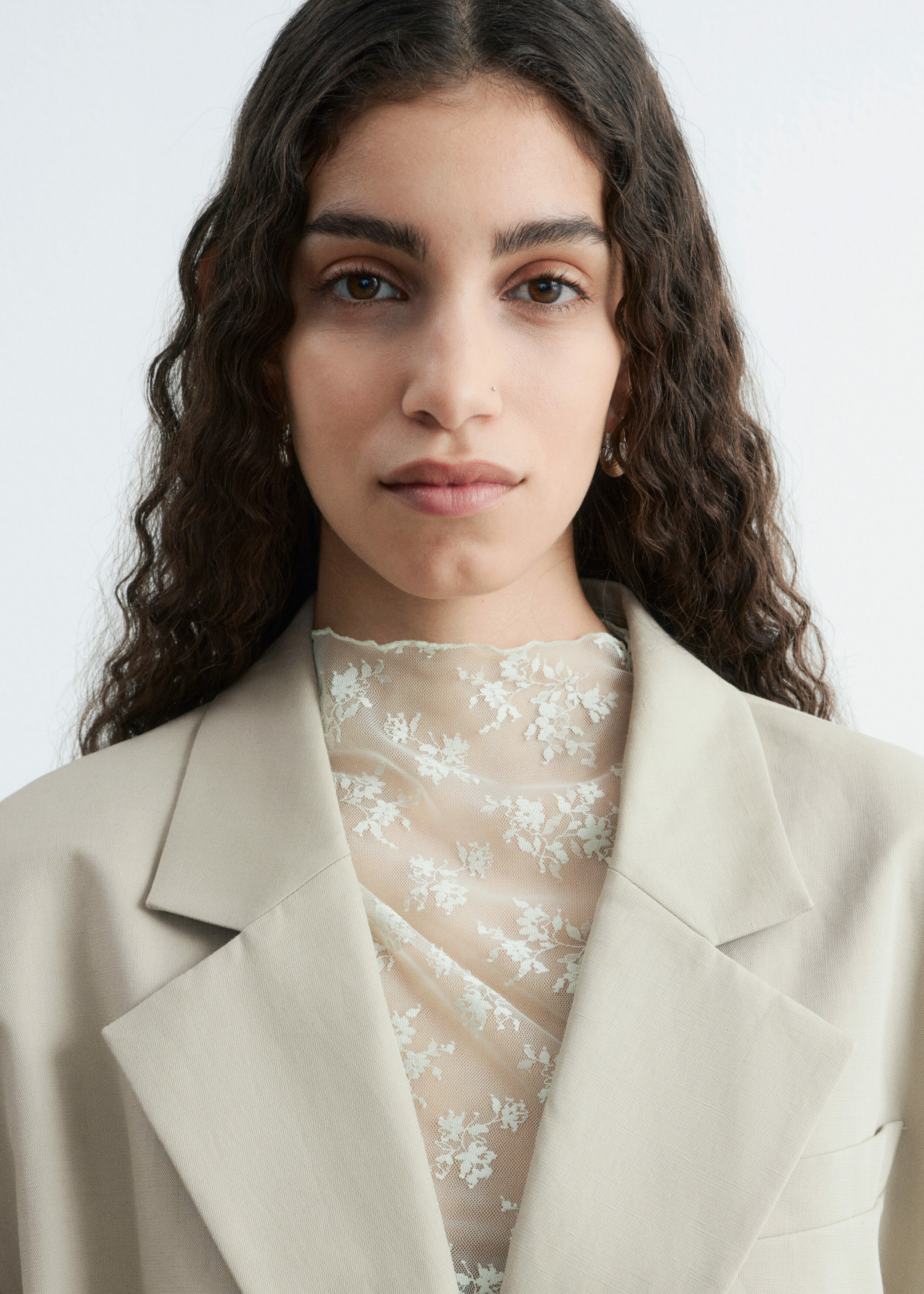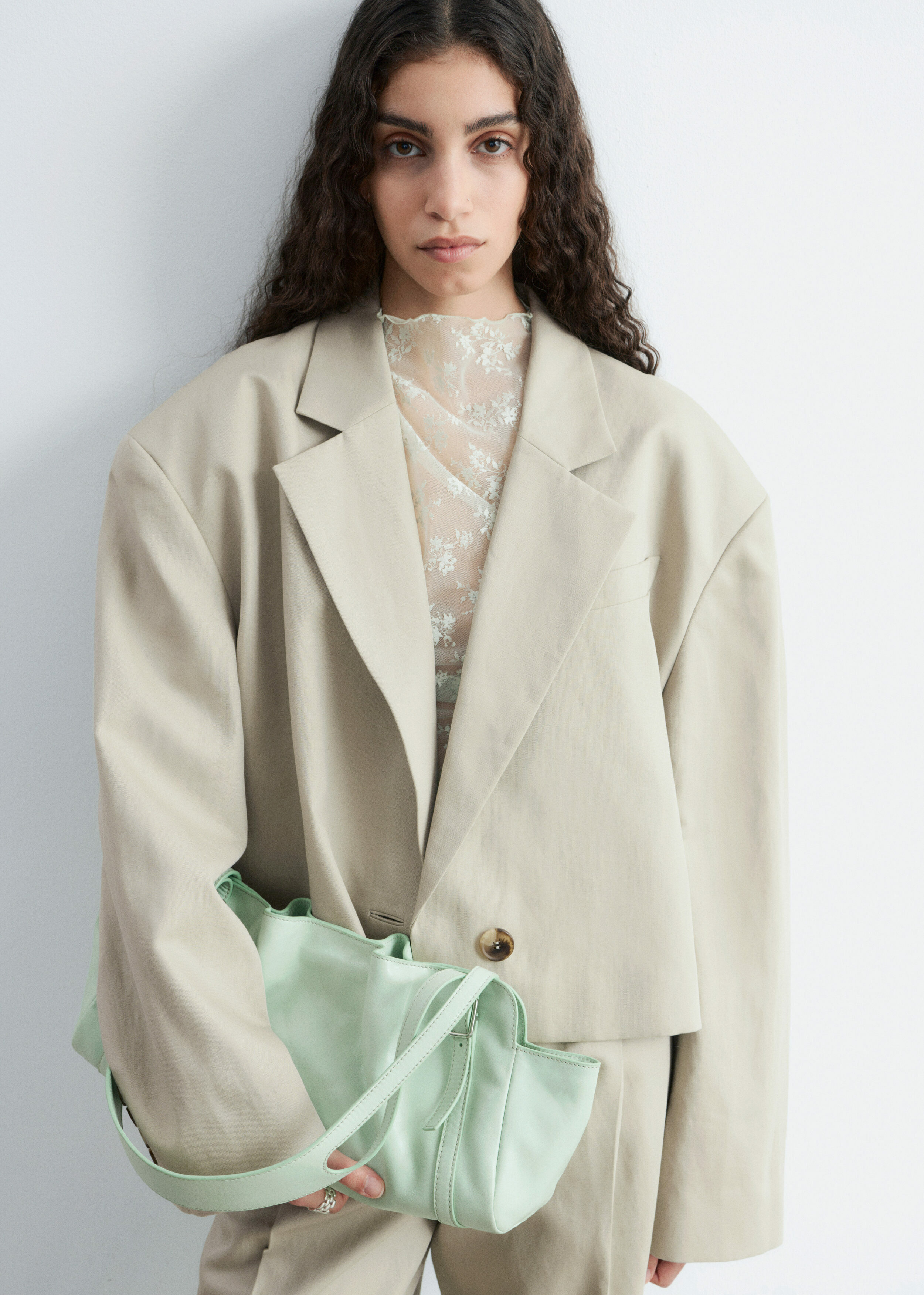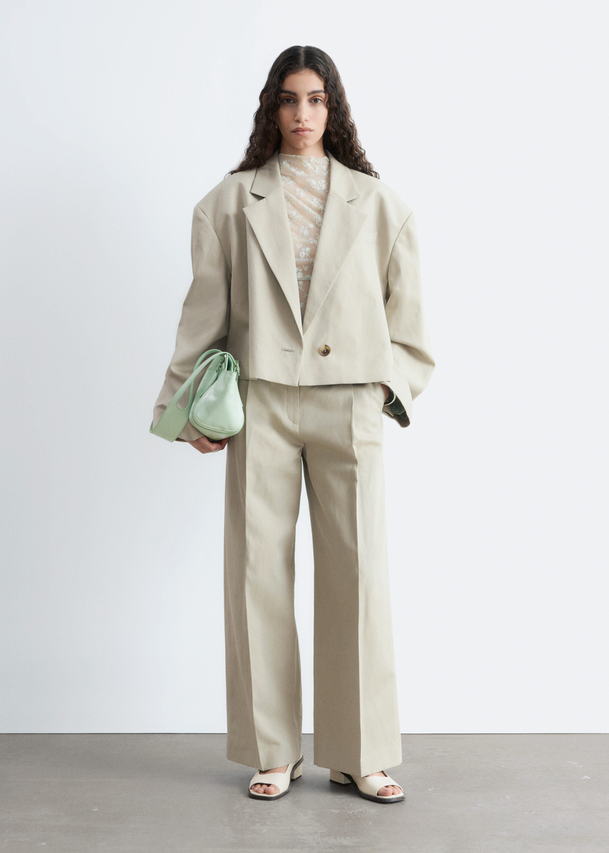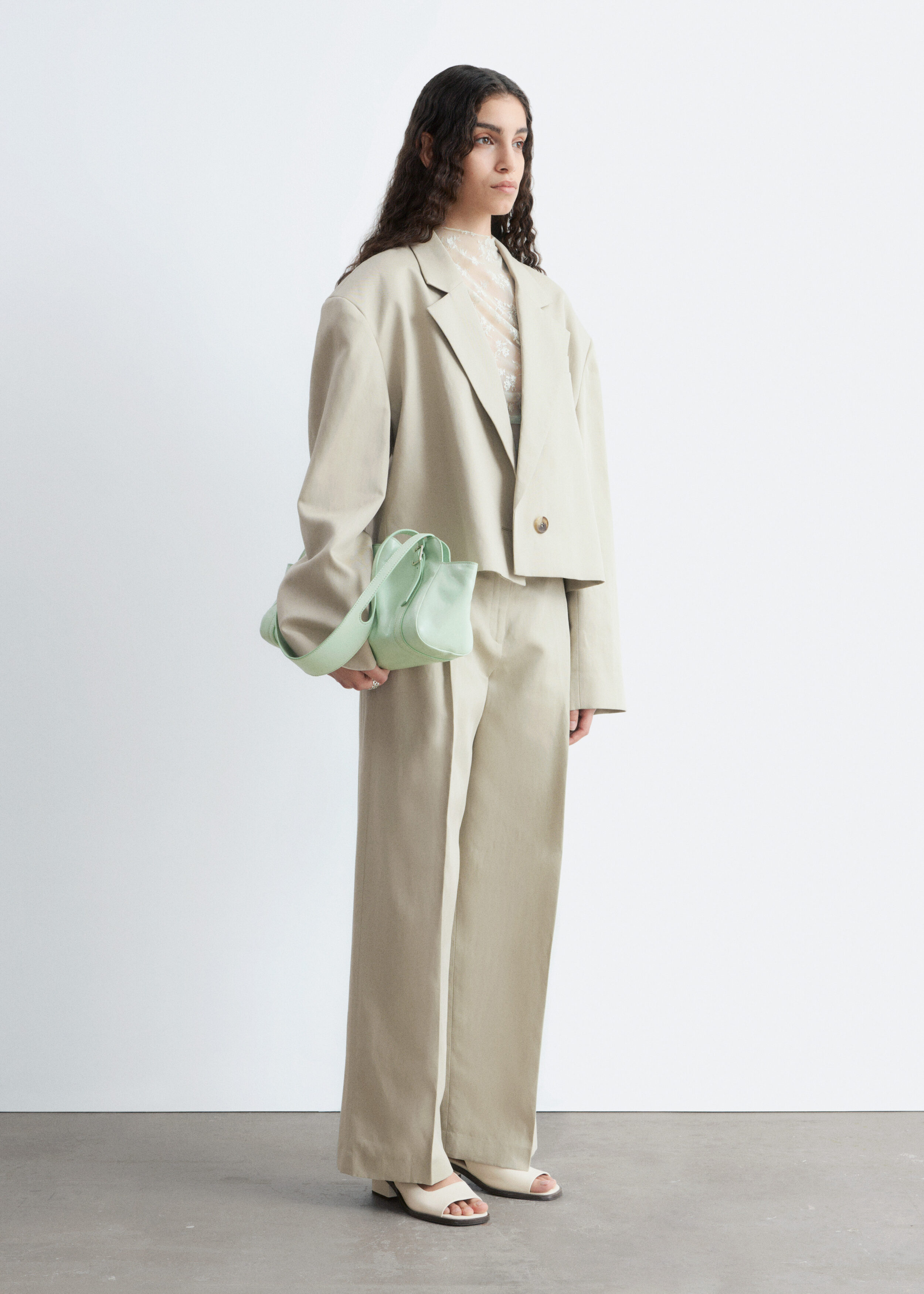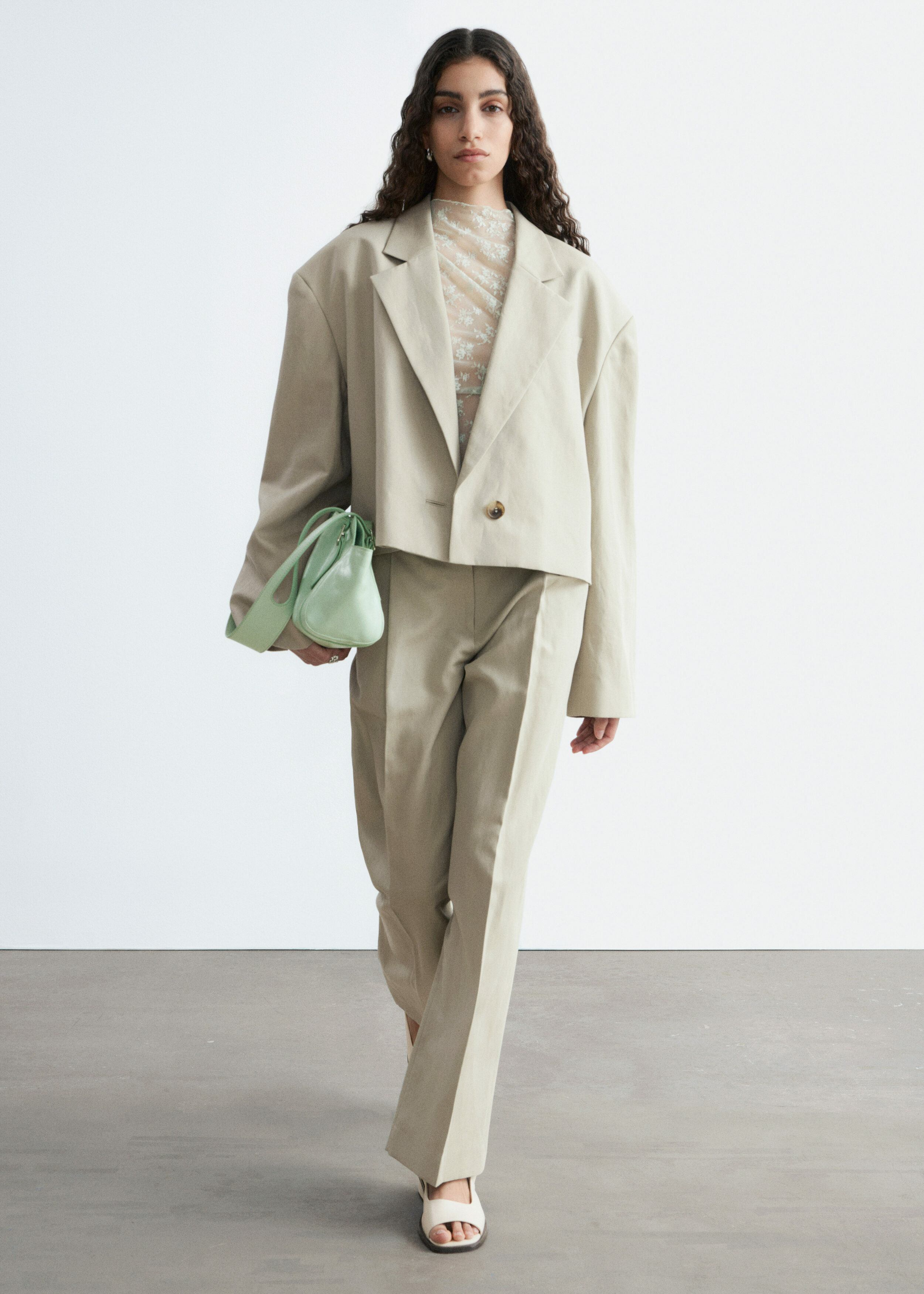 울 & 리넨 혼방 소재로 탄생한 크롭 블레이저예요. 오버사이즈 실루엣, 드롭 숄더, 앞면의 싱글 단추가 특징이랍니다. 간결한 무드가 돋보이는 제품으로, 가슴 포켓과 버튼 커프스가 자리해 있어요.
