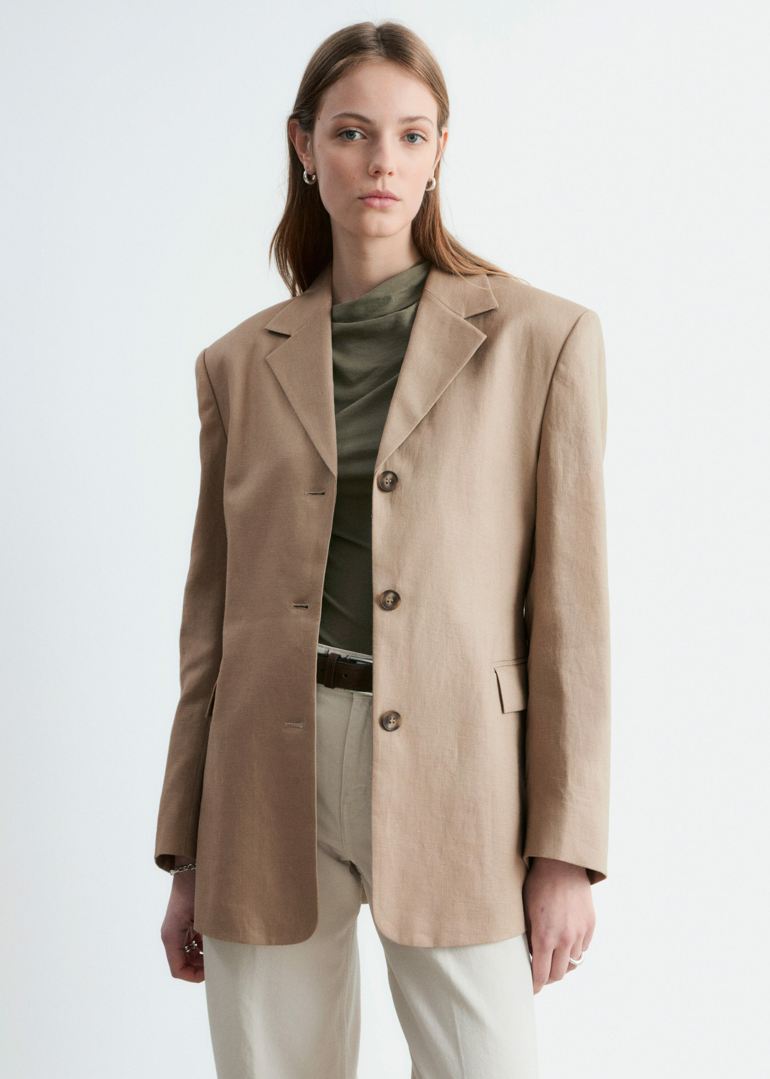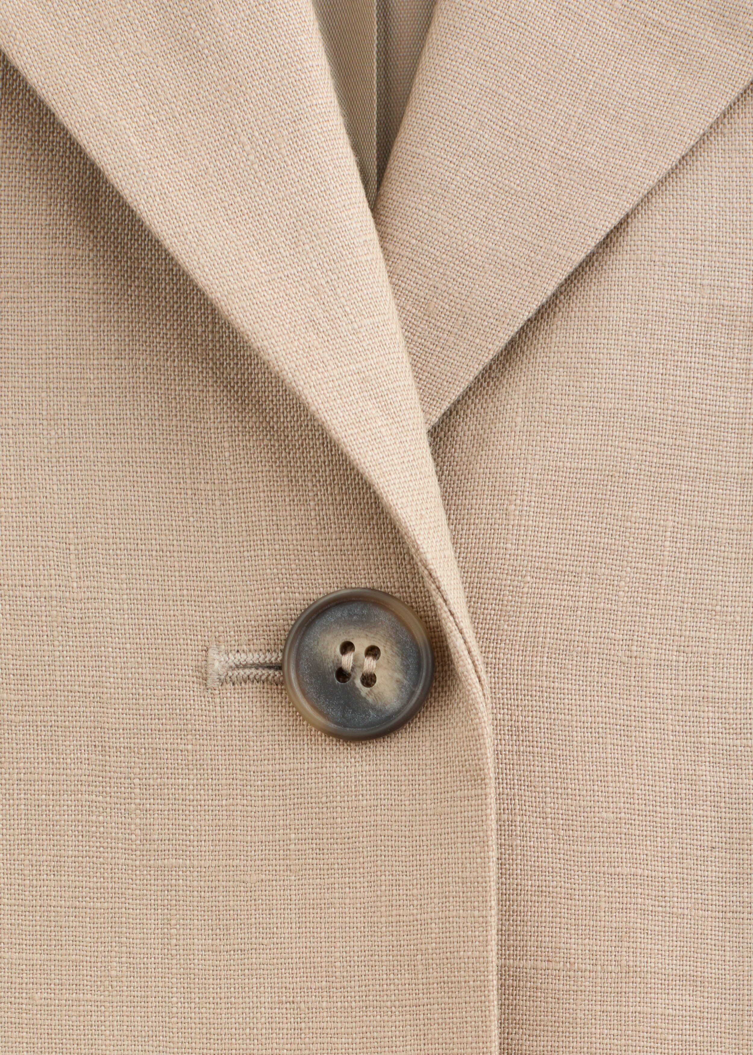 리넨 워드로브에 세련된 감각을 더해줄 싱글 브레스티드 블레이저예요. 부드럽게 슬림해지는 허리라인, 플랩이 달린 제트 포켓, 그리고 소매의 트임이 특징이랍니다.