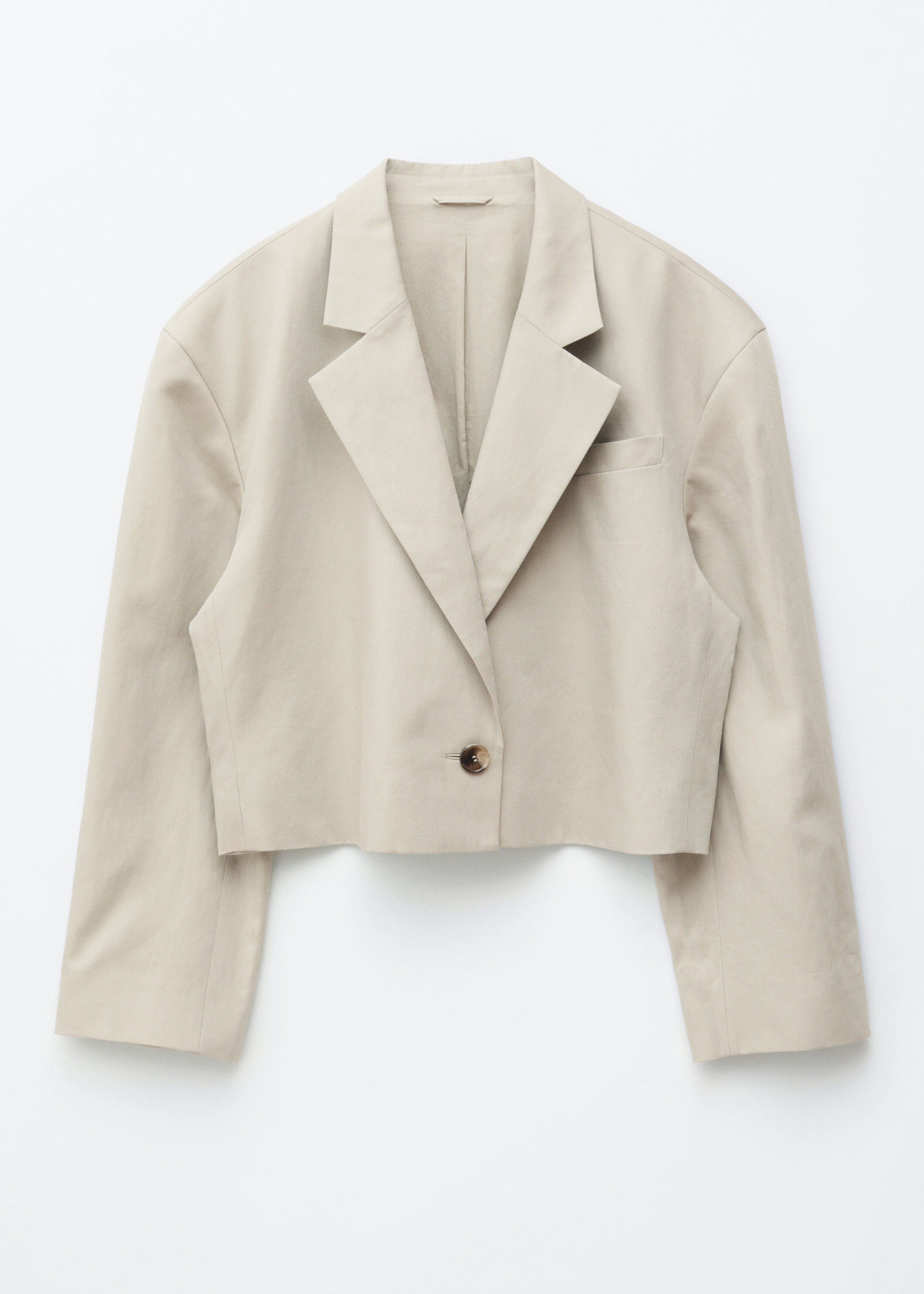 리넨 혼방 소재로 탄생한 크롭 블레이저예요. 오버사이즈 실루엣, 드롭 숄더, 앞면의 싱글 단추가 특징이랍니다. 간결한 무드가 돋보이는 제품으로, 가슴 포켓과 버튼 커프스가 자리해 있어요.