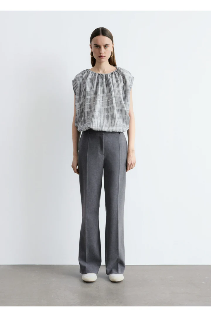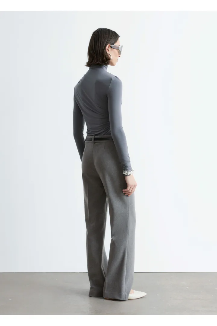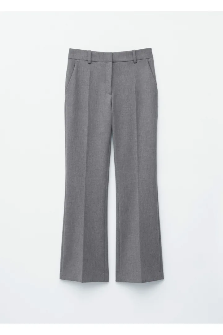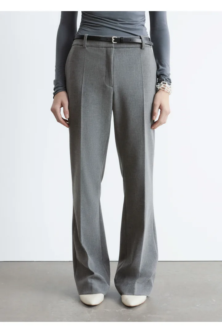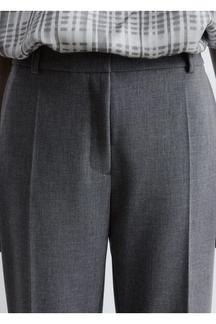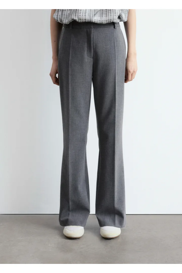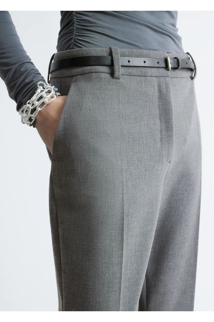 울 혼방 소재로 탄생한 트라우저예요. 스트레이트 컷 레그는 은은한 플레어 쉐입의 헴라인으로 이어지며, 날렵한 프레스 크리스가 포인트랍니다. 지퍼 플라이와 후크 앤 바 클로저가 자리해 있어요.