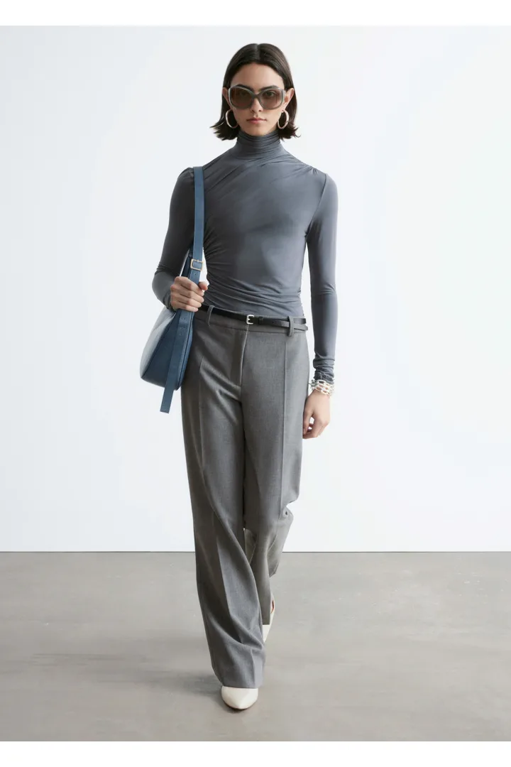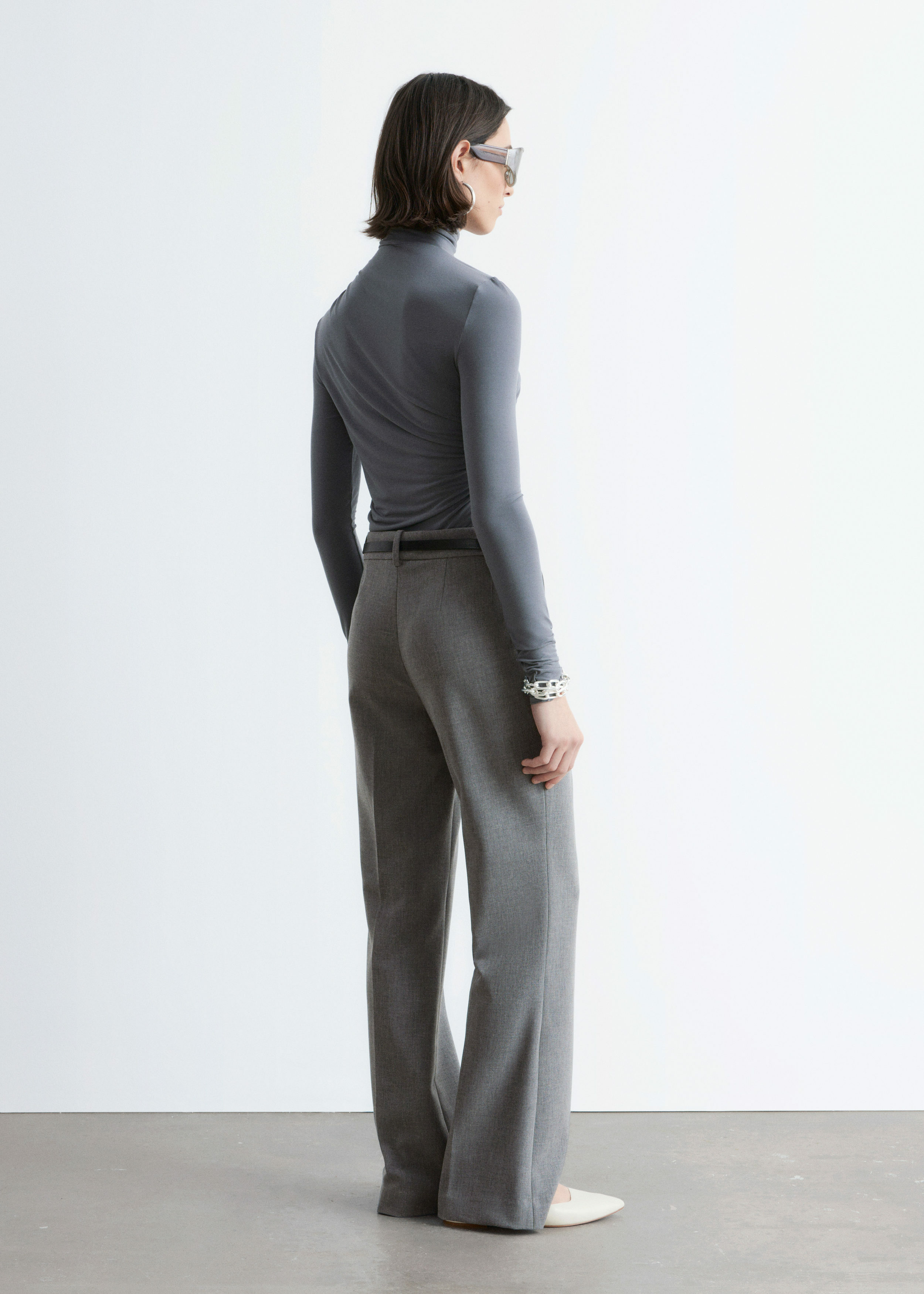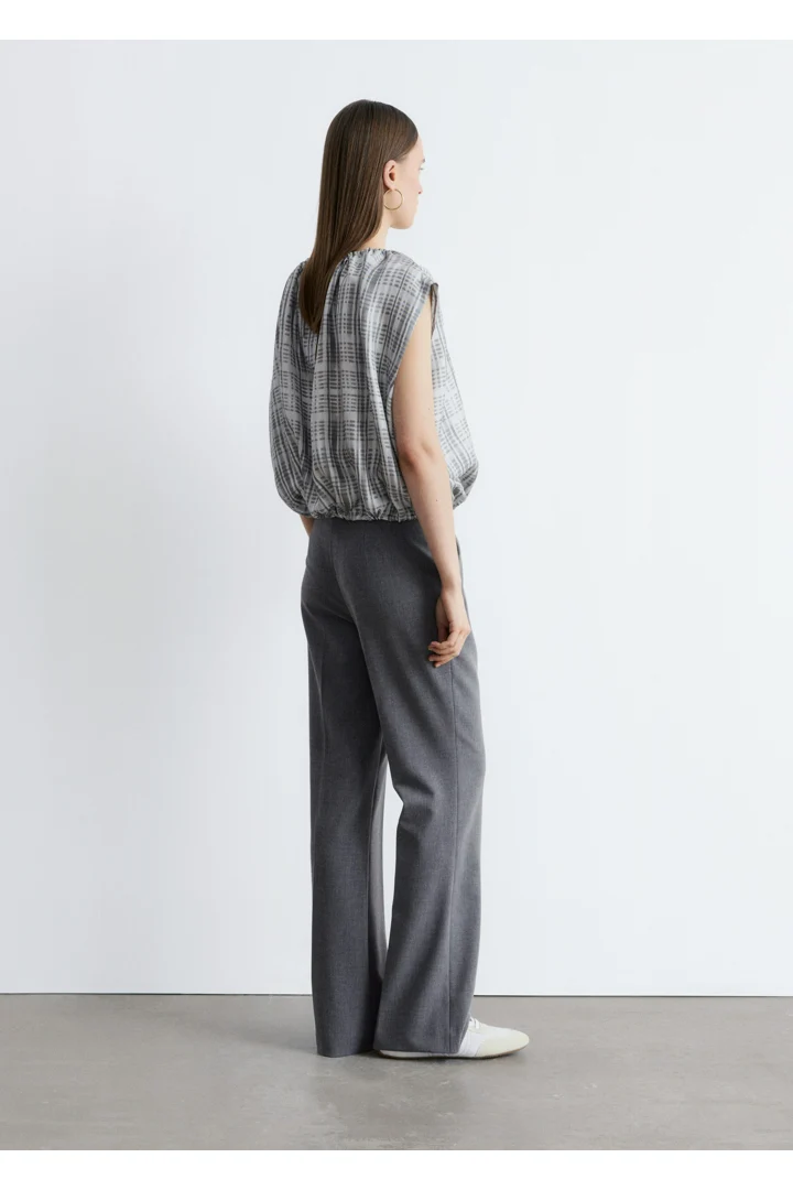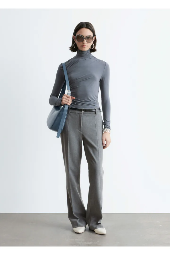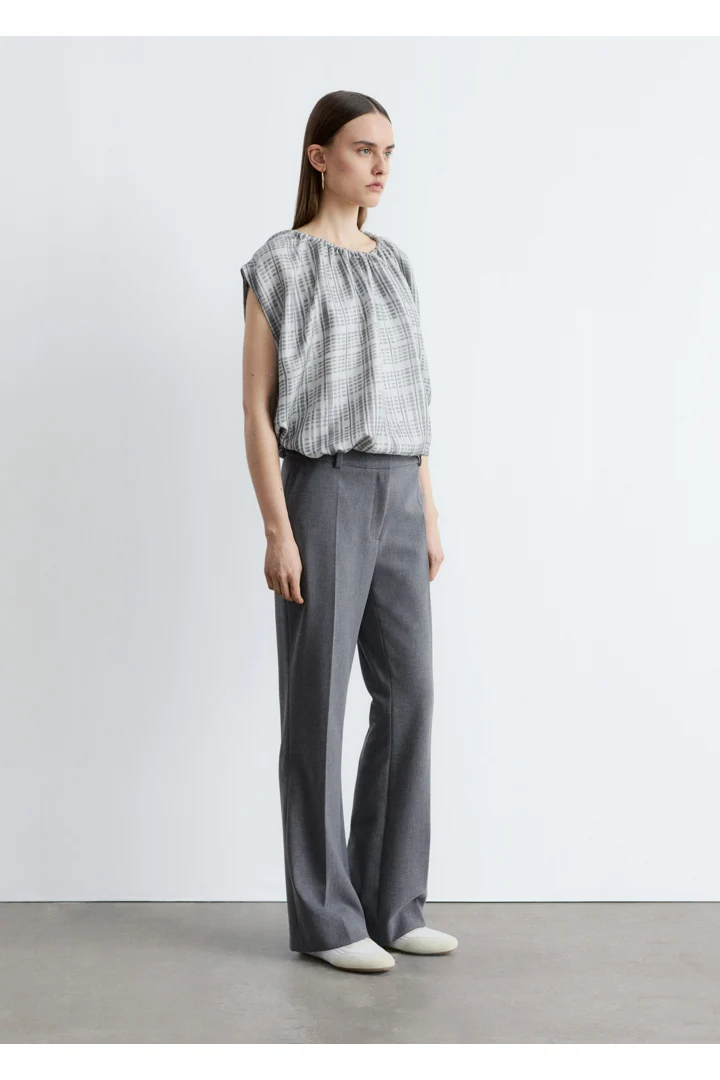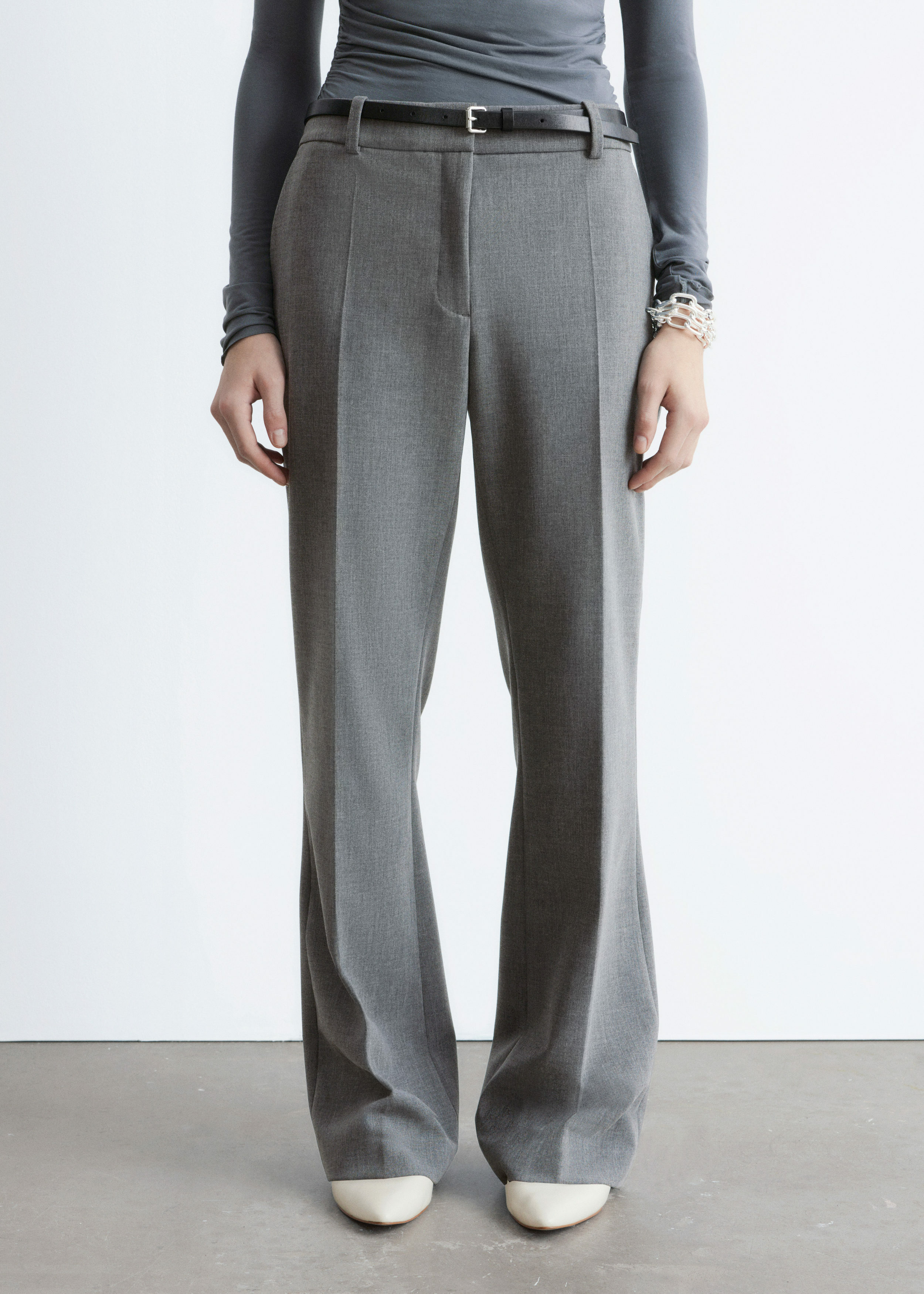 울 혼방 소재로 탄생한 트라우저예요. 스트레이트 컷 레그는 은은한 플레어 쉐입의 헴라인으로 이어지며, 날렵한 프레스 크리스가 포인트랍니다. 지퍼 플라이와 후크 앤 바 클로저가 자리해 있어요.