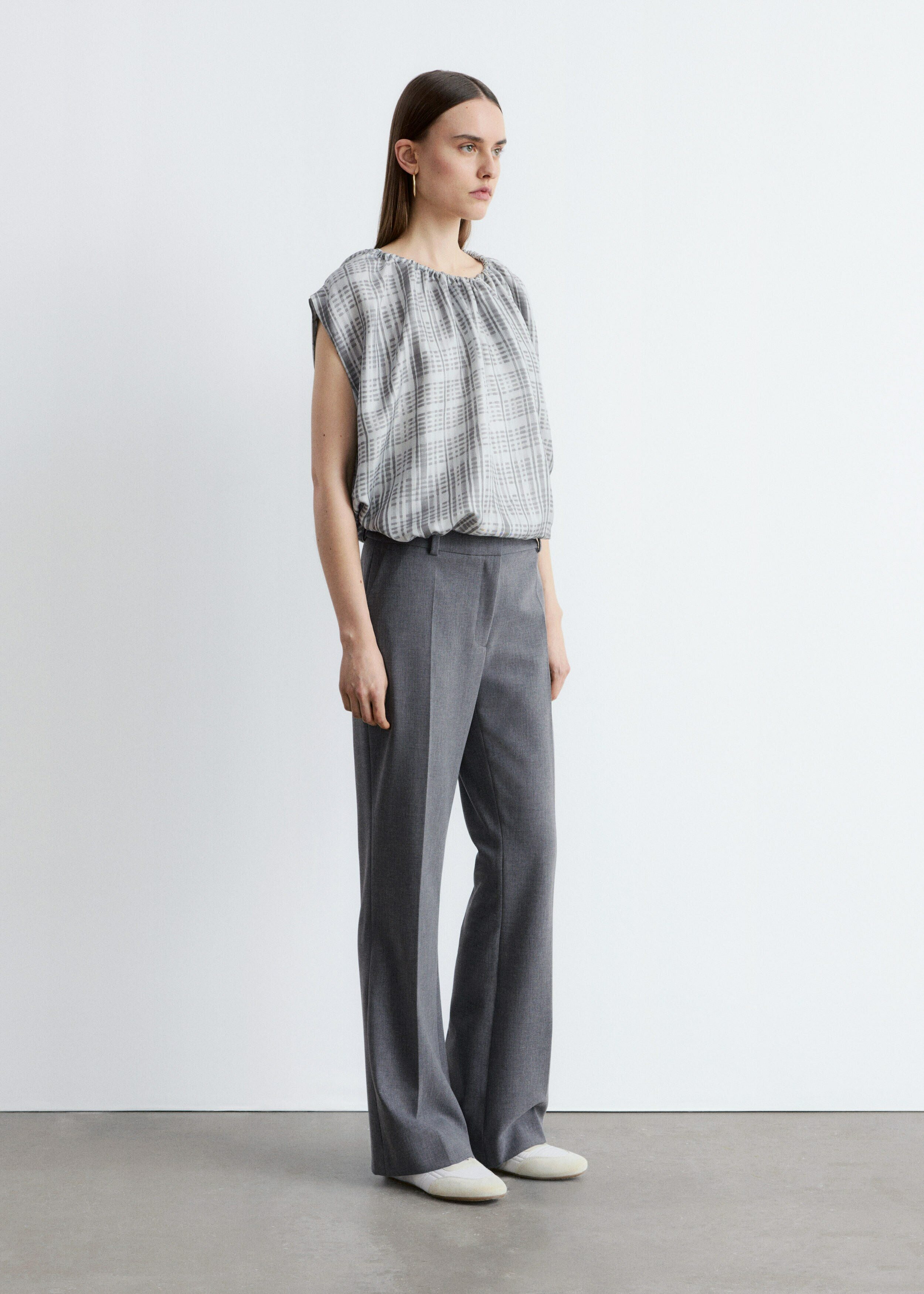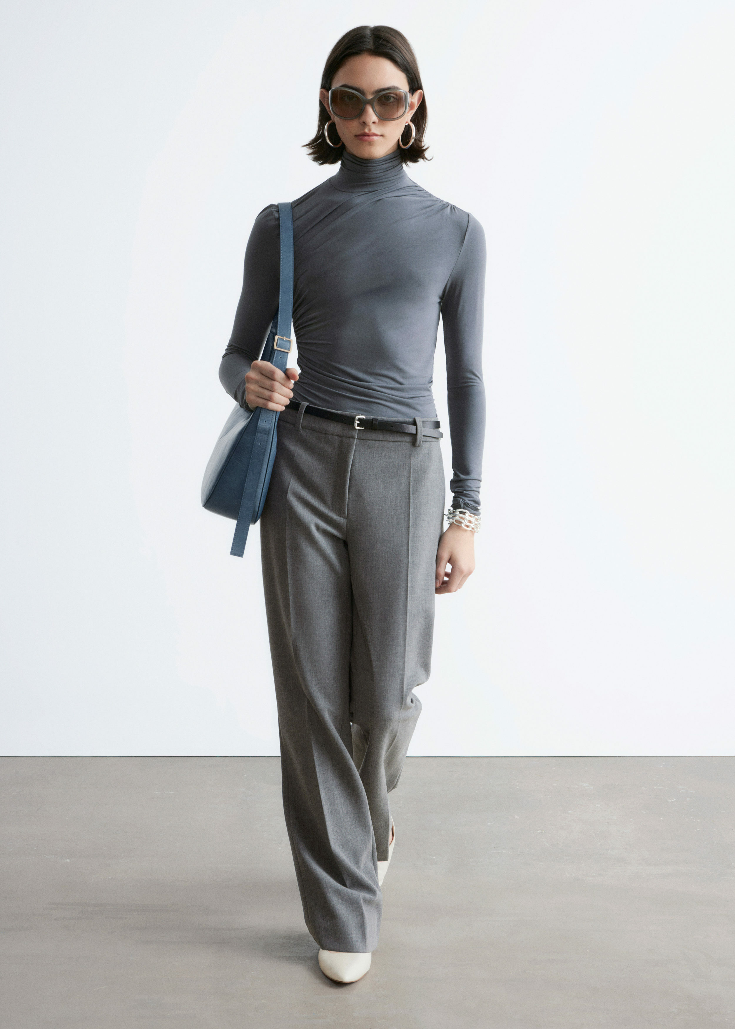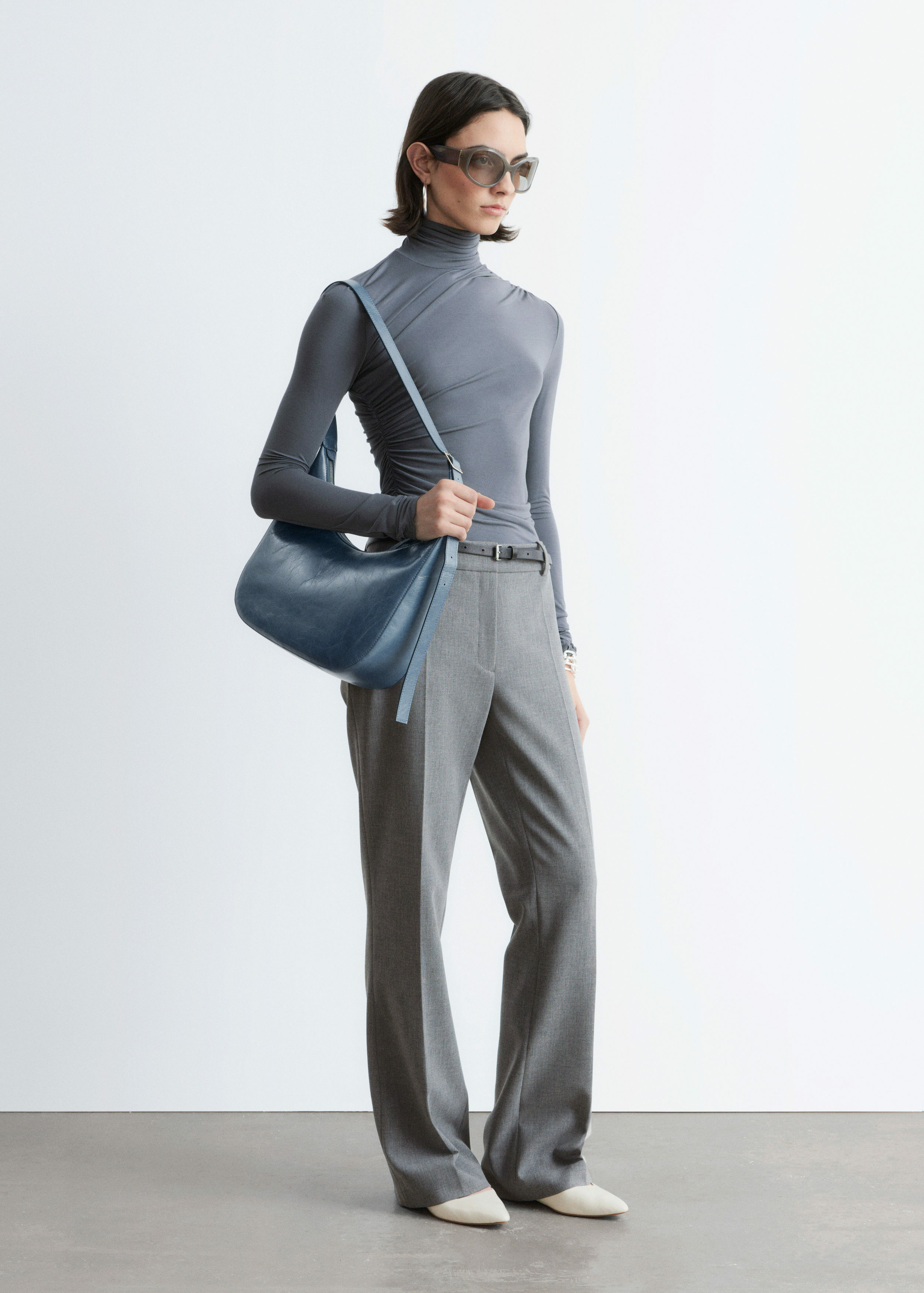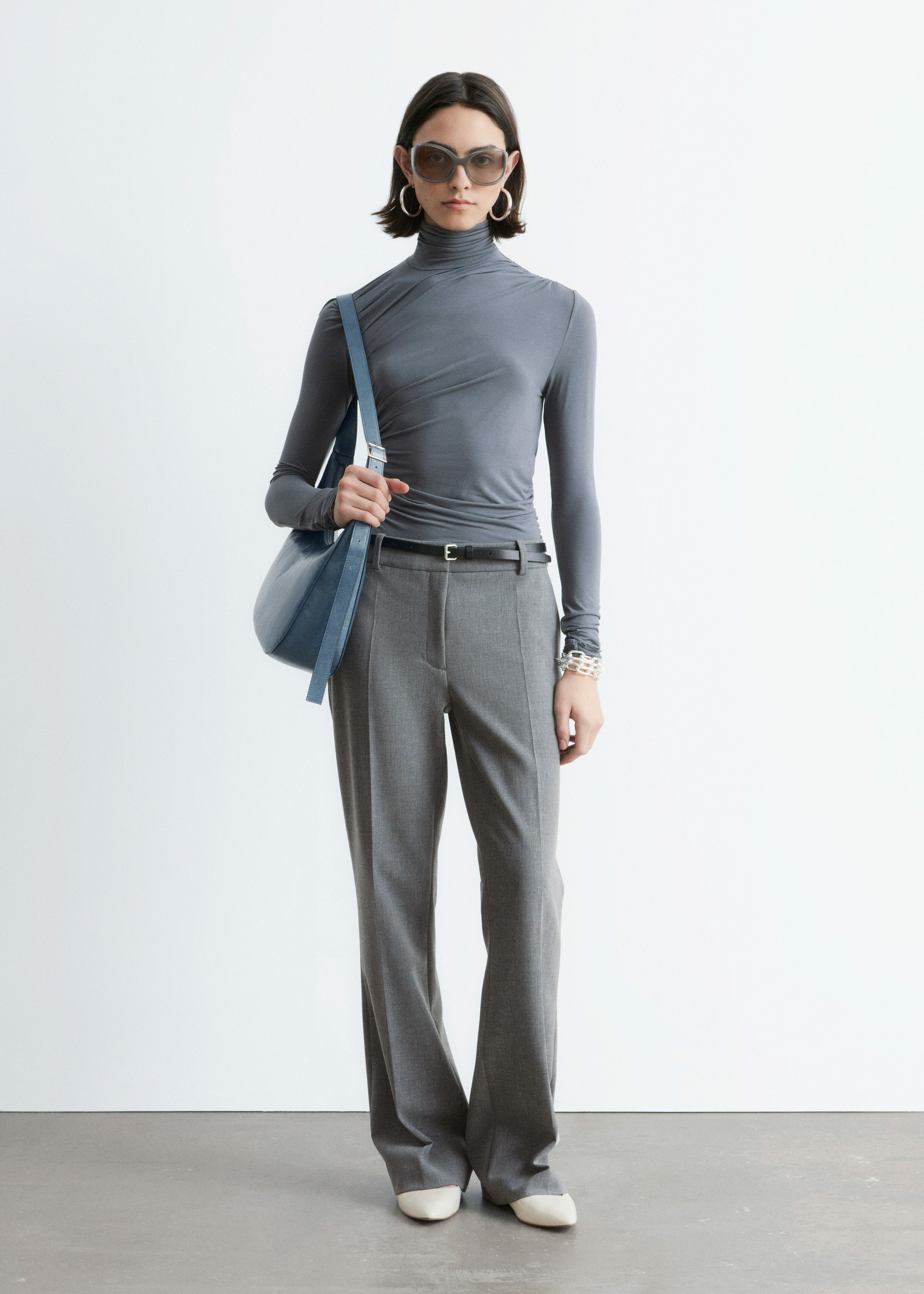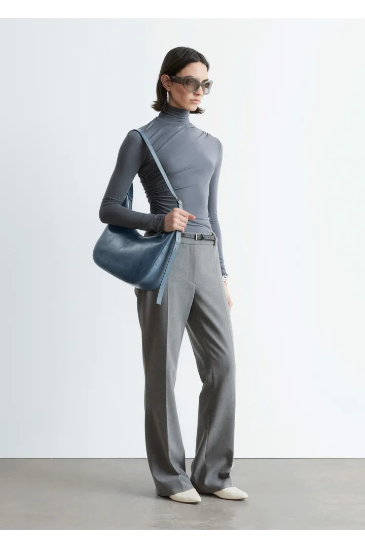 울 혼방 소재로 탄생한 트라우저예요. 스트레이트 컷 레그는 은은한 플레어 쉐입의 헴라인으로 이어지며, 날렵한 프레스 크리스가 포인트랍니다. 지퍼 플라이와 후크 앤 바 클로저가 자리해 있어요.