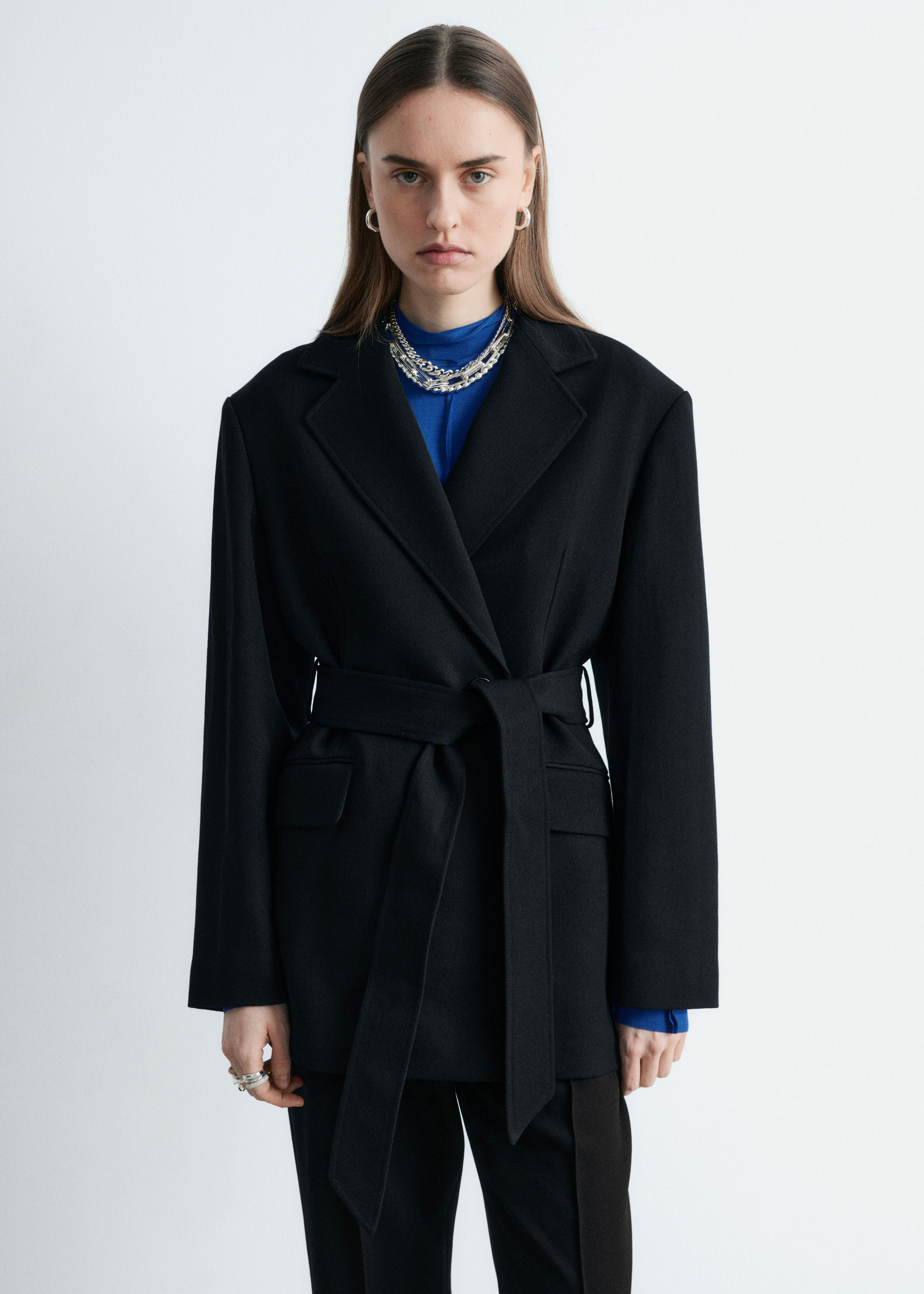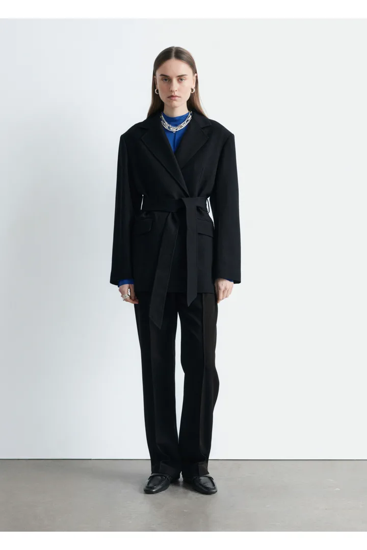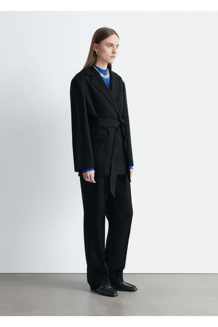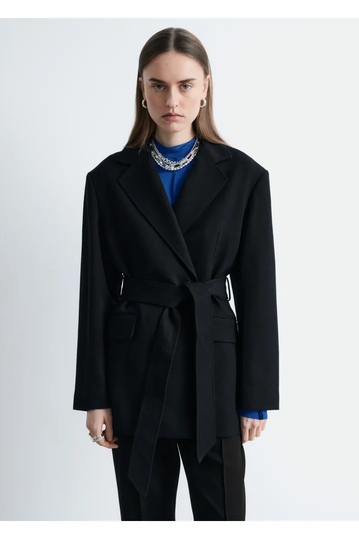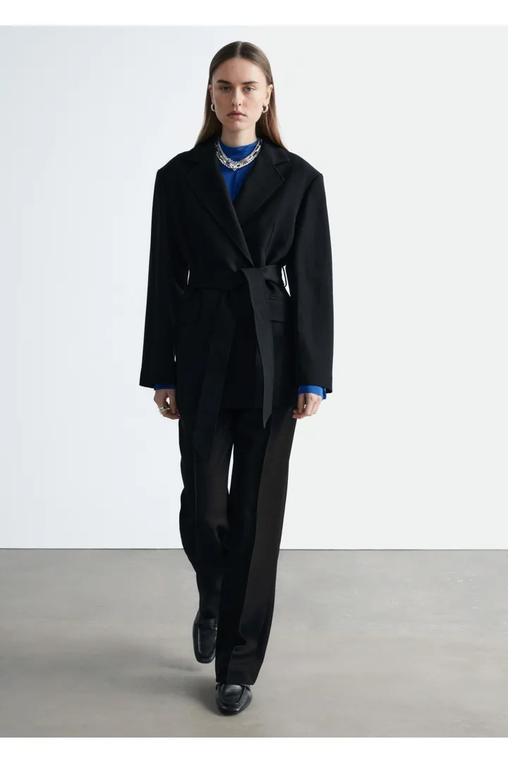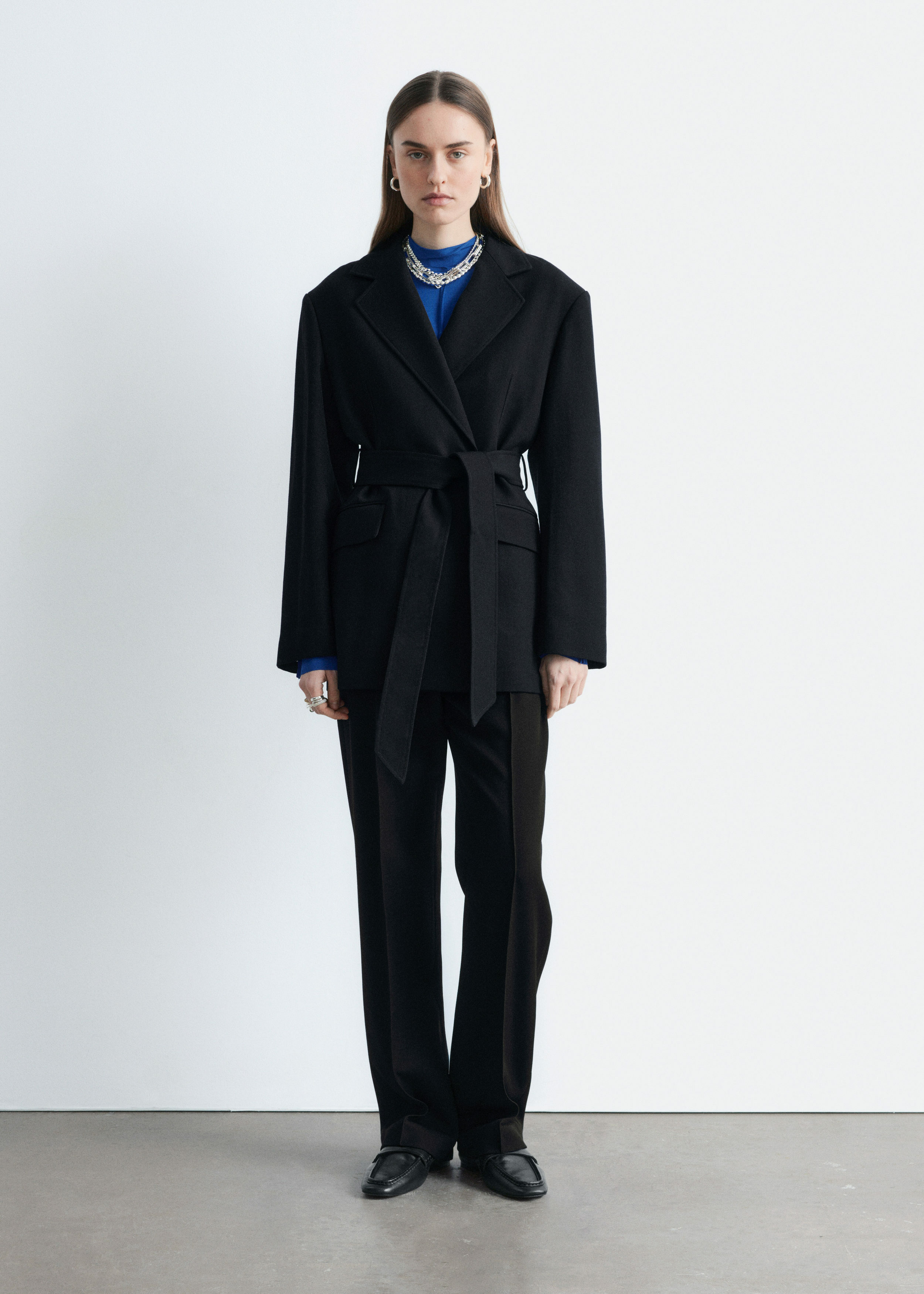 울 혼방 소재로 제작된 블레이저예요. 스트레이트 실루엣과 허리를 강조해 연출할 수 있는 타이 벨트가 특징이랍니다. 노치 라펠, 그리고 앞면의 단추와 웰트 포켓이 자리해 있어요.