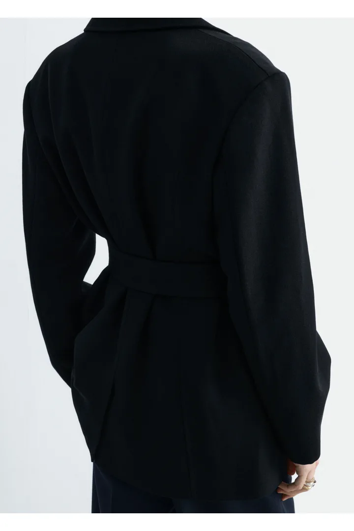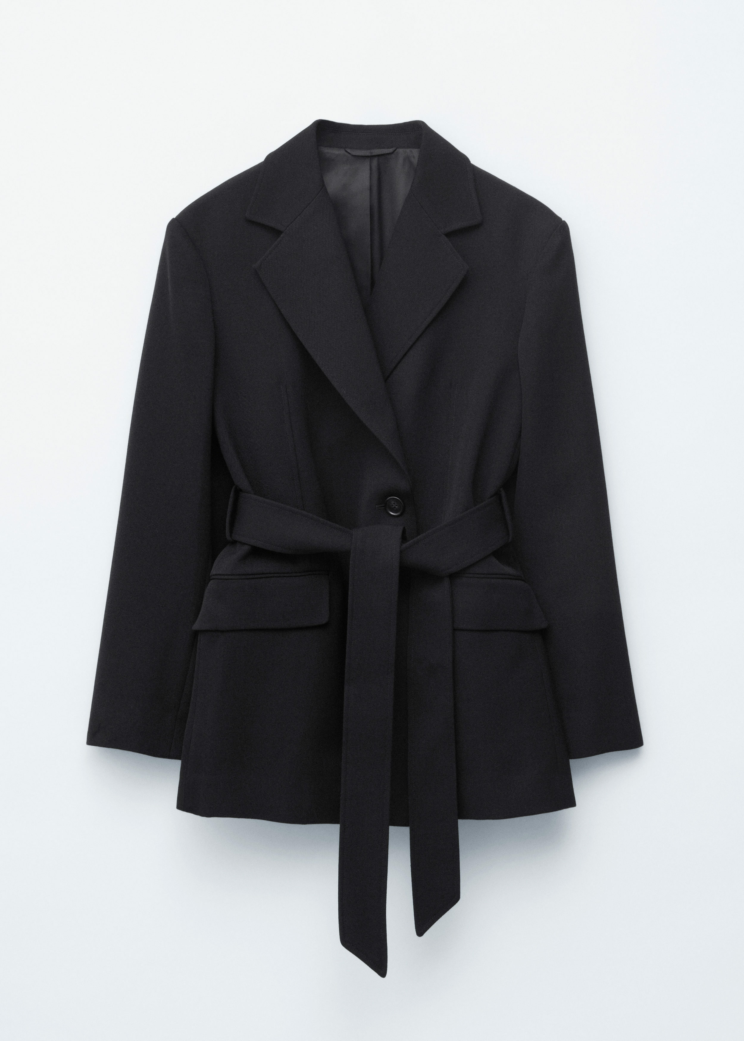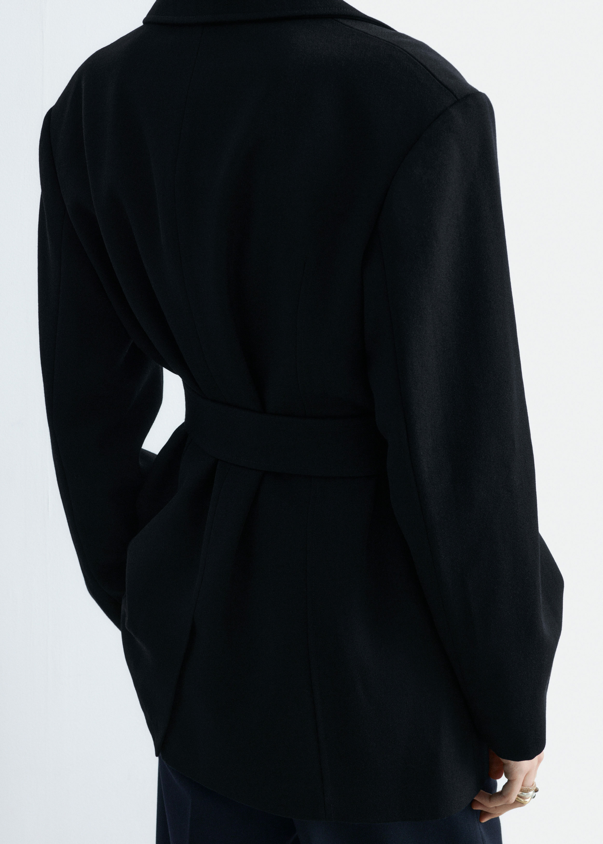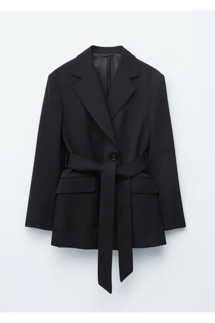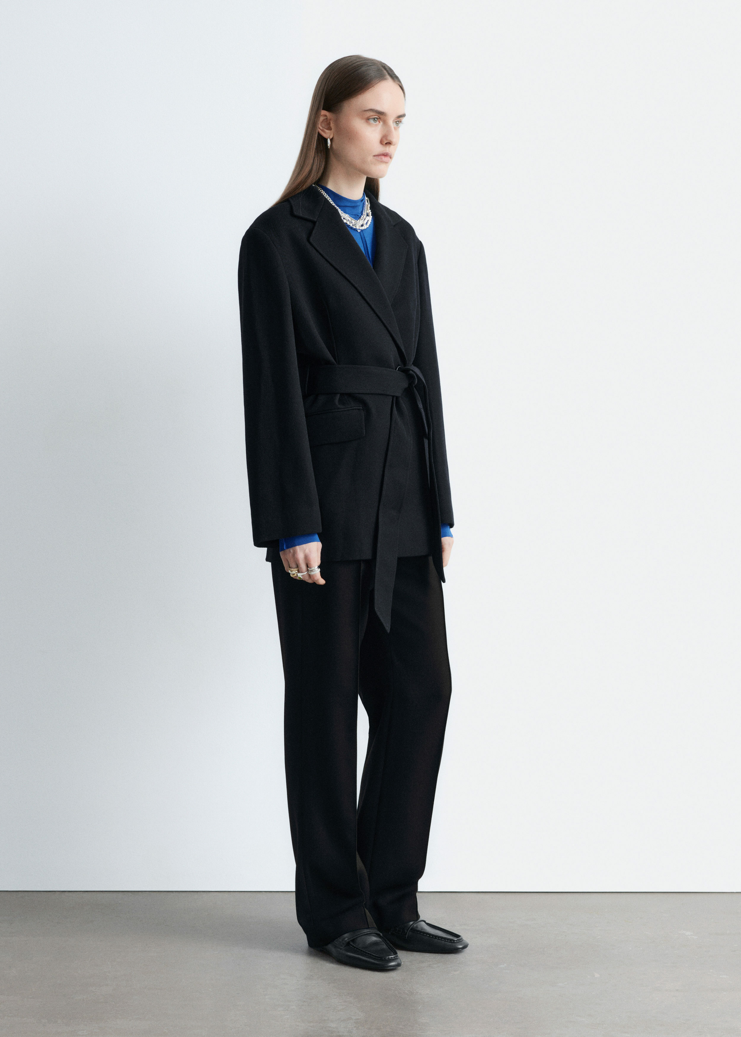 울 혼방 소재로 제작된 블레이저예요. 스트레이트 실루엣과 허리를 강조해 연출할 수 있는 타이 벨트가 특징이랍니다. 노치 라펠, 그리고 앞면의 단추와 웰트 포켓이 자리해 있어요.