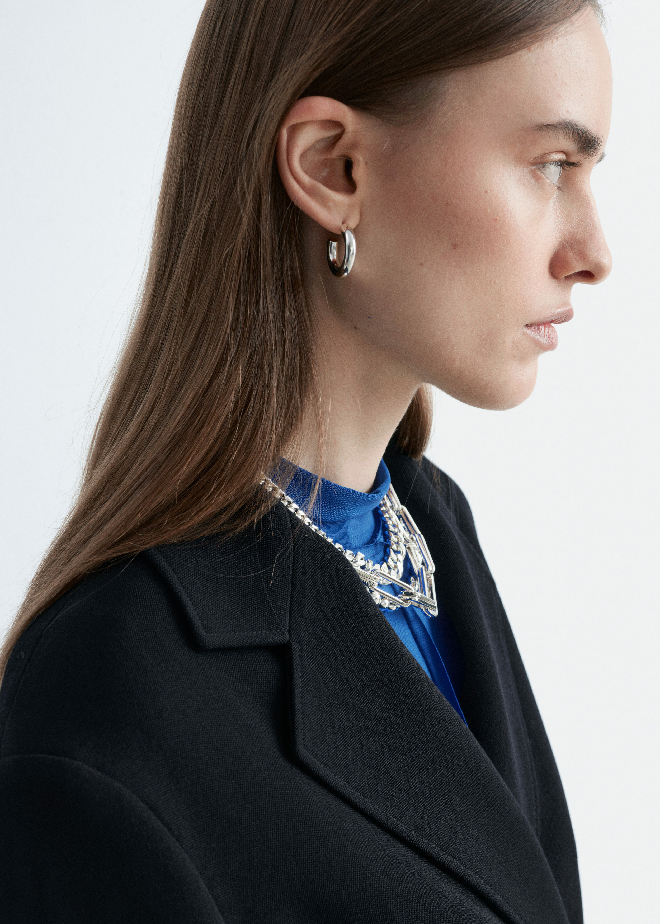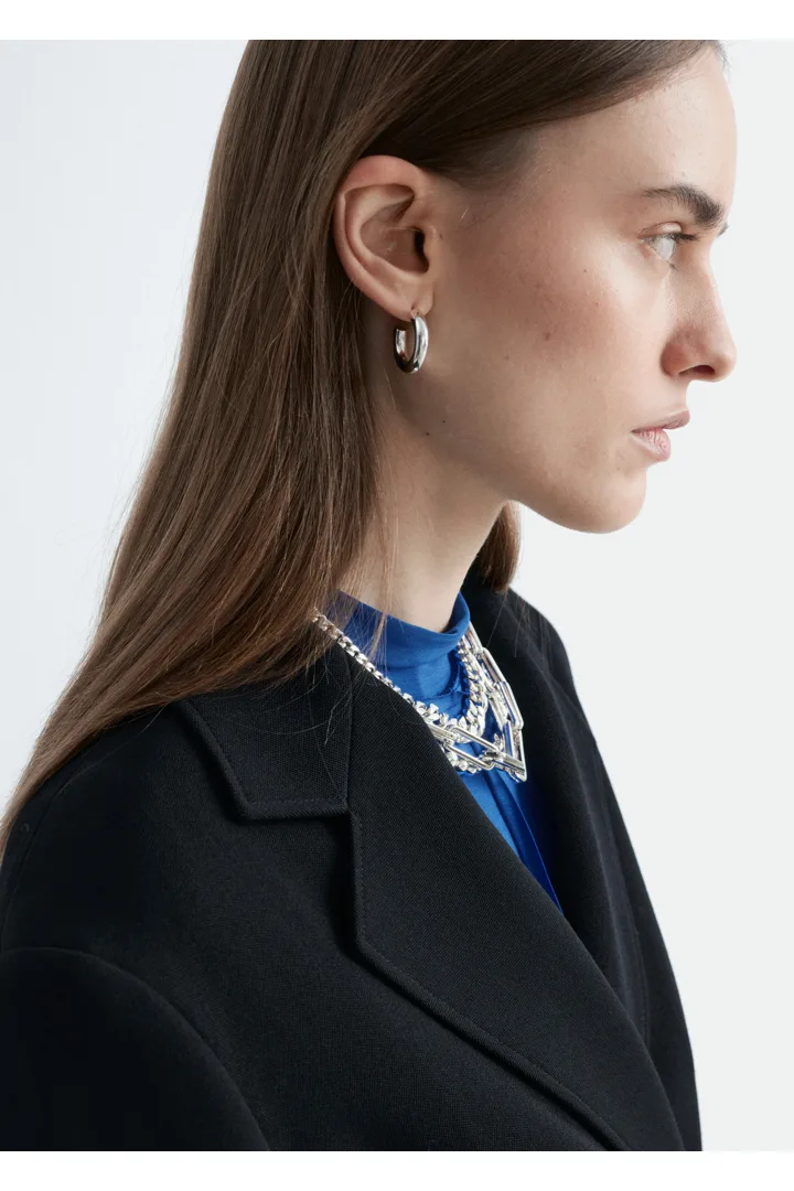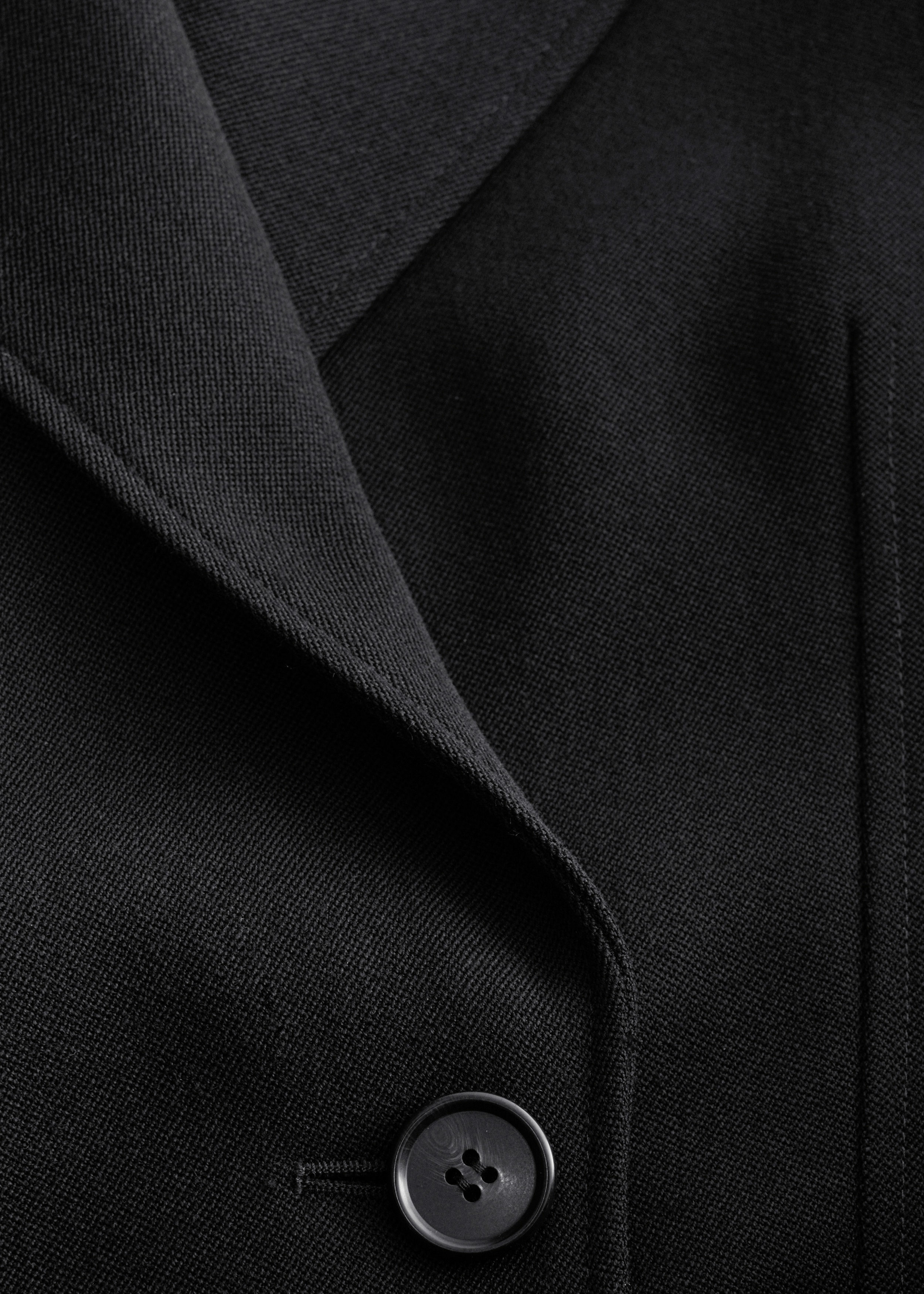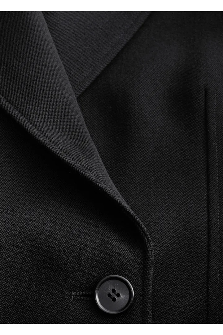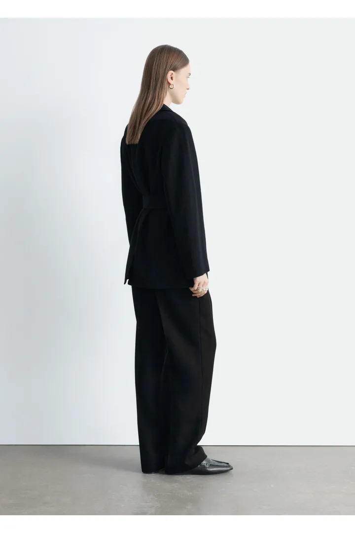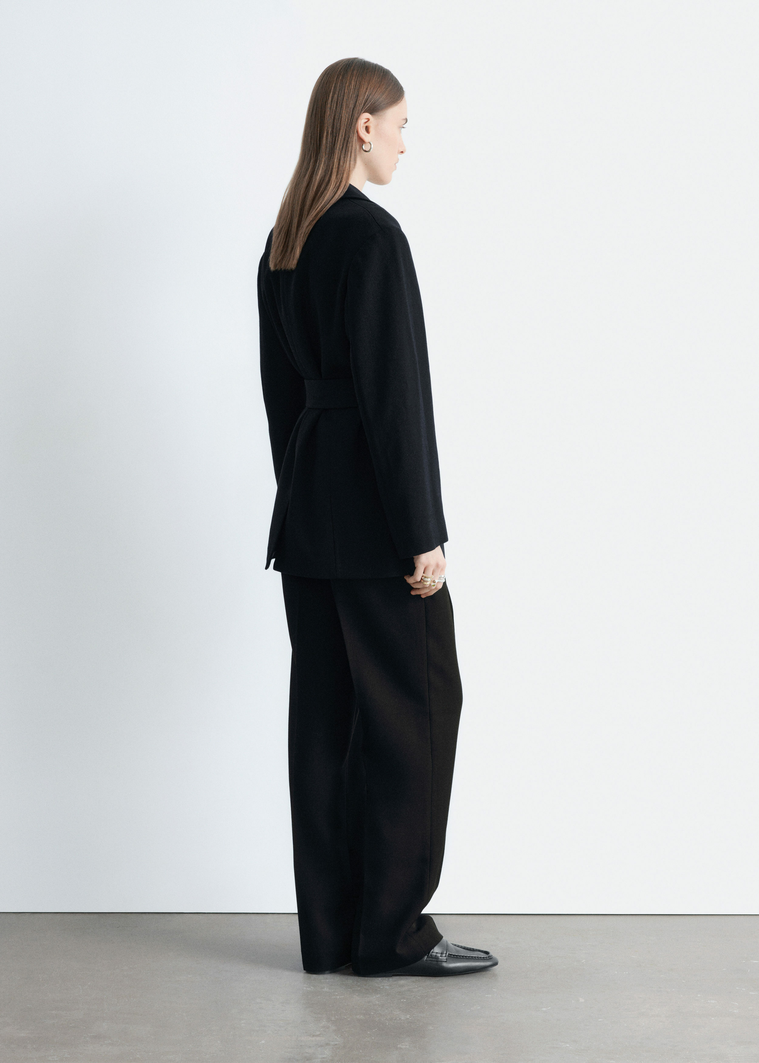 울 혼방 소재로 제작된 블레이저예요. 스트레이트 실루엣과 허리를 강조해 연출할 수 있는 타이 벨트가 특징이랍니다. 노치 라펠, 그리고 앞면의 단추와 웰트 포켓이 자리해 있어요.