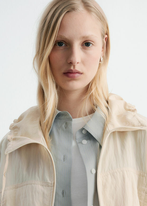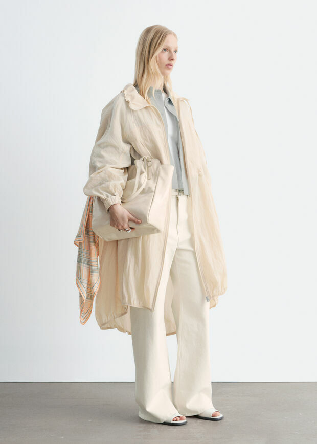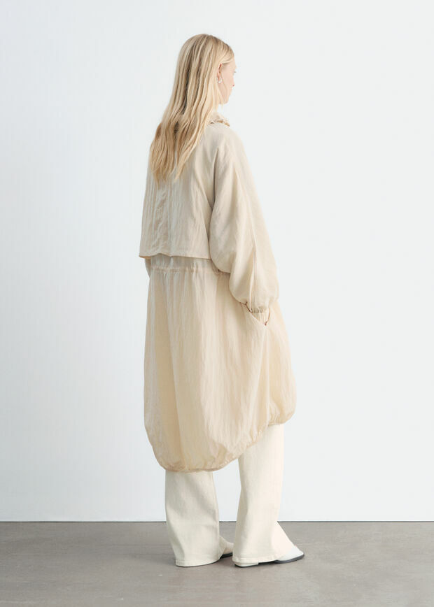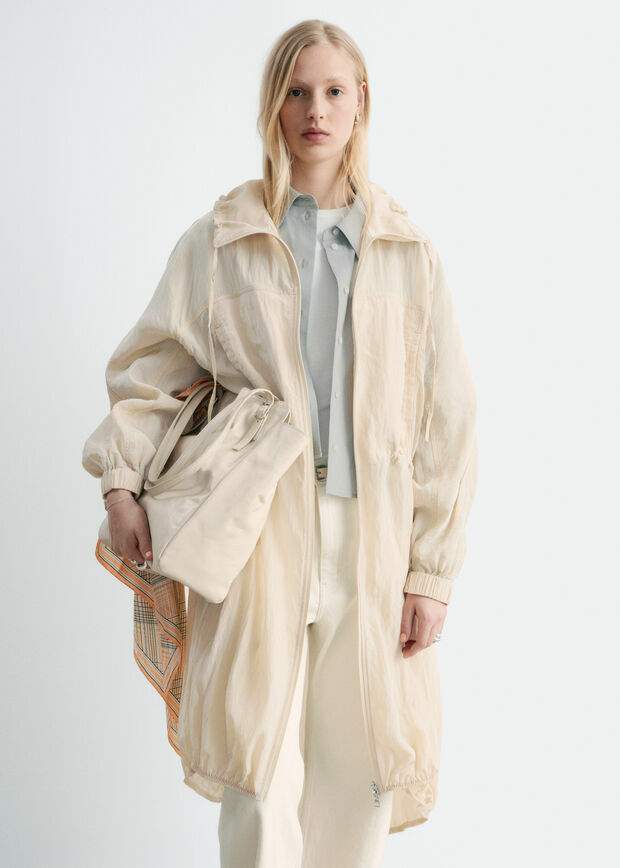매력적인 디테일로 가득한 파카예요. 무릎 아래까지 오는 실루엣과 유려한 비스코스 혼방 소재로 탄생했답니다. 드로스트링이 달린 퍼넬 카라, 허리의 메탈 스토퍼, 실루엣을 강조하는 엘라스틱 밑단, 그리고 절제된 스톰 실드 디자인이 멋스러움을 더해주어요. 측면의 웰트 포켓과 투웨이 지퍼 여밈이 자리해 있답니다.