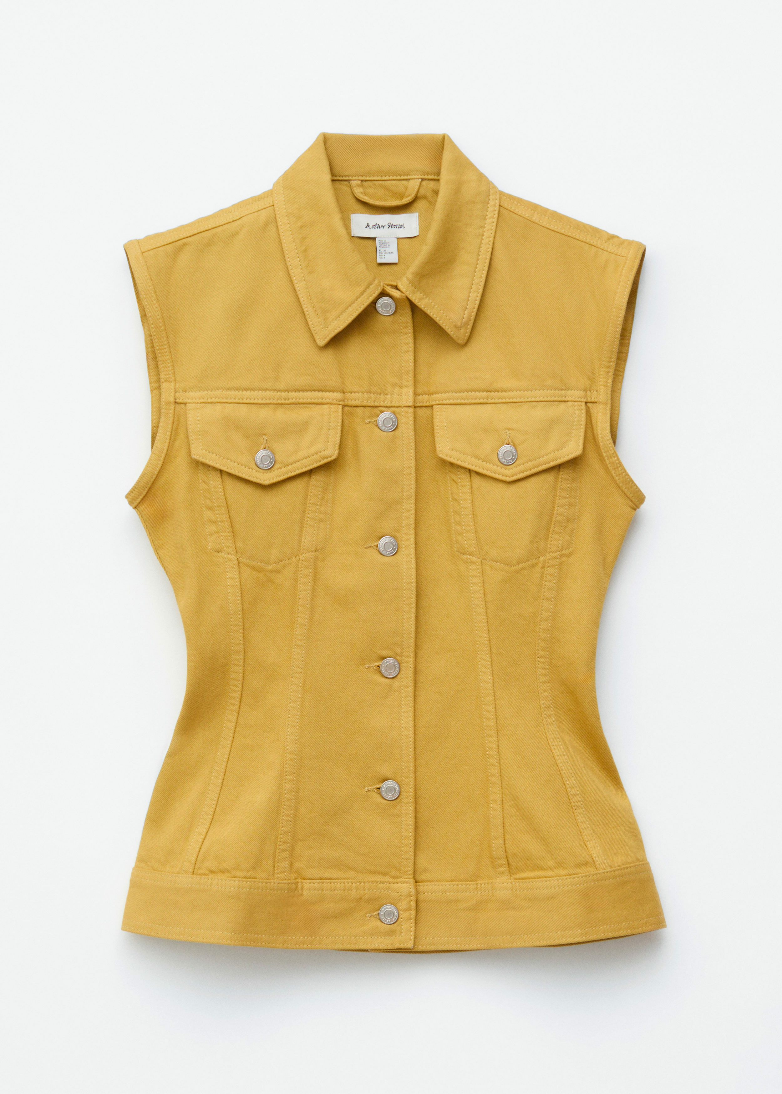 견고한 데님 소재로 탄생한 베스트예요. 핏 되는 실루엣이 은은한 구조감을 연출한답니다. 탑스티치 솔기, 가슴에 2개의 포켓, 클래식한 섕크 버튼이 자리해 있어요. 단독으로 입거나, 또는 탑이나 셔츠 위에 다양하게 레이어링해 보세요.