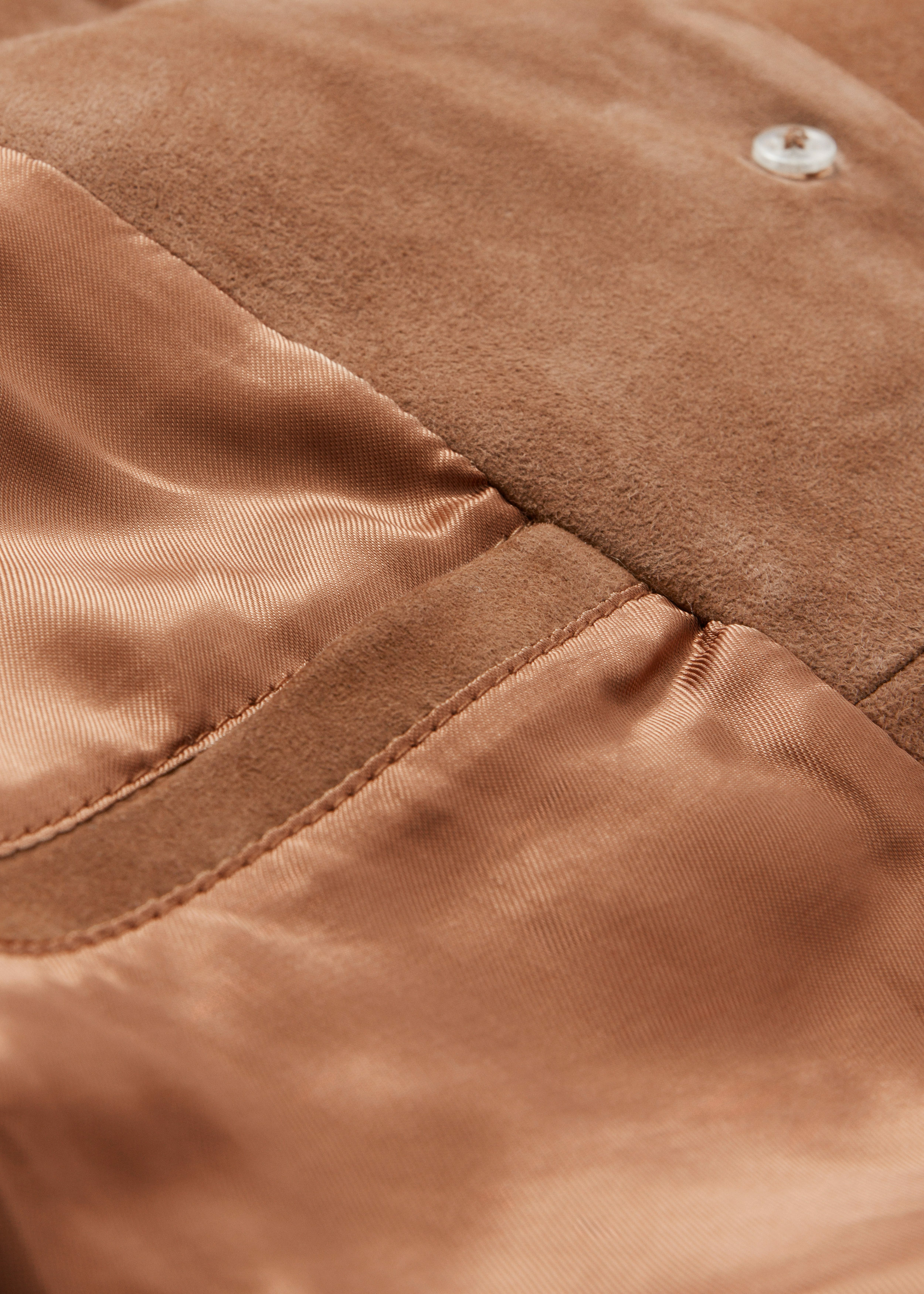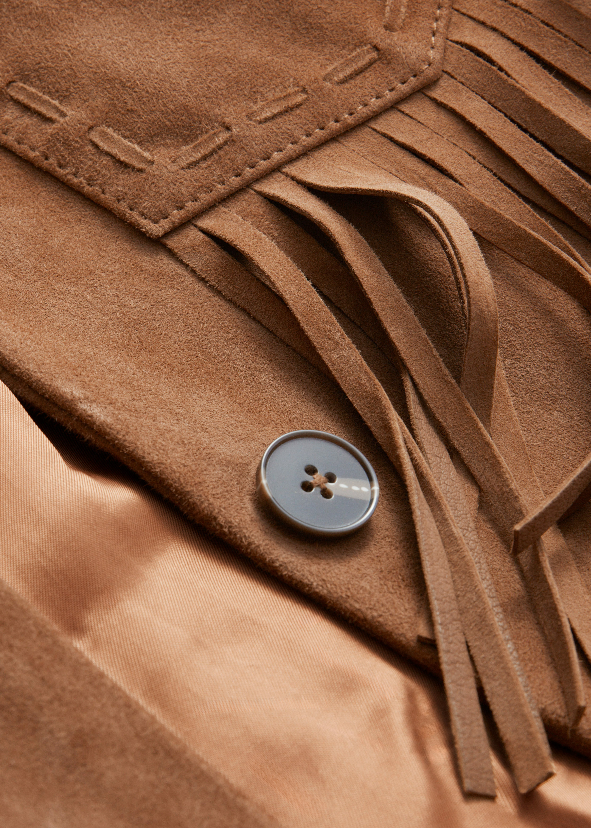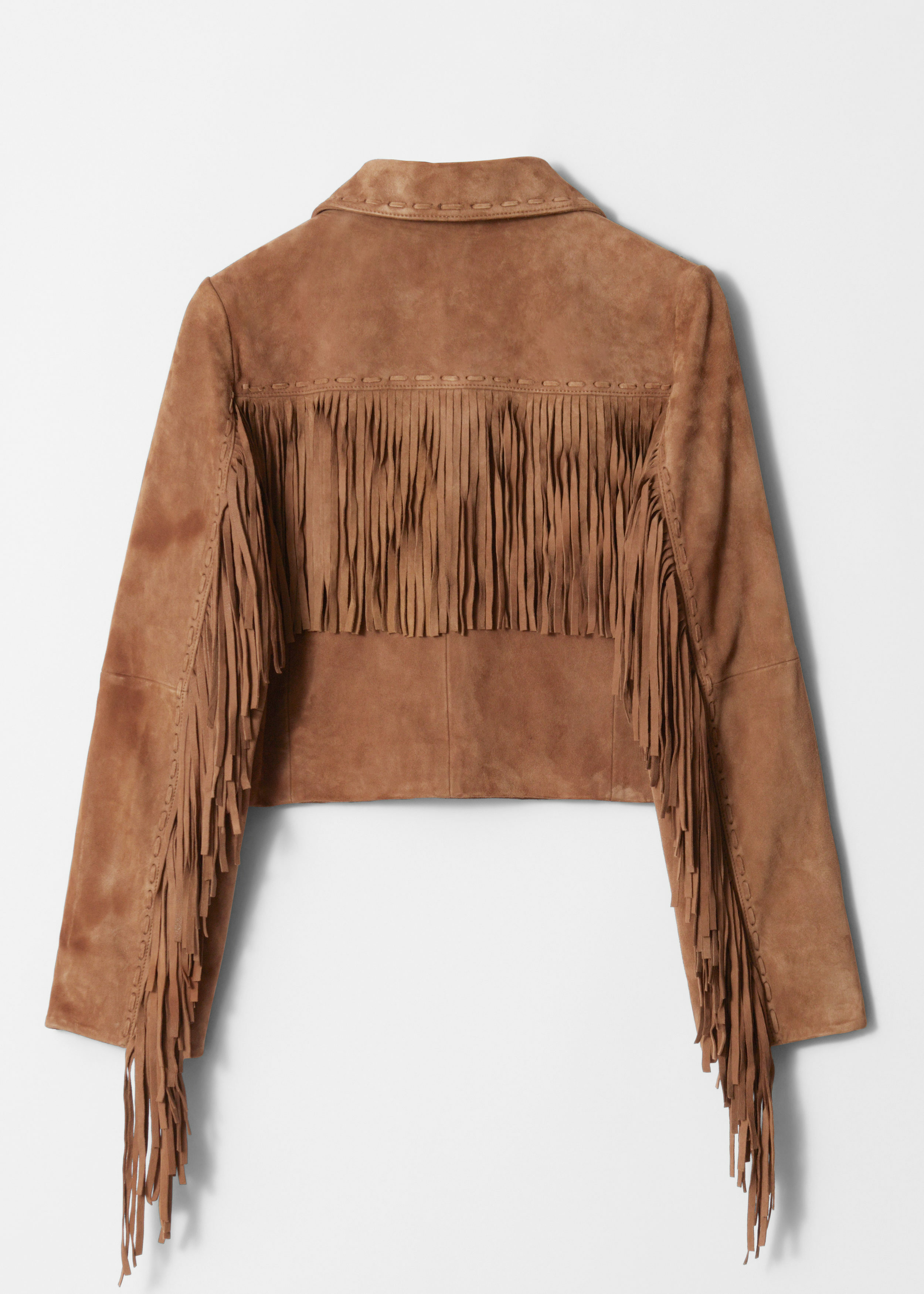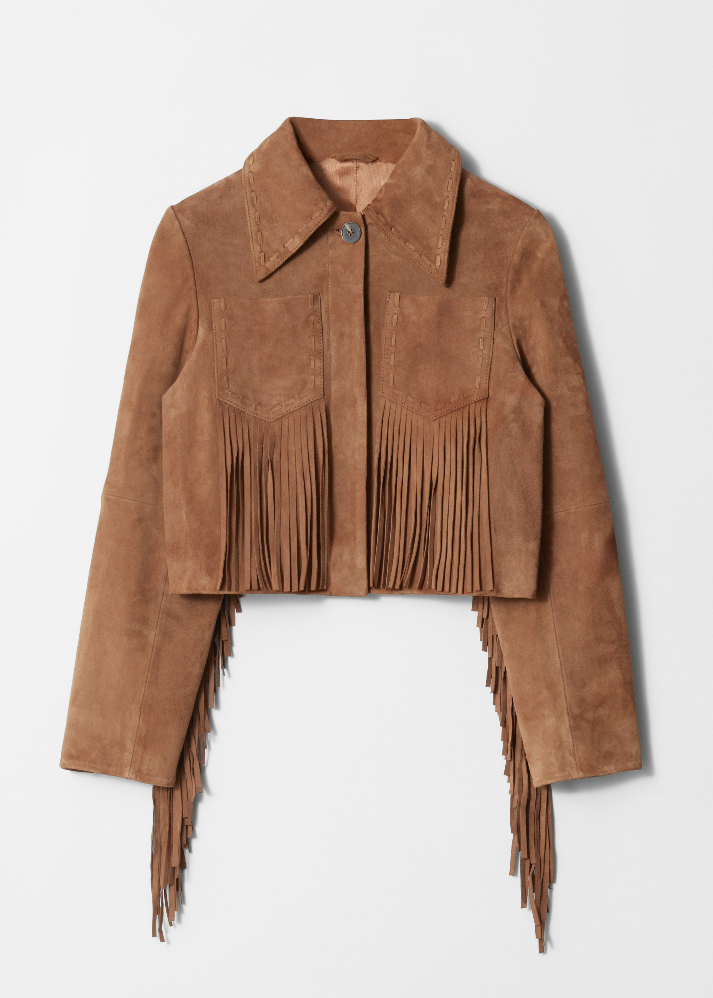 크롭 실루엣의 스웨이드 자켓이에요. 긴 장식 프린지, 너비감 있는 클래식 카라, 탑스티치 엣지, 그리고 앞면에 2개의 패치 포켓이 자리해 있어요.