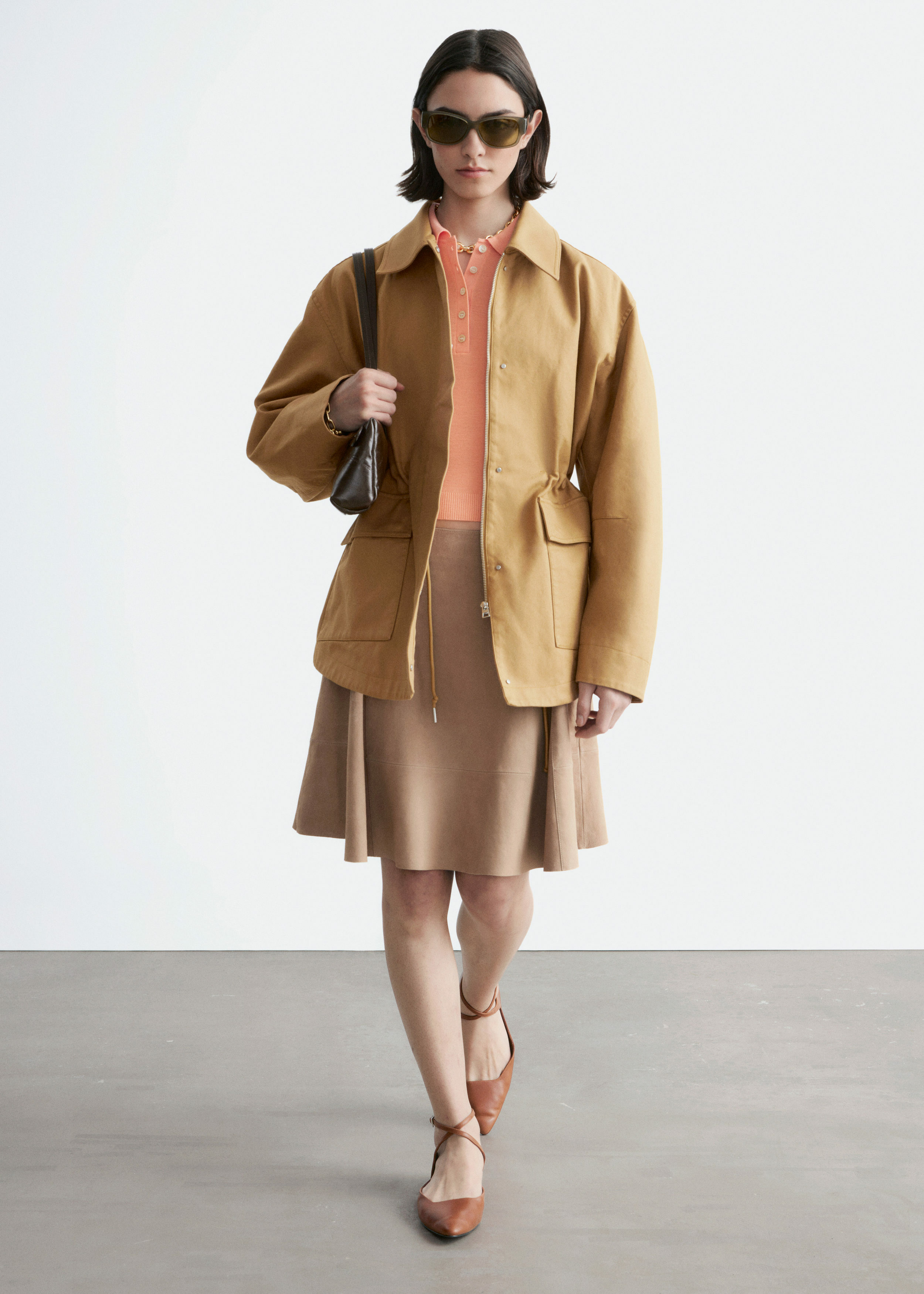 탄탄한 트윌 코튼 소재의 오버사이즈 자켓이에요. 클래식 카라, 2개의 큼직한 패치 포켓, 컨실드 지퍼 플래킷, 프레스 단추가 자리해 있으며 허리의 이너 드로스트링을 조여 구조적인 실루엣을 연출할 수 있답니다.