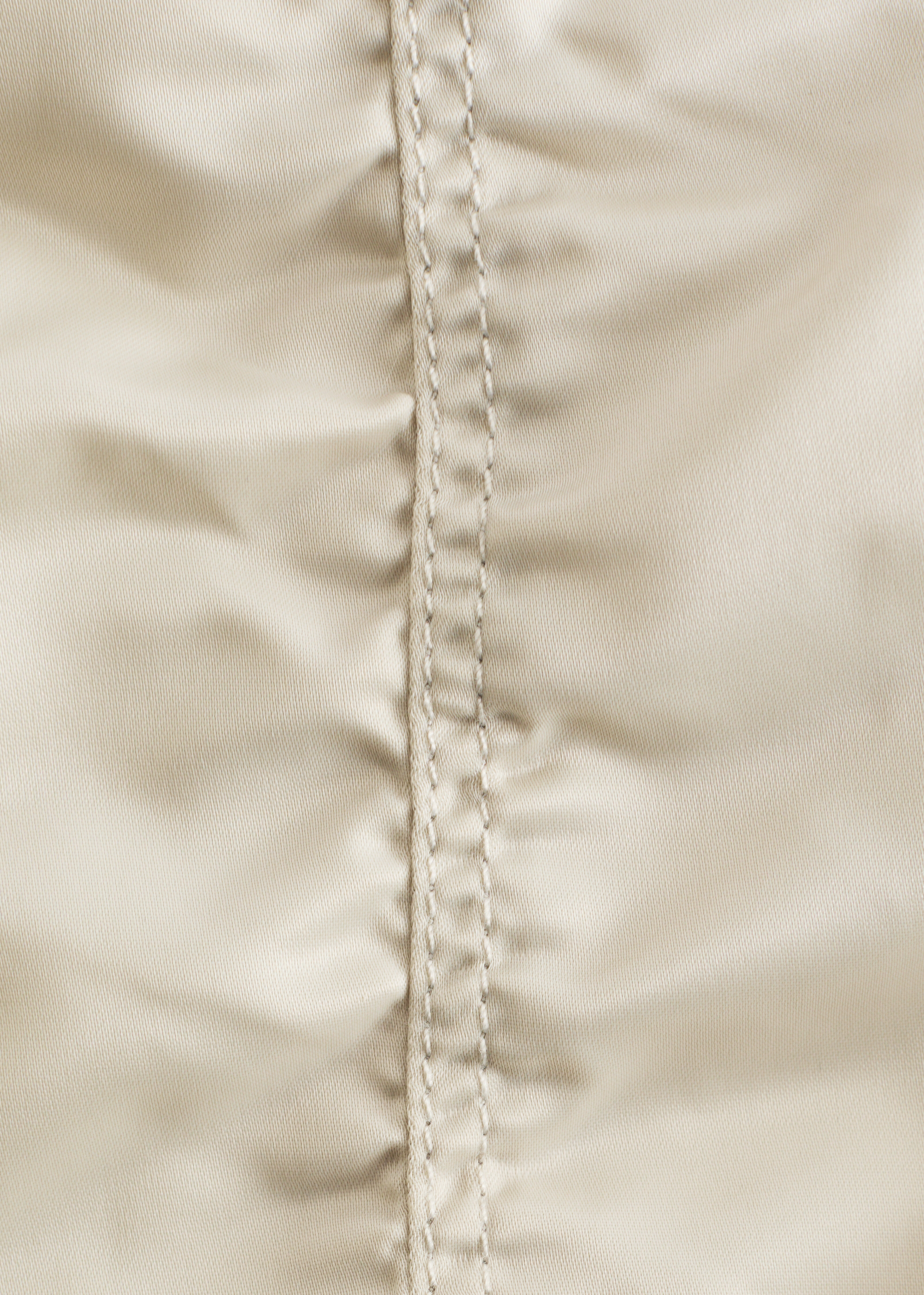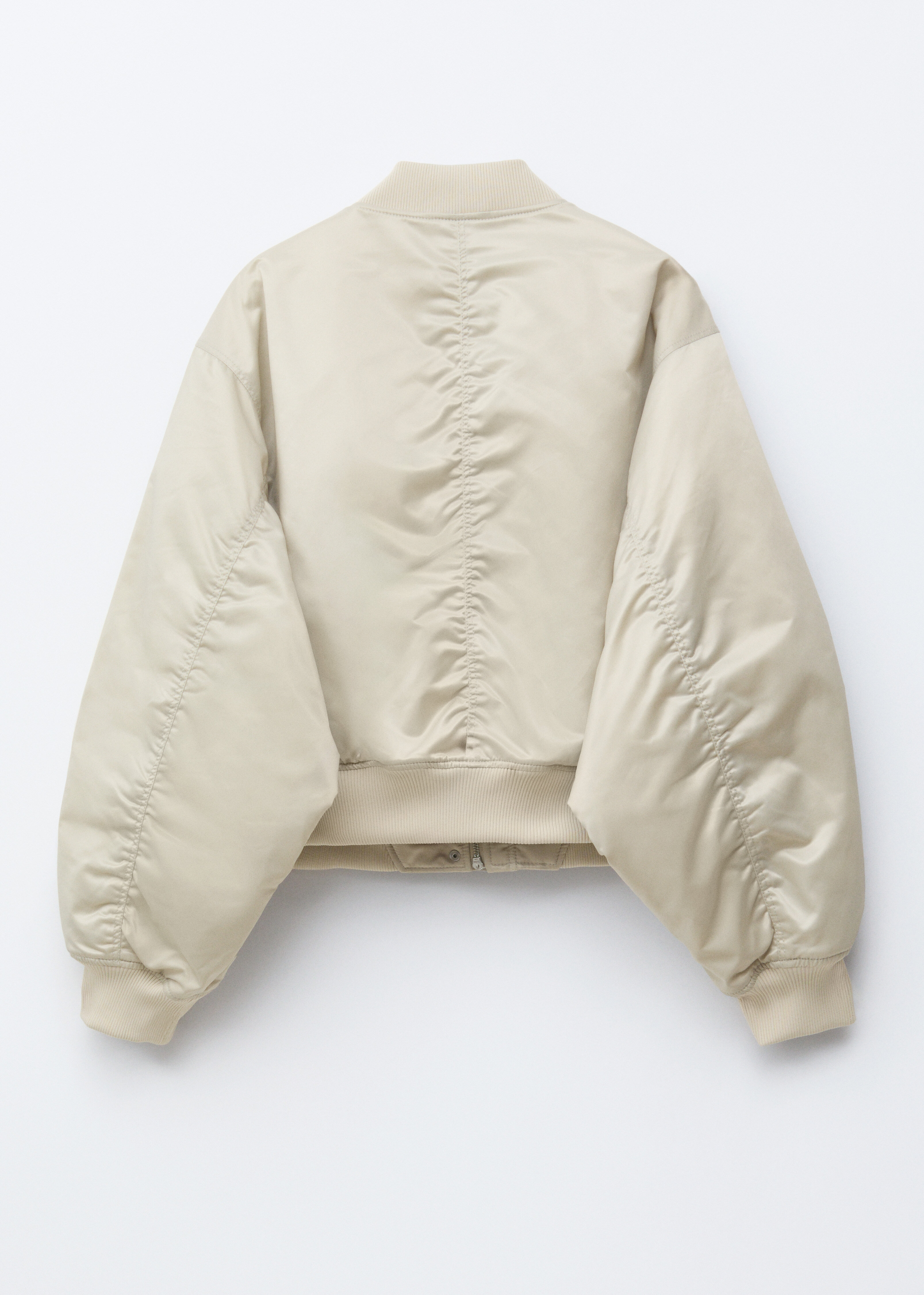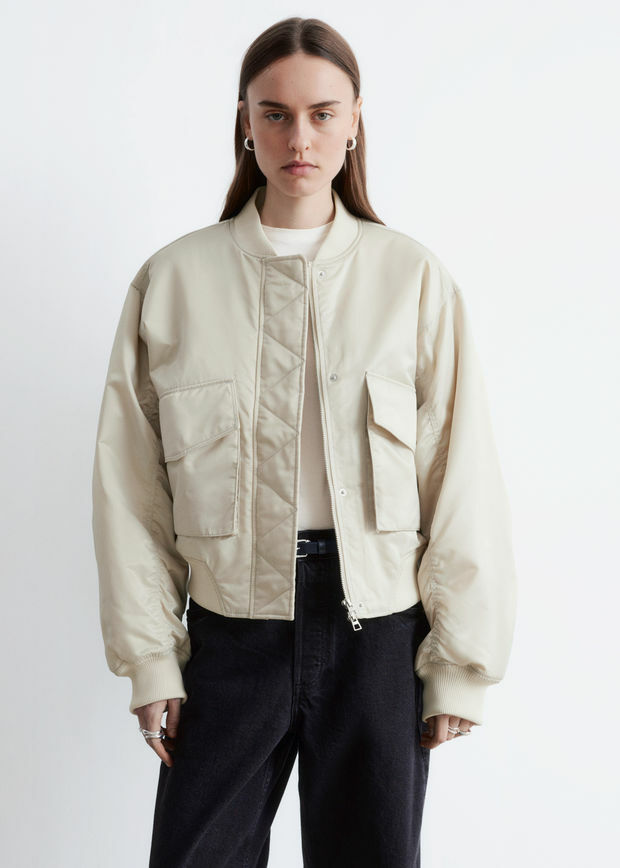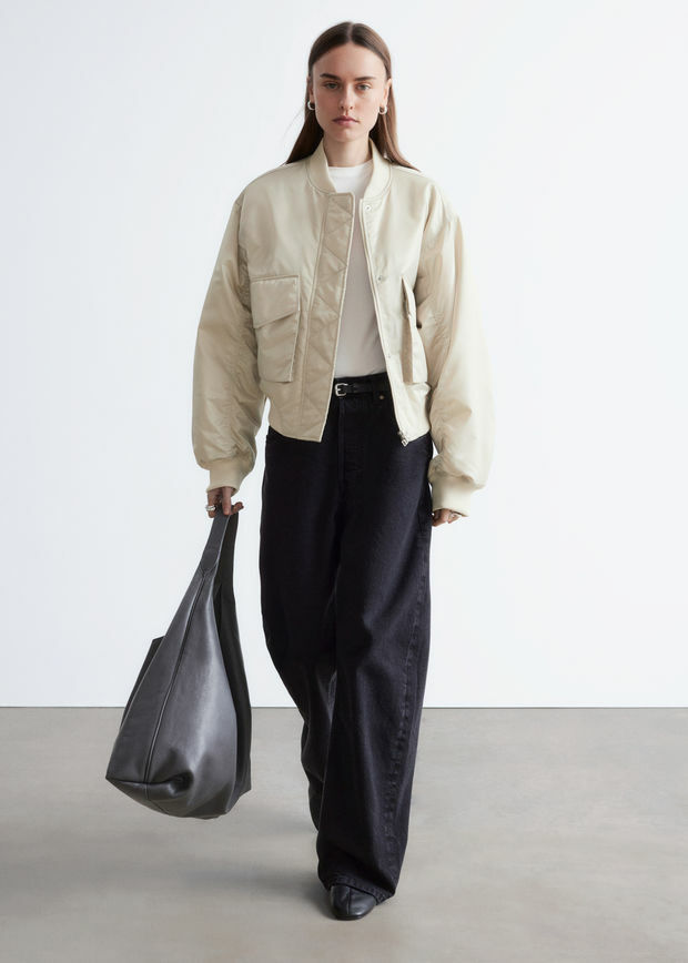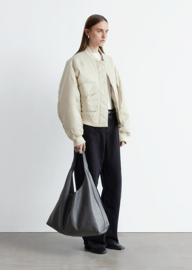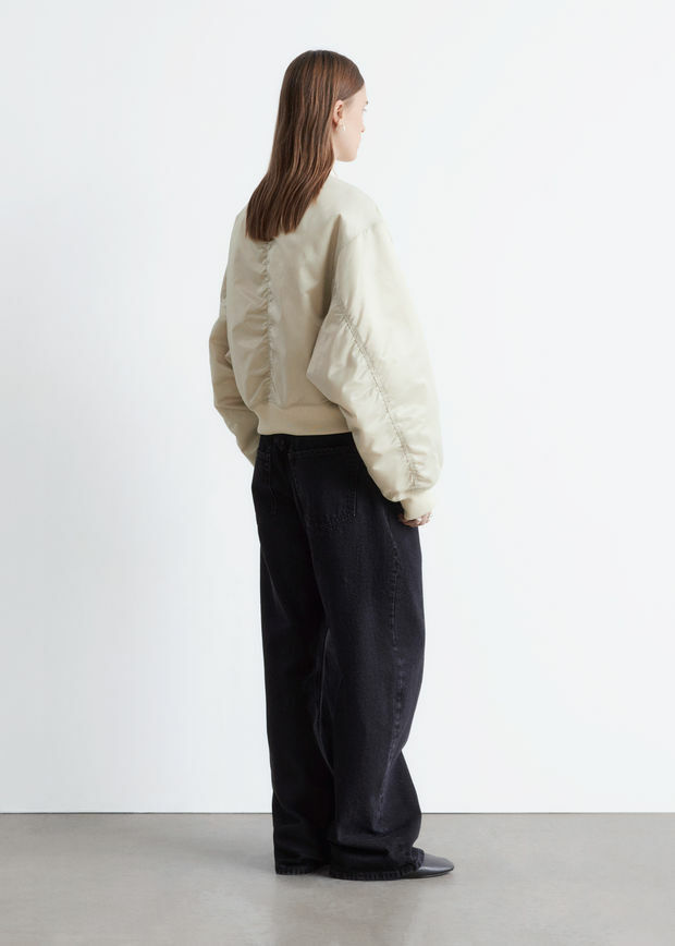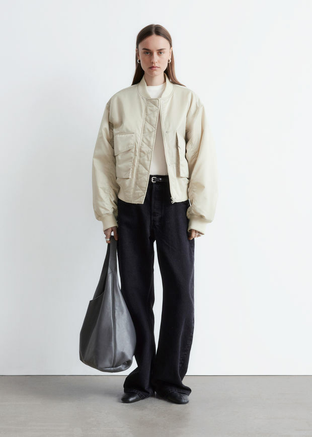 은은한 광택이 도는 부드러운 소재로 탄생한 패디드 보머 자켓이에요. 박시한 실루엣과 볼륨감을 더하는 패딩 디자인이 멋스럽답니다. 립 트리밍, 뒷면과 슬리브의 은은한 주름 디테일, 앞면에 2개의 큼직한 패치 포켓이 특징이며 컨실드 플래킷, 지그재그 탑스티치 솔기 안쪽의 컨실드 투웨이 지퍼, 그리고 프레스 단추가 깔끔한 룩을 연출한답니다.