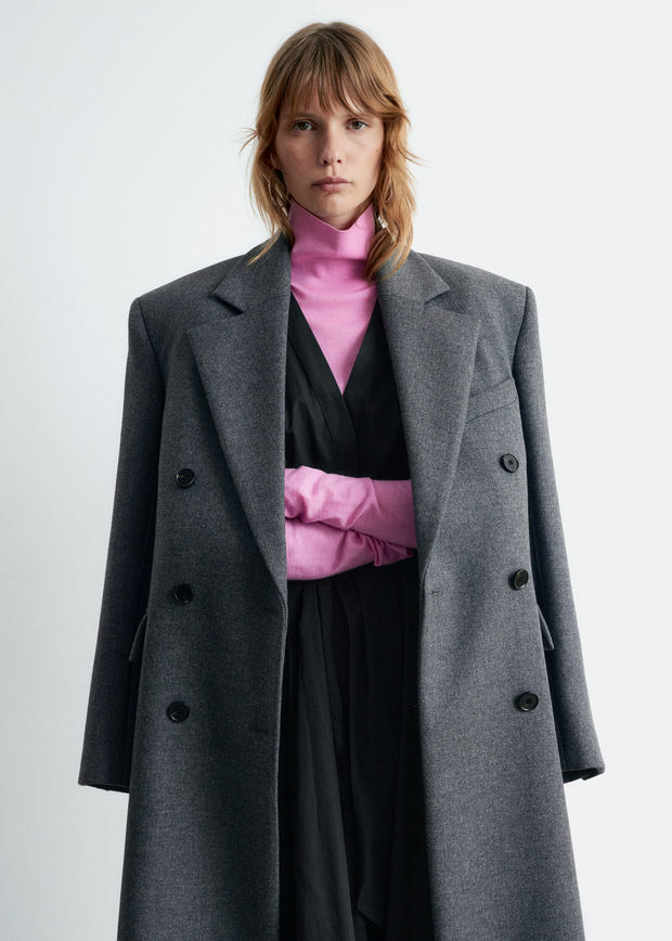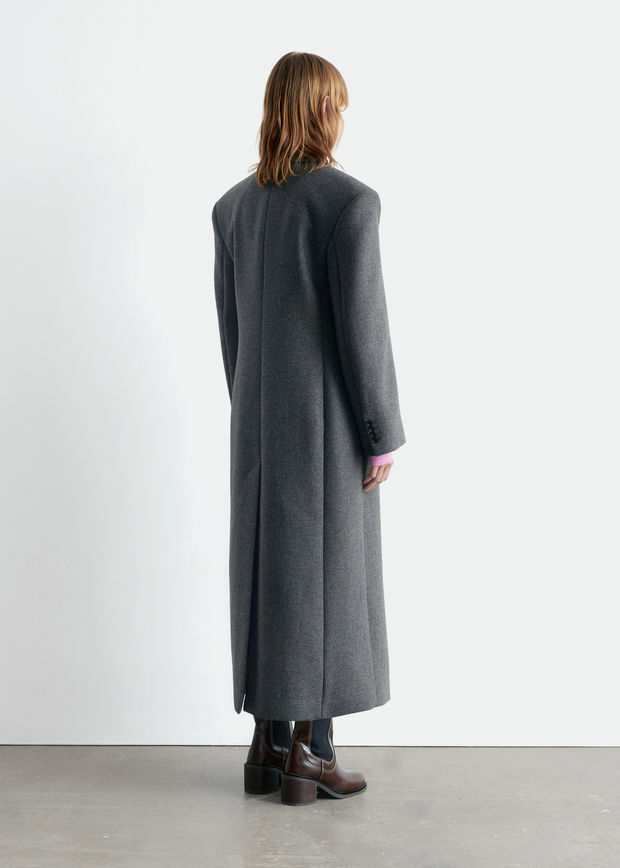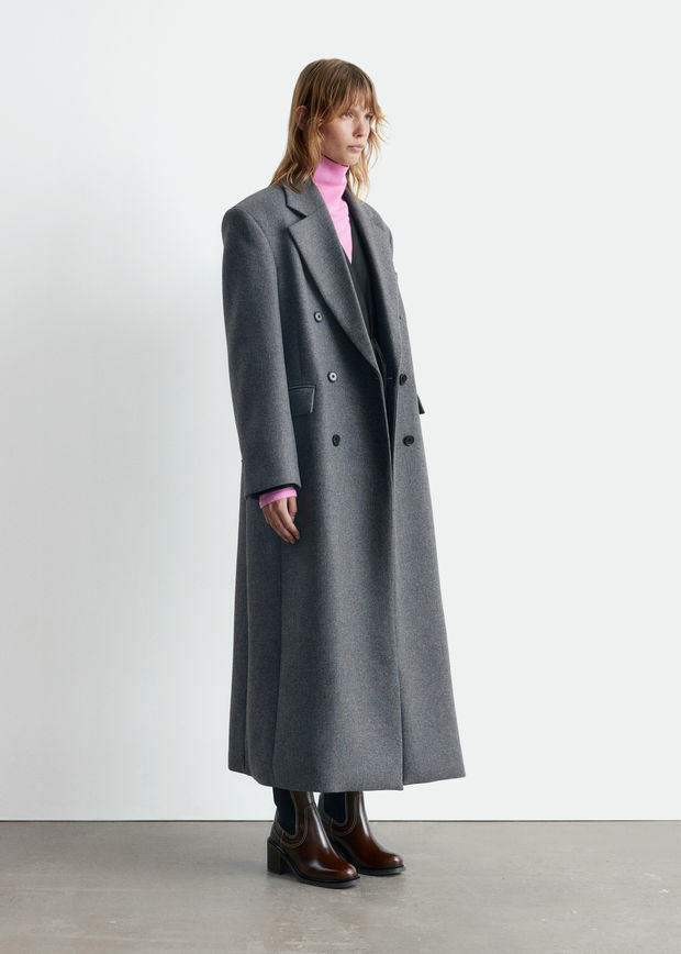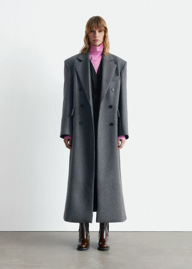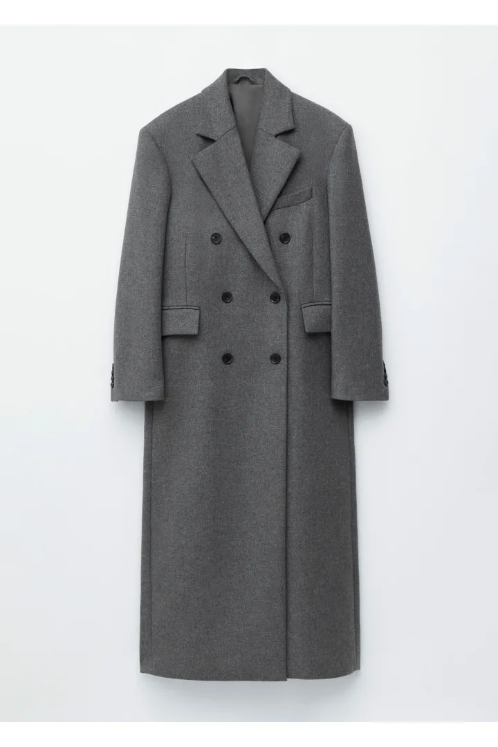 울 혼방 소재의 더블 브레스티드 코트예요. 롱 스트레이트 실루엣과 패디드 숄더가 멋스럽답니다.