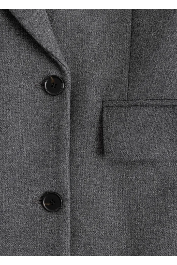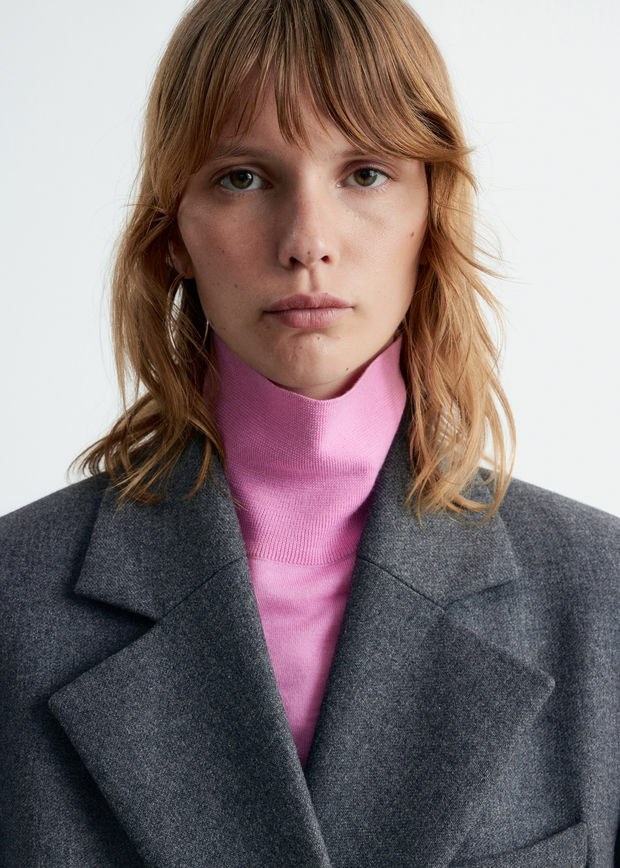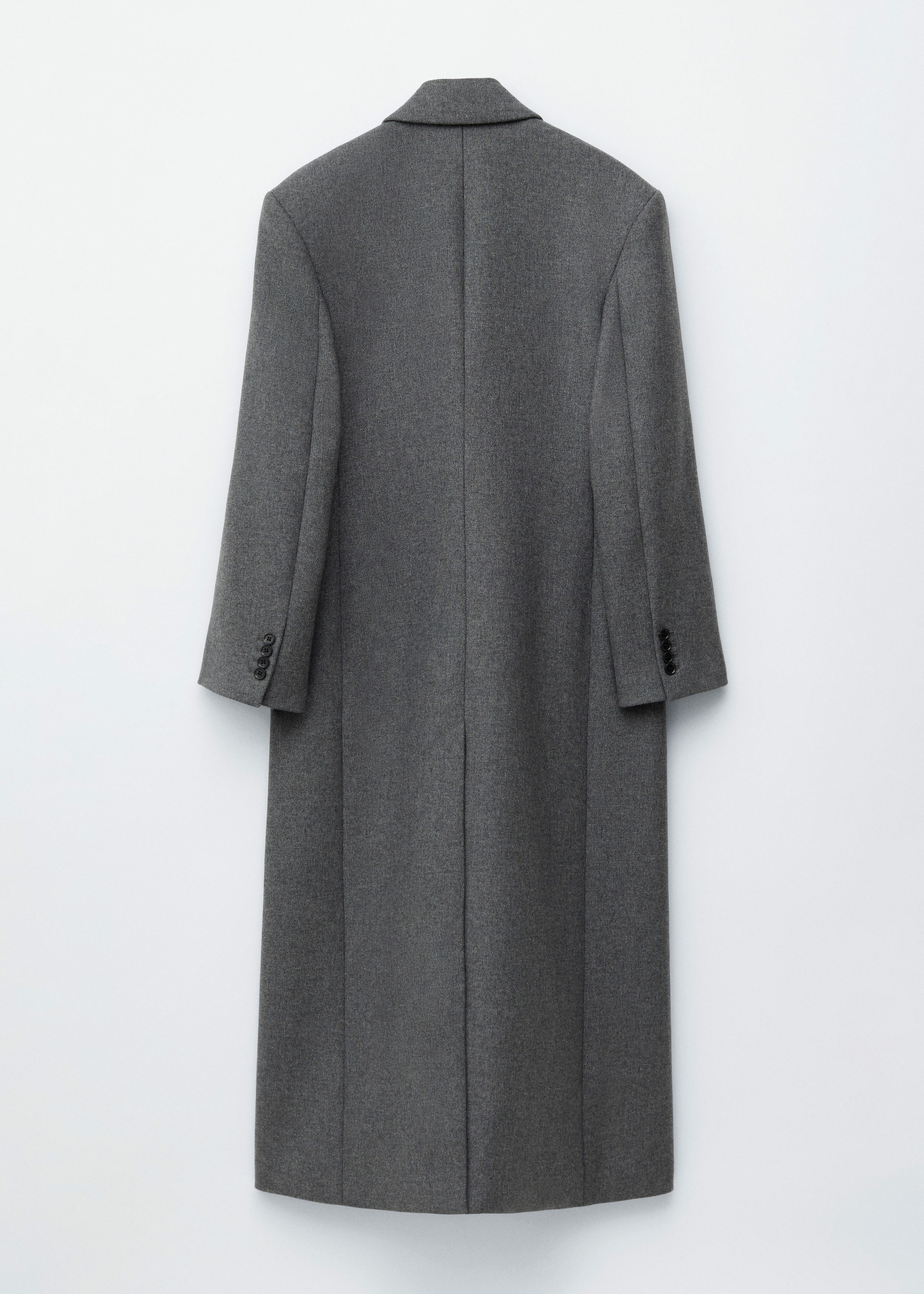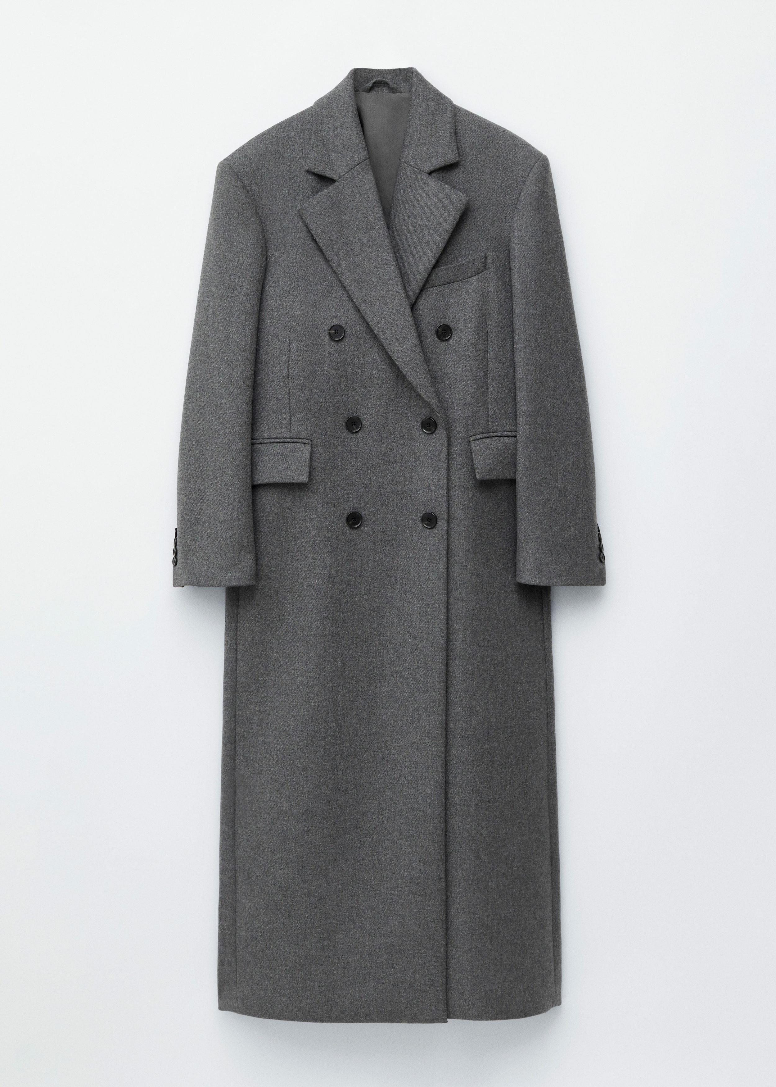 울 혼방 소재의 더블 브레스티드 코트예요. 롱 스트레이트 실루엣과 패디드 숄더가 멋스럽답니다.