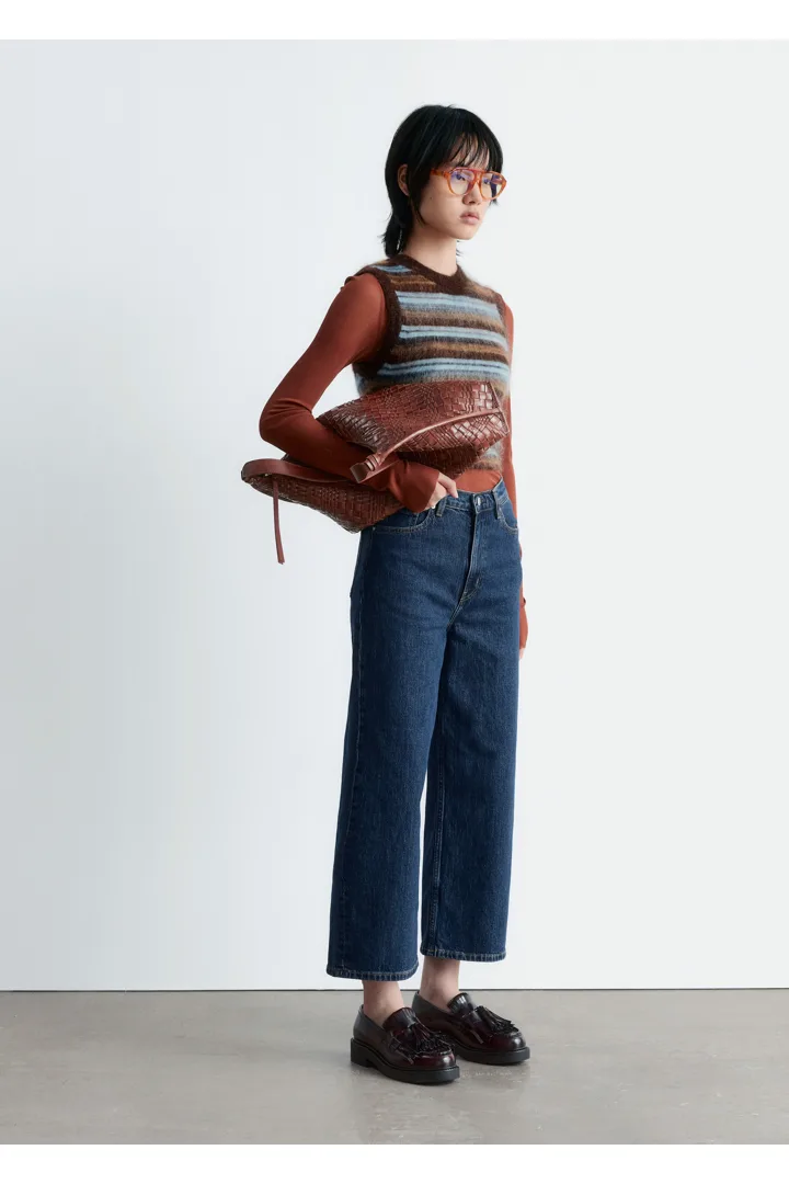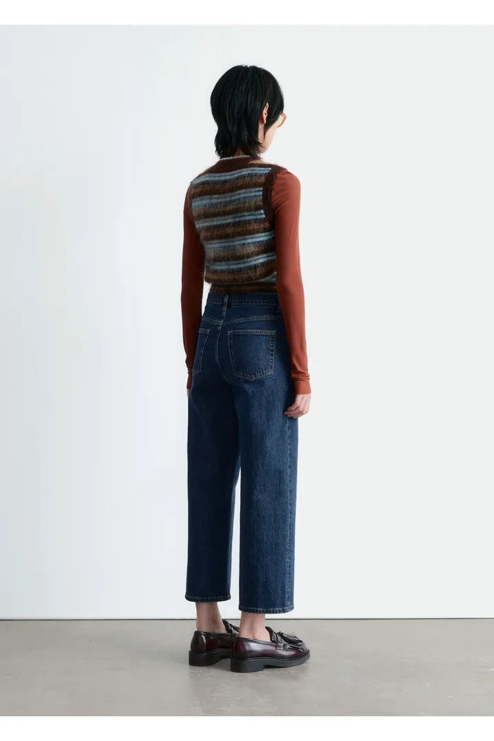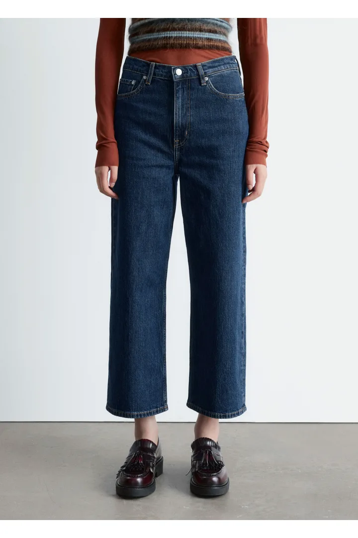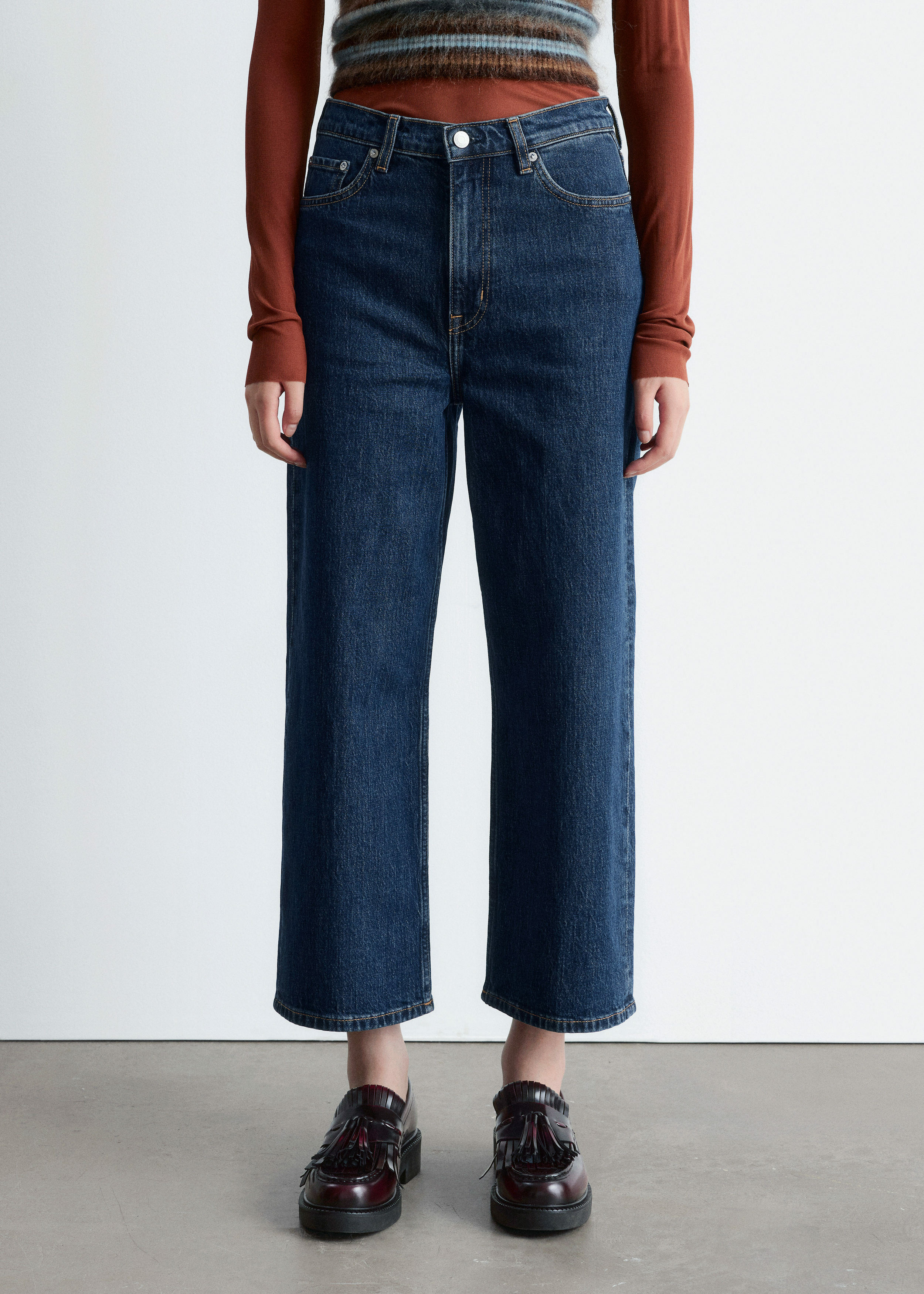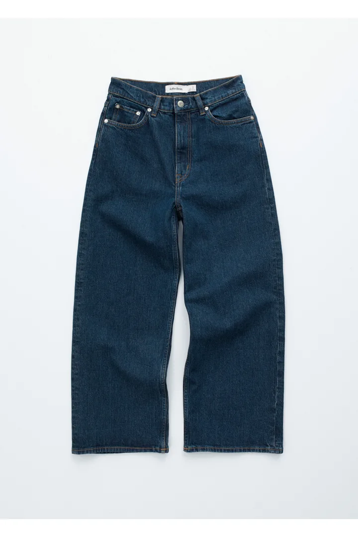 하이 웨이스트의 진이에요. 클래식한 5 포켓 디자인, 그리고 너비감 있는 크롭 레그가 특징이랍니다.