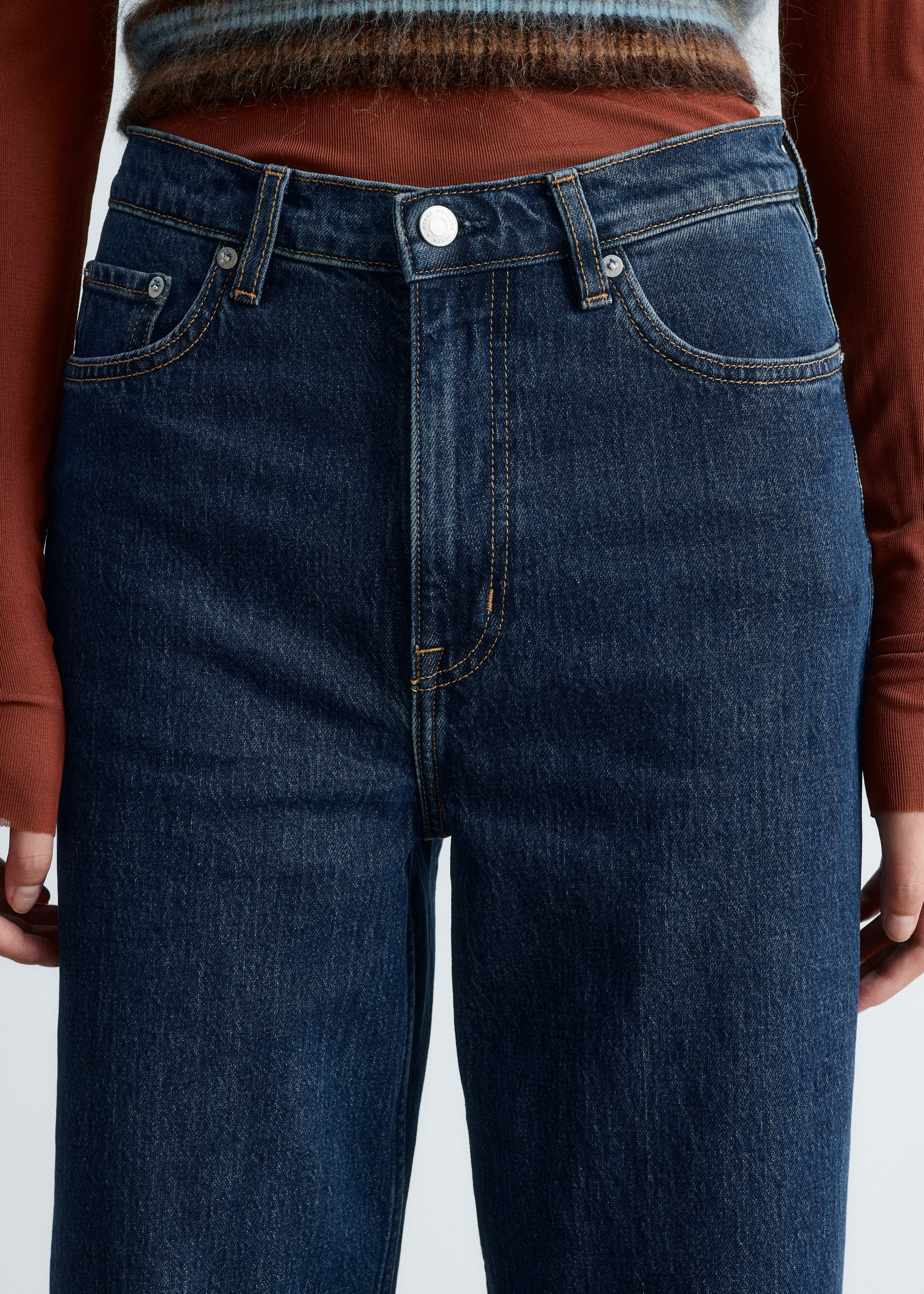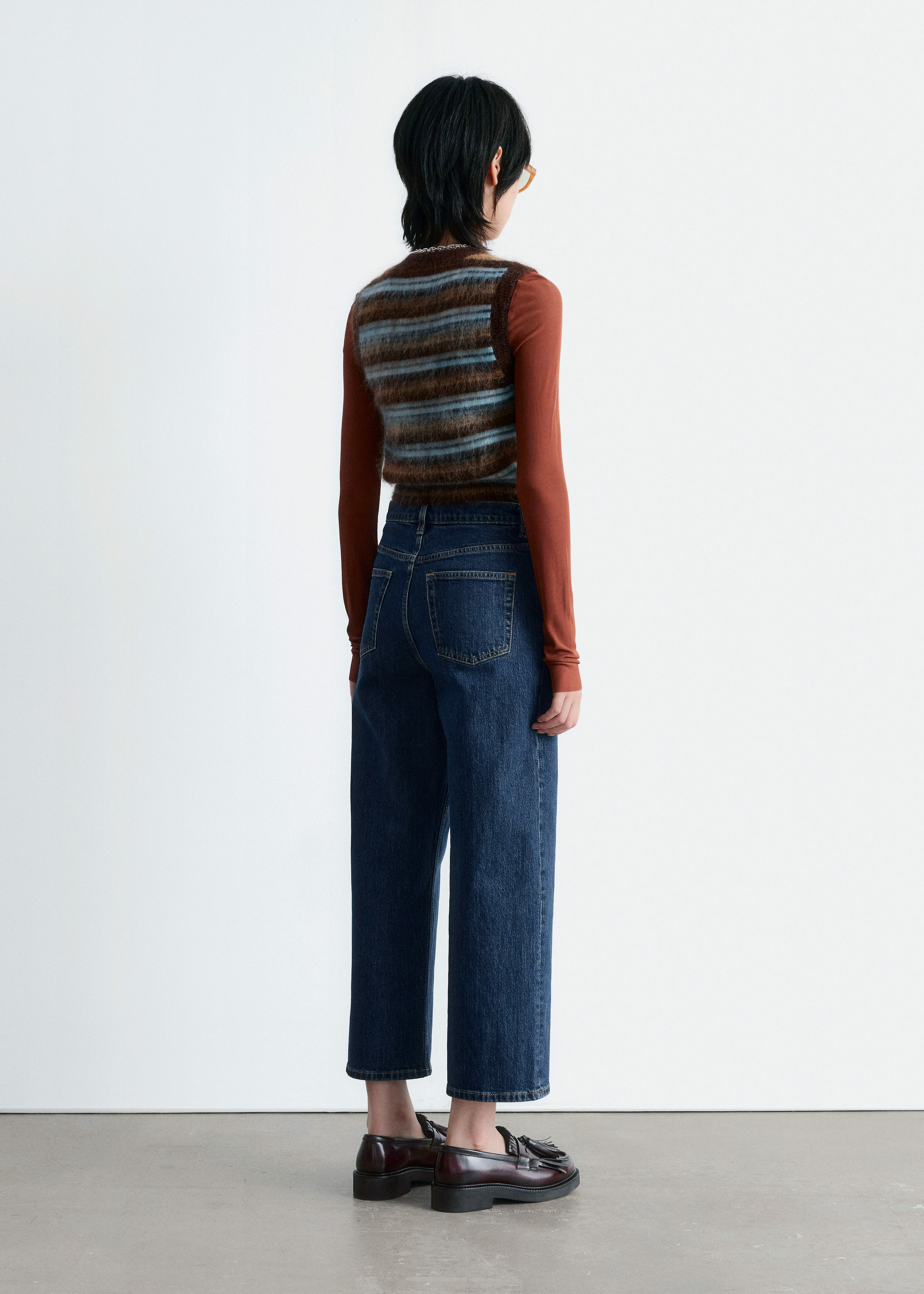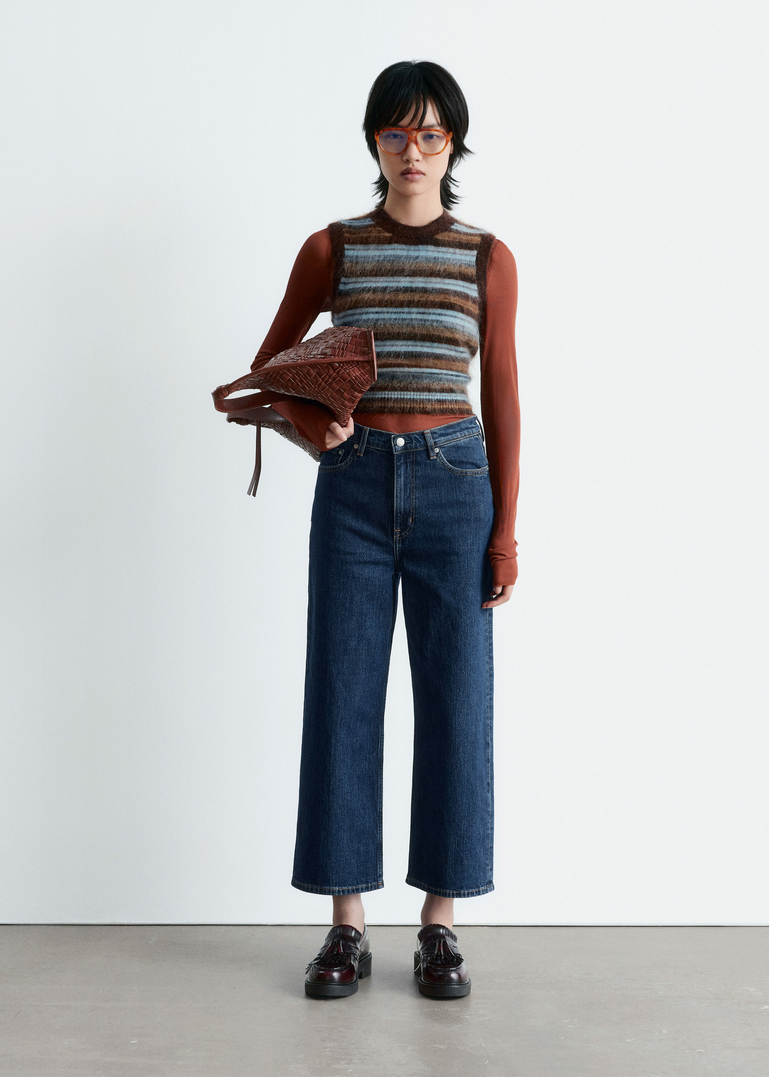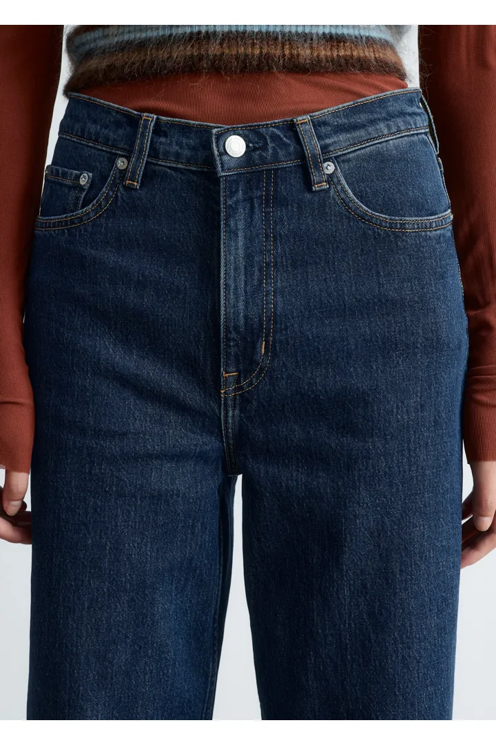 하이 웨이스트의 진이에요. 클래식한 5 포켓 디자인, 그리고 너비감 있는 크롭 레그가 특징이랍니다.