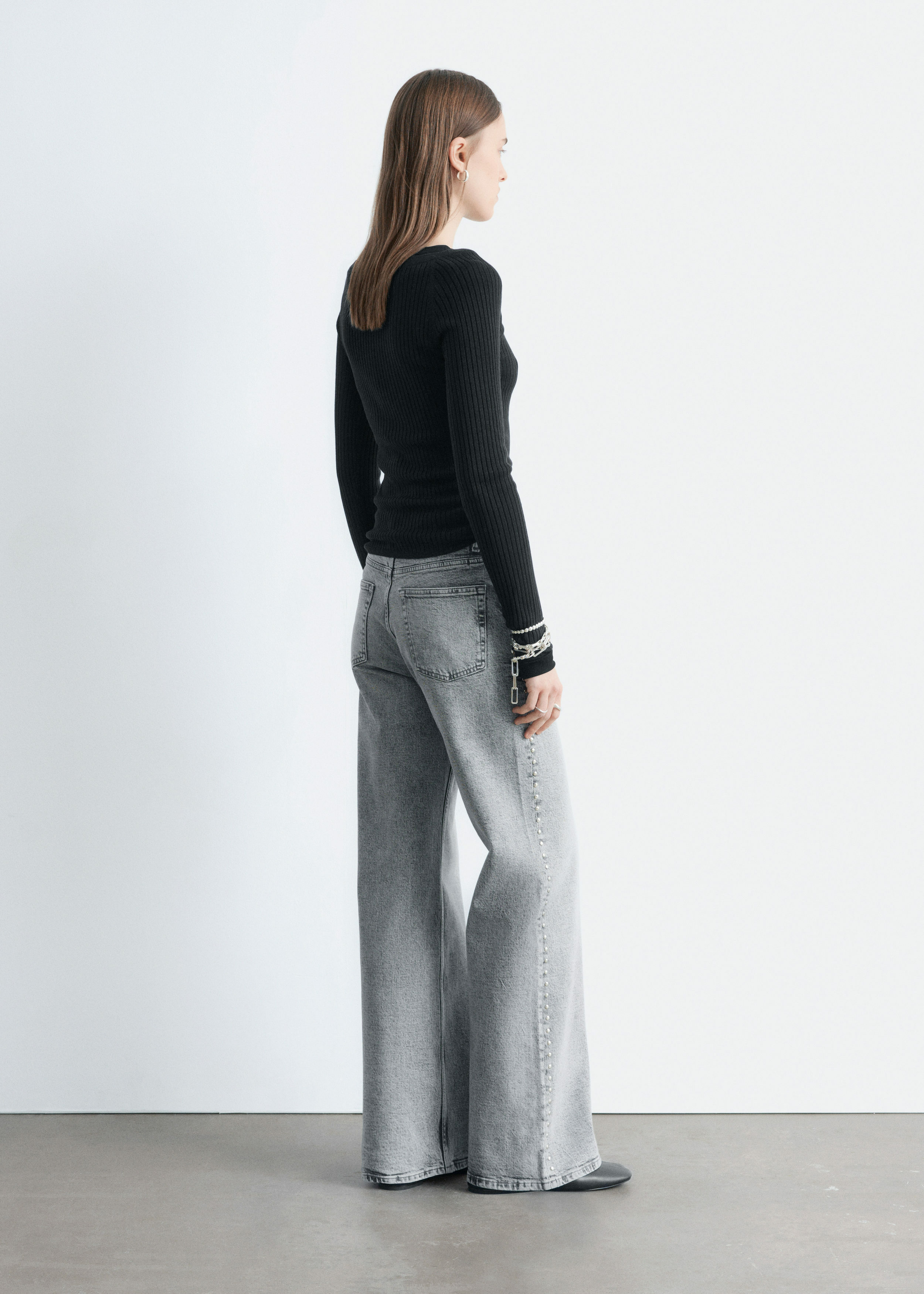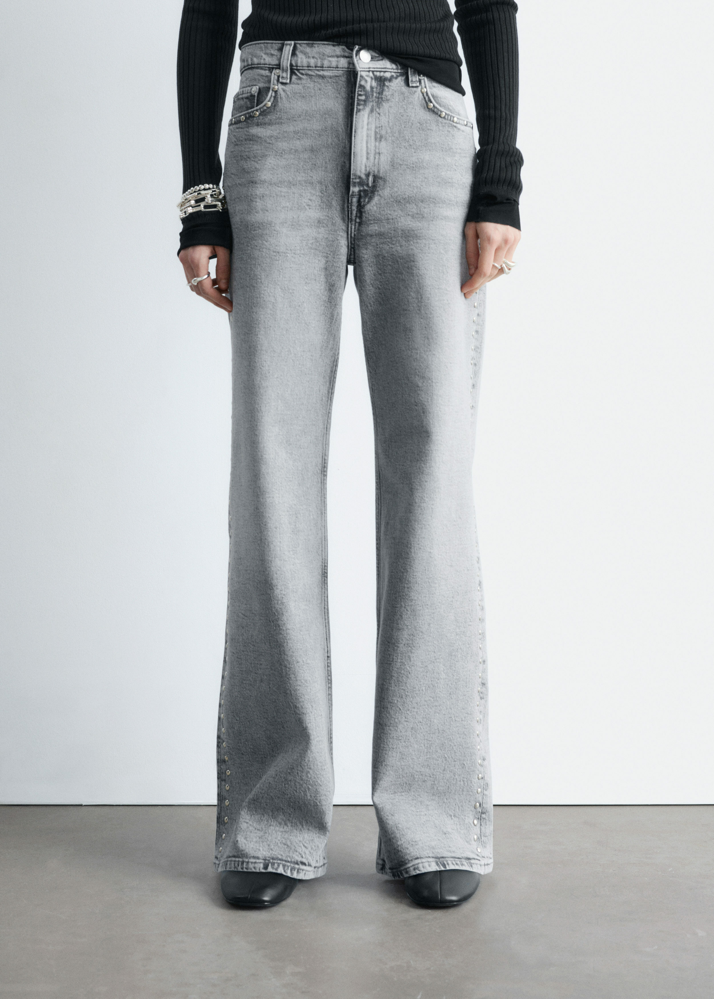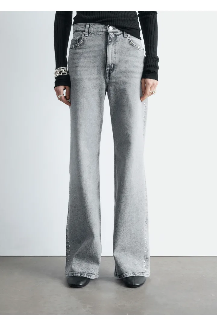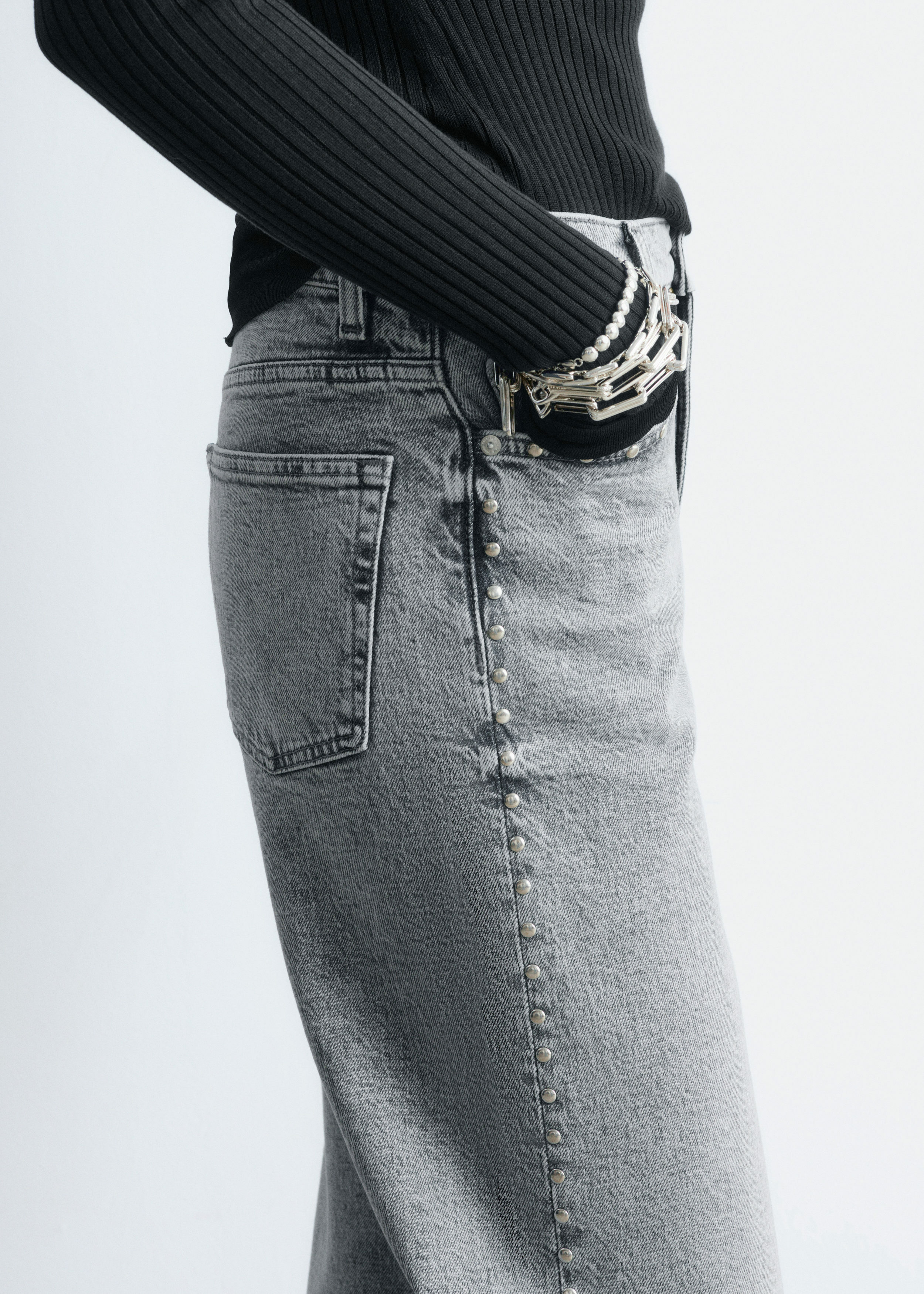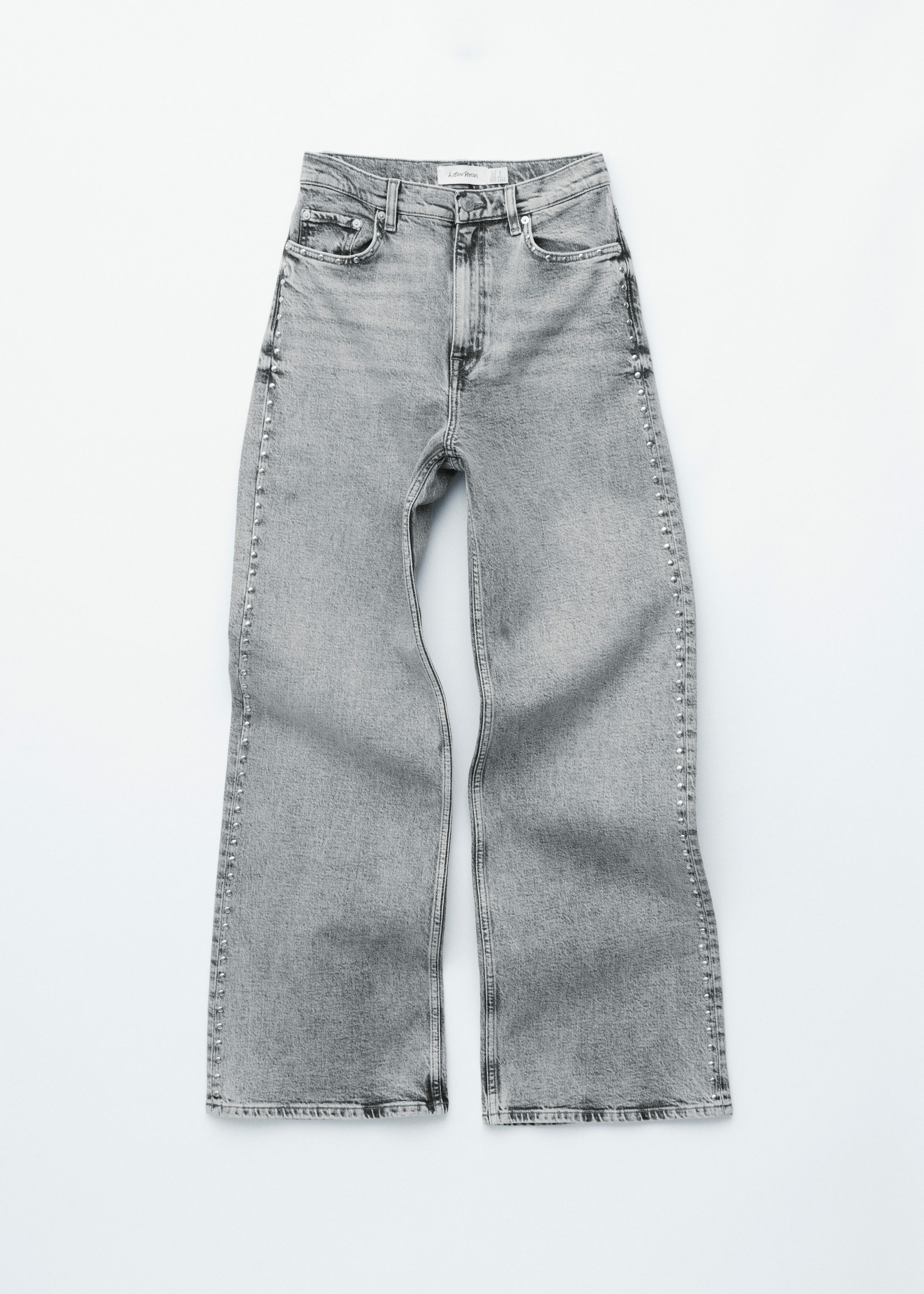 발목까지 오는 롱 & 와이드 레그가 돋보이는 스터드 진이에요. 하이 웨이스트, 지퍼 플라이와 단추, 그리고 클래식한 5 포켓 디자인이 특징이랍니다.