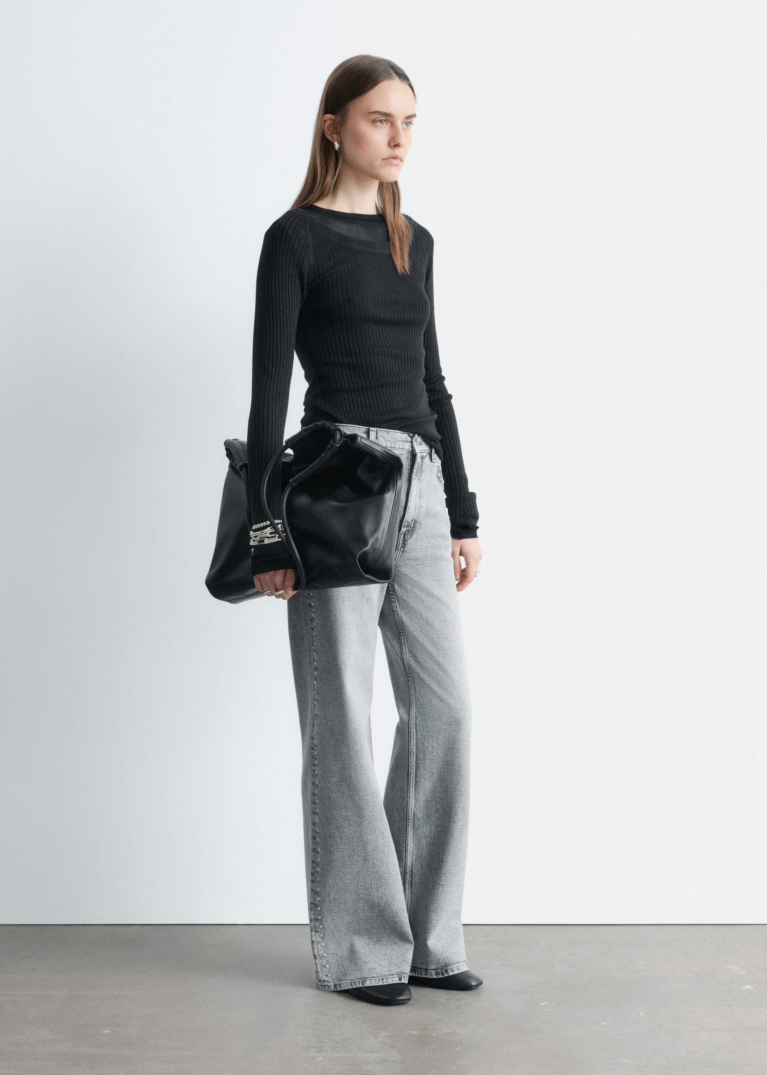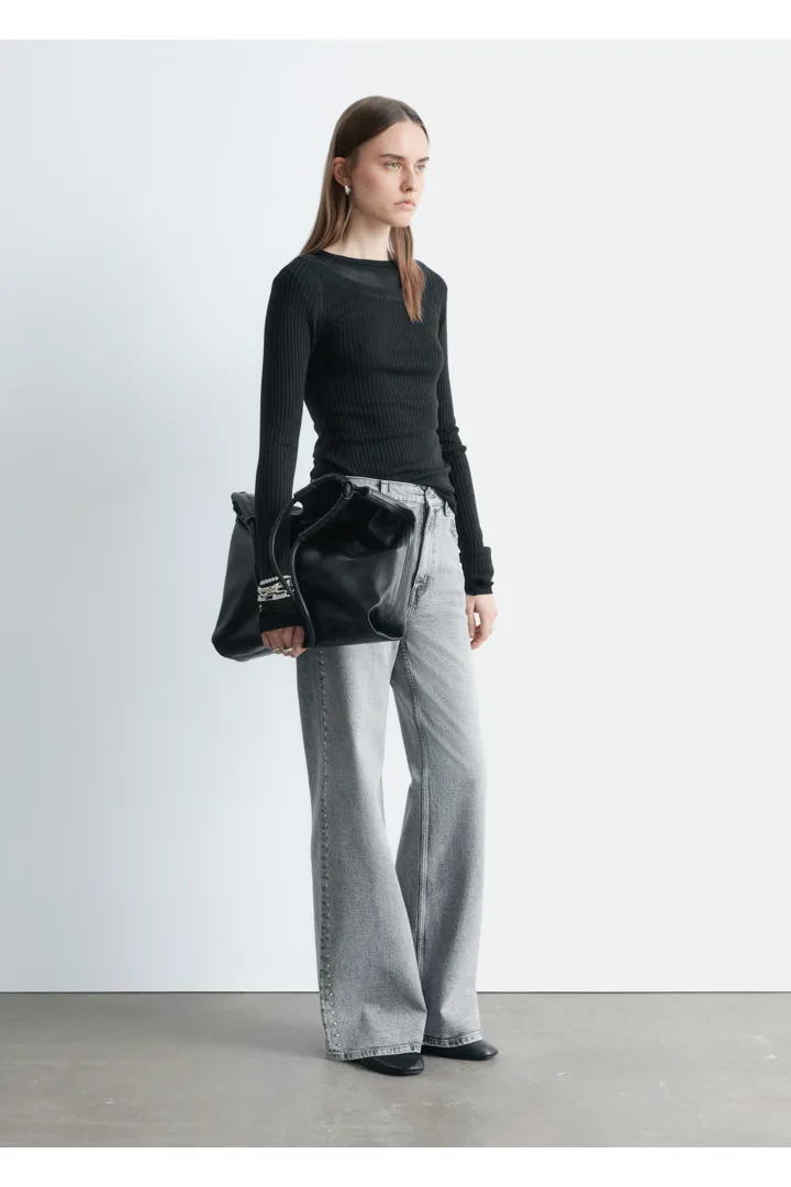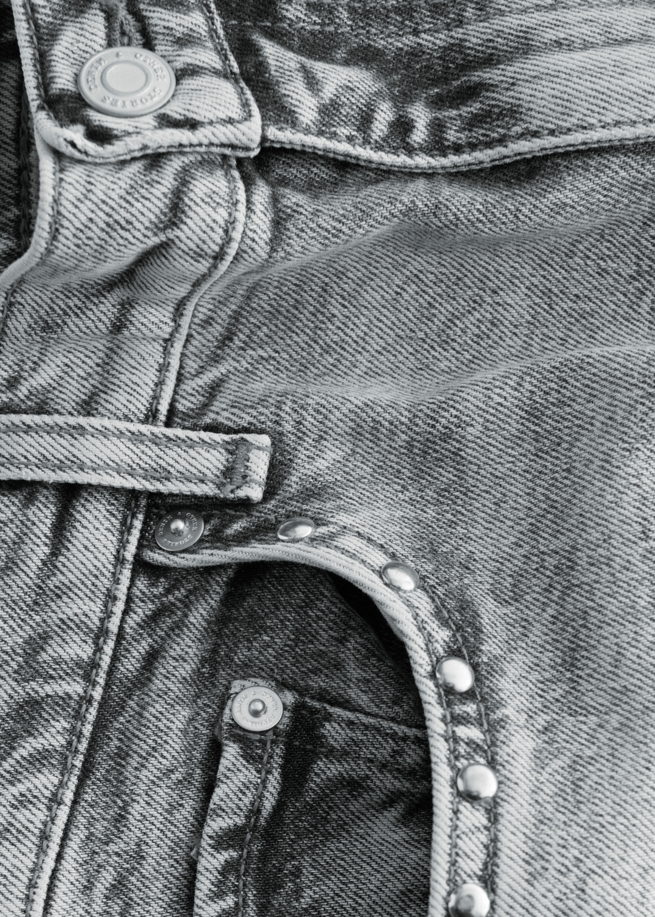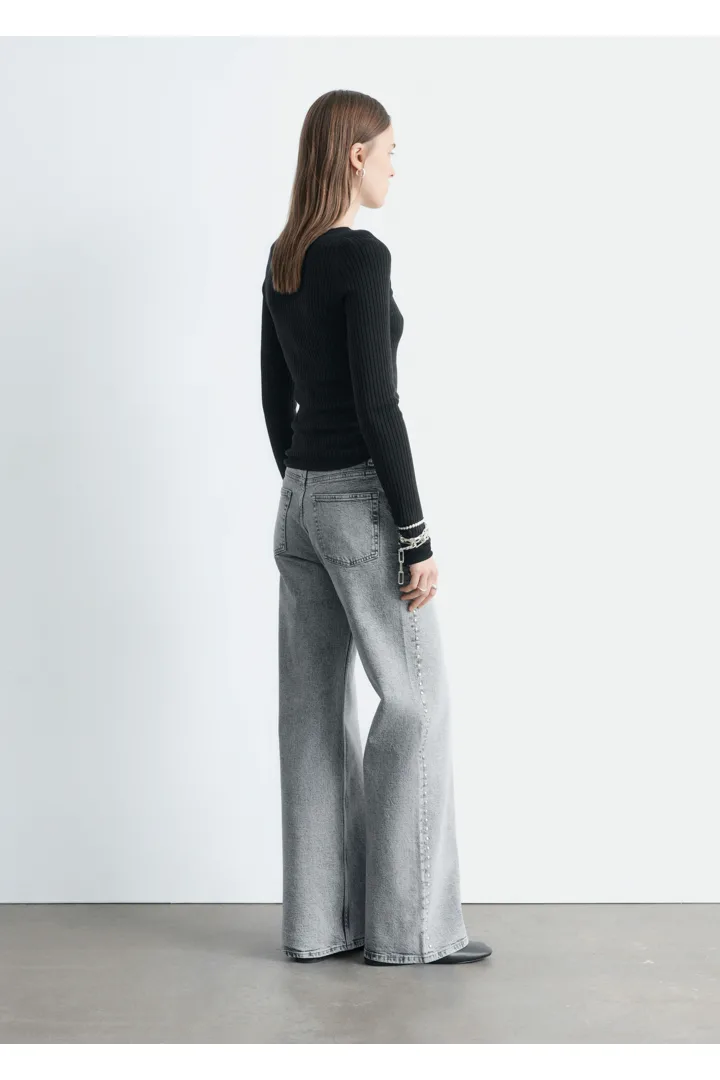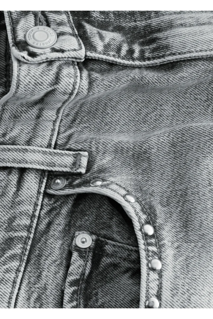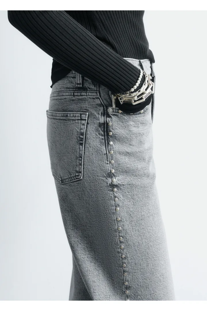 발목까지 오는 롱 & 와이드 레그가 돋보이는 스터드 진이에요. 하이 웨이스트, 지퍼 플라이와 단추, 그리고 클래식한 5 포켓 디자인이 특징이랍니다.