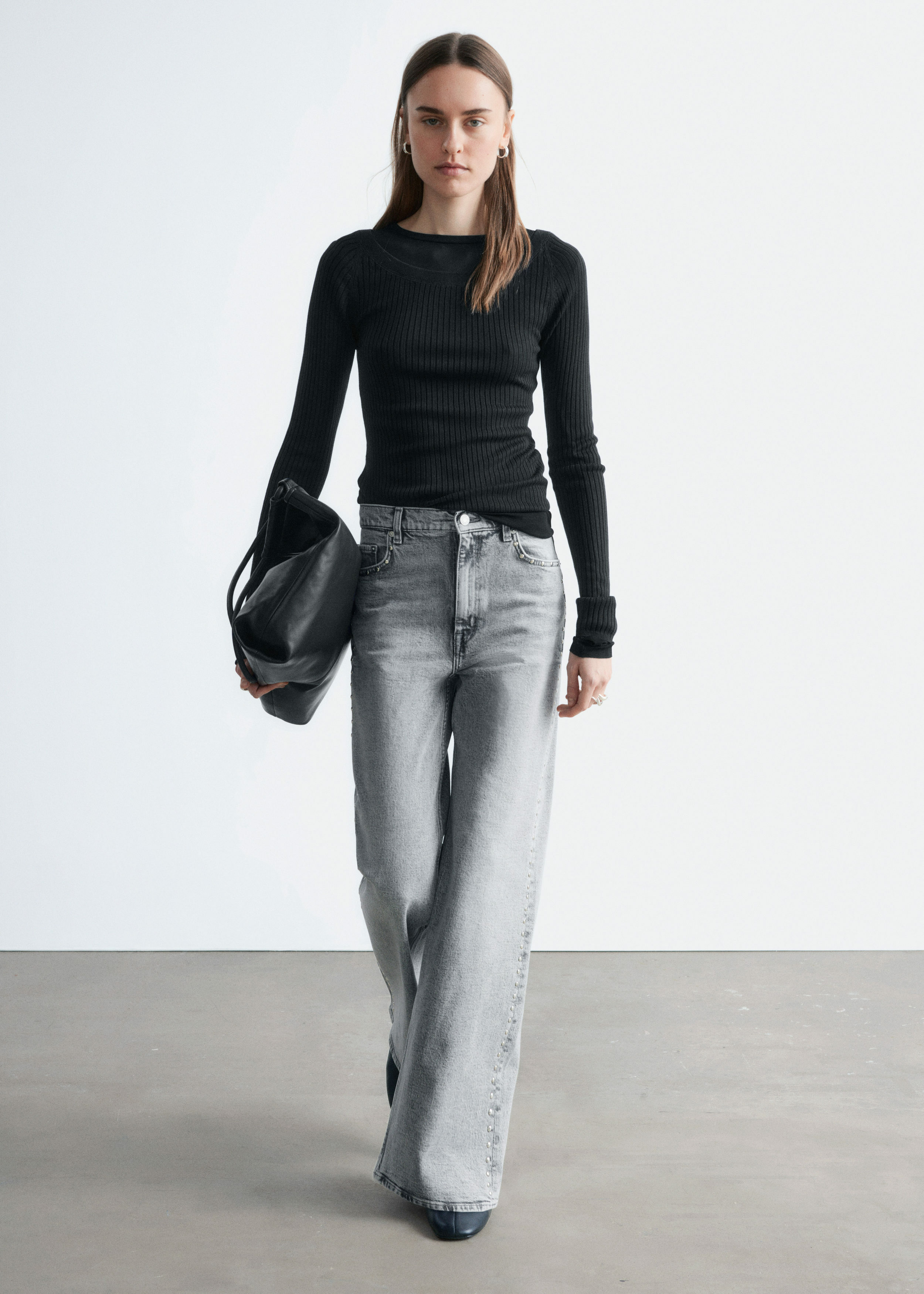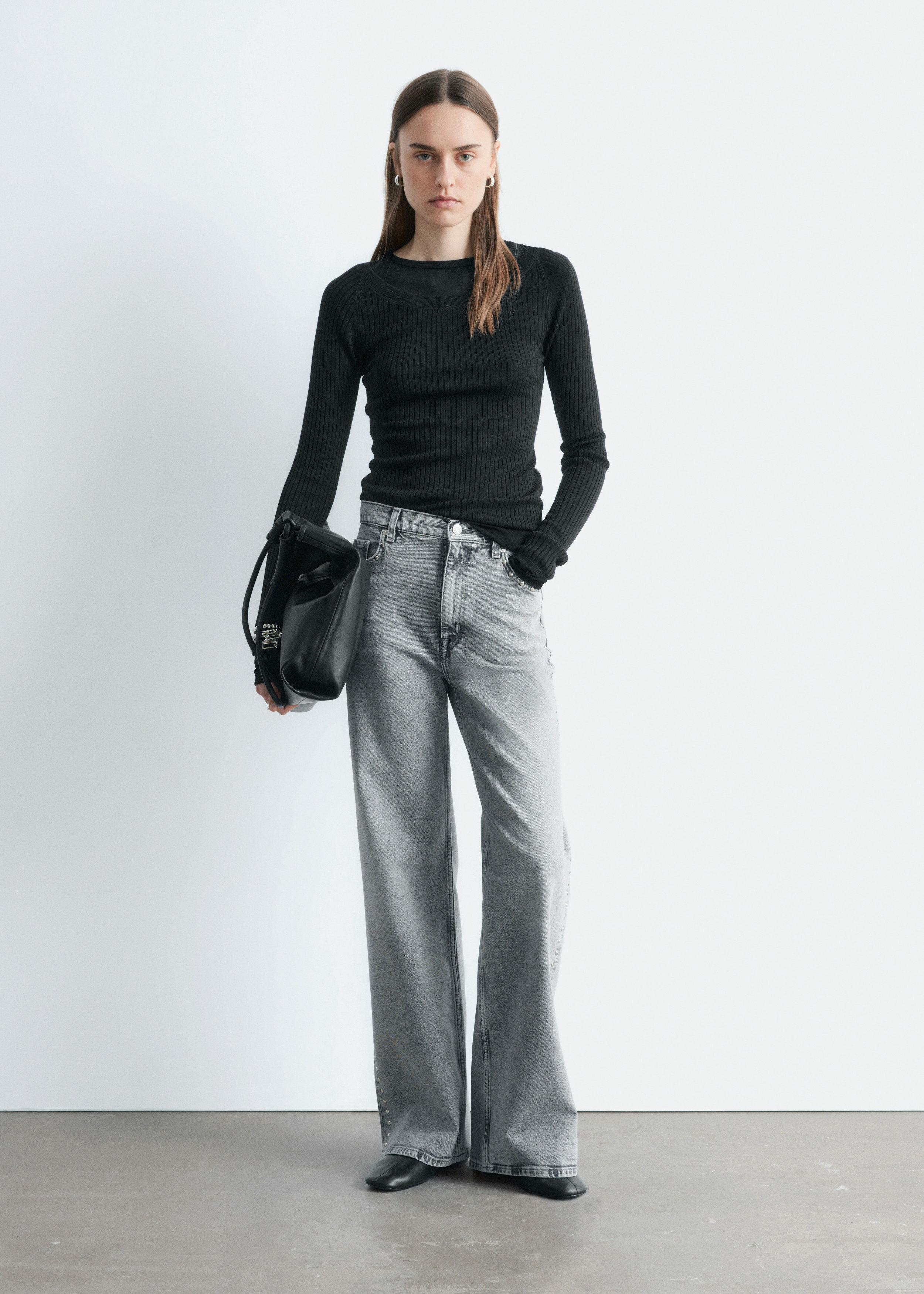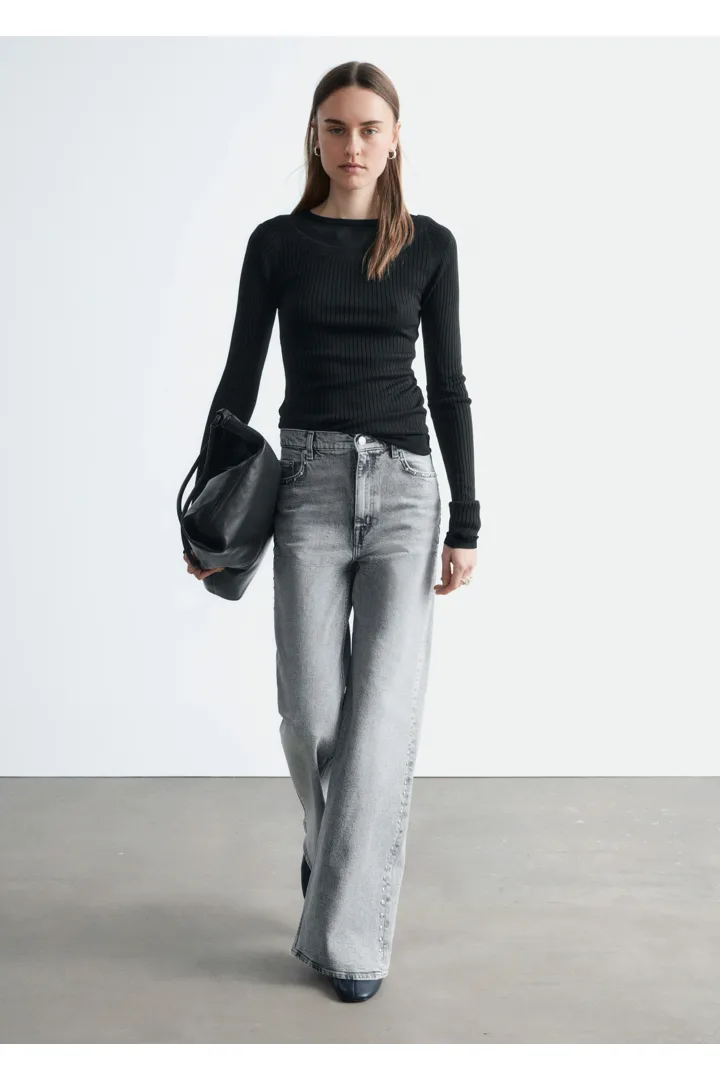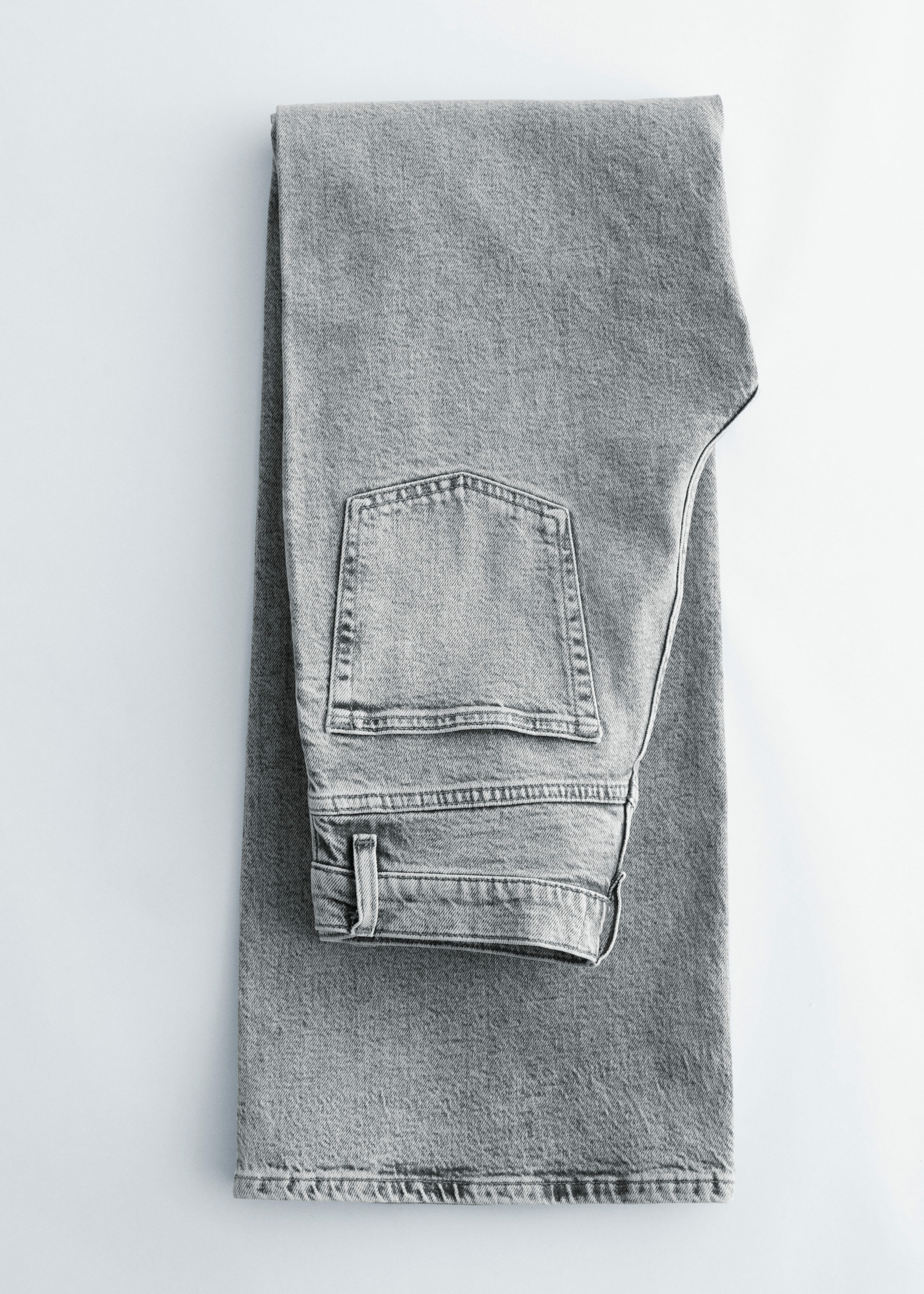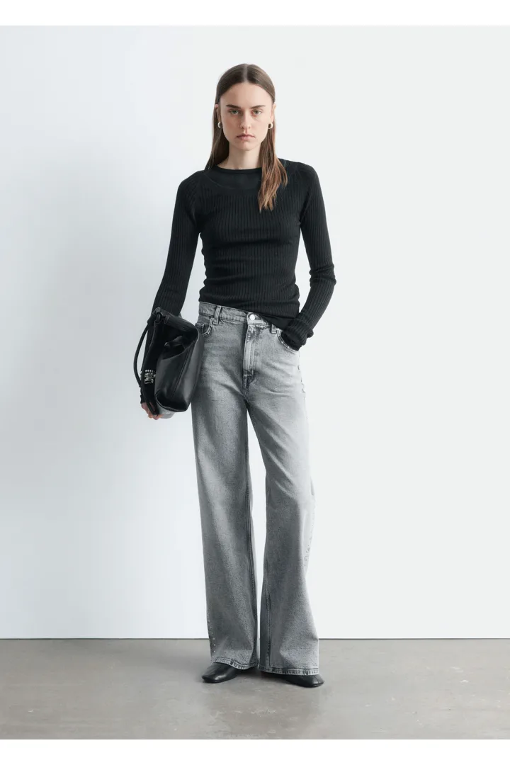 발목까지 오는 롱 & 와이드 레그가 돋보이는 스터드 진이에요. 하이 웨이스트, 지퍼 플라이와 단추, 그리고 클래식한 5 포켓 디자인이 특징이랍니다.