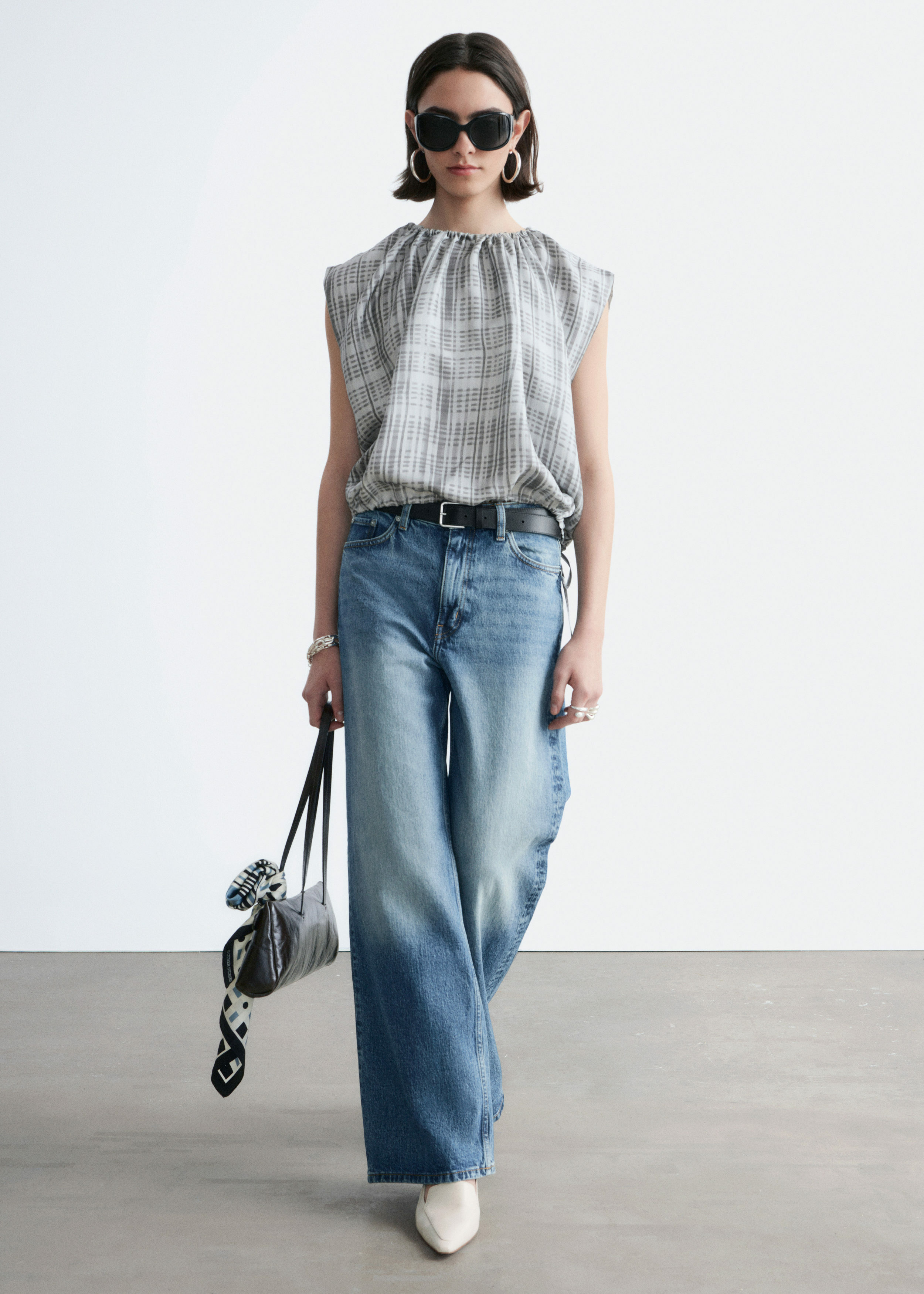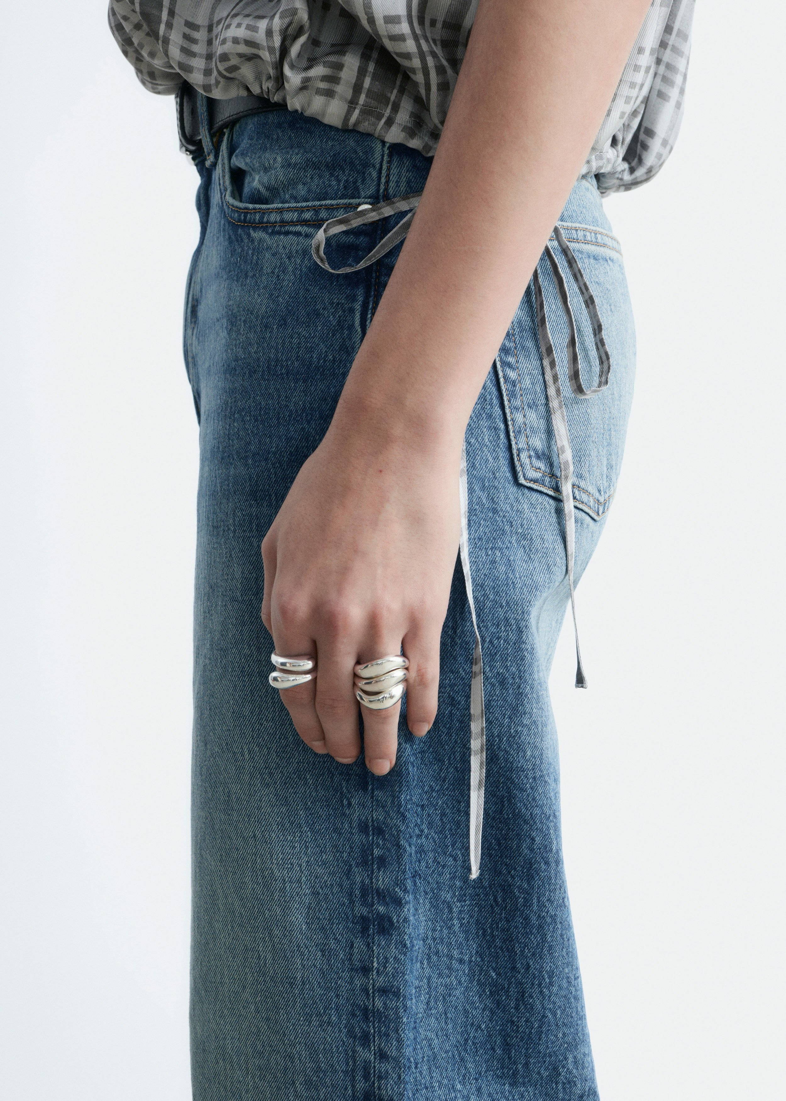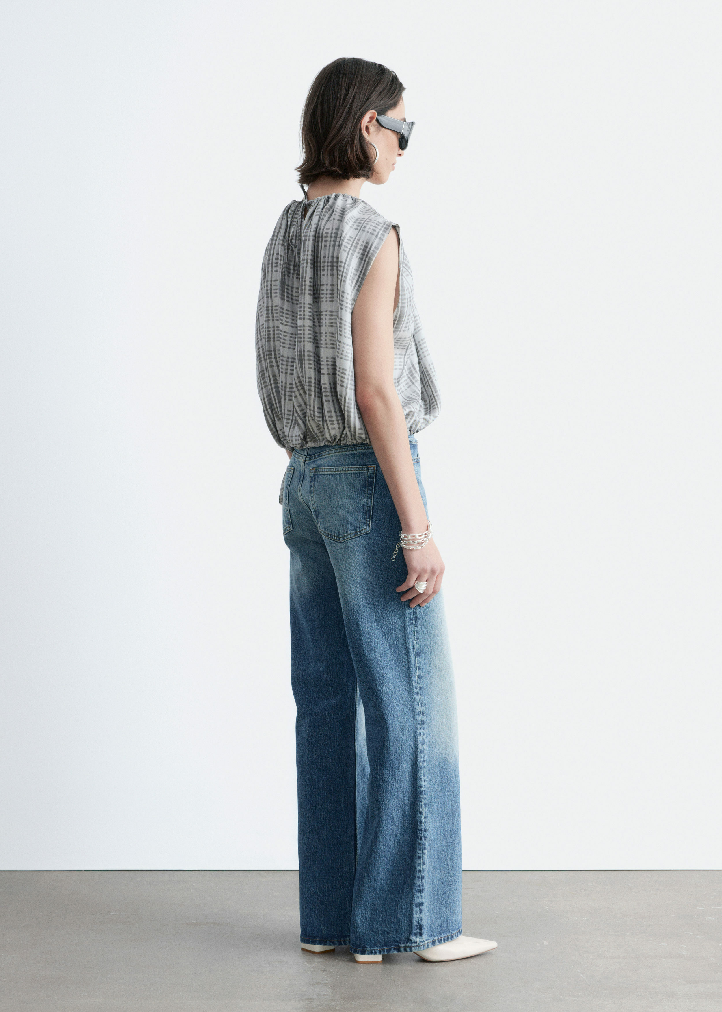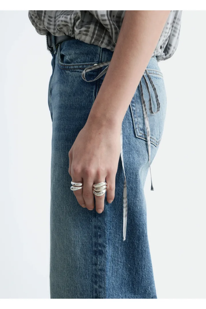 하이 웨이스트의 데님 진이에요. 너비감 있는 롱 레그와 클래식한 5 포켓 디자인이 특징이랍니다.