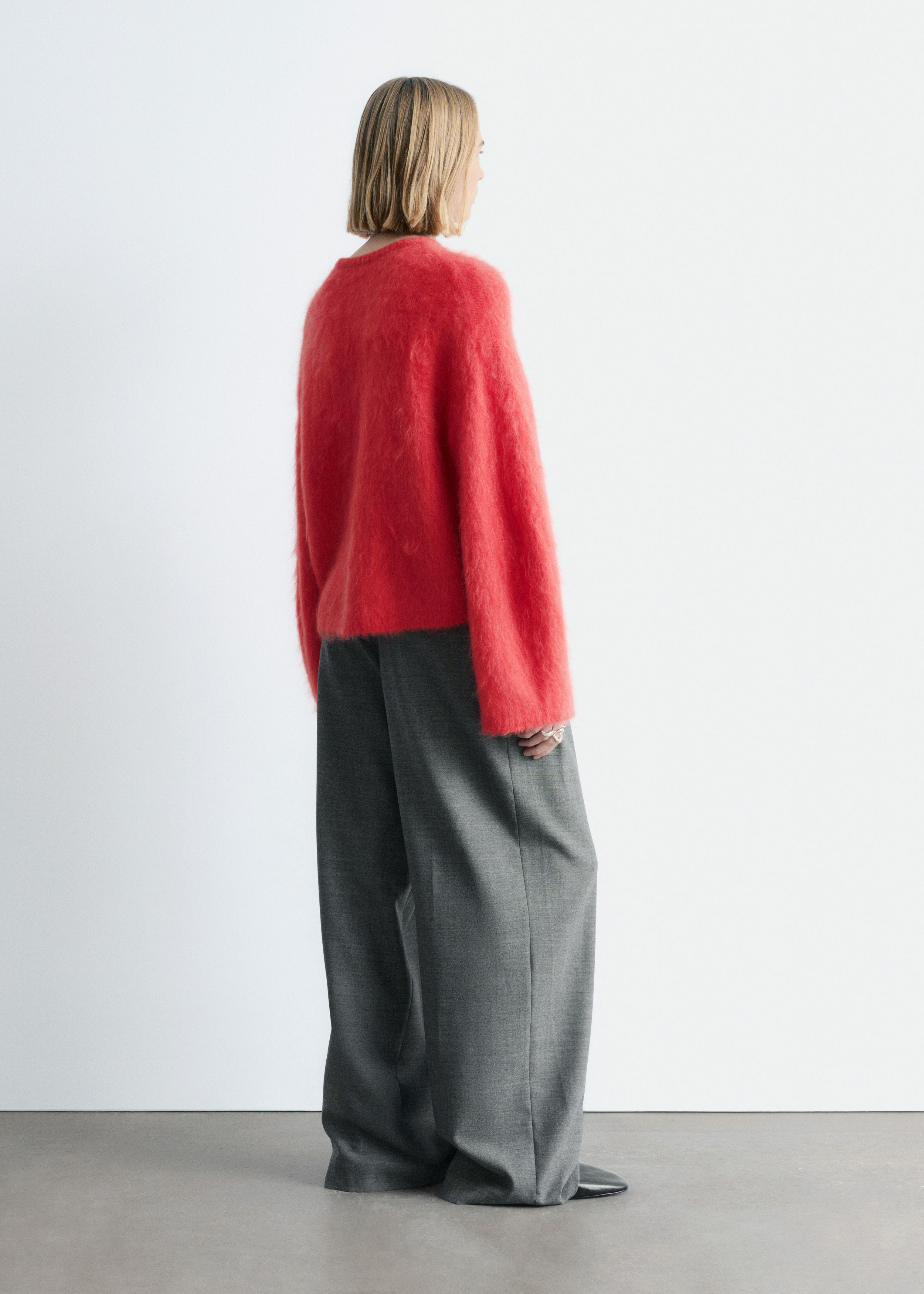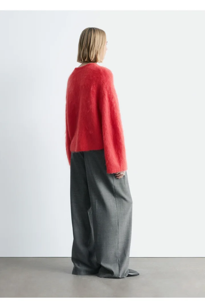 브러시드 마감의 모헤어 & 울 혼방 니트 가디건이에요. 볼륨감 있는 롱 슬리브는 드롭 숄더에서 곡선을 그리며 이어진답니다. 여유 있는 라운드 네크라인, 앞면의 단추, 립 트리밍이 자리해 있어요.