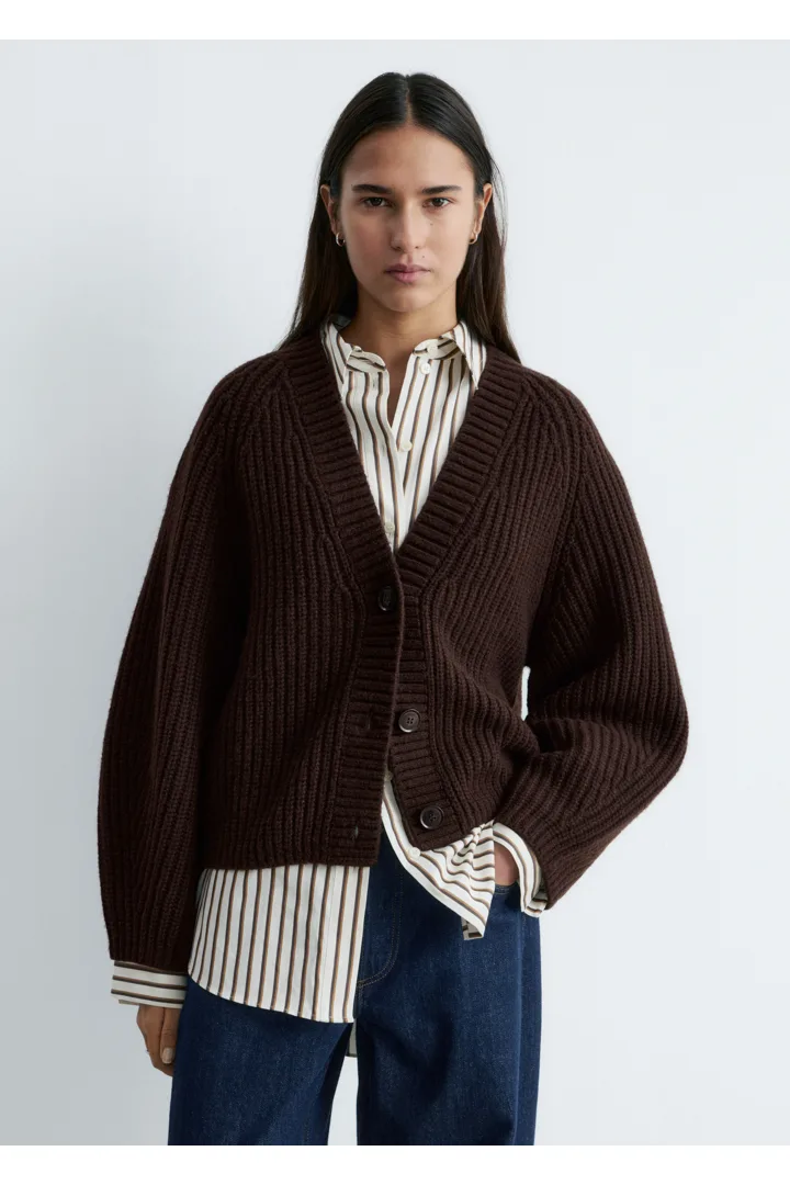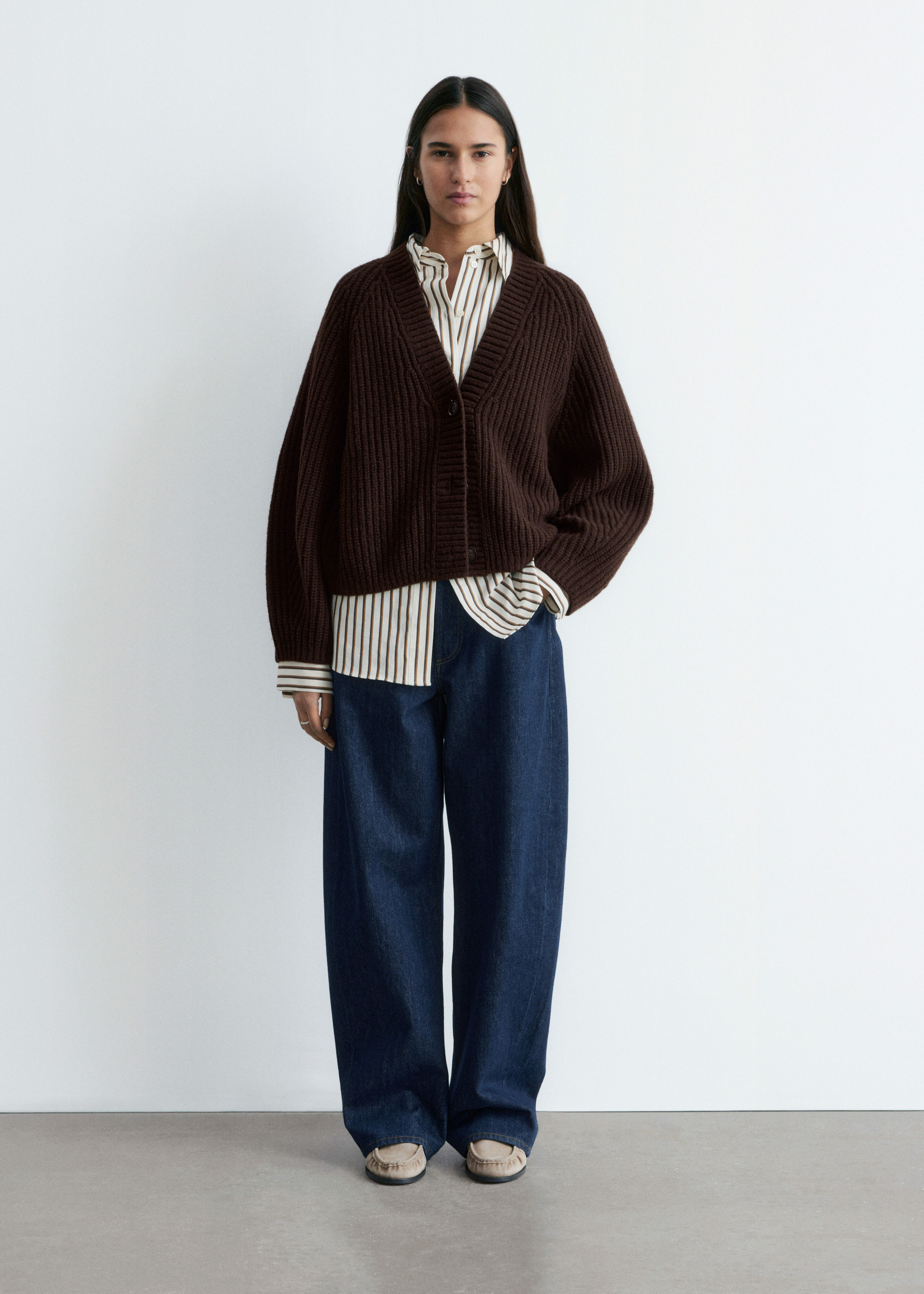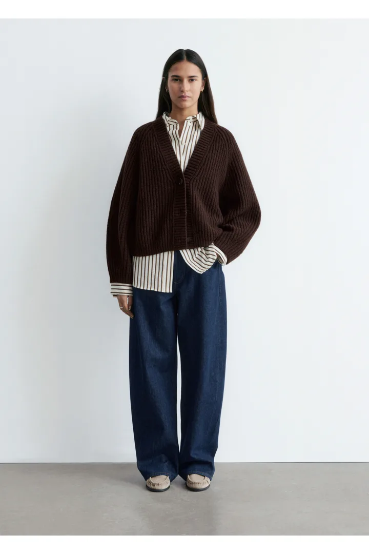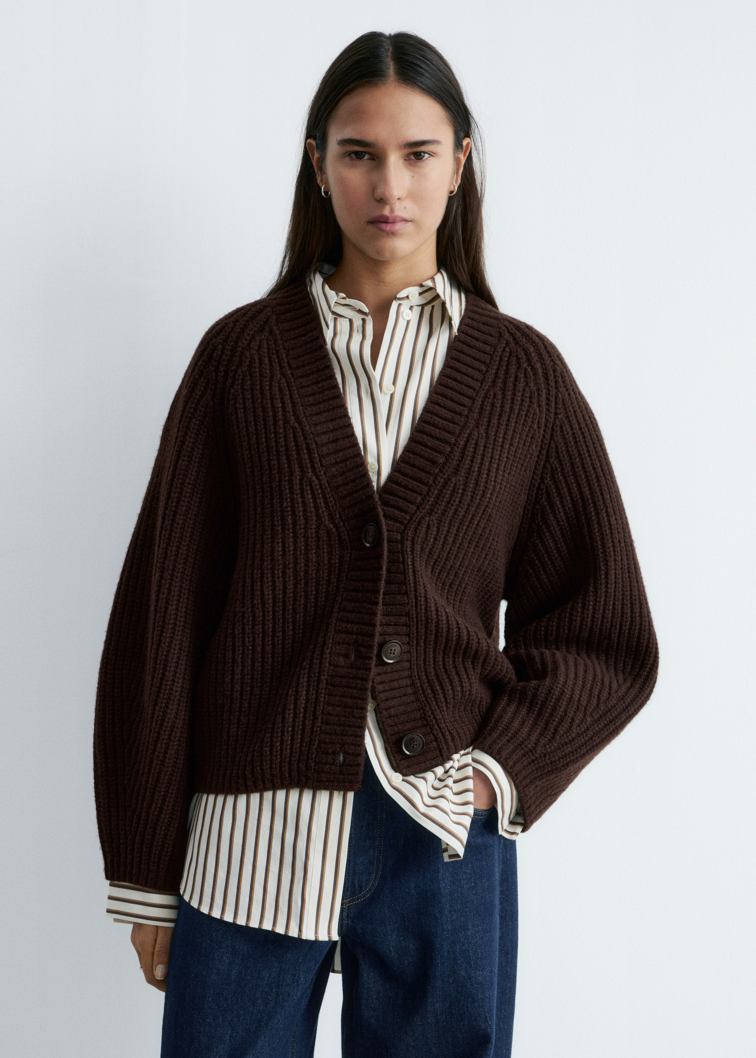 울 & 코튼 혼방 니트 소재의 가디건이에요. 코쿤 쉐입 실루엣과 청키한 립 텍스처가 돋보이는 아이템으로, 앞면에는 3개의 큼직한 단추가 자리해 있답니다.