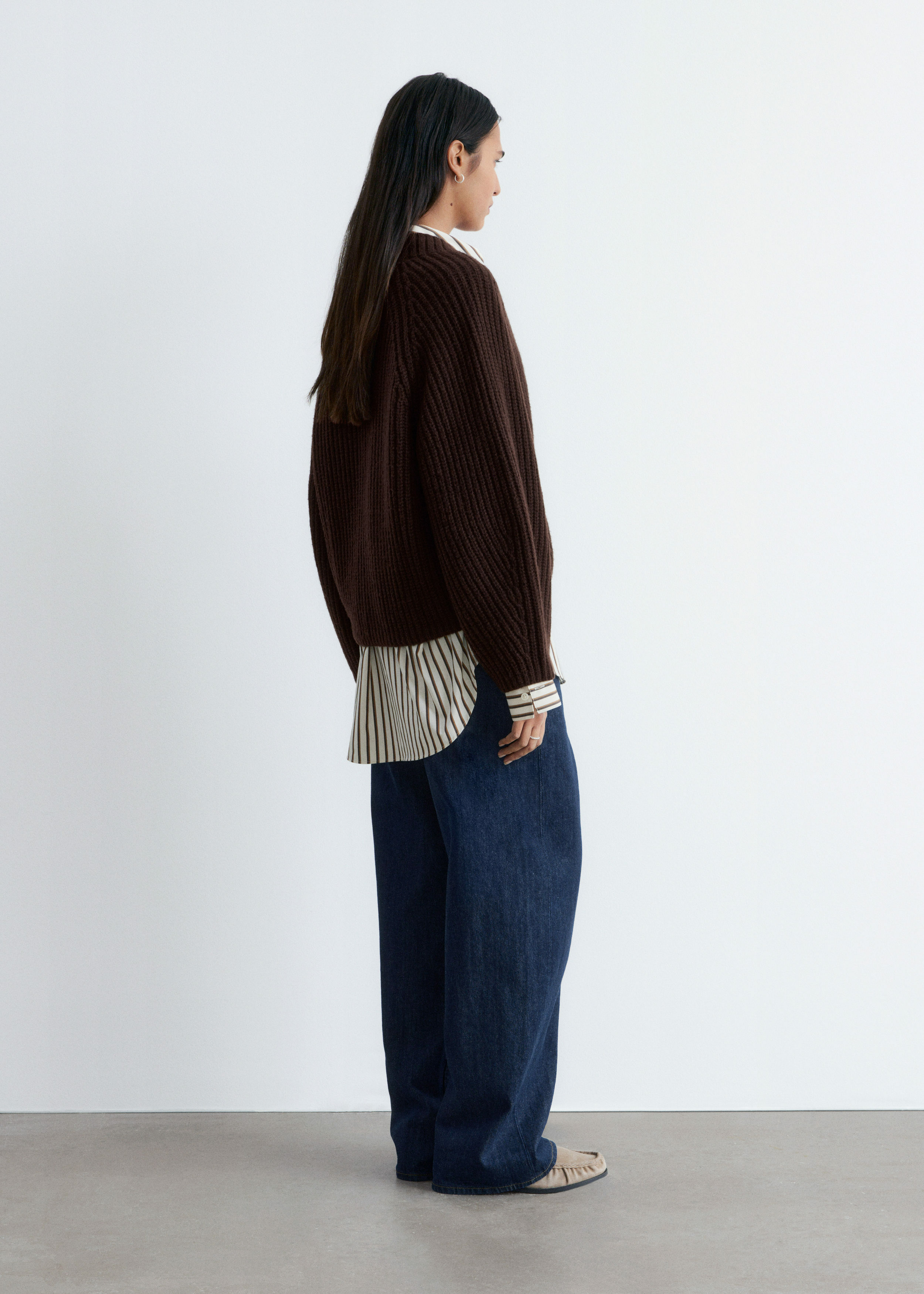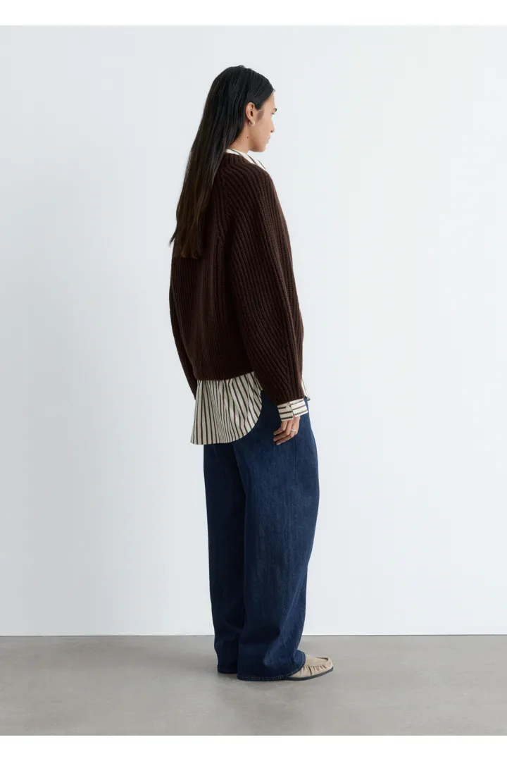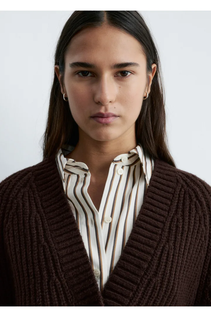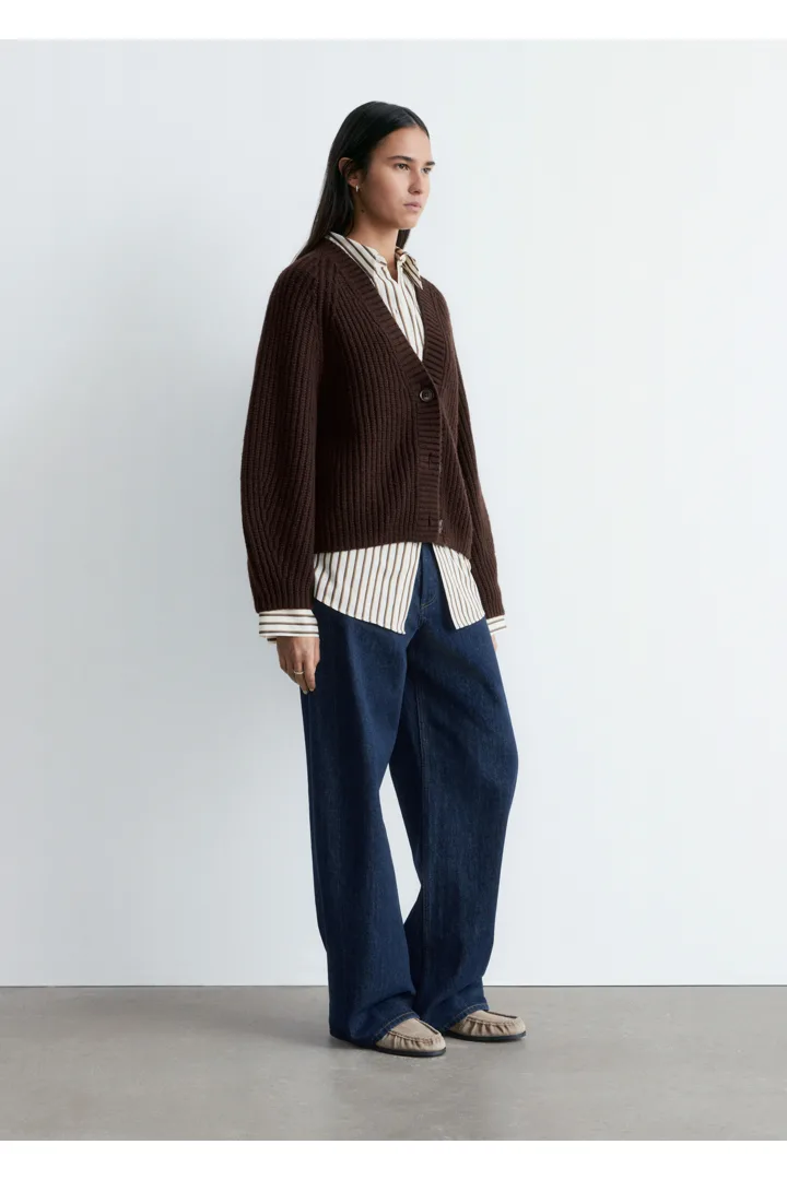 울 & 코튼 혼방 니트 소재의 가디건이에요. 코쿤 쉐입 실루엣과 청키한 립 텍스처가 돋보이는 아이템으로, 앞면에는 3개의 큼직한 단추가 자리해 있답니다.