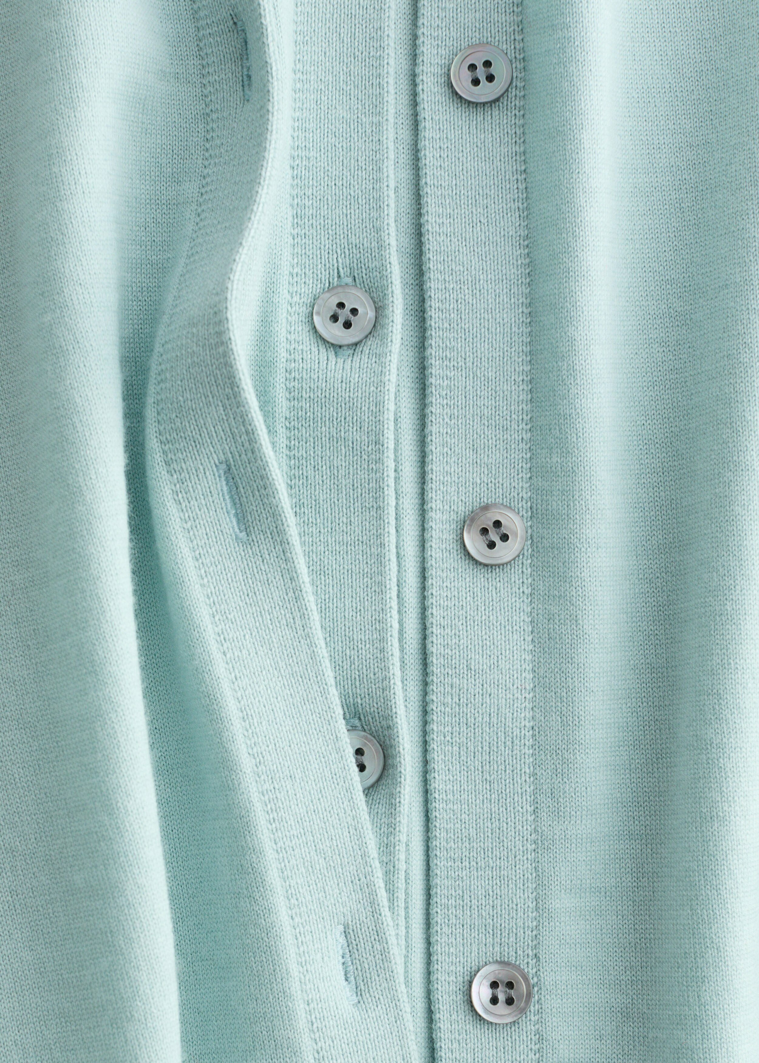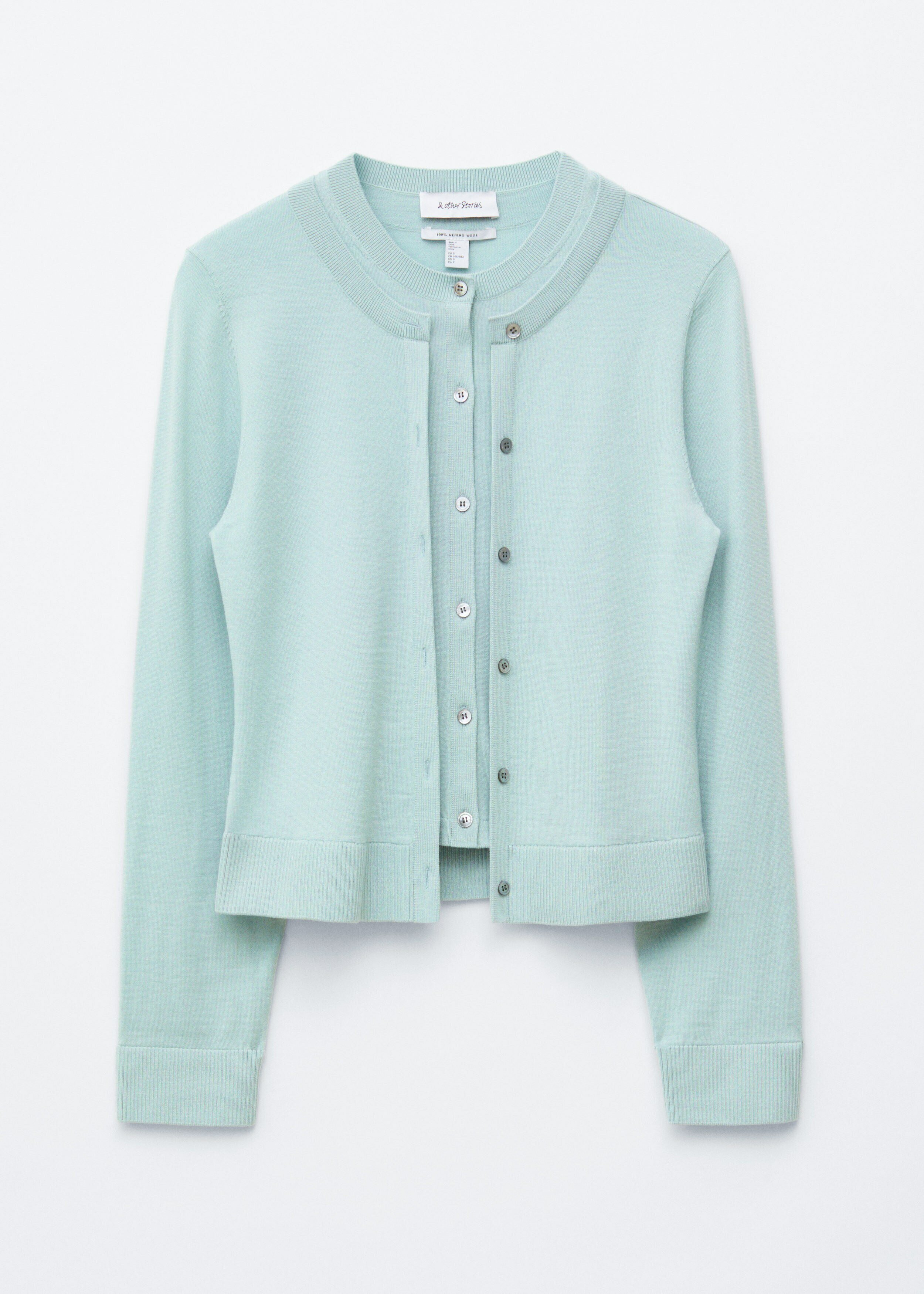 메리노 울 니트 소재의 가디건이에요. 더블 레이어 디자인, 대비적인 단추 디테일, 립 트리밍이 특징인 제품이에요.