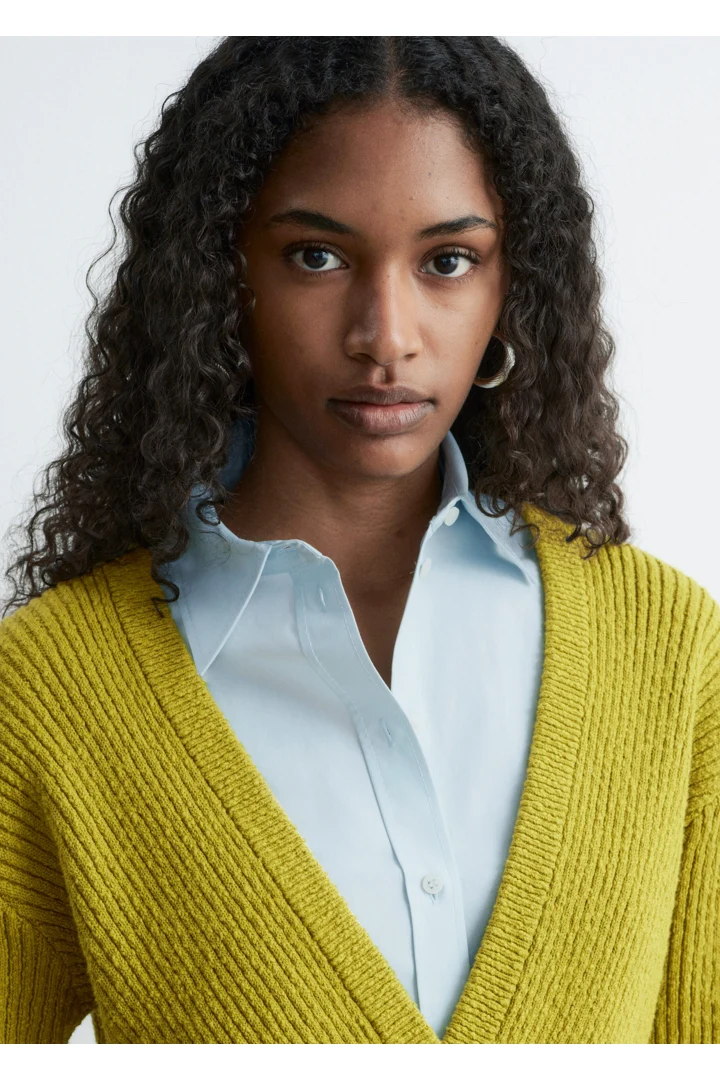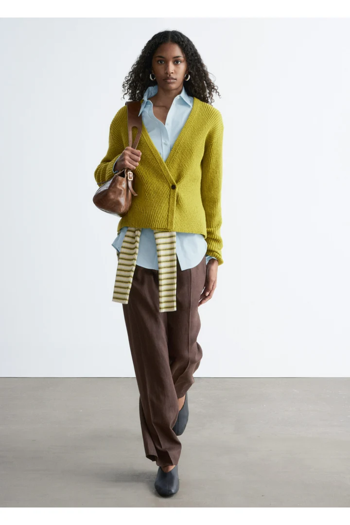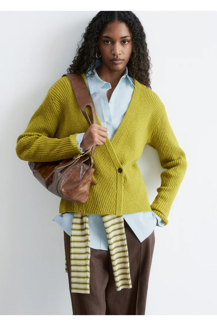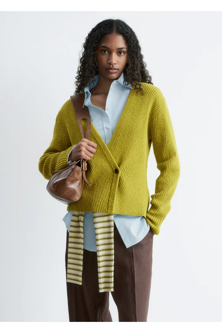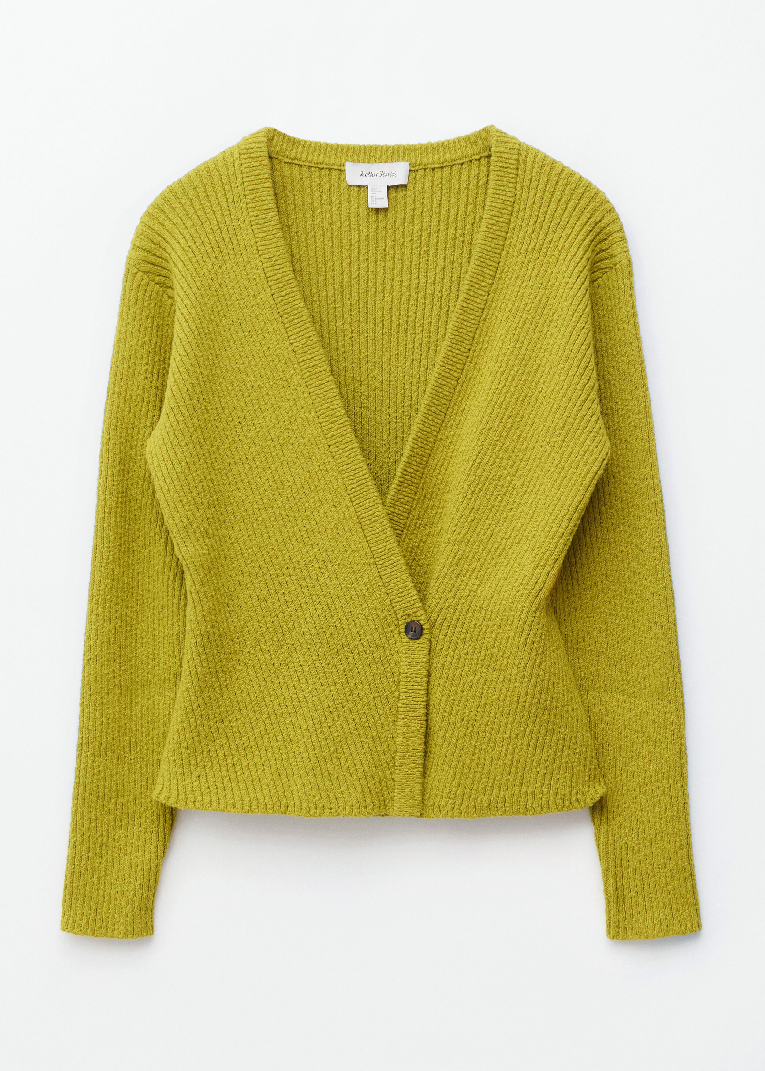 바디 쉐입에 맞게 멋스러운 연출이 가능한 가디건이에요. 원사 염색 코튼 소재의 립 니트 디자인으로, 허리라인을 부드럽게 강조하는 랩 스타일 실루엣에 싱글 단추가 포인트로 자리해 있어요. 데님 진부터 테일러드 룩까지 자연스럽게 어울리는 세련된 아이템이랍니다.