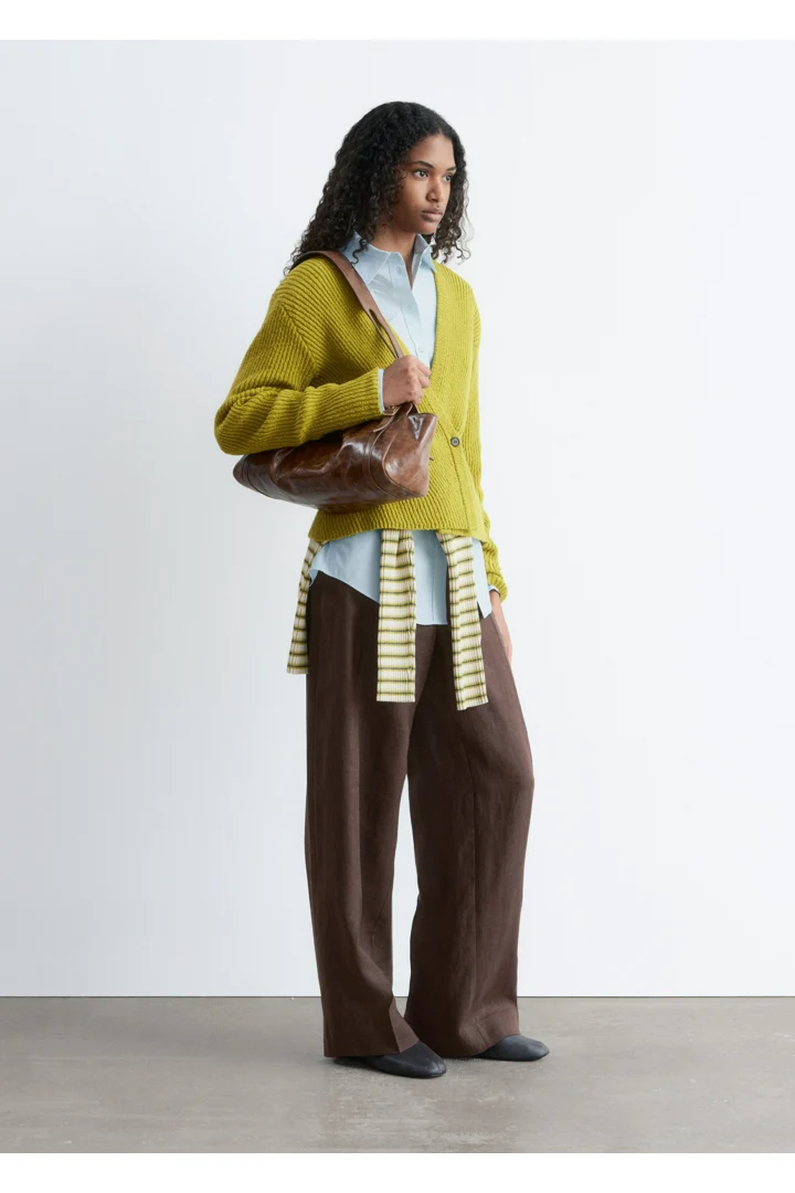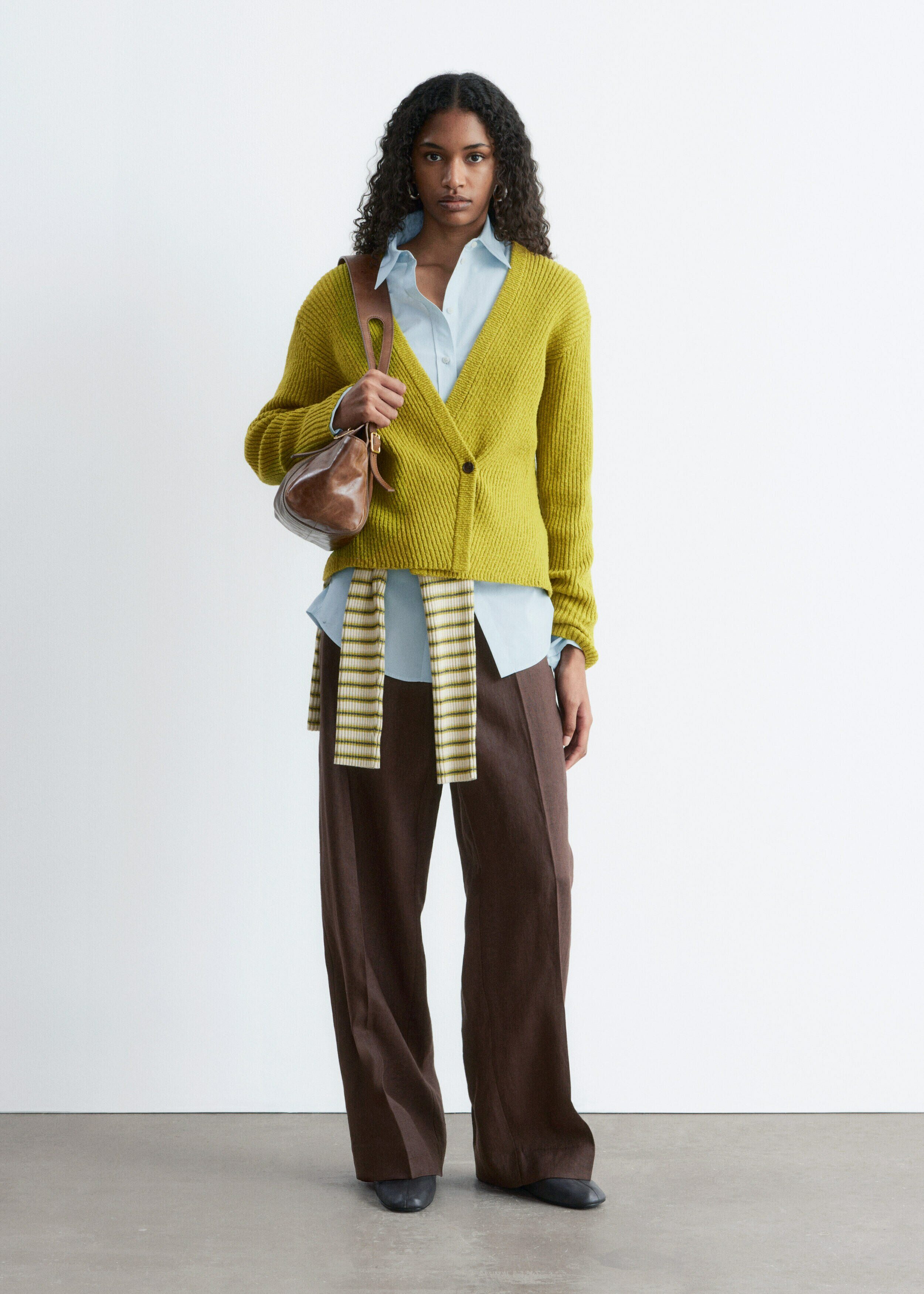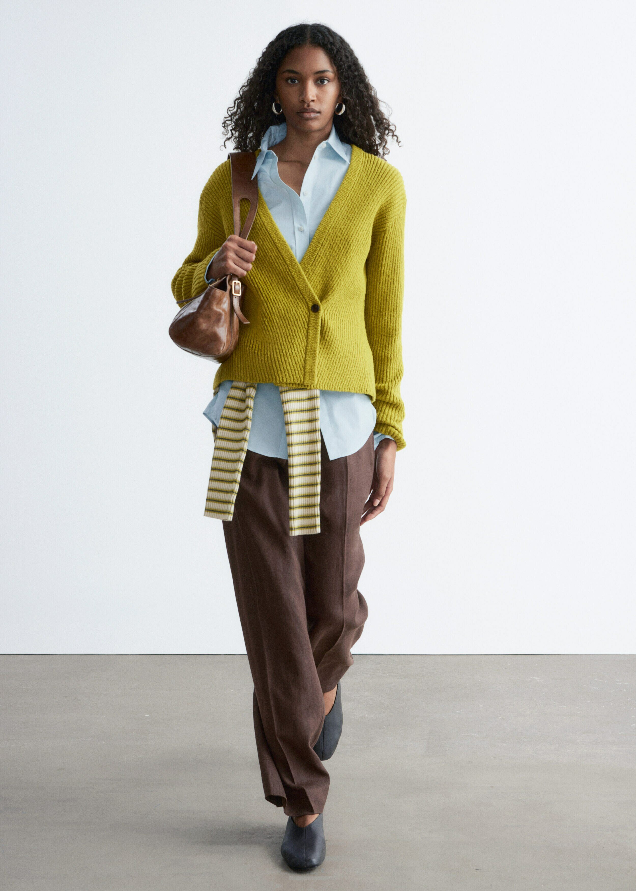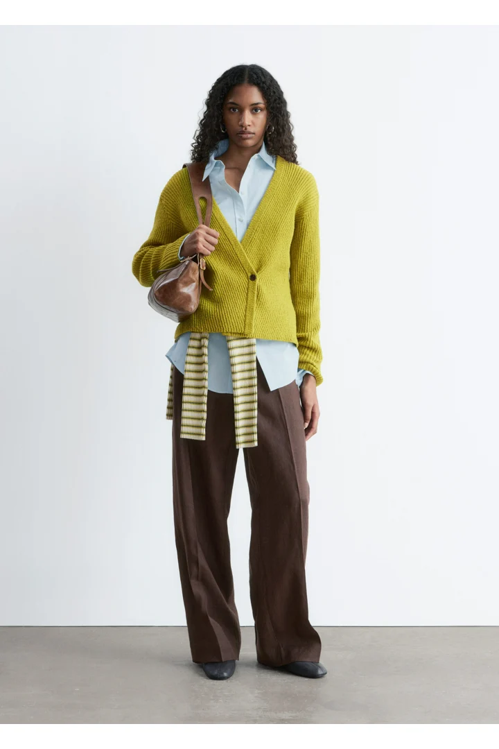 바디 쉐입에 맞게 멋스러운 연출이 가능한 가디건이에요. 원사 염색 코튼 소재의 립 니트 디자인으로, 허리라인을 부드럽게 강조하는 랩 스타일 실루엣에 싱글 단추가 포인트로 자리해 있어요. 데님 진부터 테일러드 룩까지 자연스럽게 어울리는 세련된 아이템이랍니다.