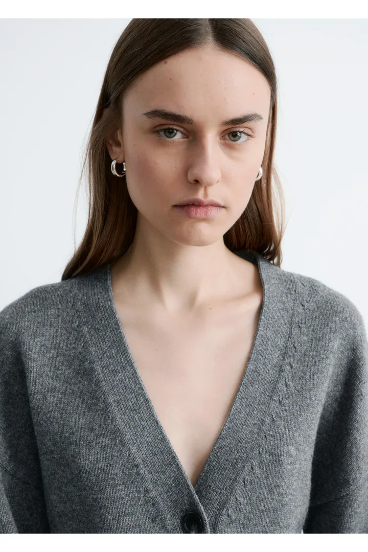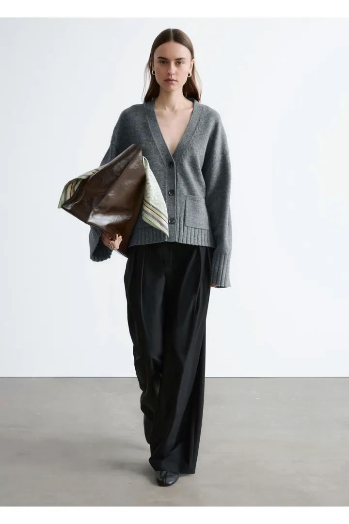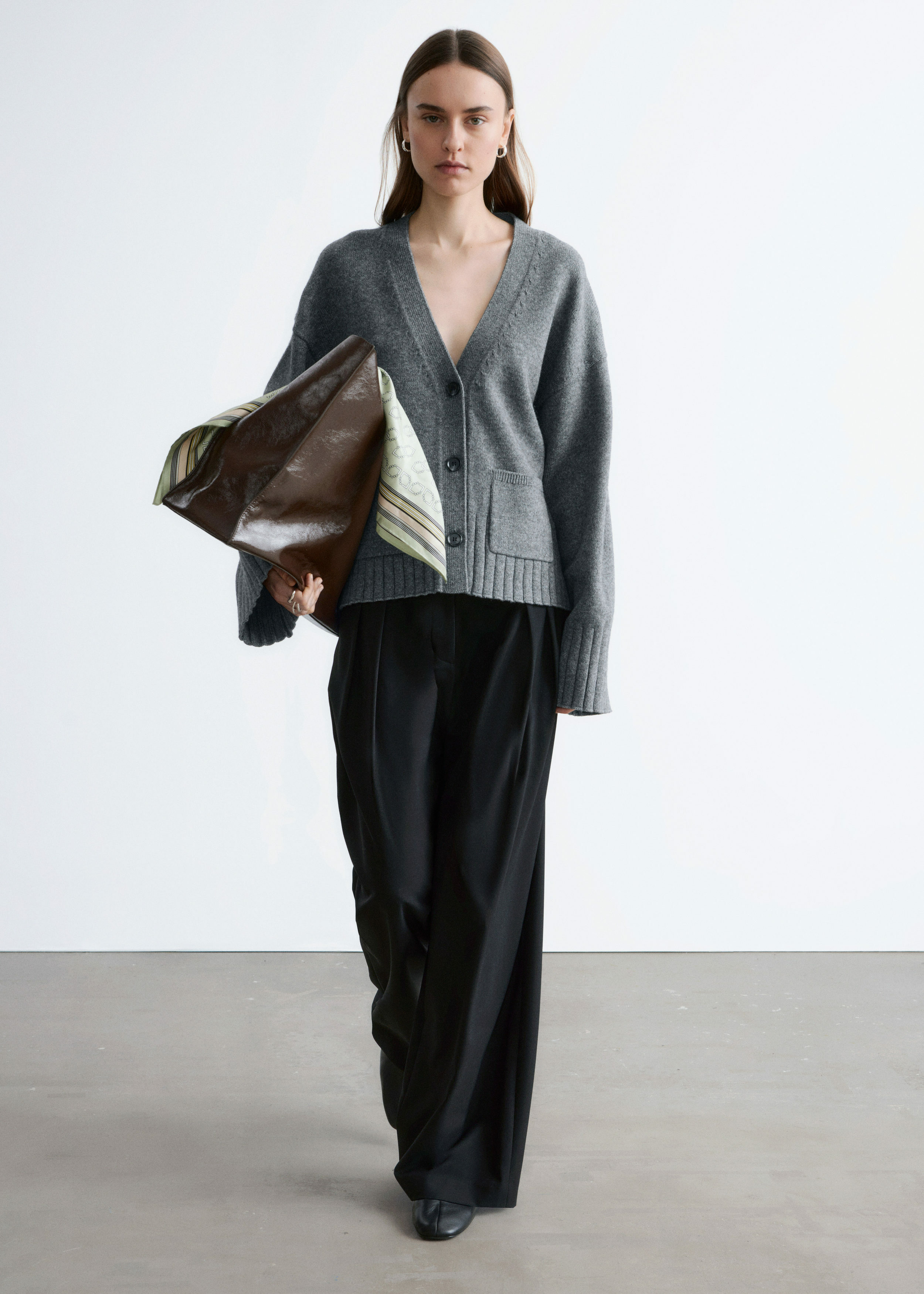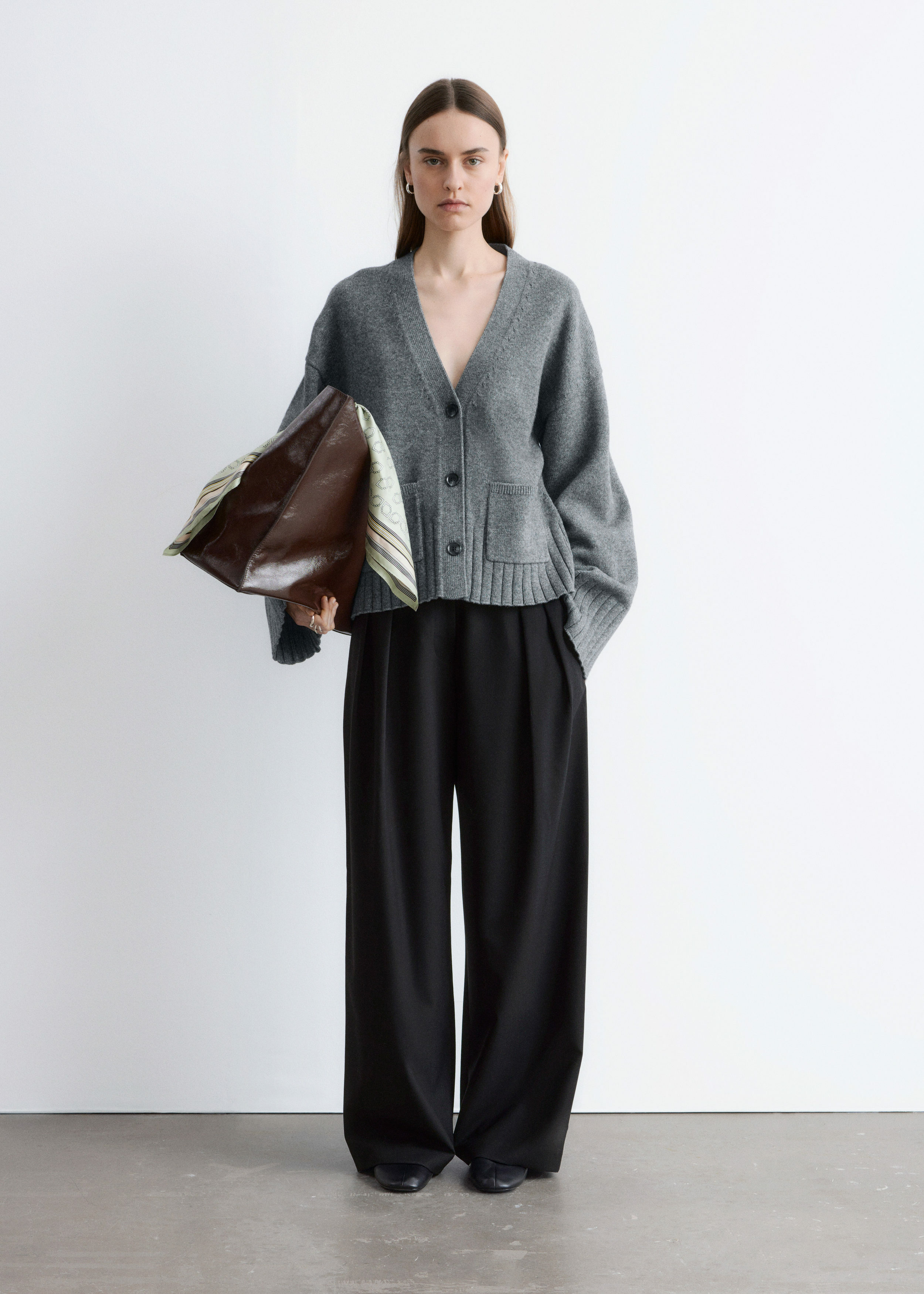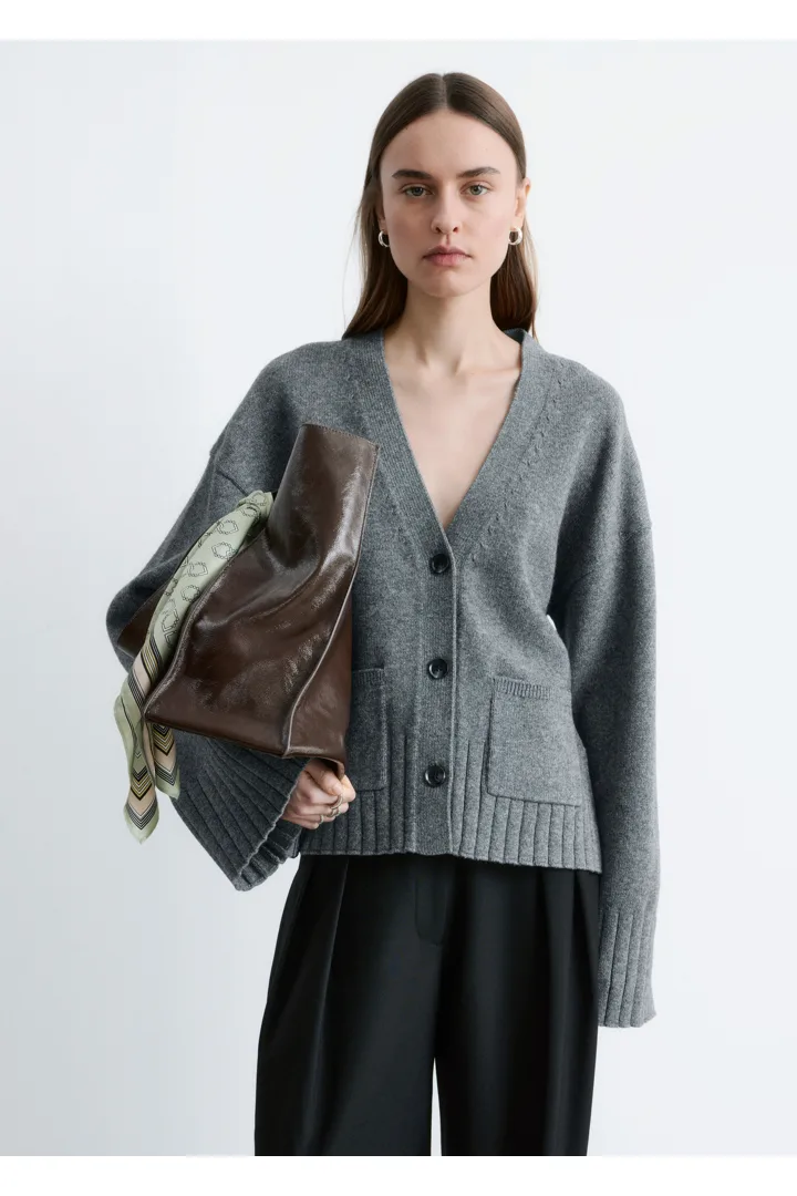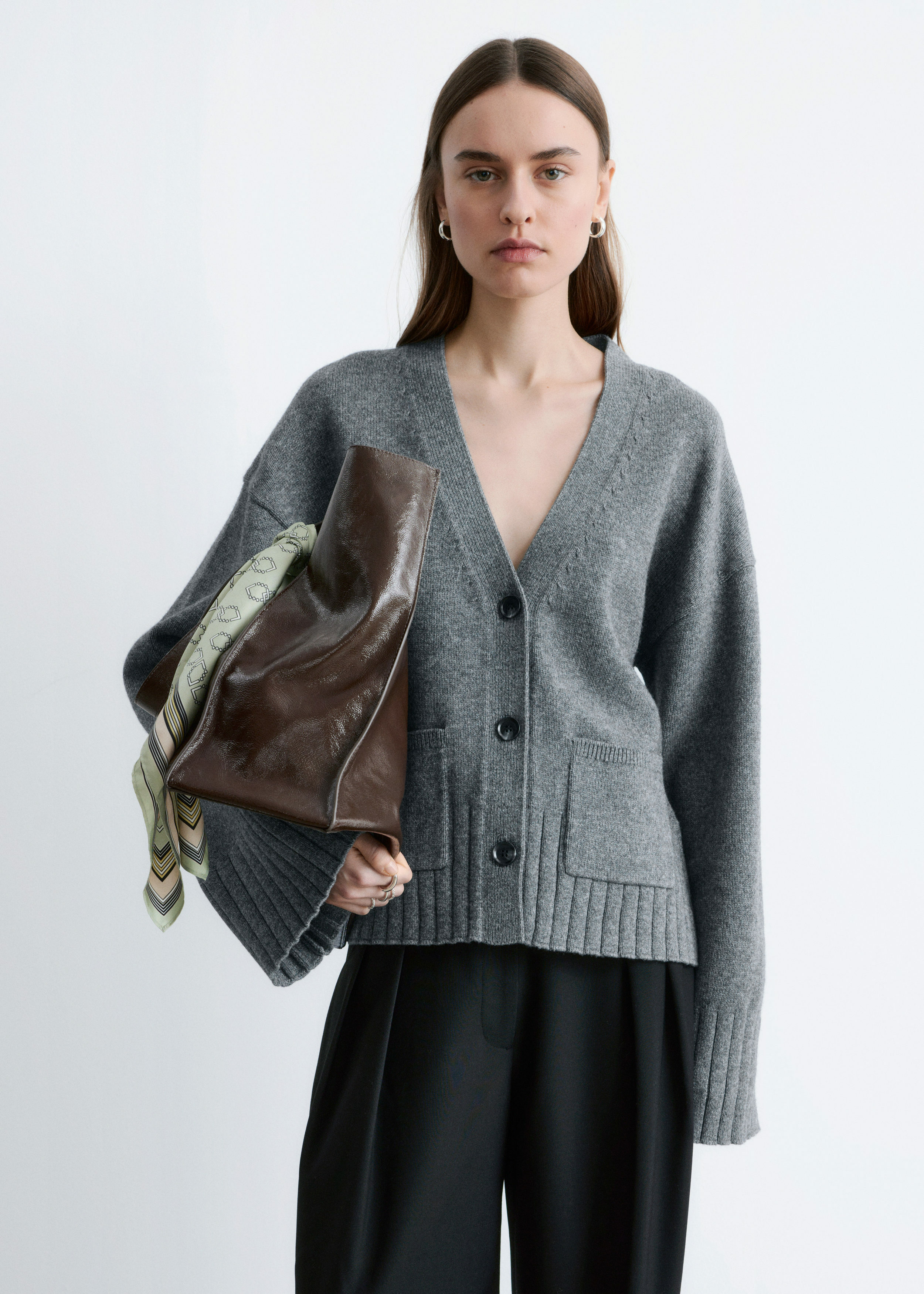 코튼 & 메리노 울 혼방 소재의 니트 가디건이에요. V 네크라인, 너비감 있는 롱 슬리브, 앞면의 패치 포켓, 테이퍼드 웨이스트, 헴라인과 커프스의 립 디테일, 앞면의 토널 단추가 특징이랍니다.