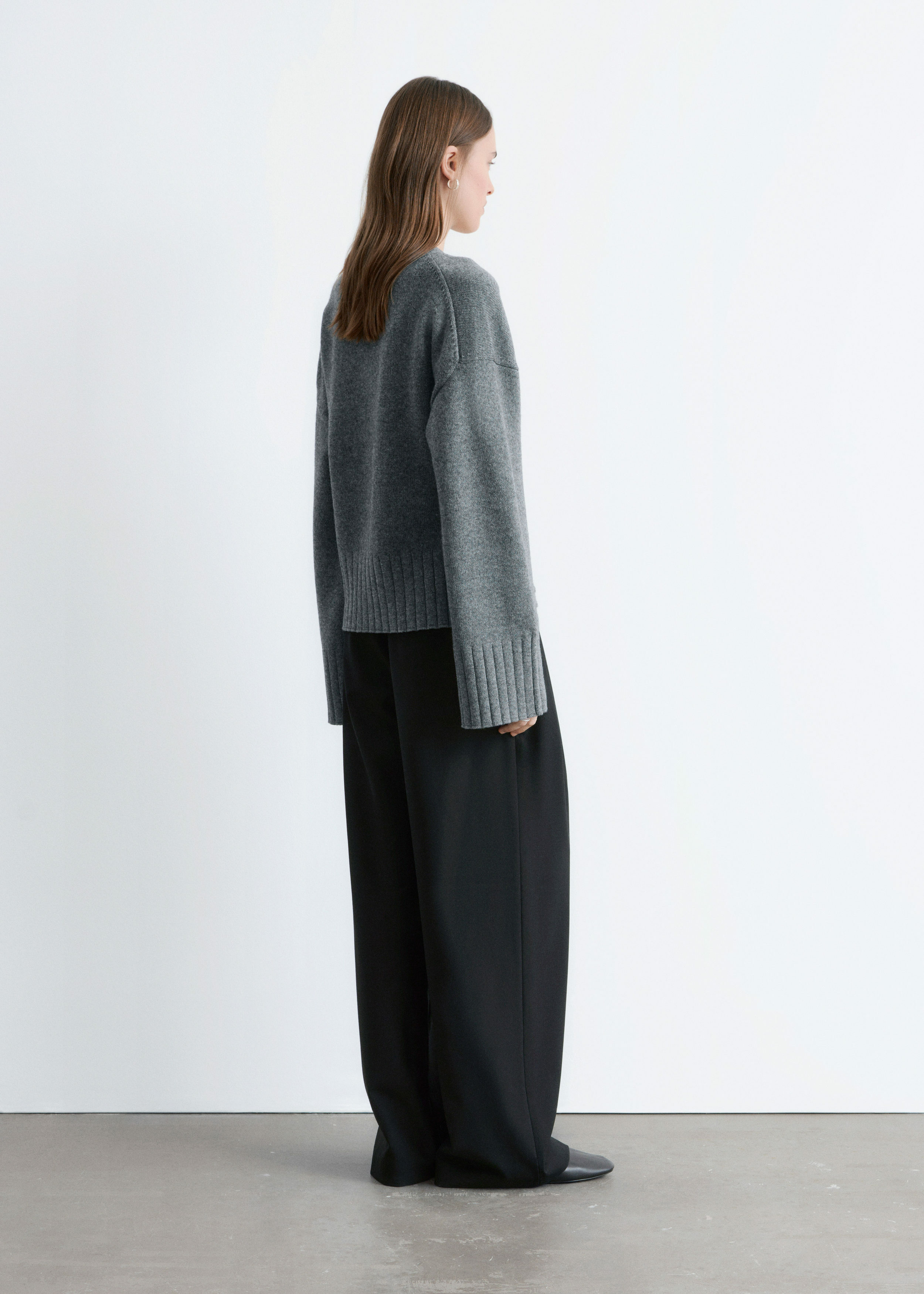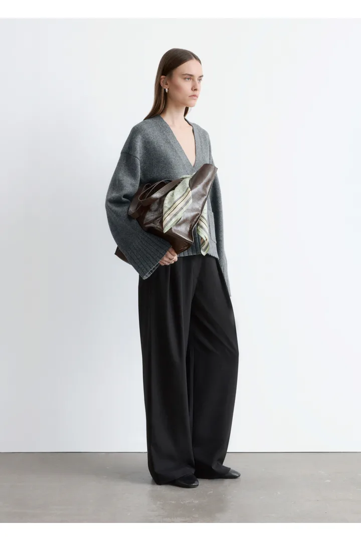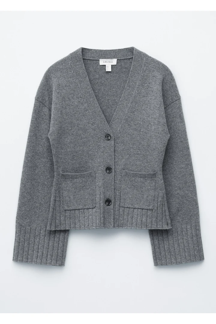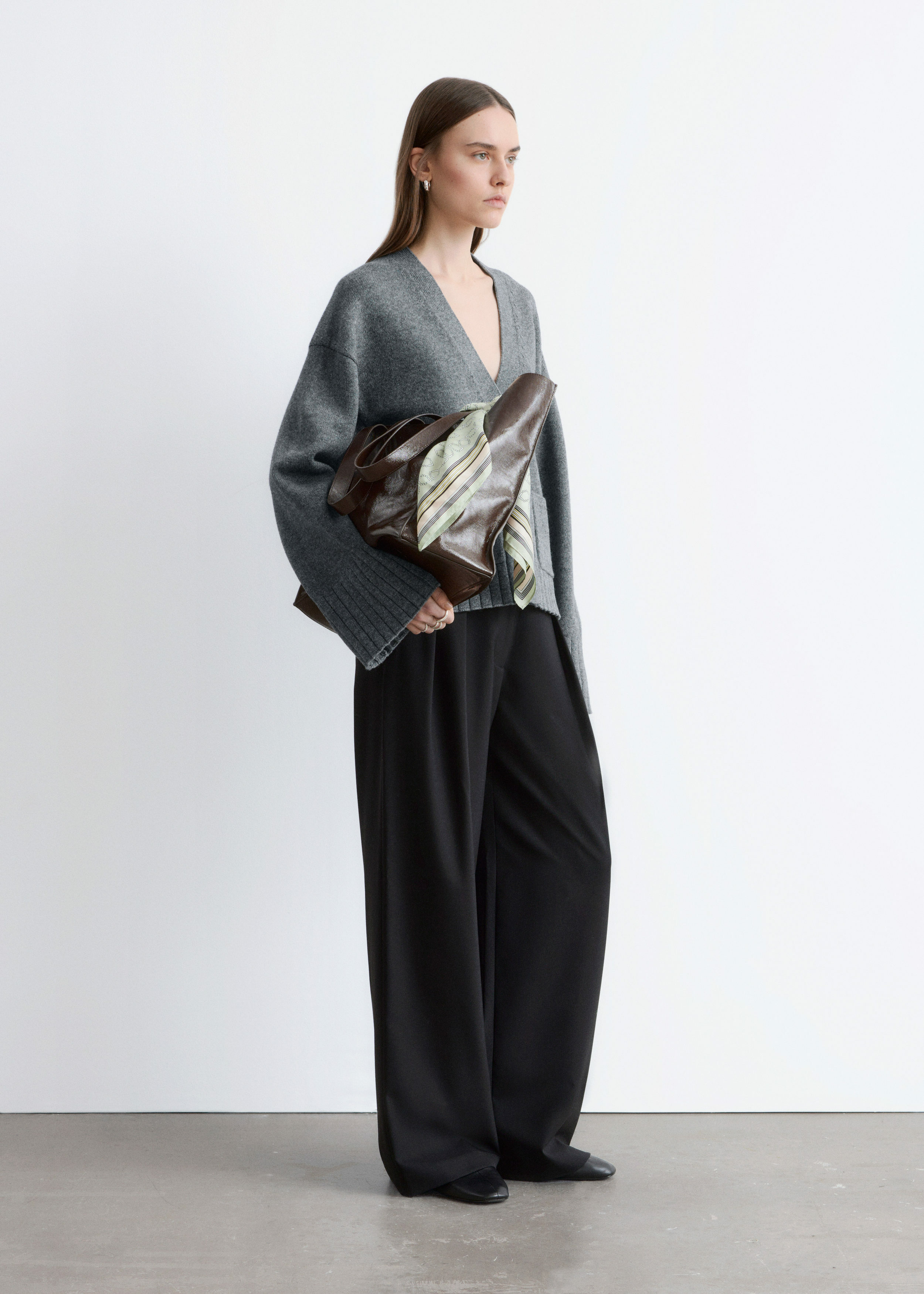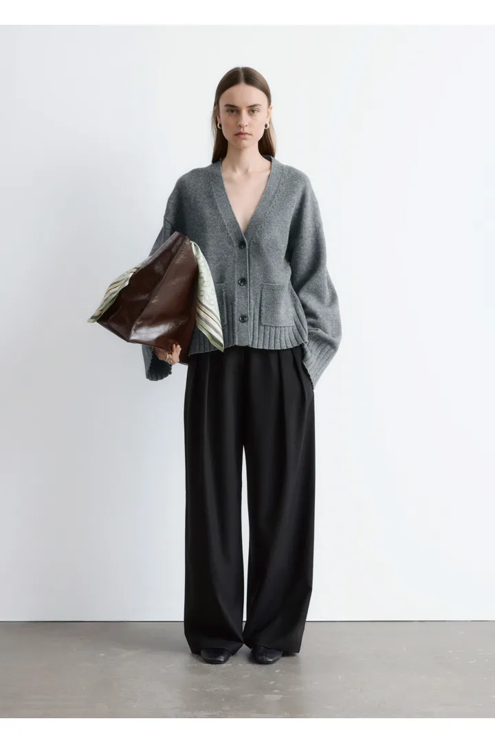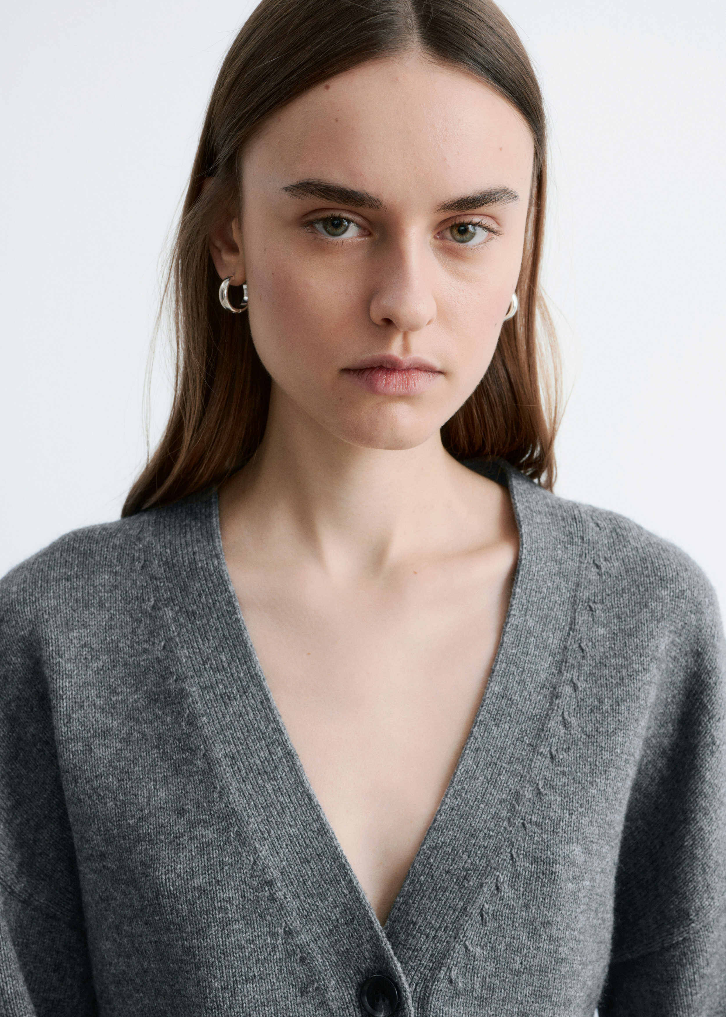 코튼 & 메리노 울 혼방 소재의 니트 가디건이에요. V 네크라인, 너비감 있는 롱 슬리브, 앞면의 패치 포켓, 테이퍼드 웨이스트, 헴라인과 커프스의 립 디테일, 앞면의 토널 단추가 특징이랍니다.
