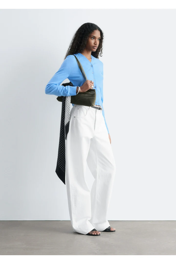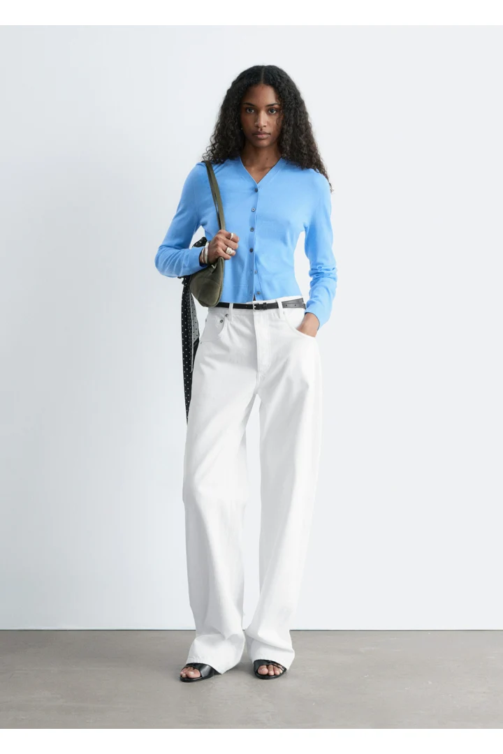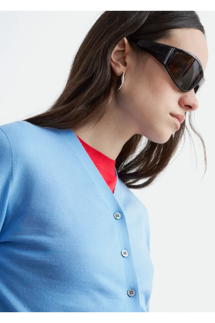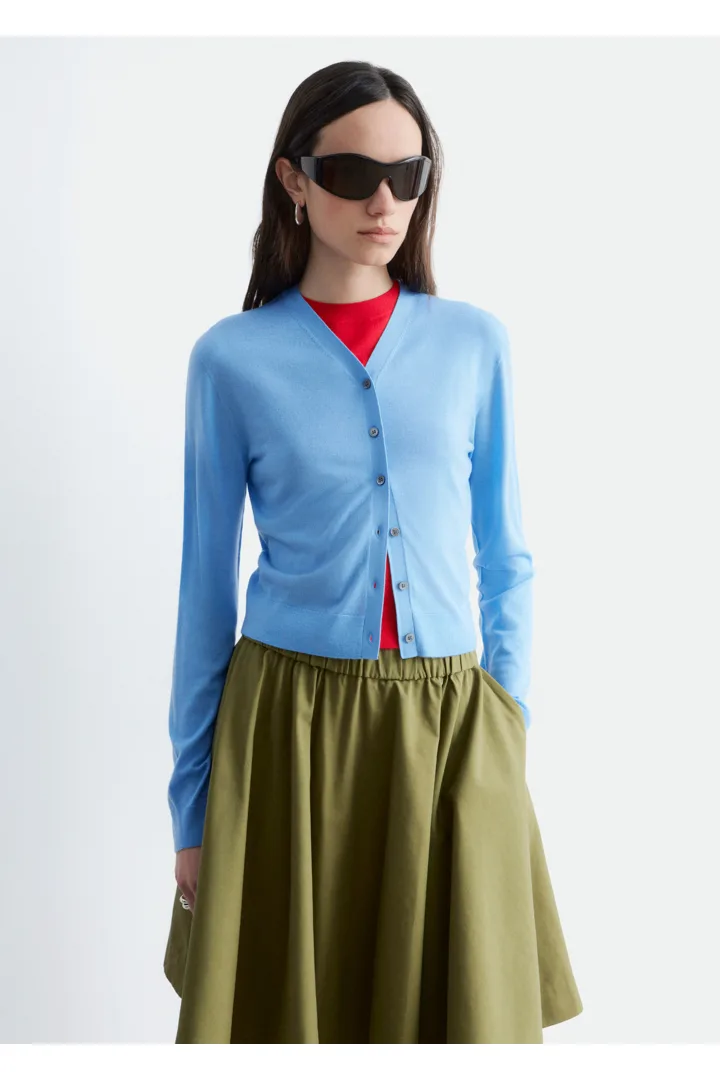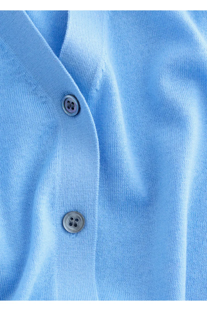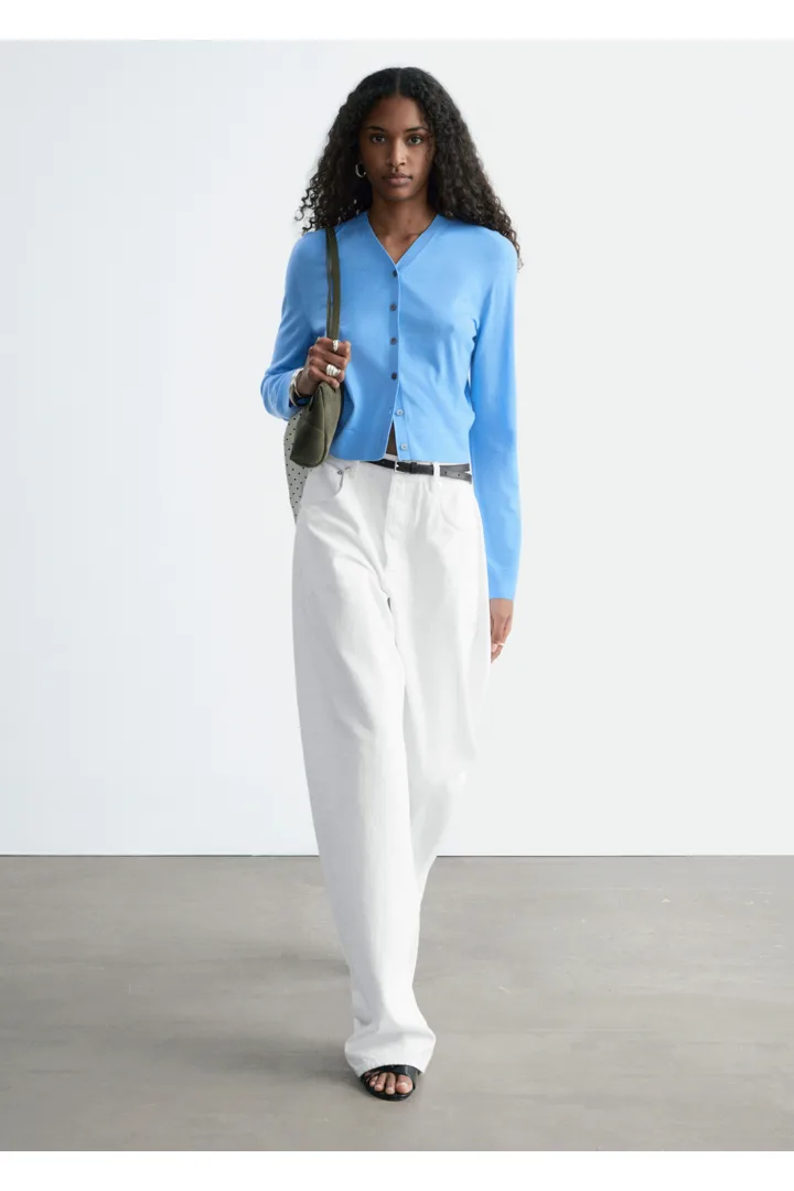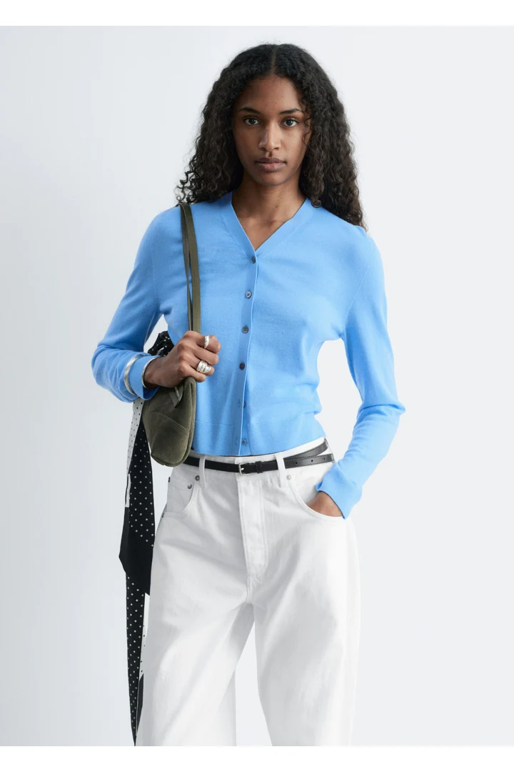 100% 캐시미어 소재로 섬세하게 니팅된 가디건이에요. 힙까지 오는 스트레이트 실루엣, 립 트리밍, 그리고 앞면의 단추가 특징이에요.