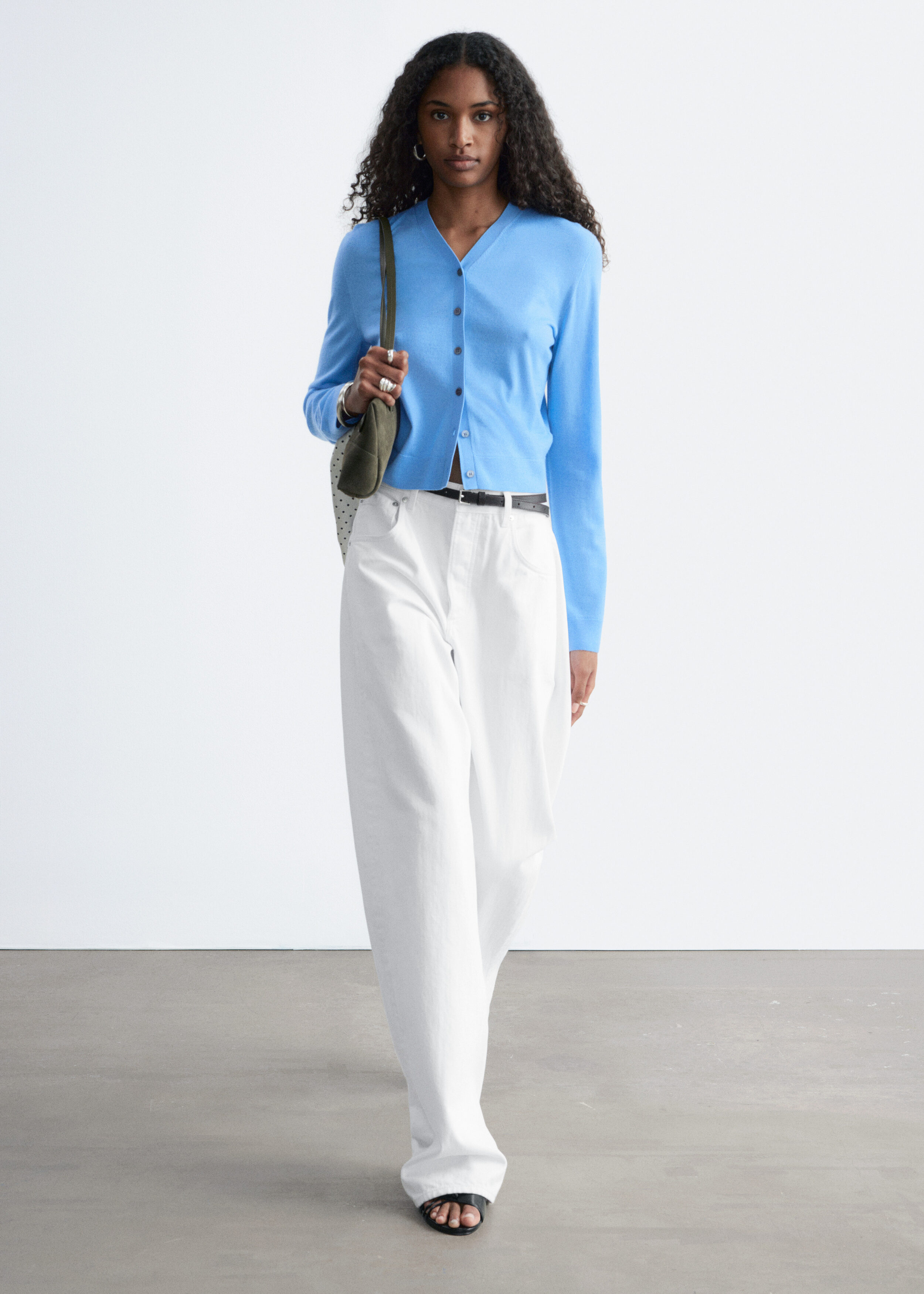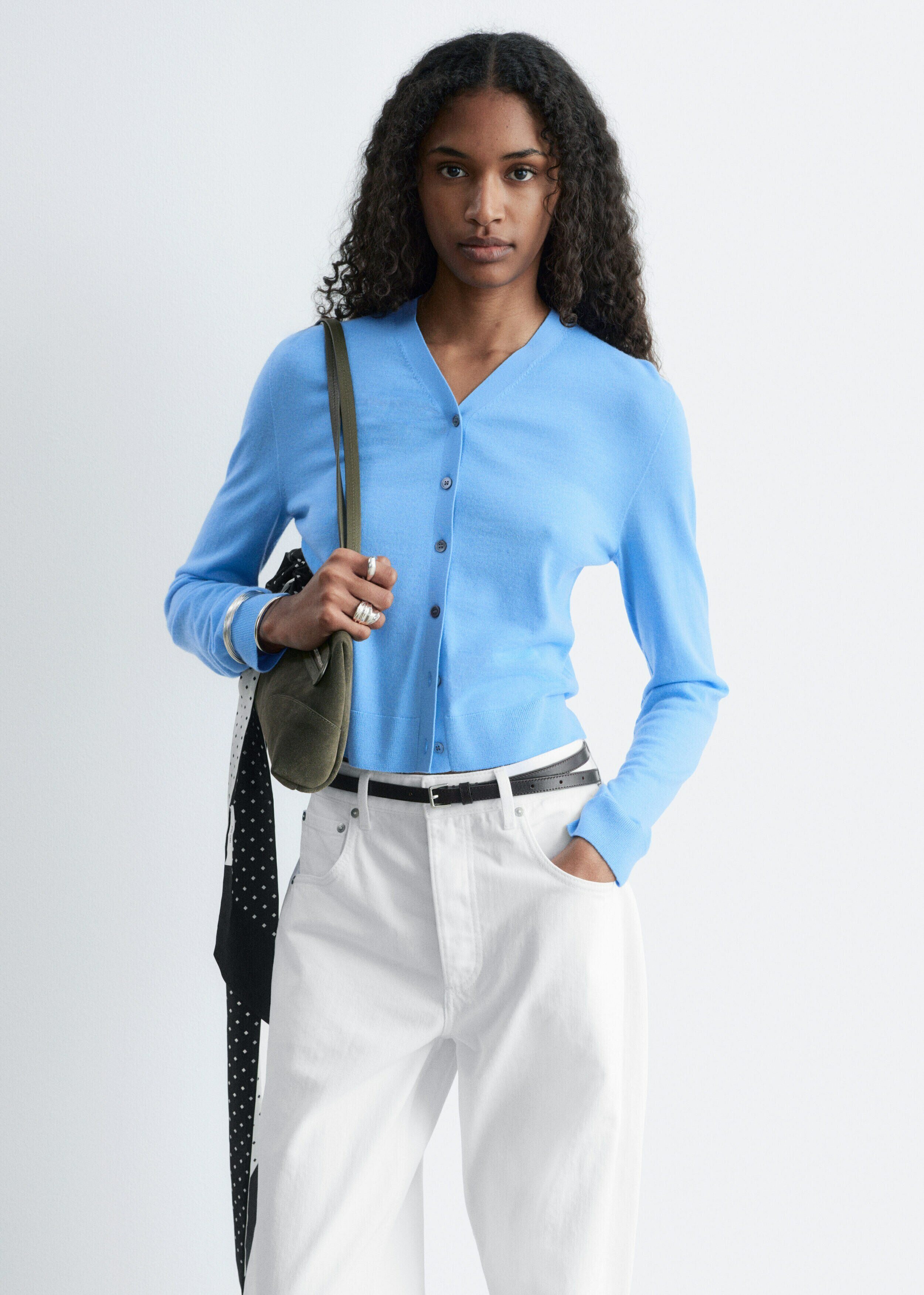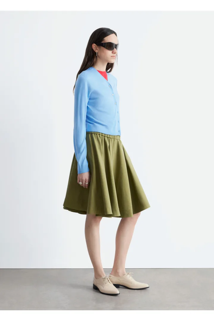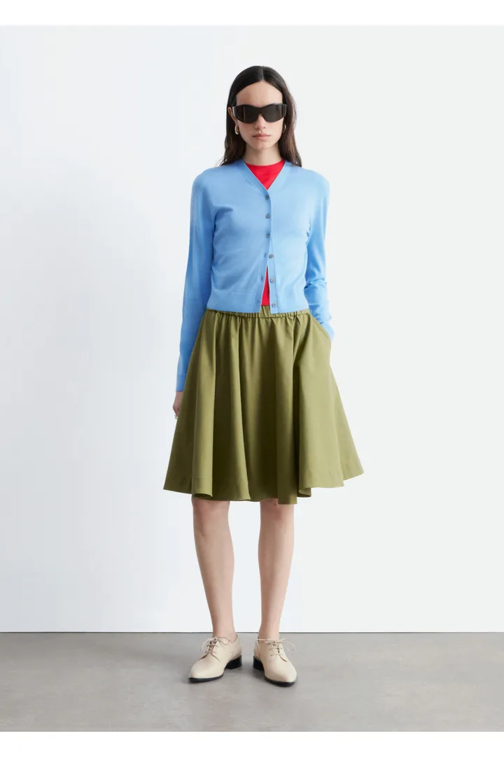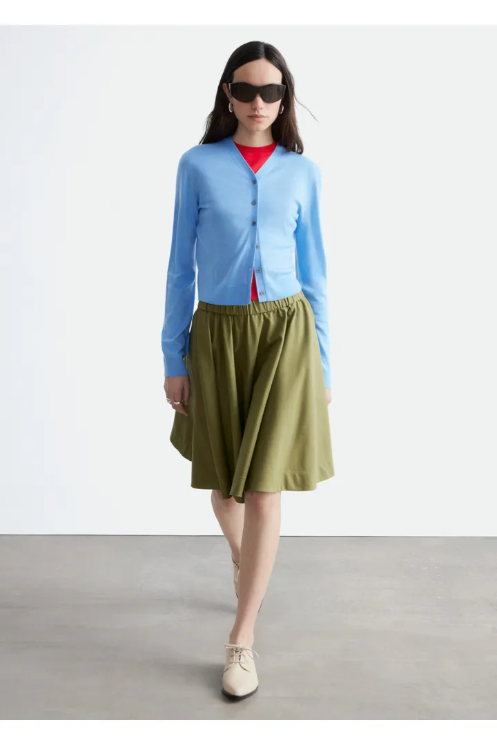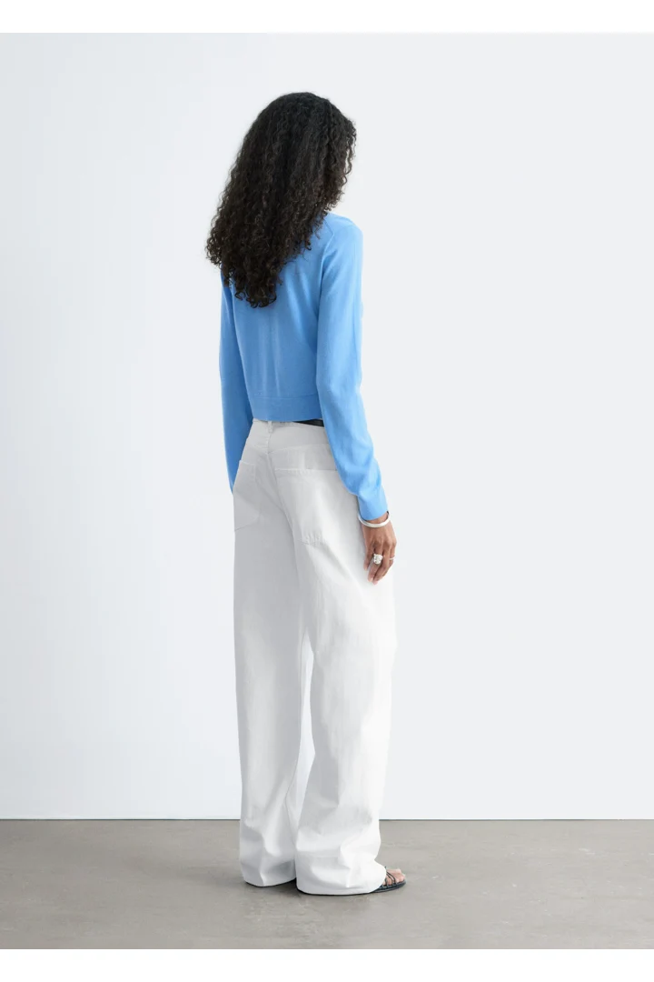 100% 캐시미어 소재로 섬세하게 니팅된 가디건이에요. 힙까지 오는 스트레이트 실루엣, 립 트리밍, 그리고 앞면의 단추가 특징이에요.