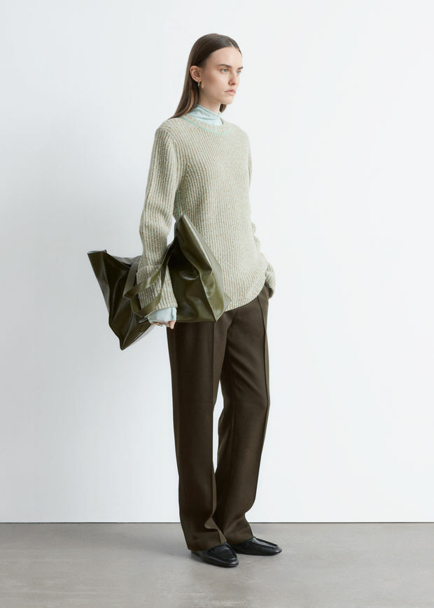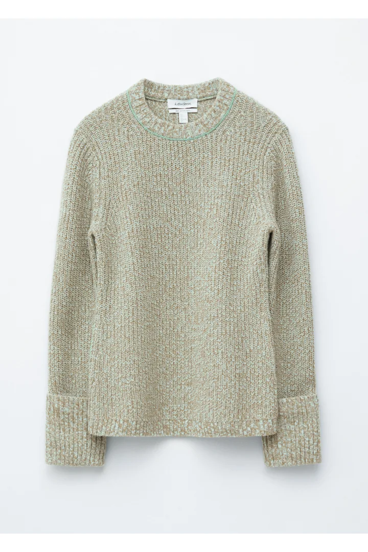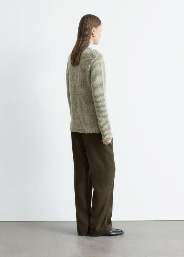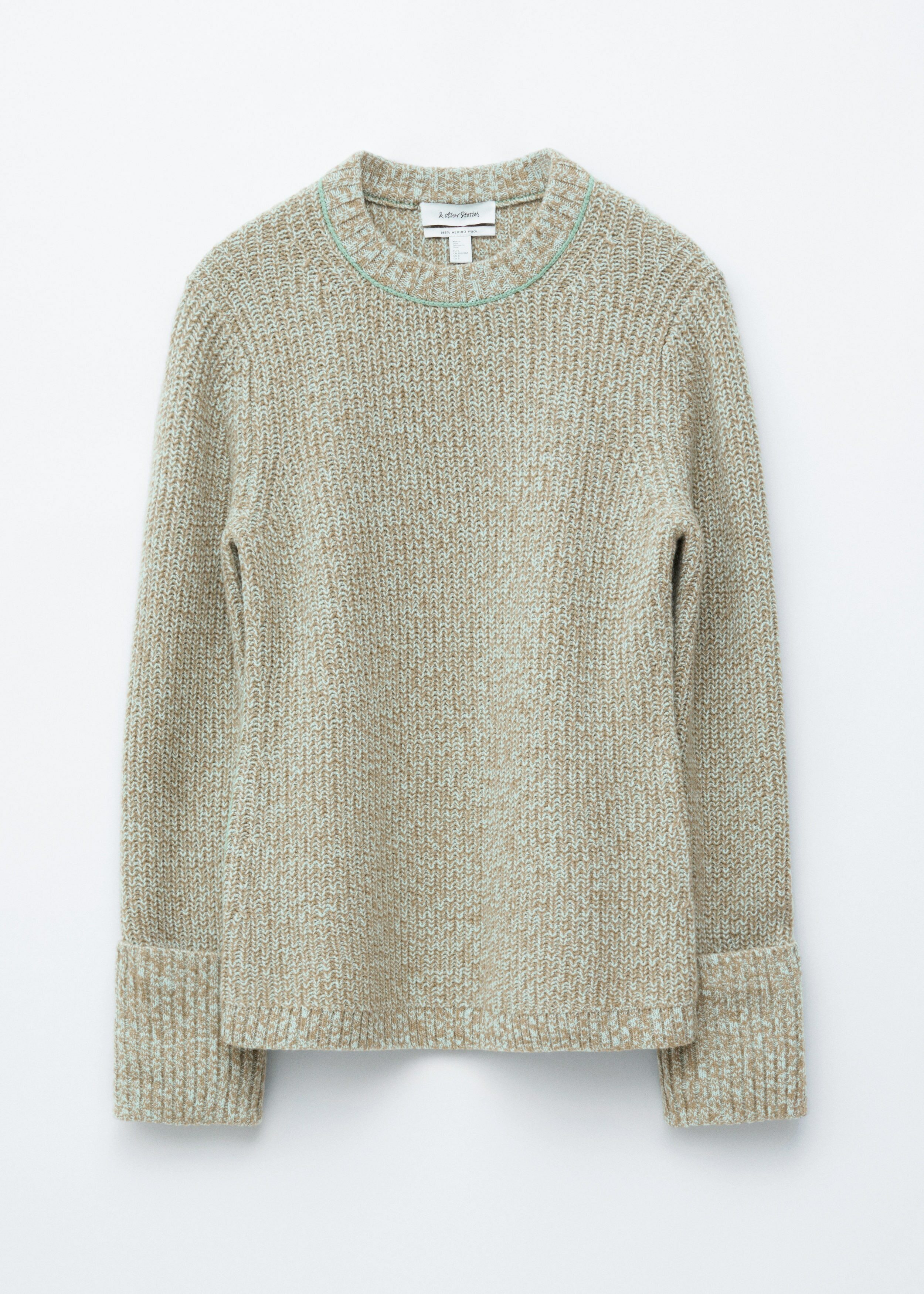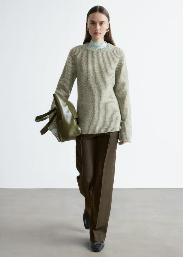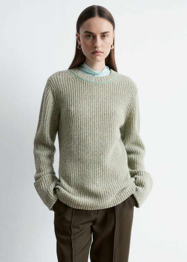롱 슬리브 울 스웨터예요. 대비적인 컬러의 링크 스티치 디테일이 돋보인답니다. 너비감 있는 턴업 립 커프스, 그리고 네크라인과 헴라인의 립 트리밍이 자리해 있어요.