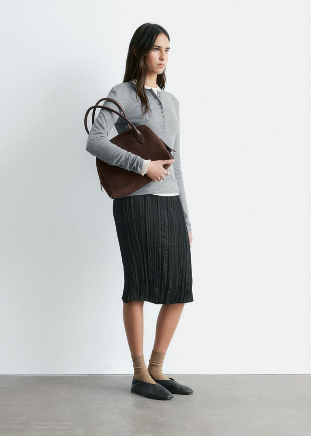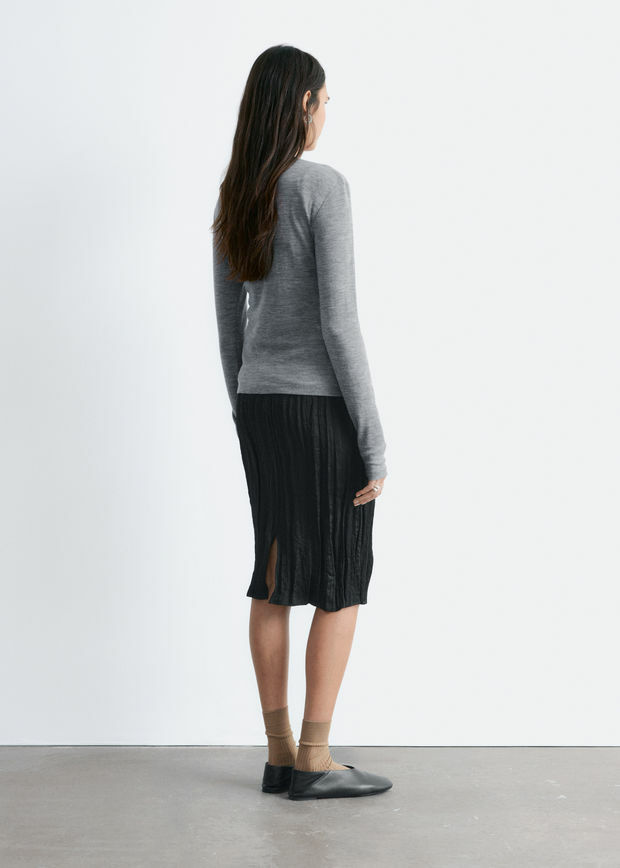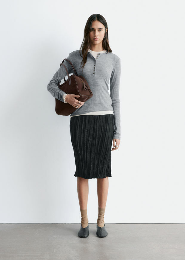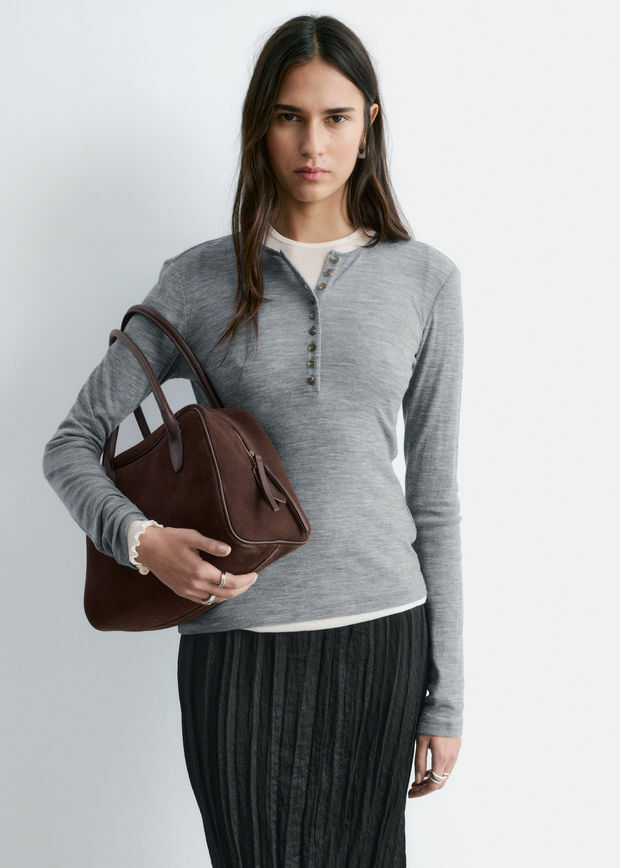 세미 시어 울 저지 소재의 롱 슬리브 탑이에요. 라운드 네크라인과 단추가 자리한 하프 플래킷이 특징이랍니다.