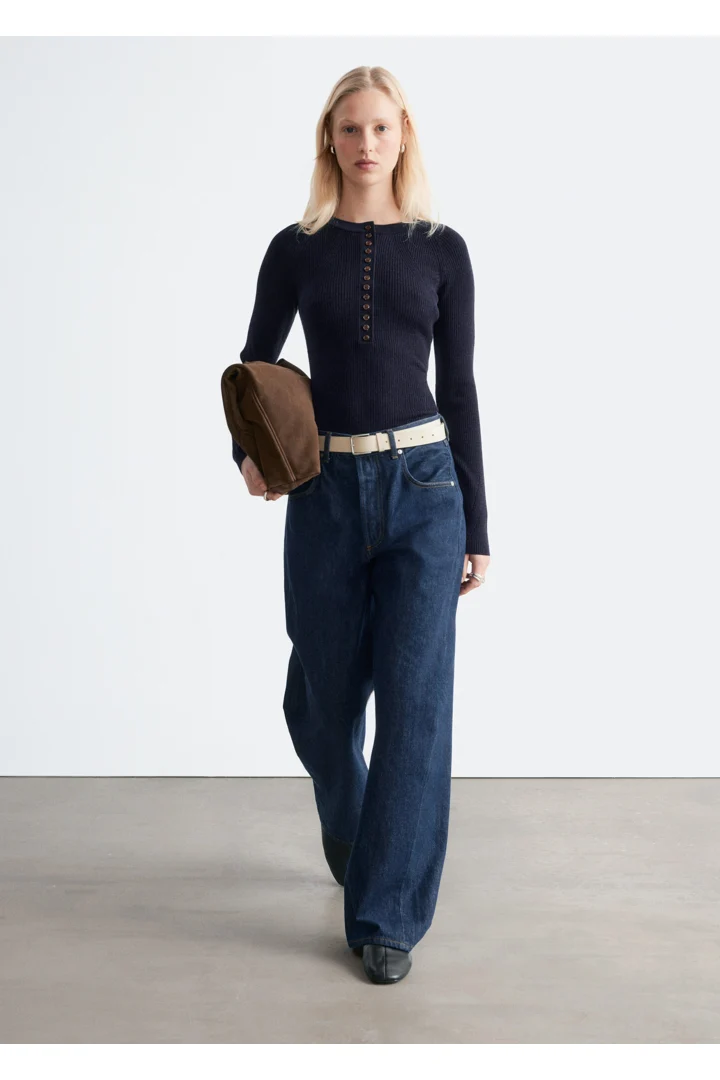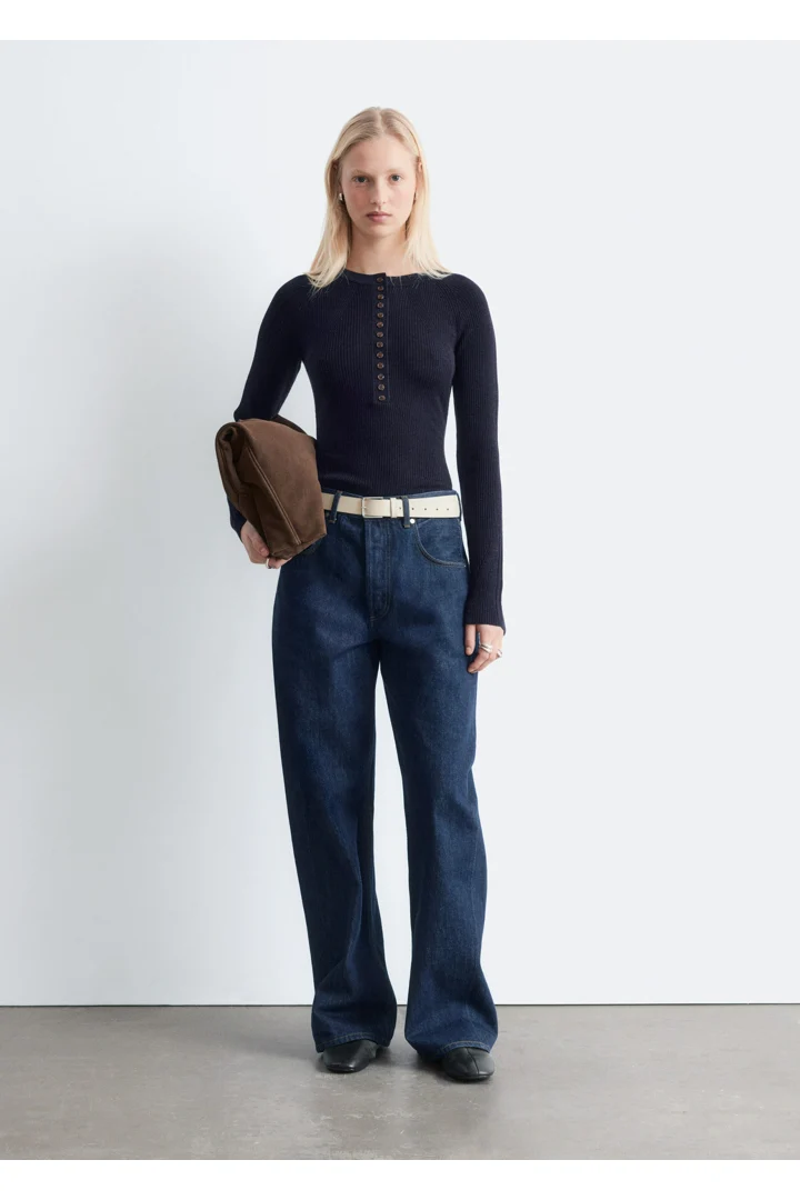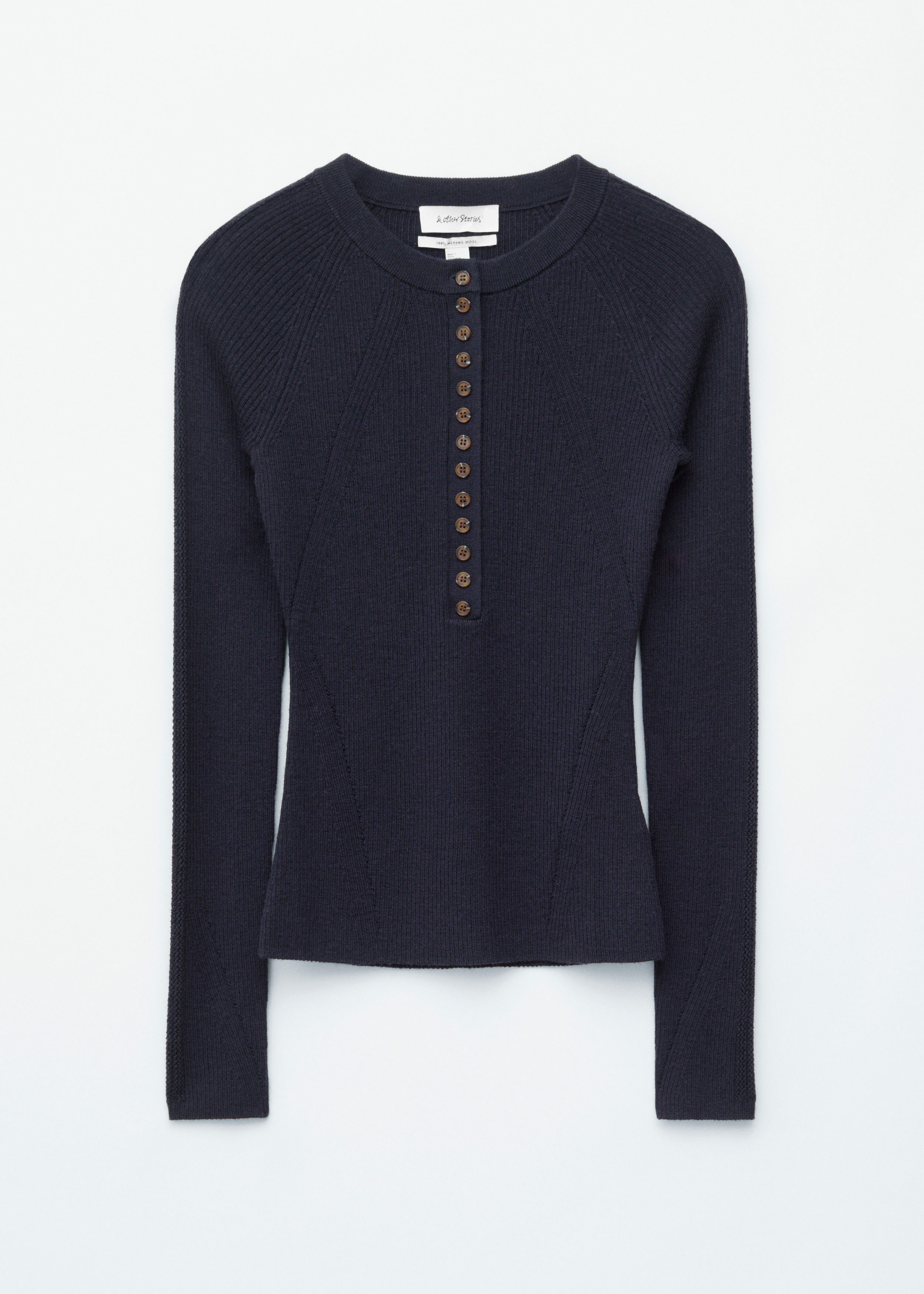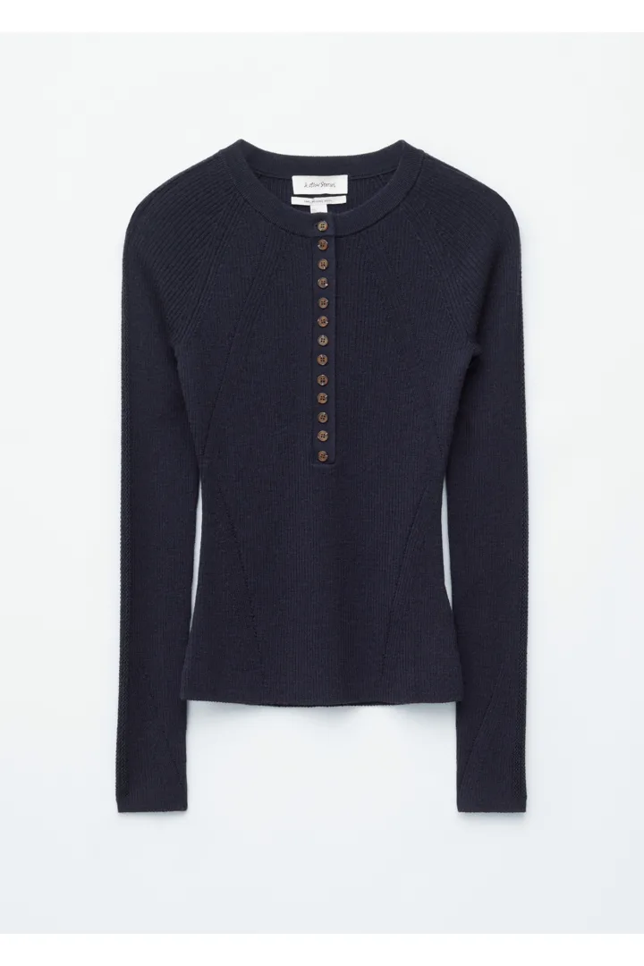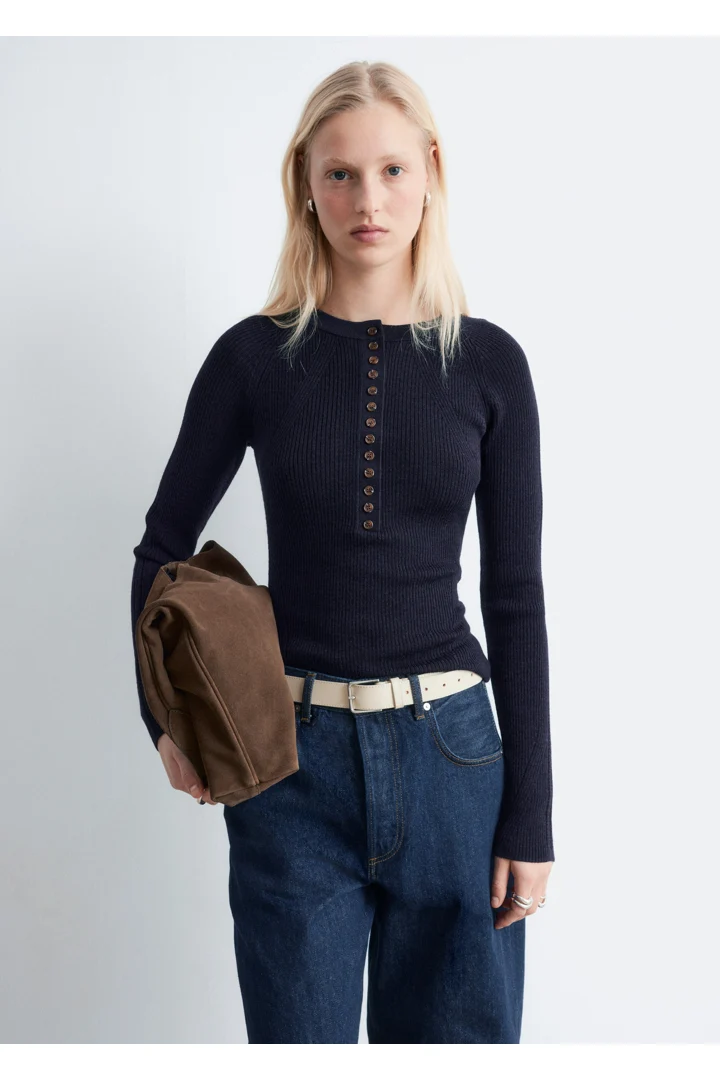 립 니트 메리노 울 소재의 롱 슬리브 탑이에요. 라운드 네크라인과 단추가 자리한 하프 플래킷이 특징이랍니다.