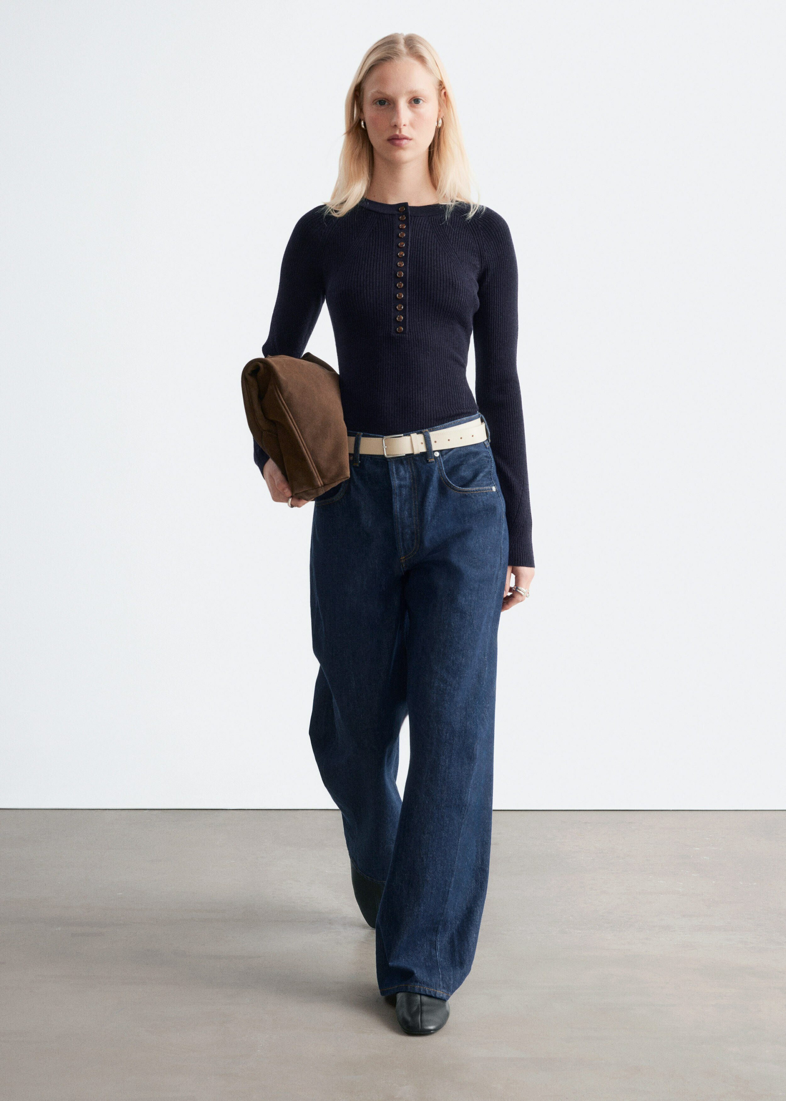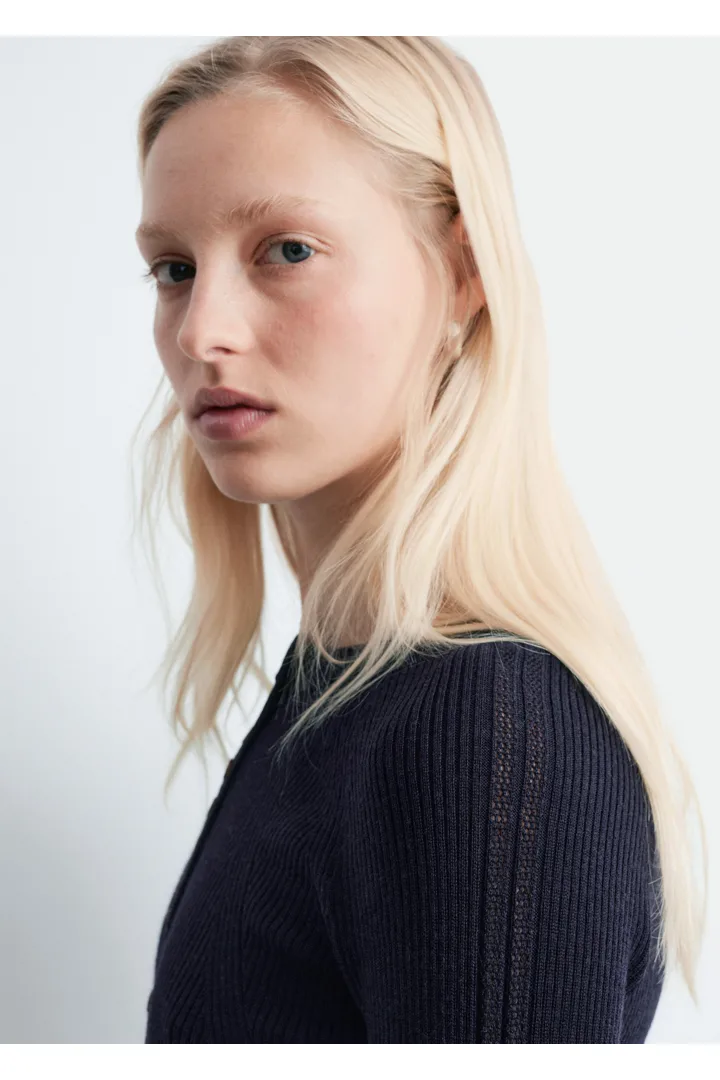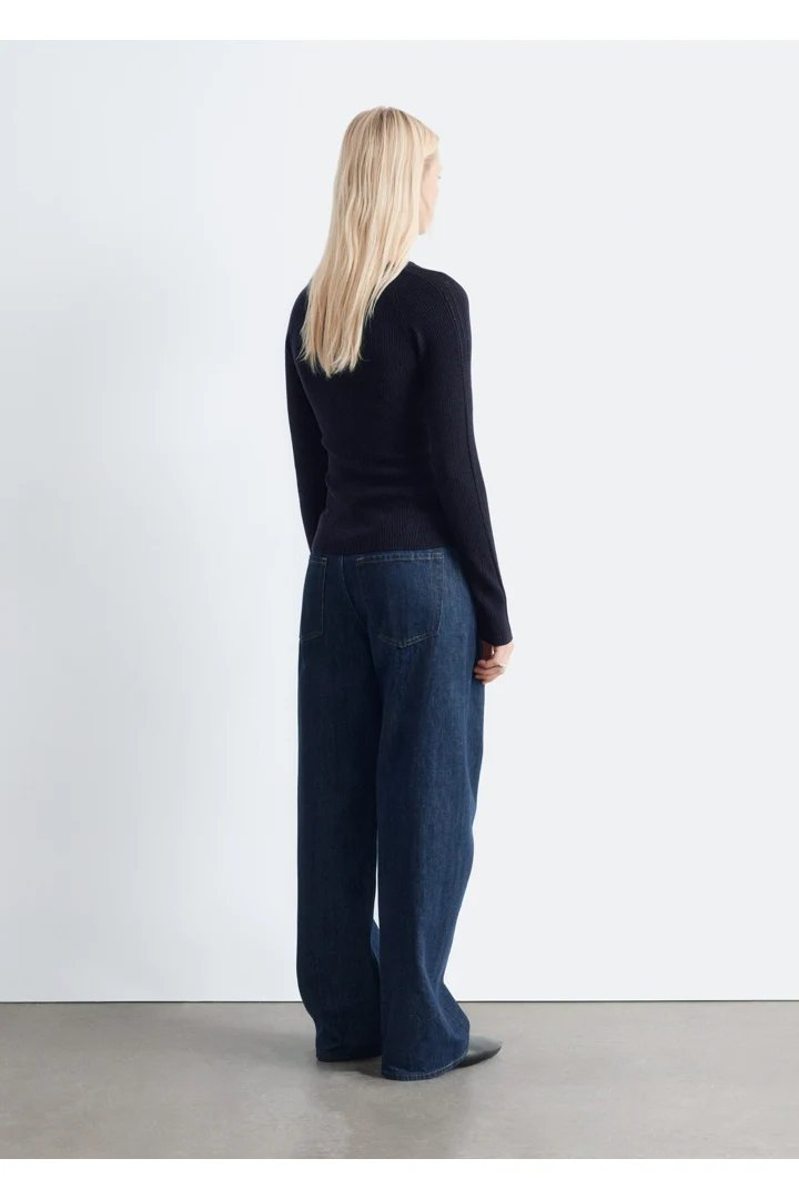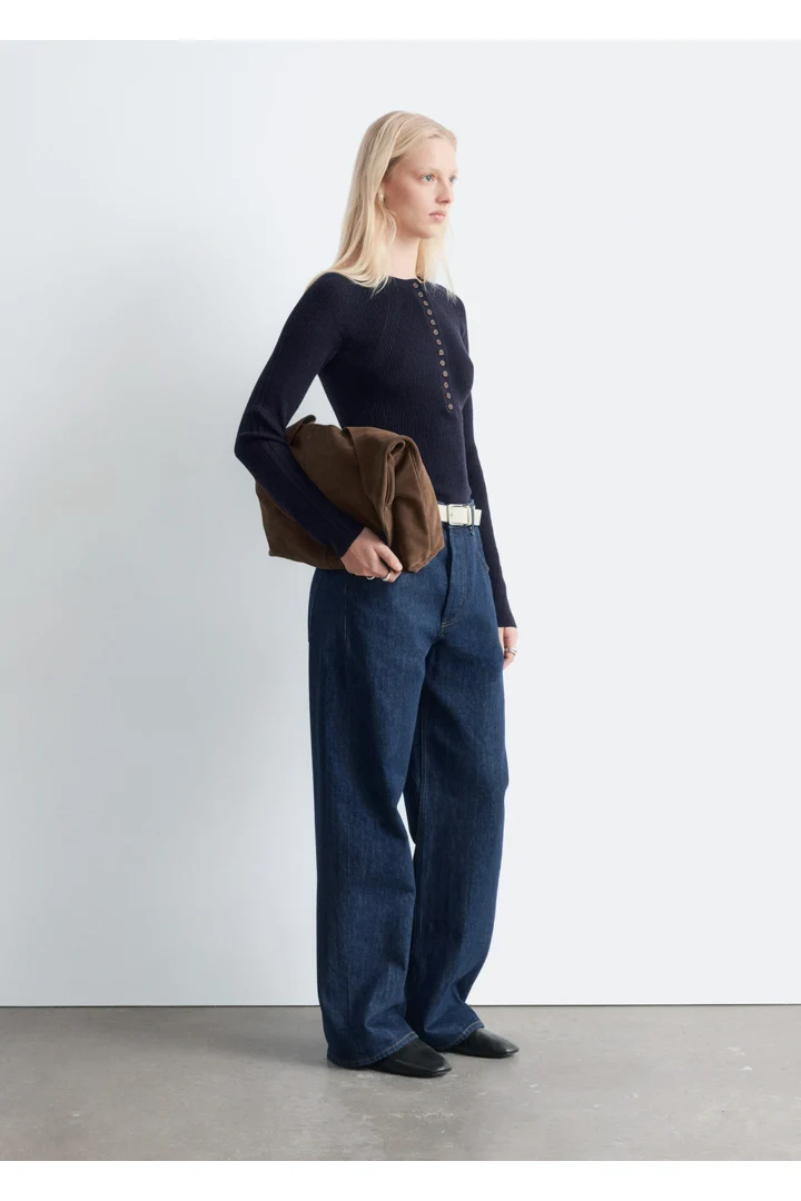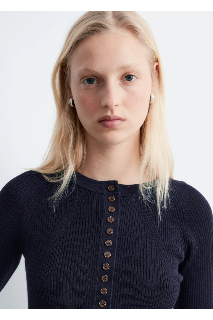 립 니트 메리노 울 소재의 롱 슬리브 탑이에요. 라운드 네크라인과 단추가 자리한 하프 플래킷이 특징이랍니다.